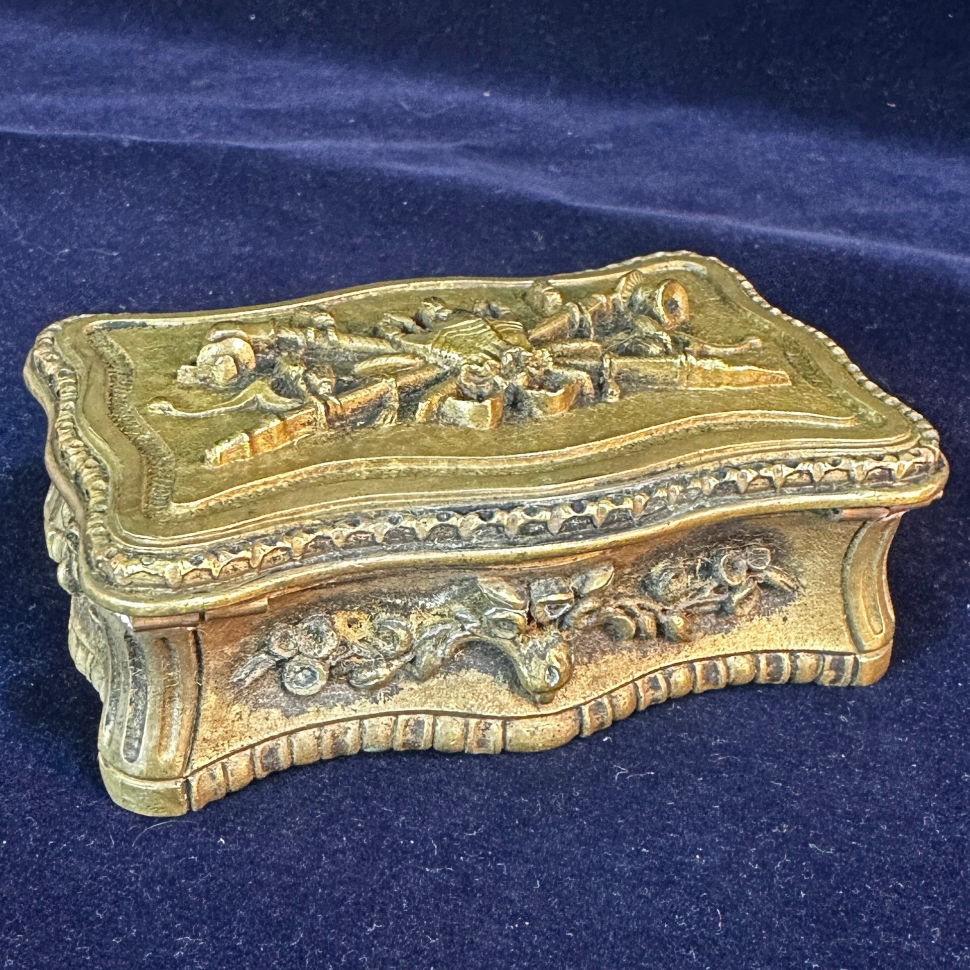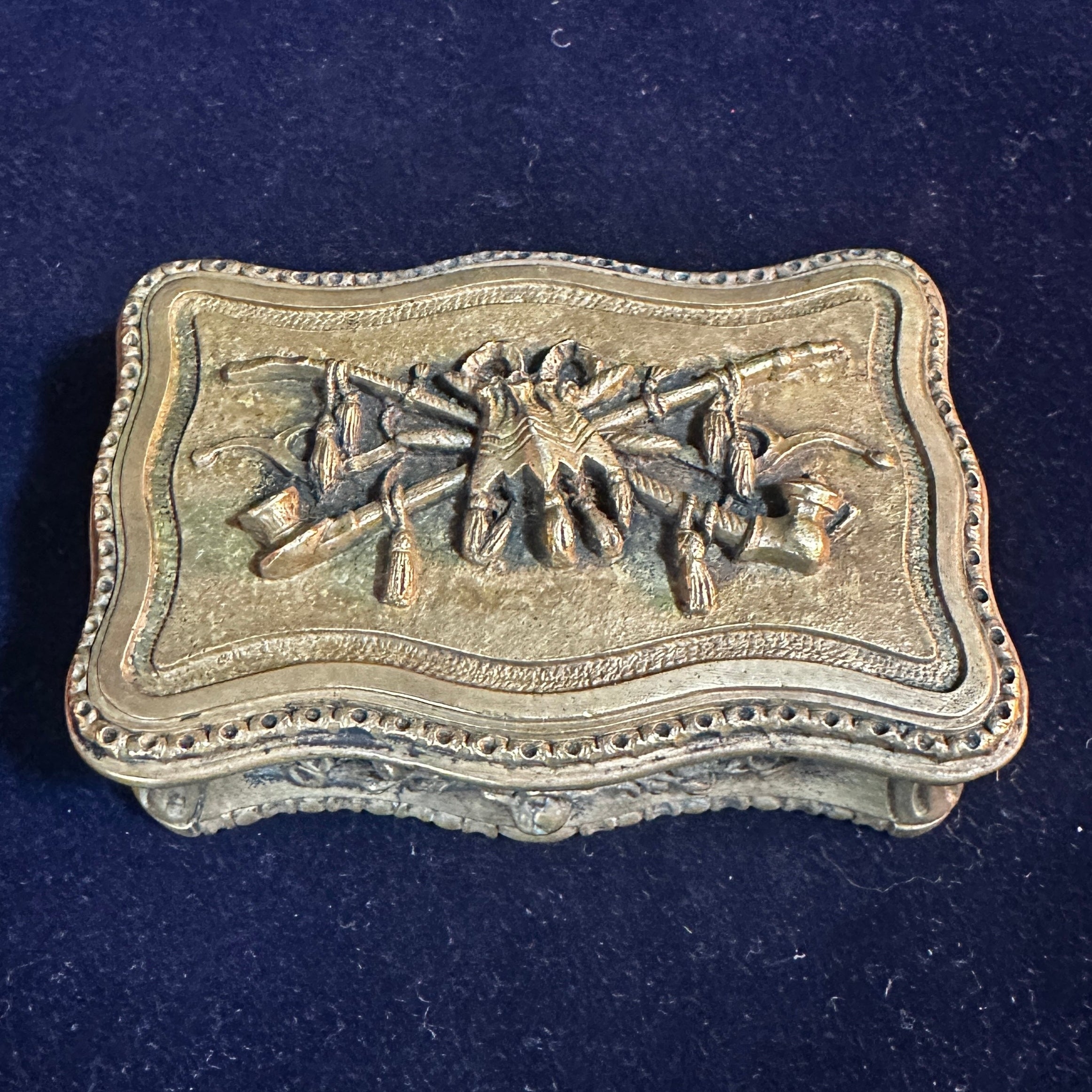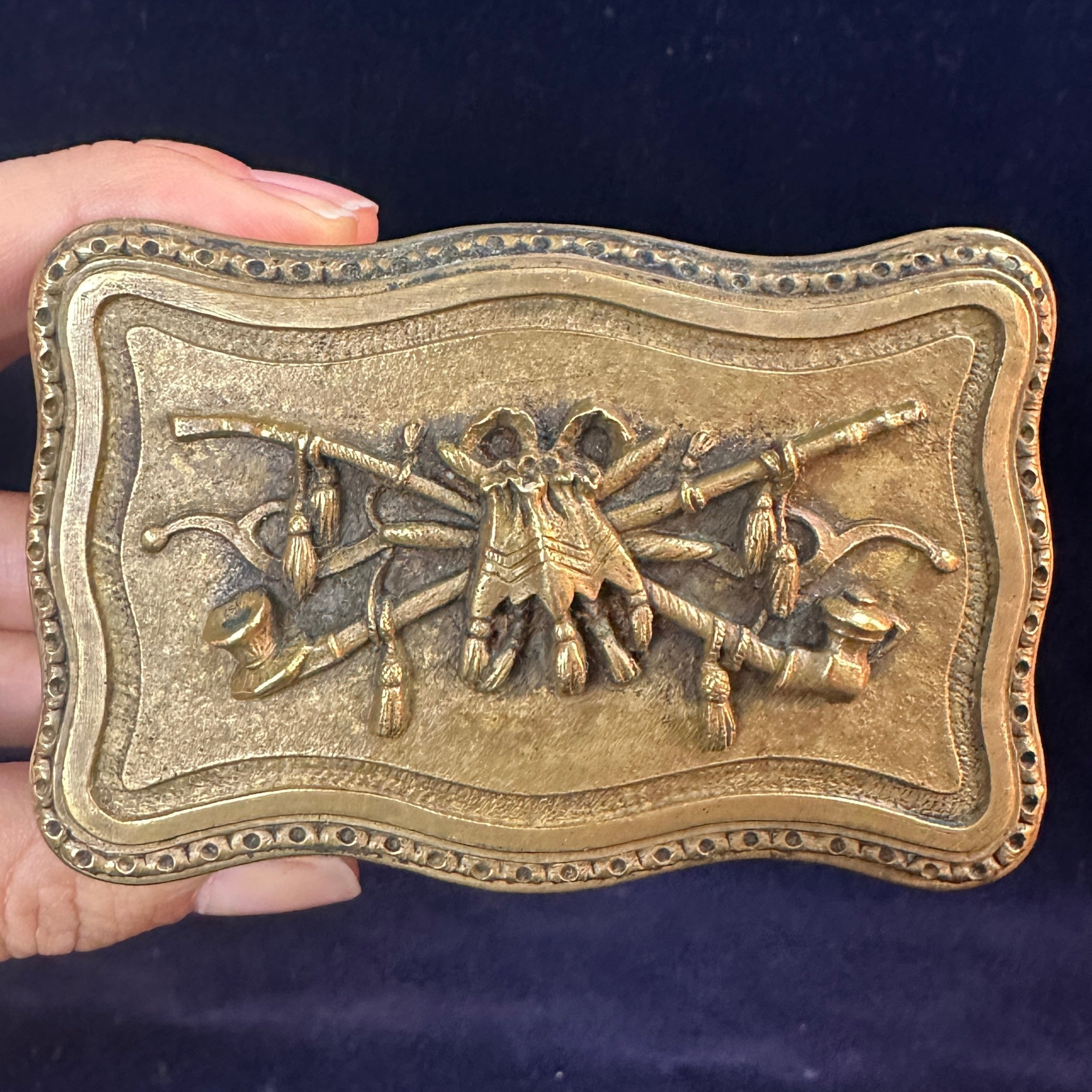 Élégante boîte d'allumettes en bronze français datant de 1900, finement ouvragée et ornée d'un motif central représentant diverses pipes, ce qui en fait une pièce unique et thématique. Son niveau de détail minutieux se manifeste tant sur les bords que sur la façade, avec des motifs ornementaux répétitifs qui rehaussent sa valeur esthétique et artisanale. L'intérieur offre un espace pour ranger et allumer les allumettes.