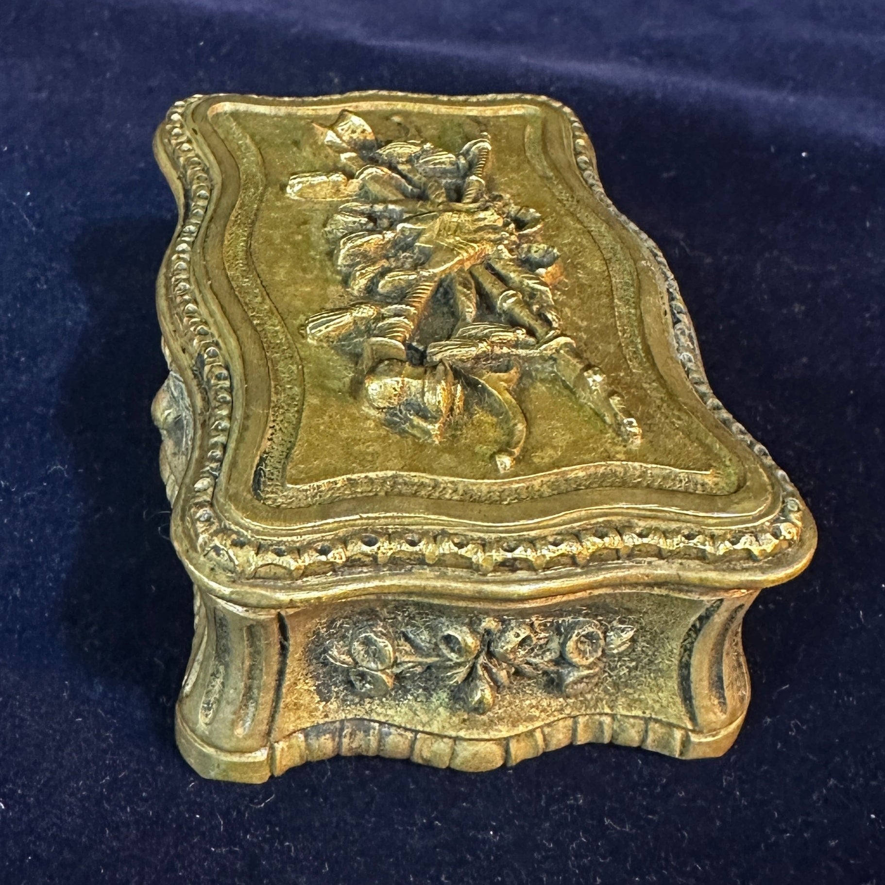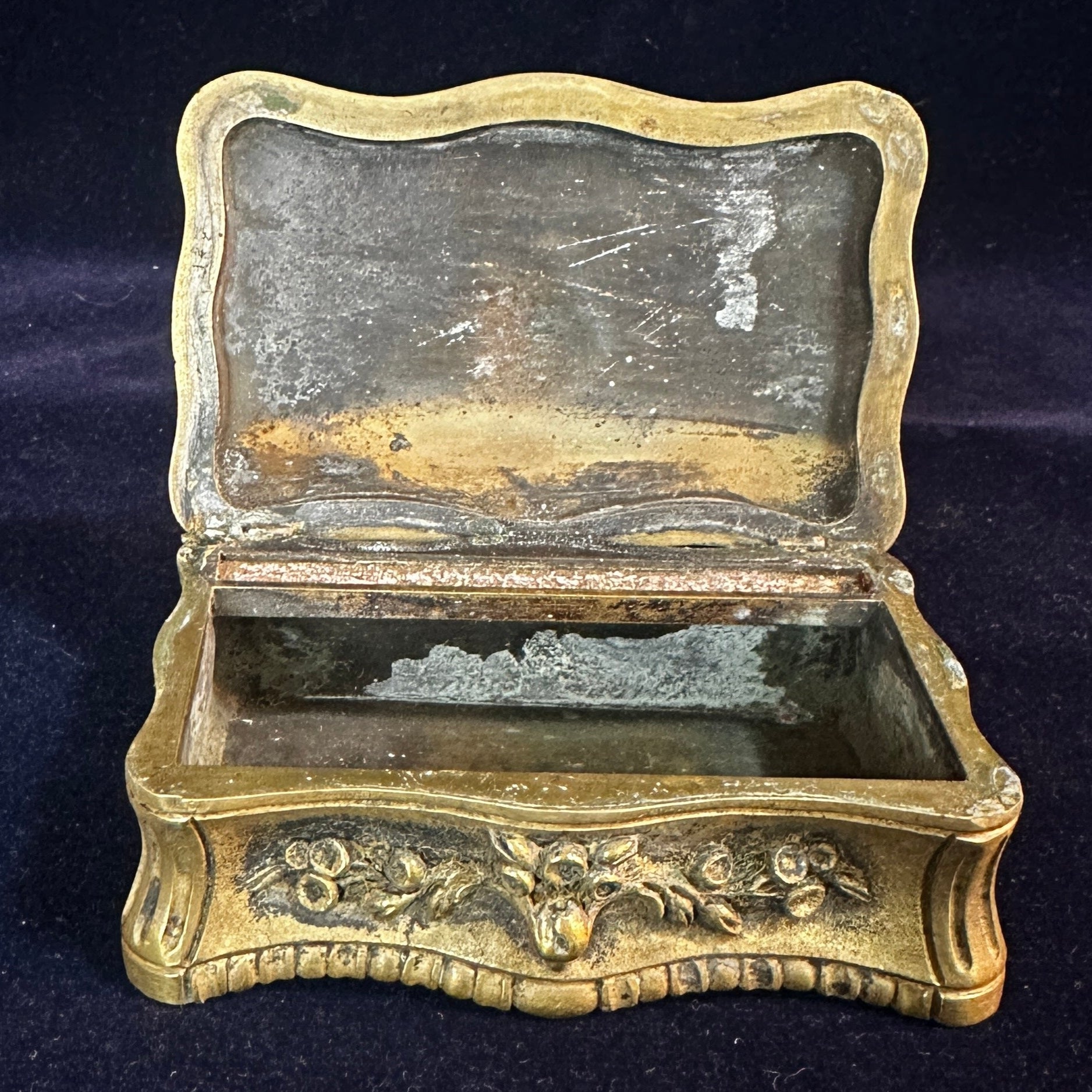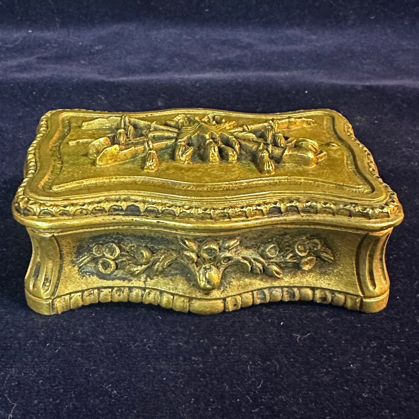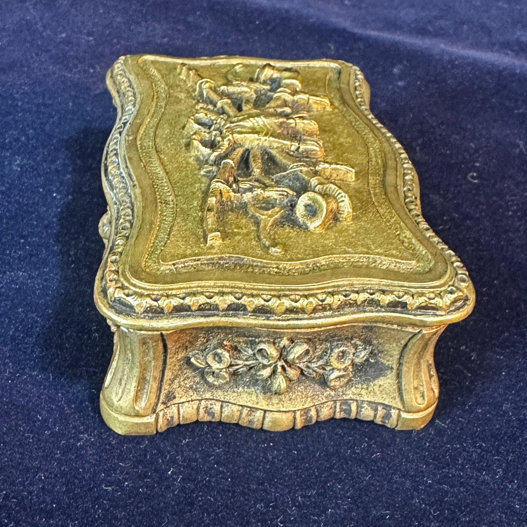 Élégante boîte d'allumettes en bronze français datant de 1900, finement ouvragée et ornée d'un motif central représentant diverses pipes, ce qui en fait une pièce unique et thématique. Son niveau de détail minutieux se manifeste tant sur les bords que sur la façade, avec des motifs ornementaux répétitifs qui rehaussent sa valeur esthétique et artisanale. L'intérieur offre un espace pour ranger et allumer les allumettes.