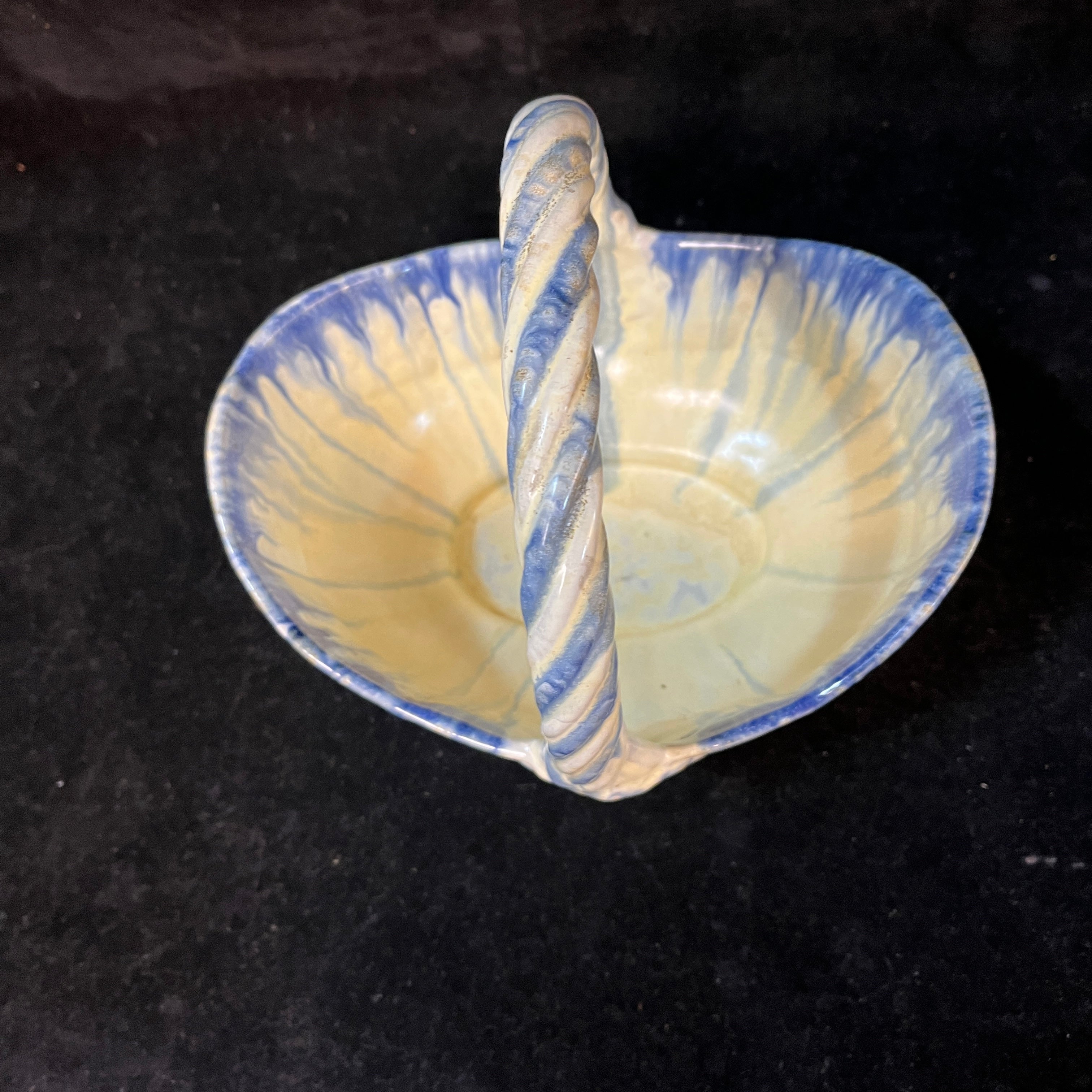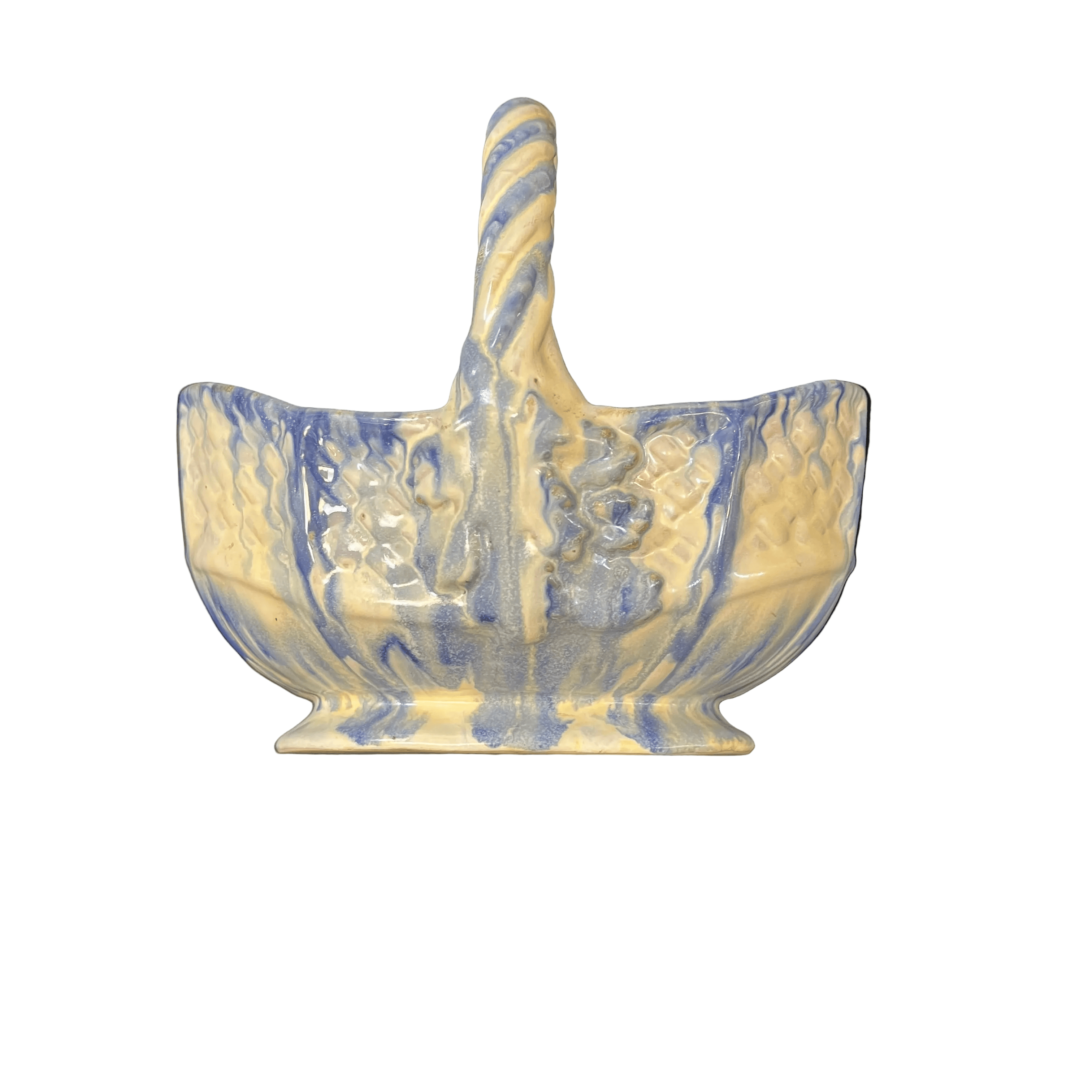 Bellisima vasija con forma de canasto, fabricada en la histórica fábrica chilena Lota (1928-1951). Con hermosos tonos blancos y azul además de emular la textura natural de un canasto de fibra, esta pieza nacional es un pedacito de nuestra historia en el mundo de las artes decorativas.