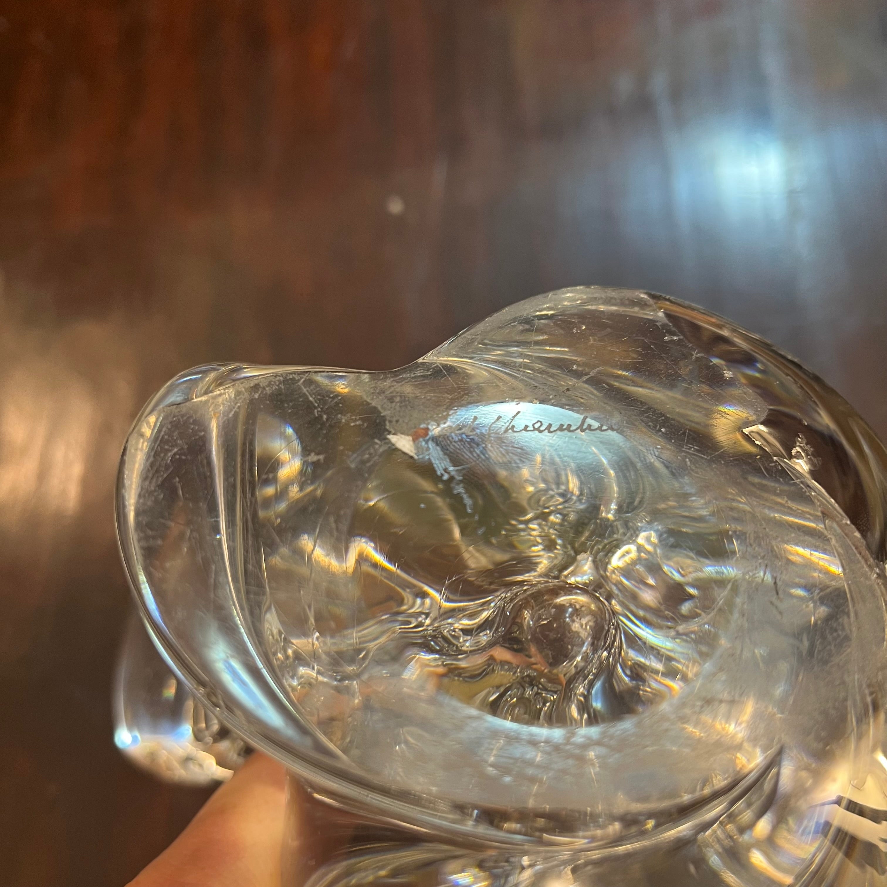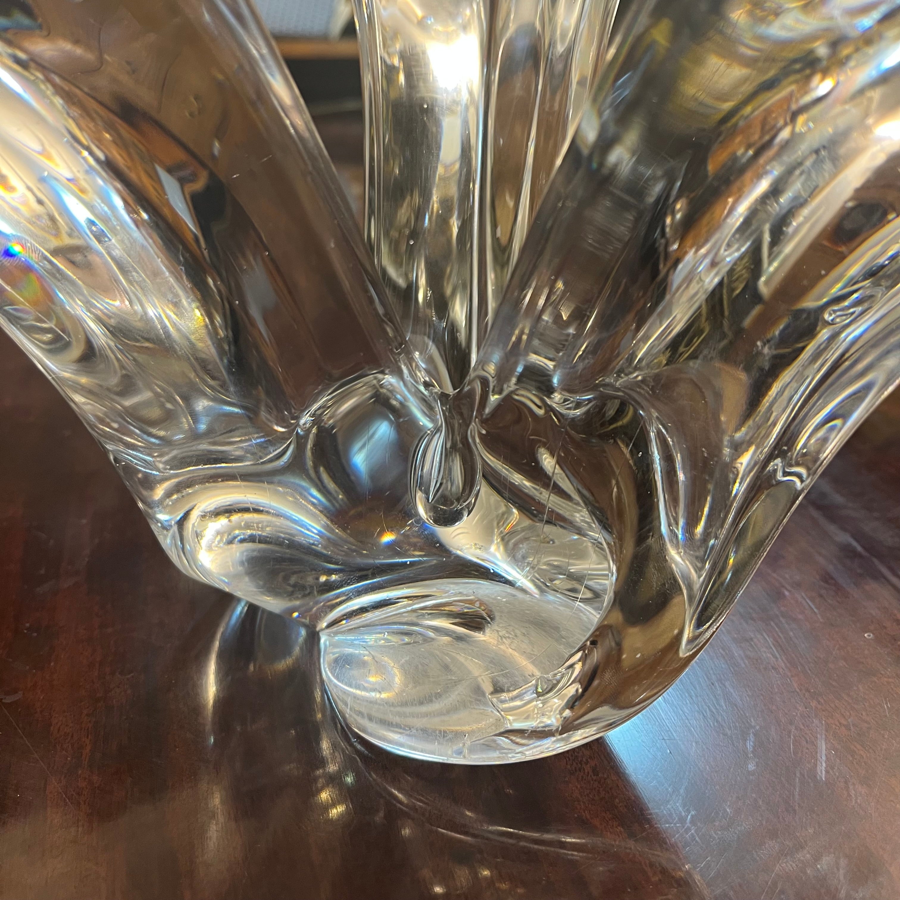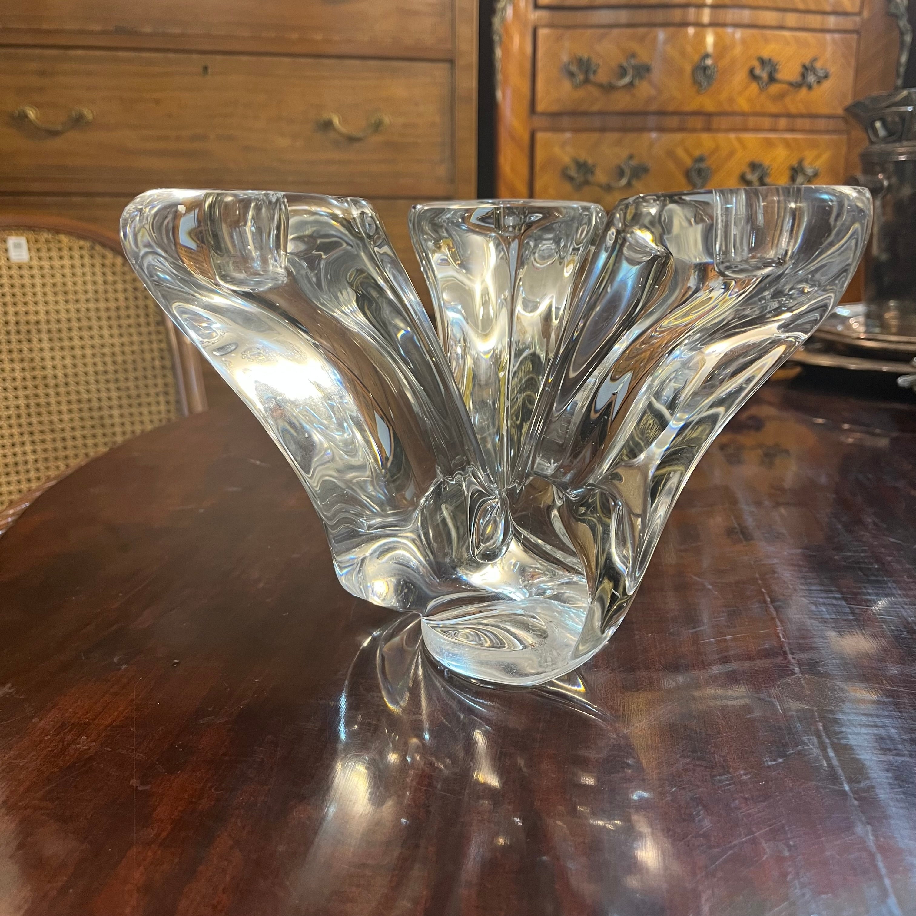 Magnifique candélabre en cristal belge de la célèbre marque Val Saint Lambert, doté d'un superbe design incurvé à trois lumières. Cette pièce élégante et remarquable peut facilement servir de pièce maîtresse, en complément d'un chandelier. Le dessous de la pièce reprend la forme de la marque.