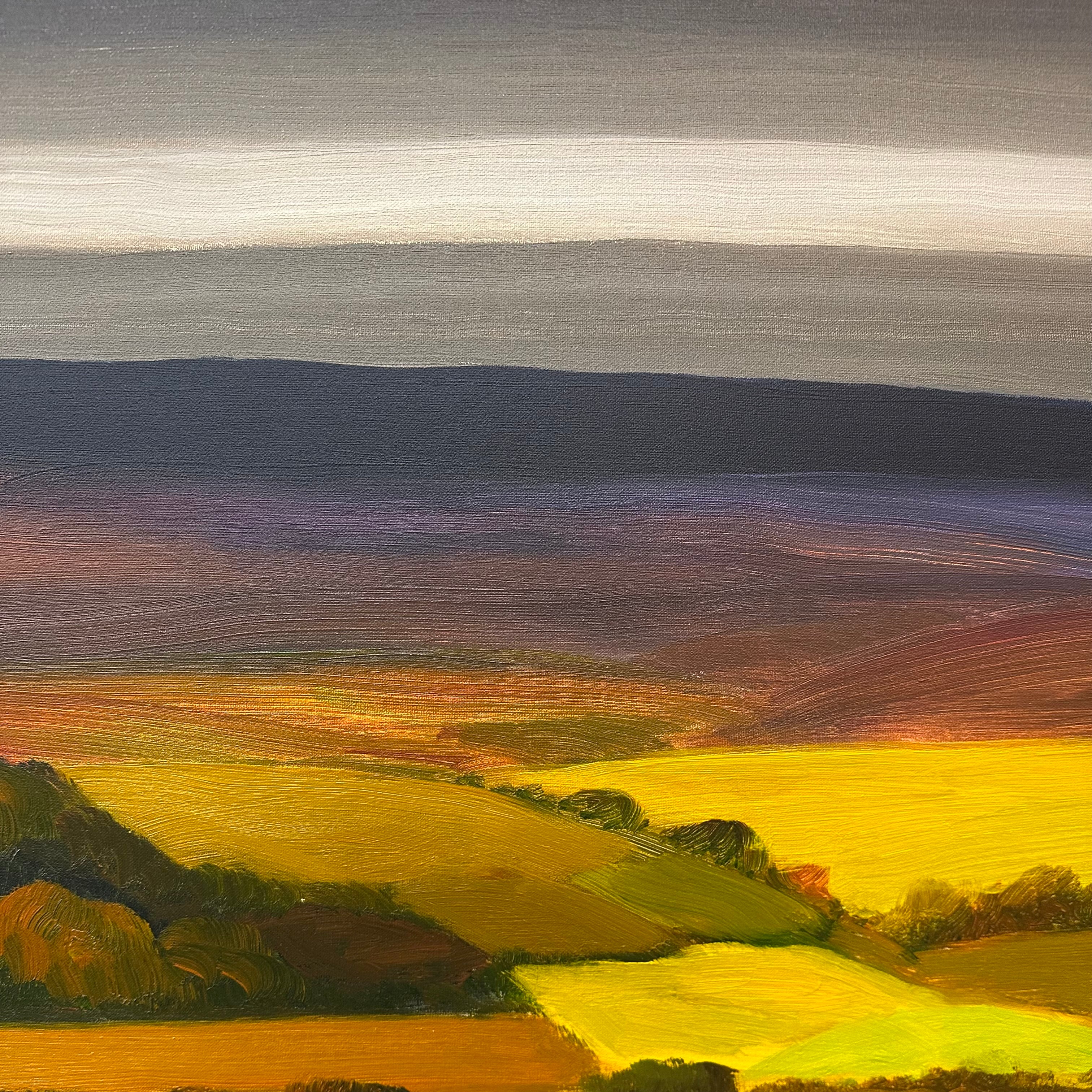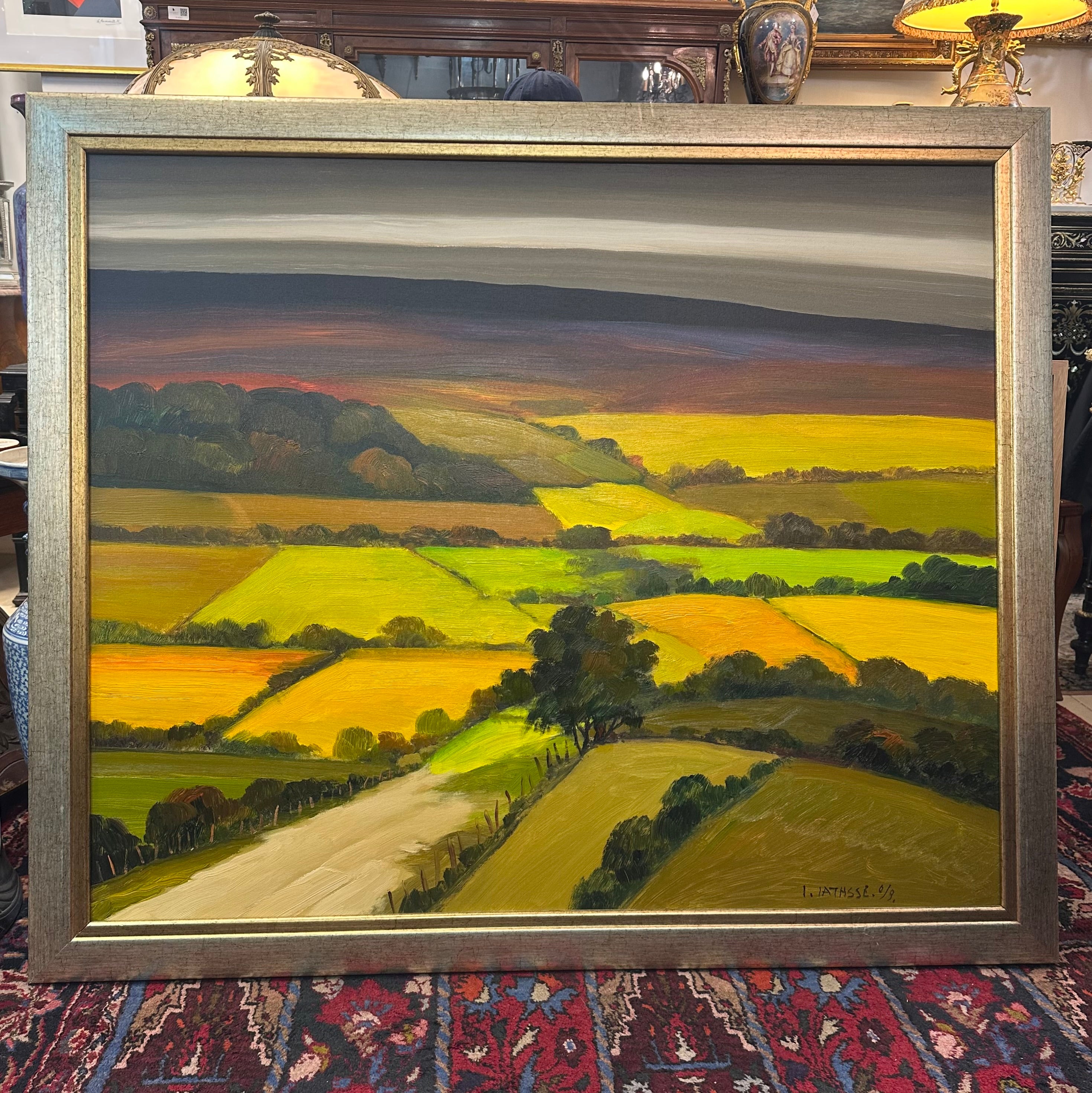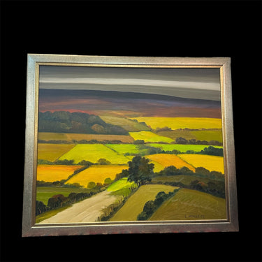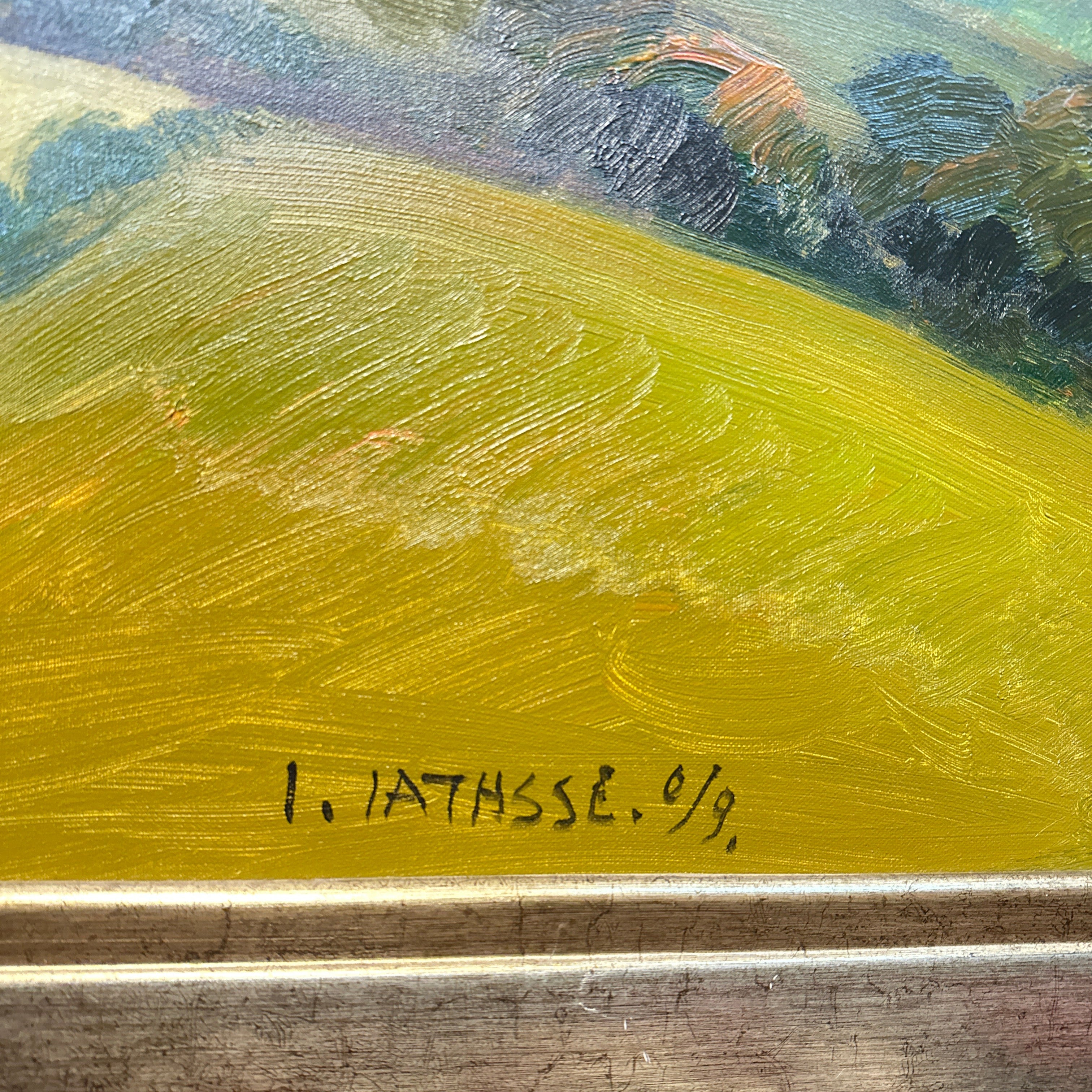 Peinture à l'huile de l'artiste chilien Carlos Catasse. Ce tableau représente un paysage rural aux tons chauds, accompagné d'un cadre en bois peint argent et or aux détails vieillis.