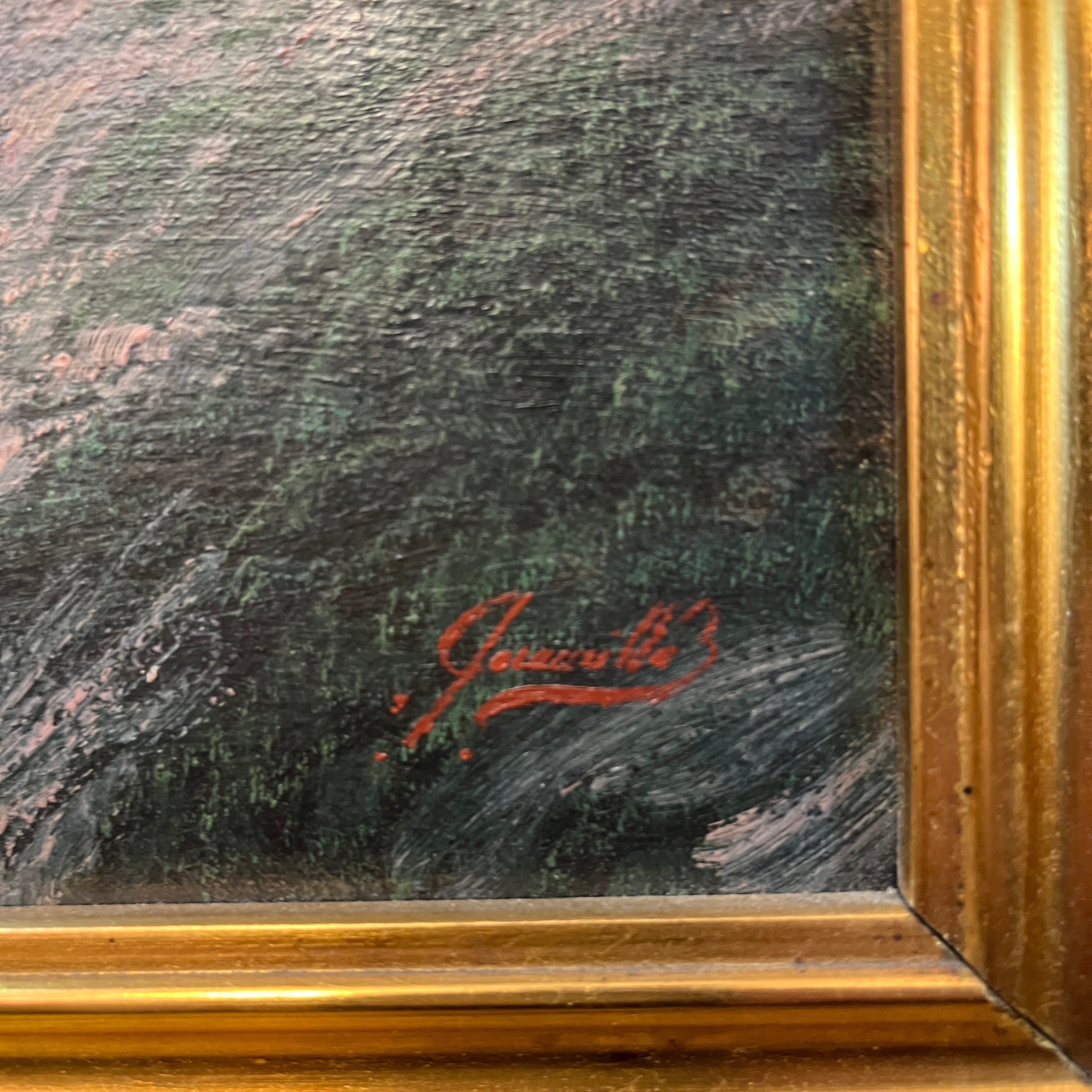 Hermosa obra del reconocido artista chileno Carlos Jaramillo, representando una mirada panorámica del campo chileno y una mujer en sus tareas cotidianas. Presenta un marco de madera tallada pintado en dorado.