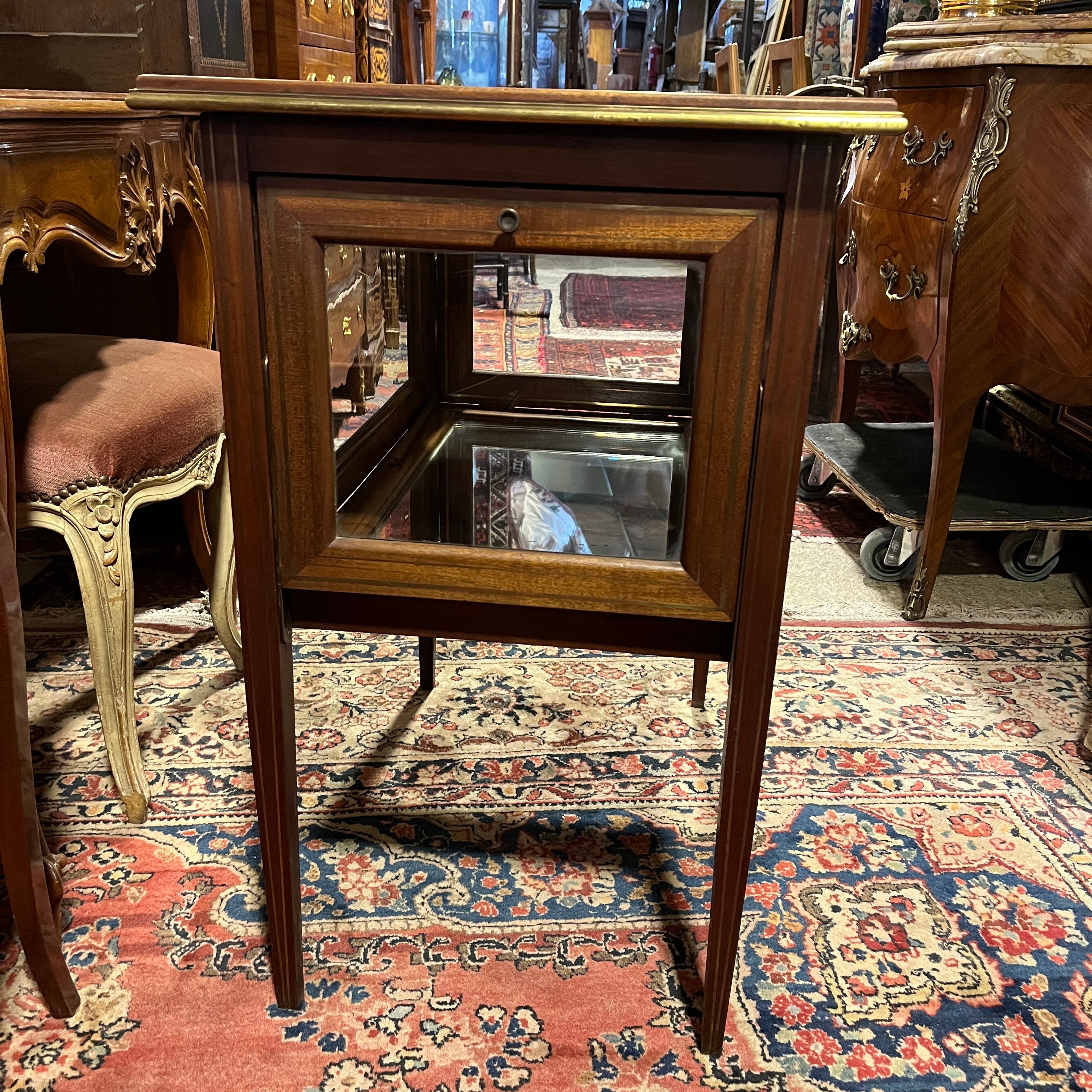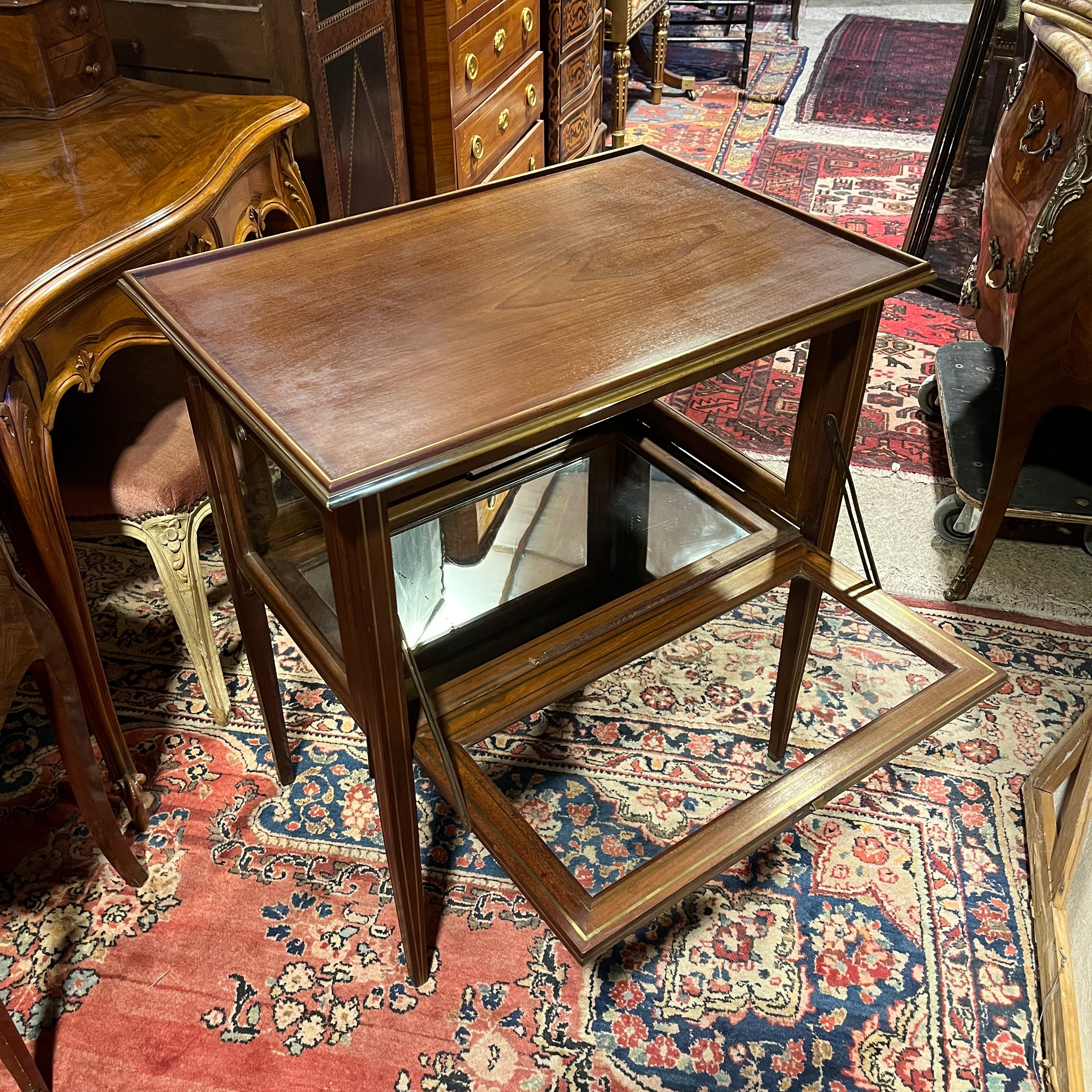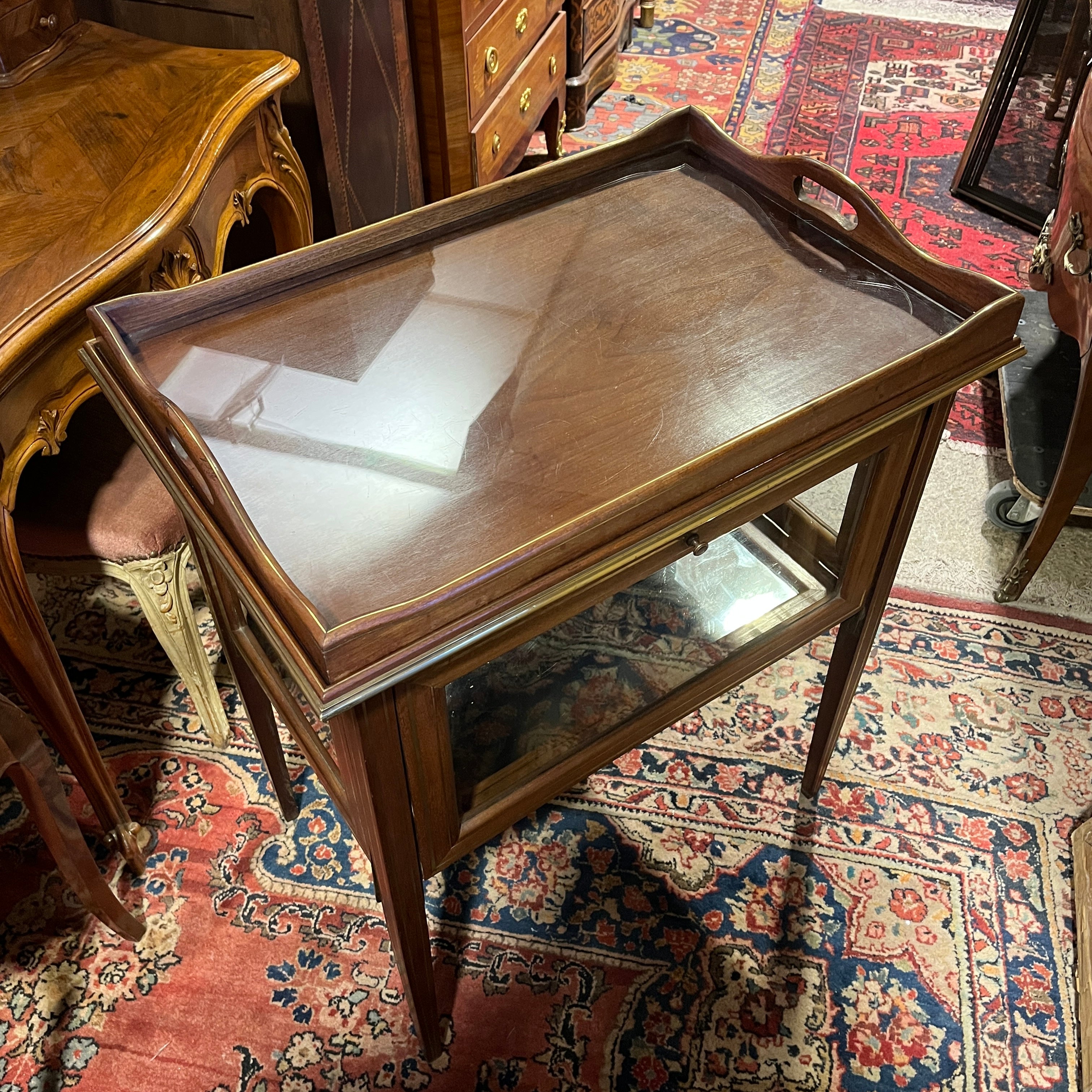 Carro de té de origen inglés estilo Edwardian, hecho de madera de caoba con filete de incrustación en bronce, incluyendo la bandeja. La pieza tiene 4 compuertas con tiradores en bronce y superficie de vidrio, que caen mediante sus bisagras y que permiten ver los objetos en el interior, terminado con un espejo en su superficie.
