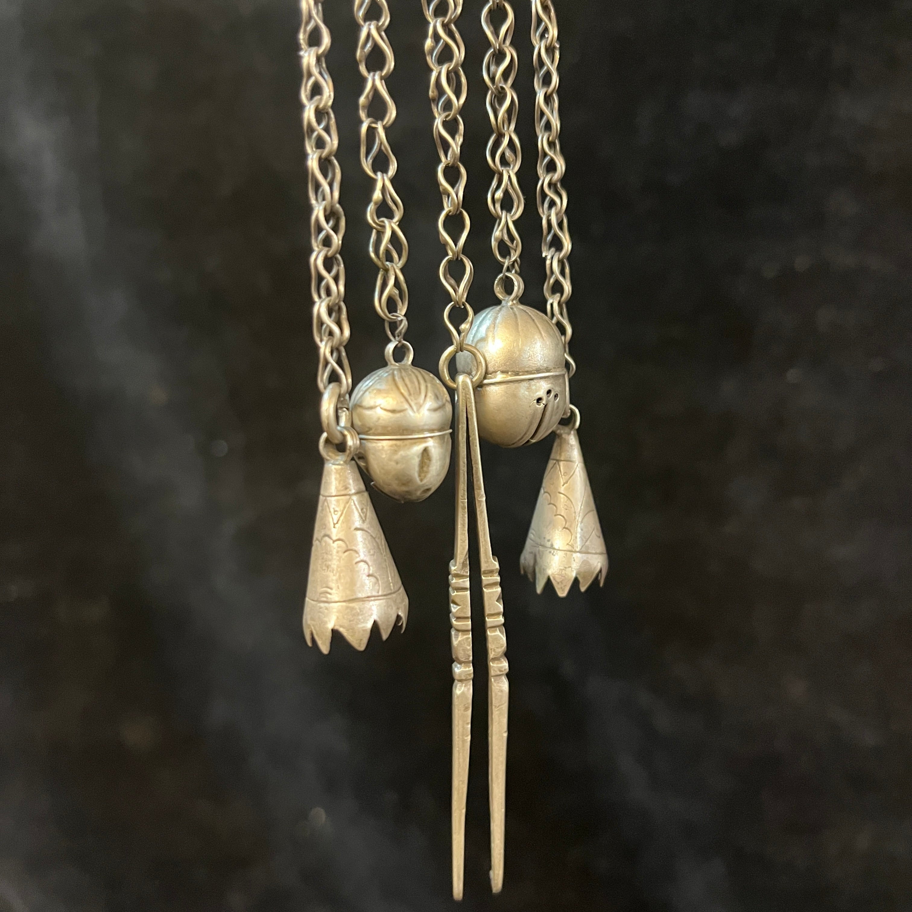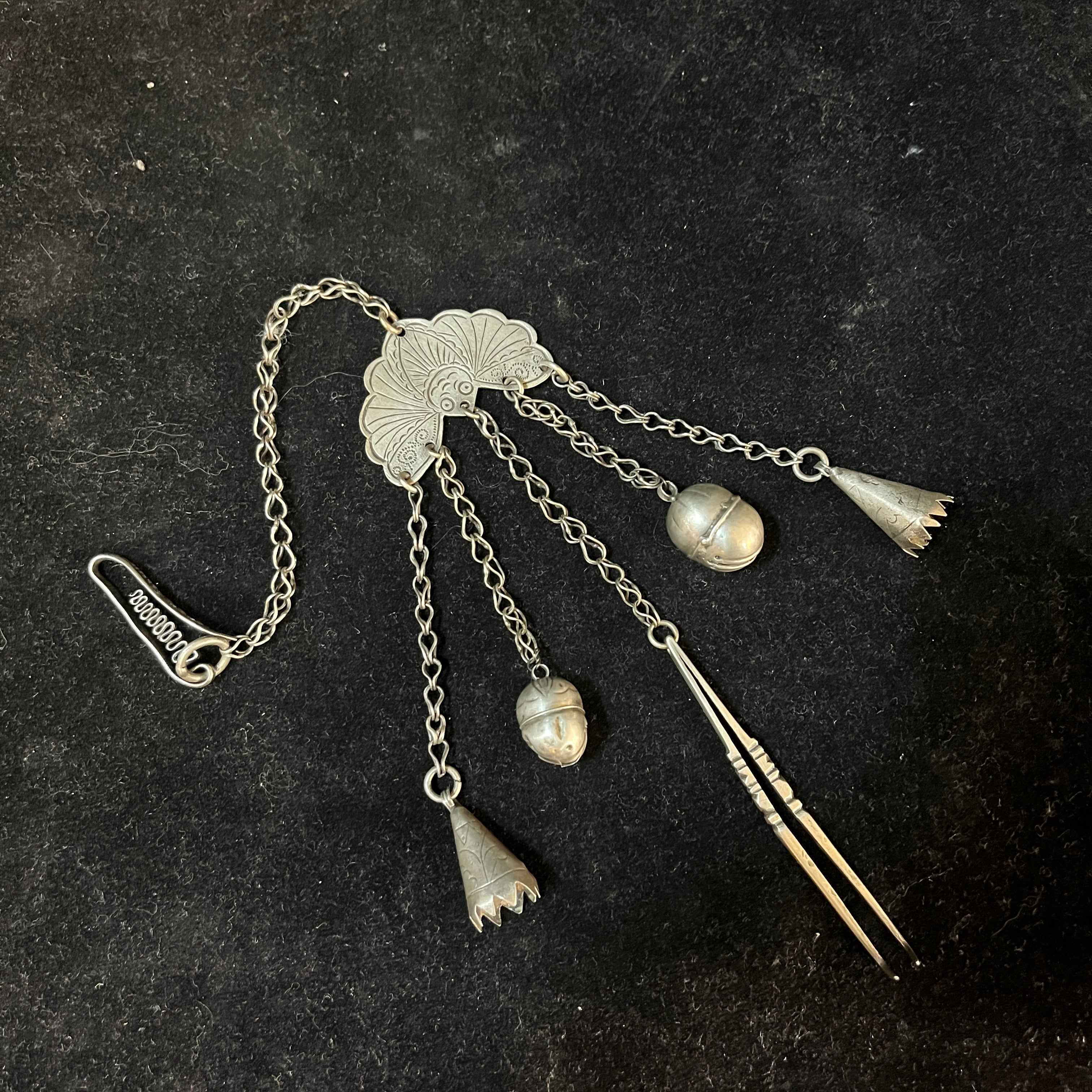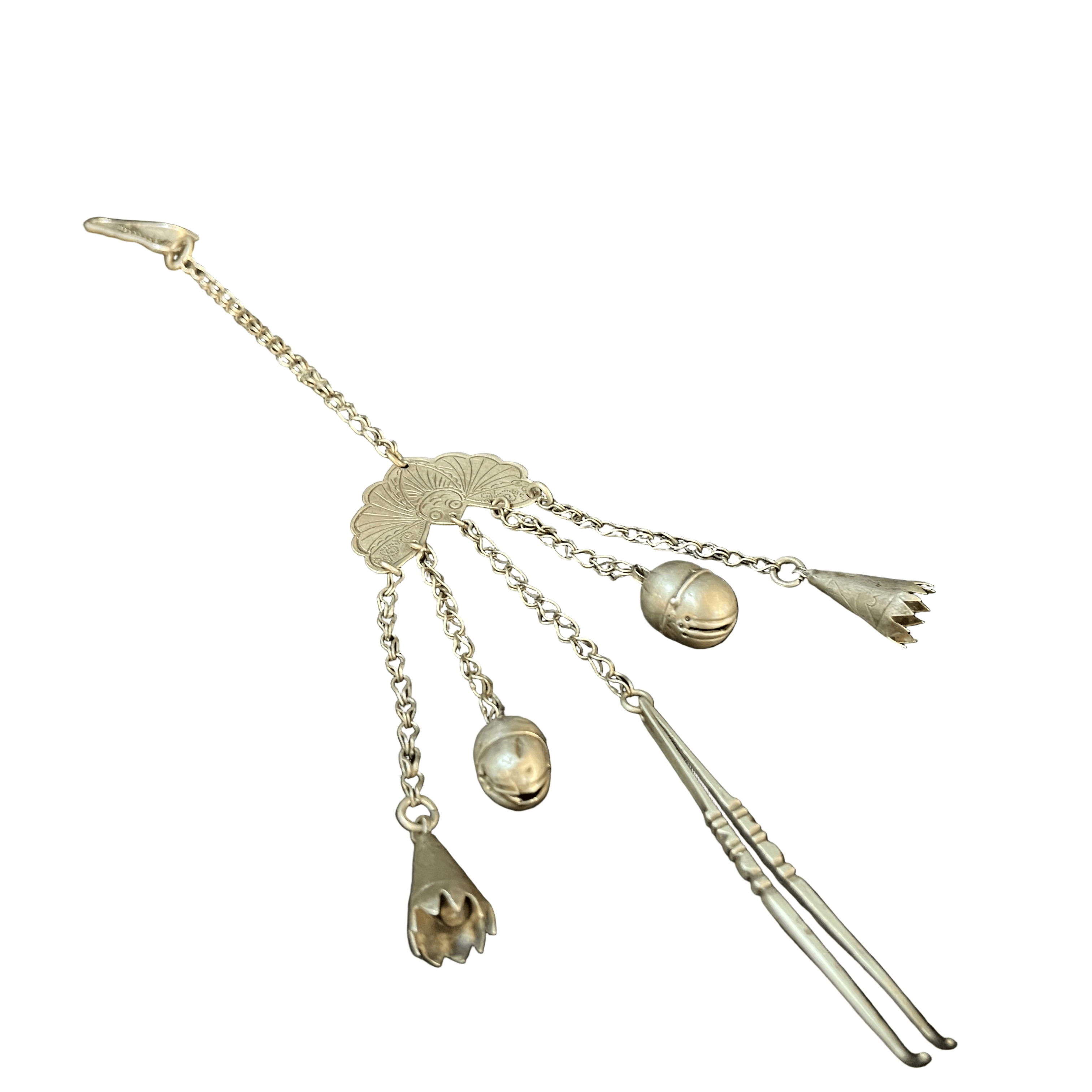 Bello Chatelaine de origen oriental, posiblemente chino, hecho de plata. La pieza, pensada para ser colgada en el cinturón, tiene una pequeña pinza entre sus colgantes y cascabeles, elemento que hace pensar que este Chatelaine era usado como accesorio para preparar opio. Entre su broche y los colgantes, hay una linda figura tallada que representa una mariposa, animal asociado simbólicamente en muchas culturas al opio.