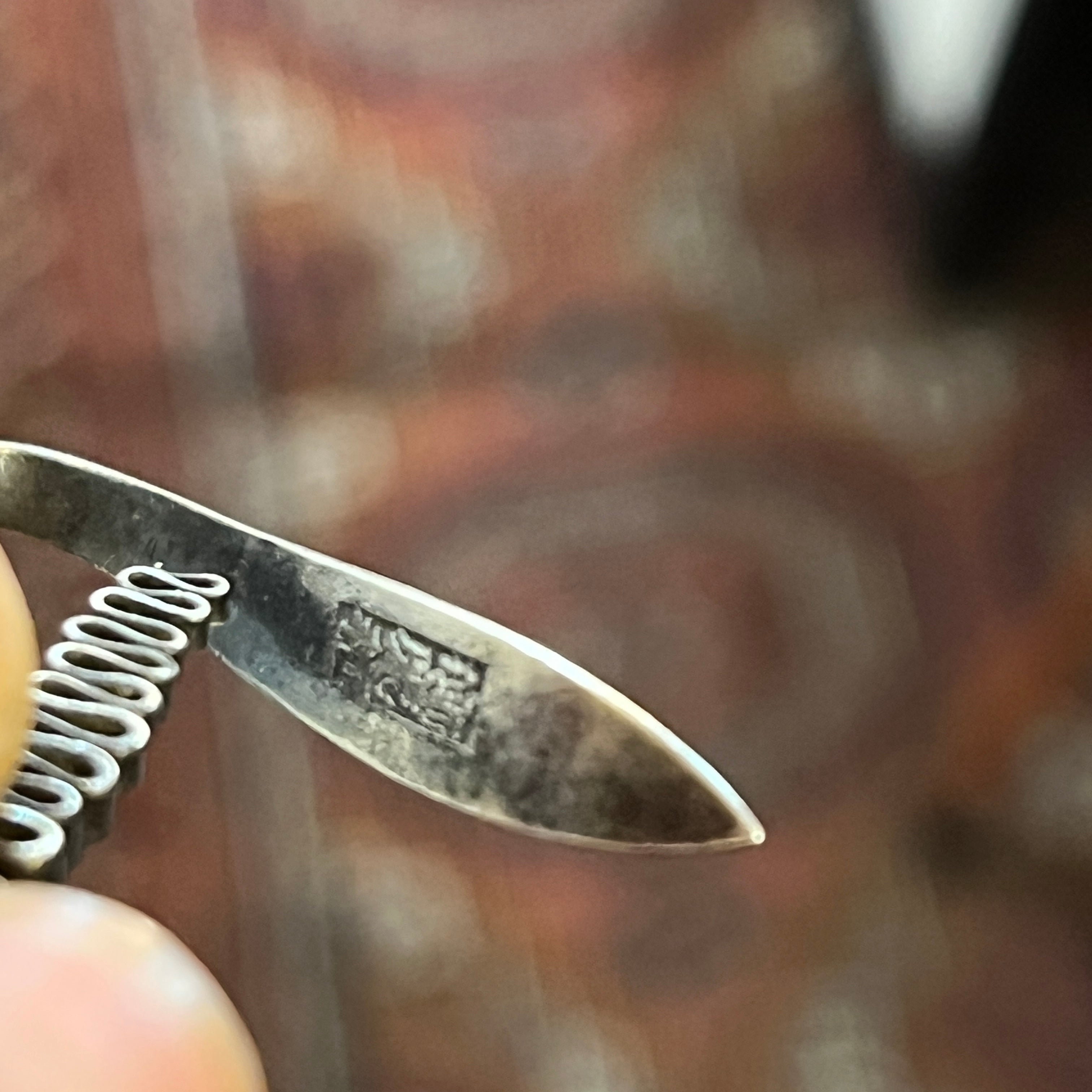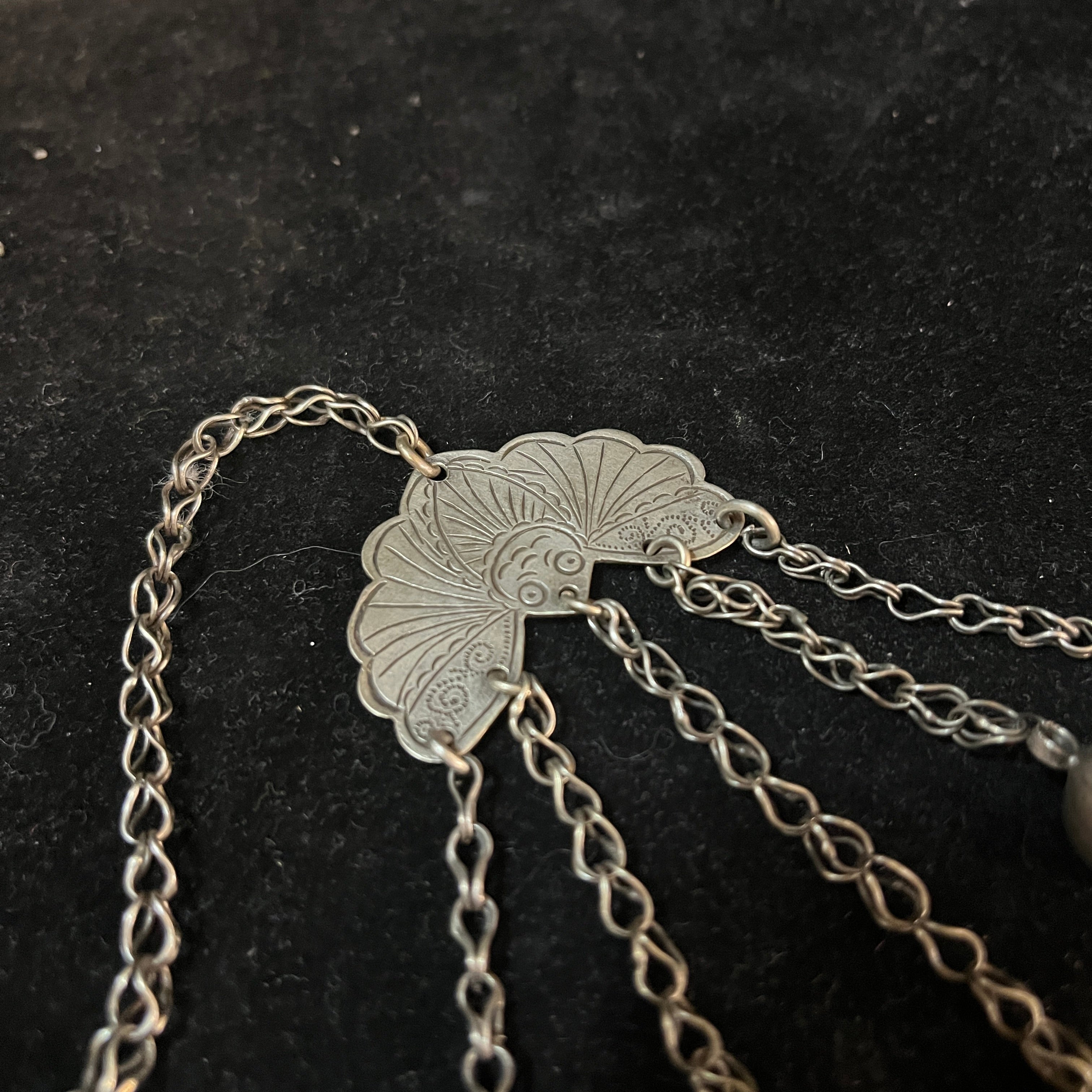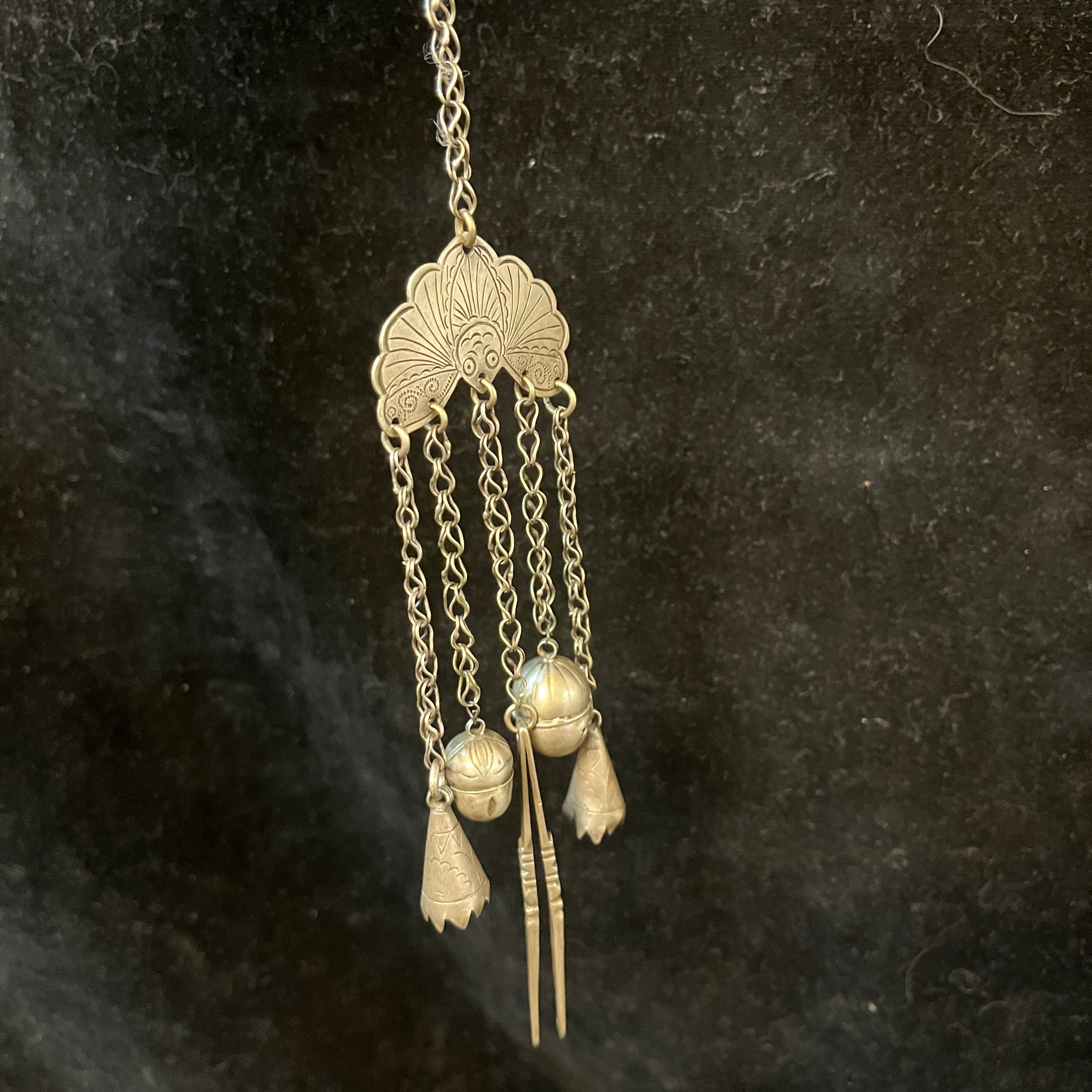 Bello Chatelaine de origen oriental, posiblemente chino, hecho de plata. La pieza, pensada para ser colgada en el cinturón, tiene una pequeña pinza entre sus colgantes y cascabeles, elemento que hace pensar que este Chatelaine era usado como accesorio para preparar opio. Entre su broche y los colgantes, hay una linda figura tallada que representa una mariposa, animal asociado simbólicamente en muchas culturas al opio.