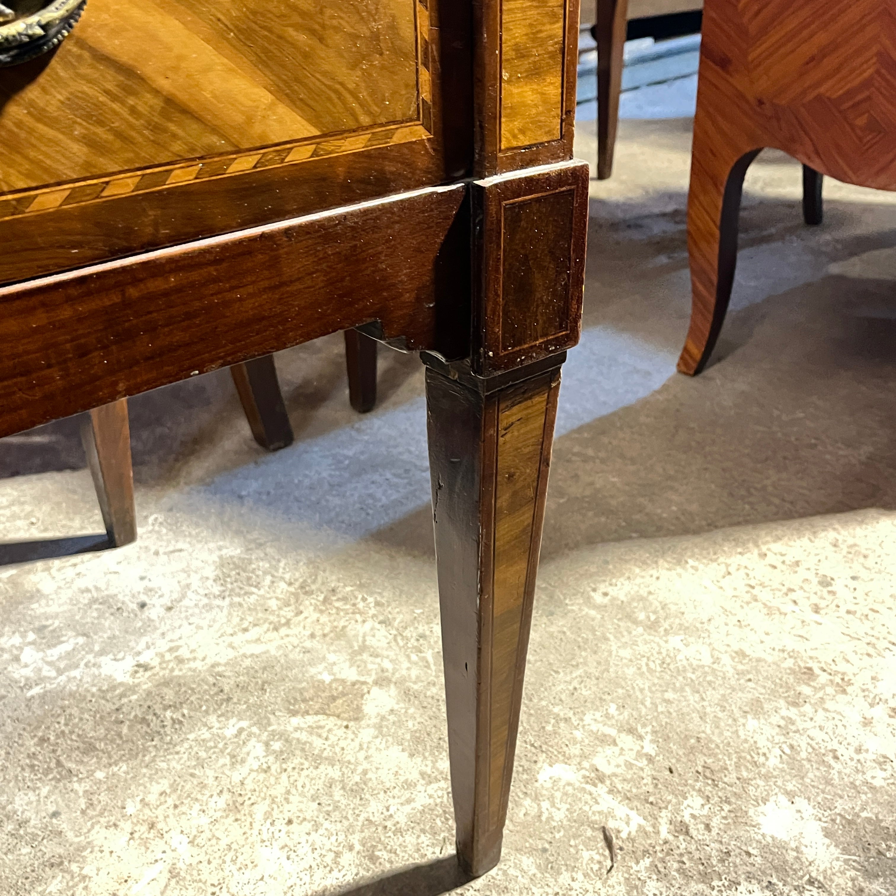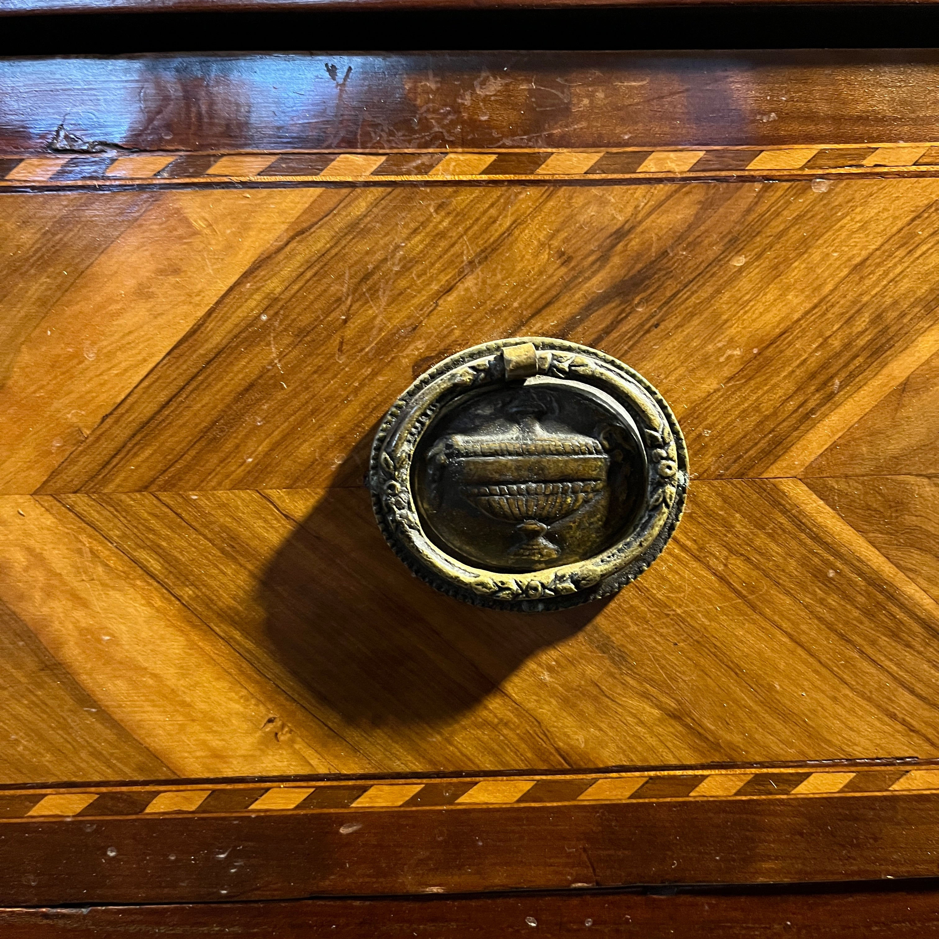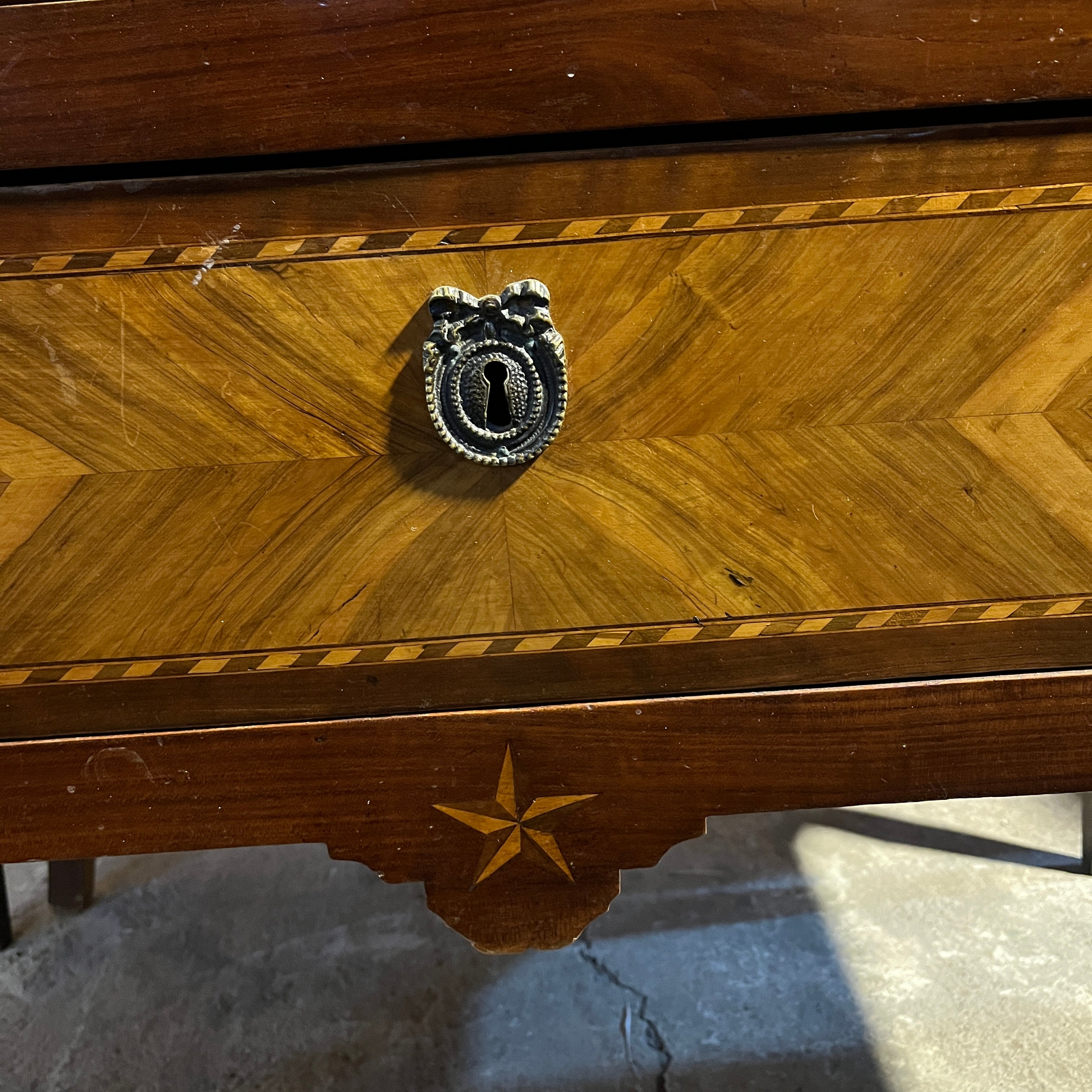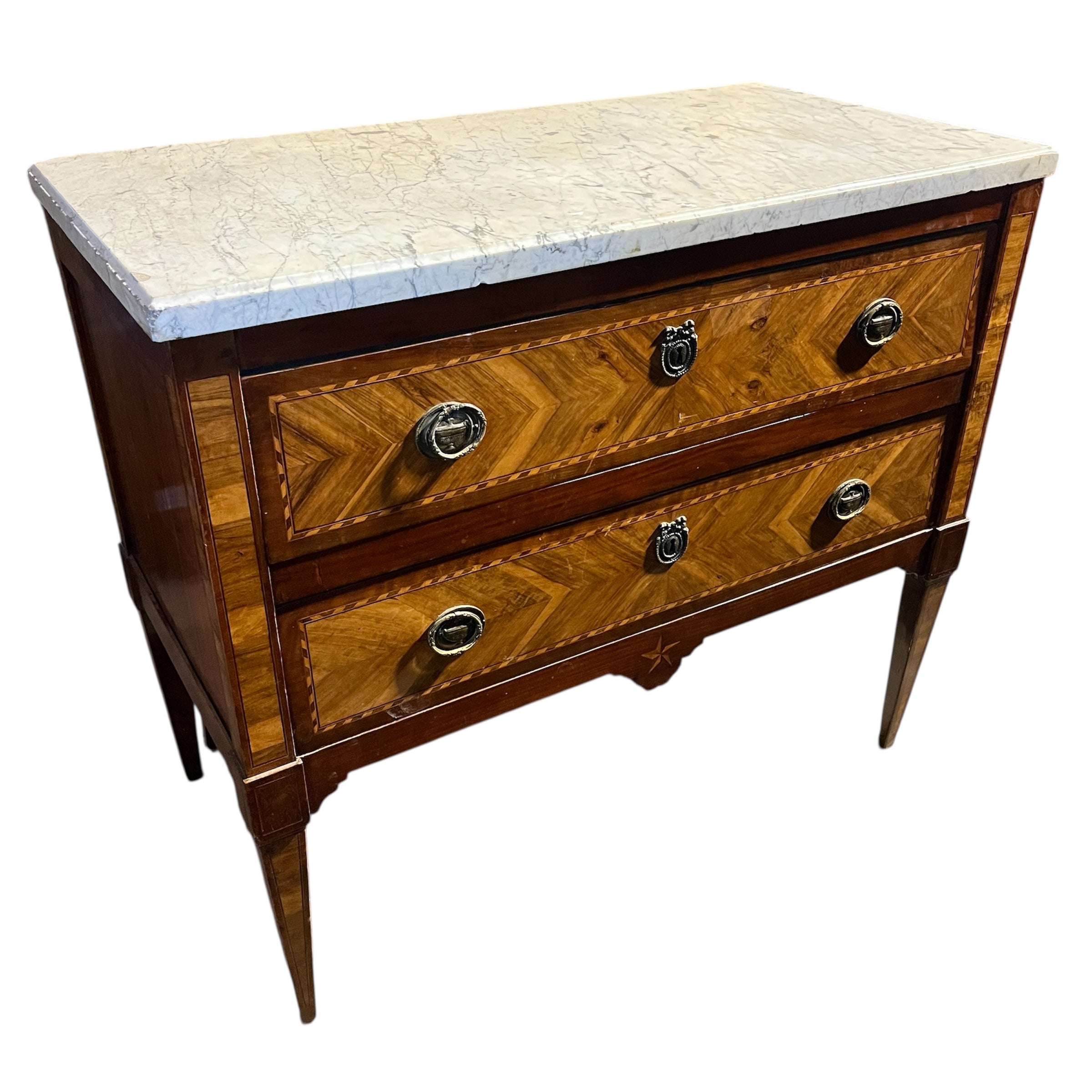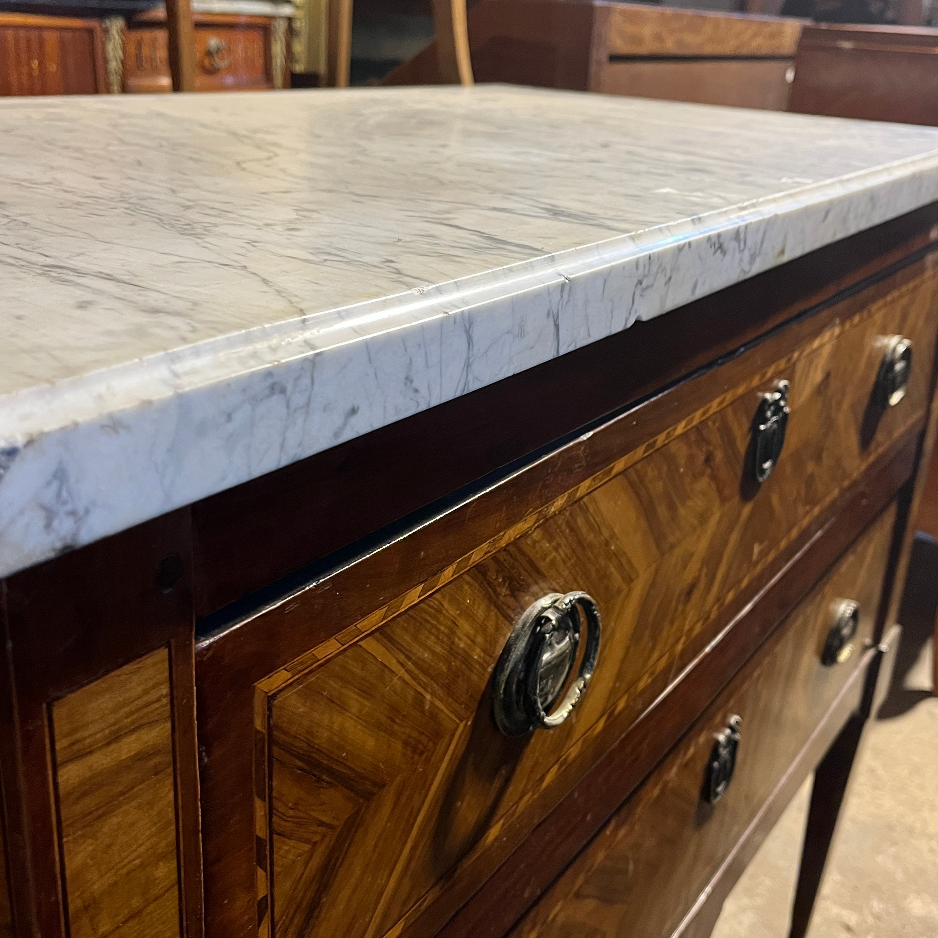 Elegante cómoda francesa estilo transición enchapada en nogal, palo rosa y caoba con diseño de filetes, tiradores de bronce con argolla de figura de cáliz en relieve, dos cajones y cubierta de mármol blanco.