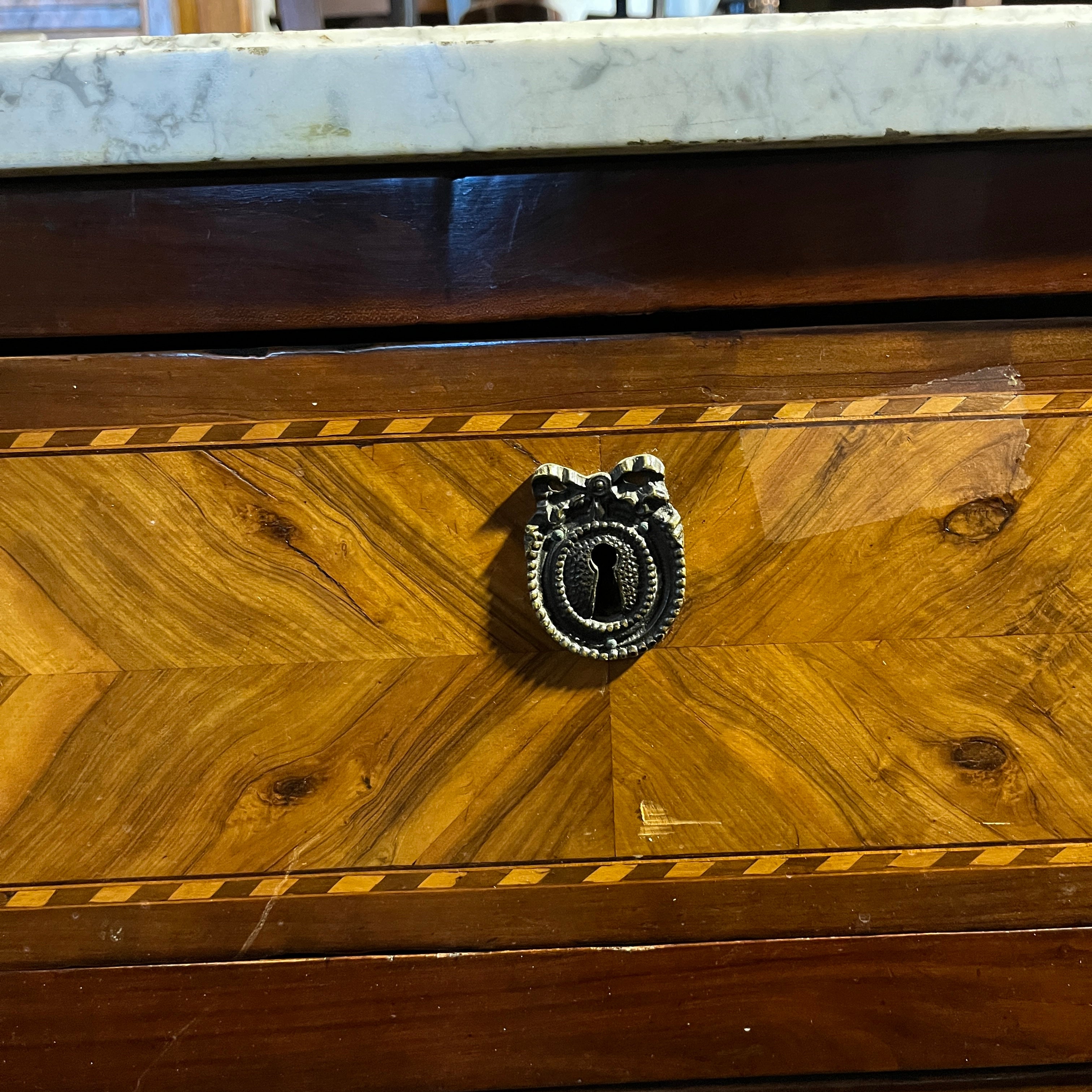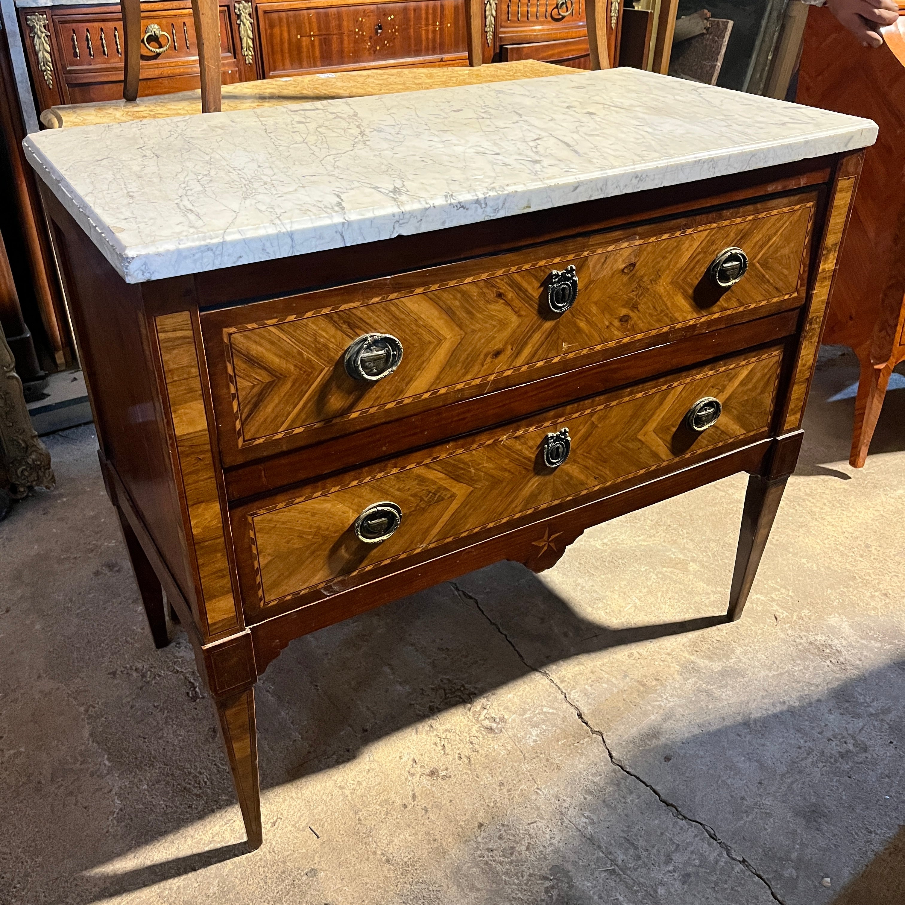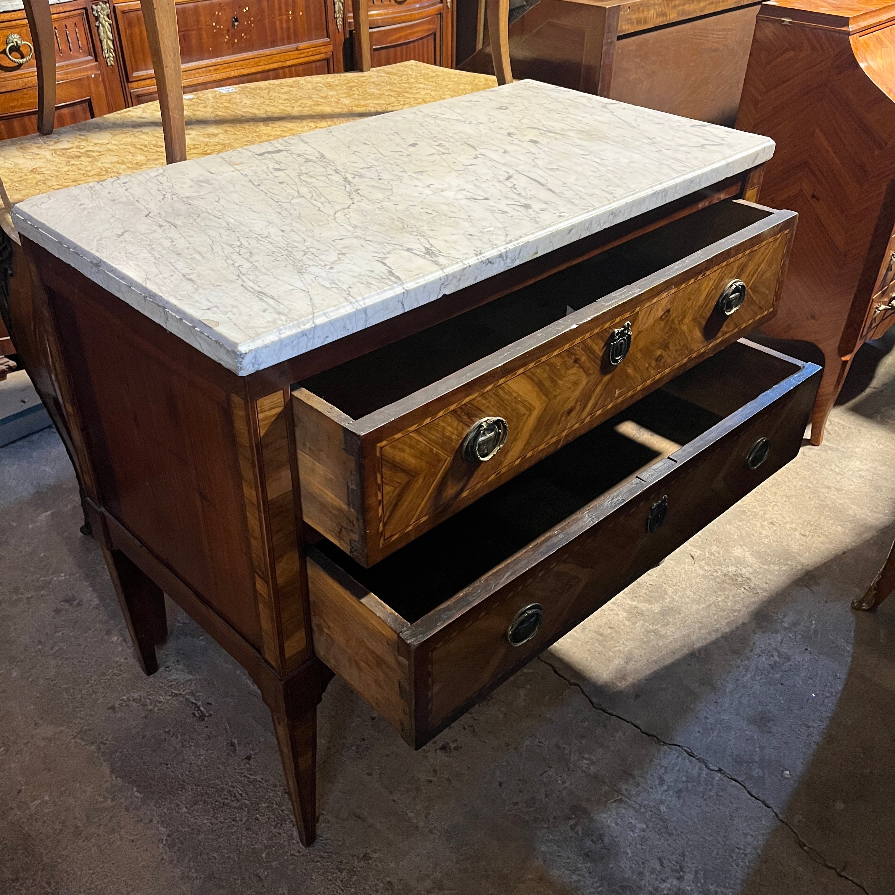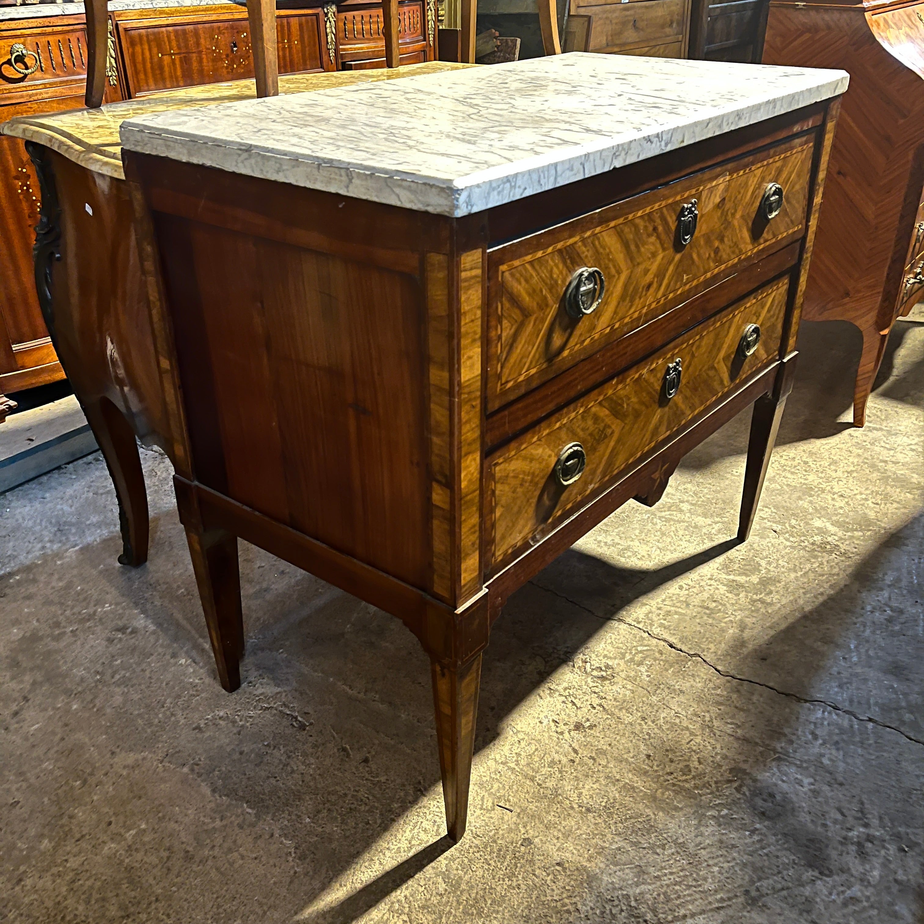Cómoda francesa estilo transición enchapado y cubierta de mármol blanco