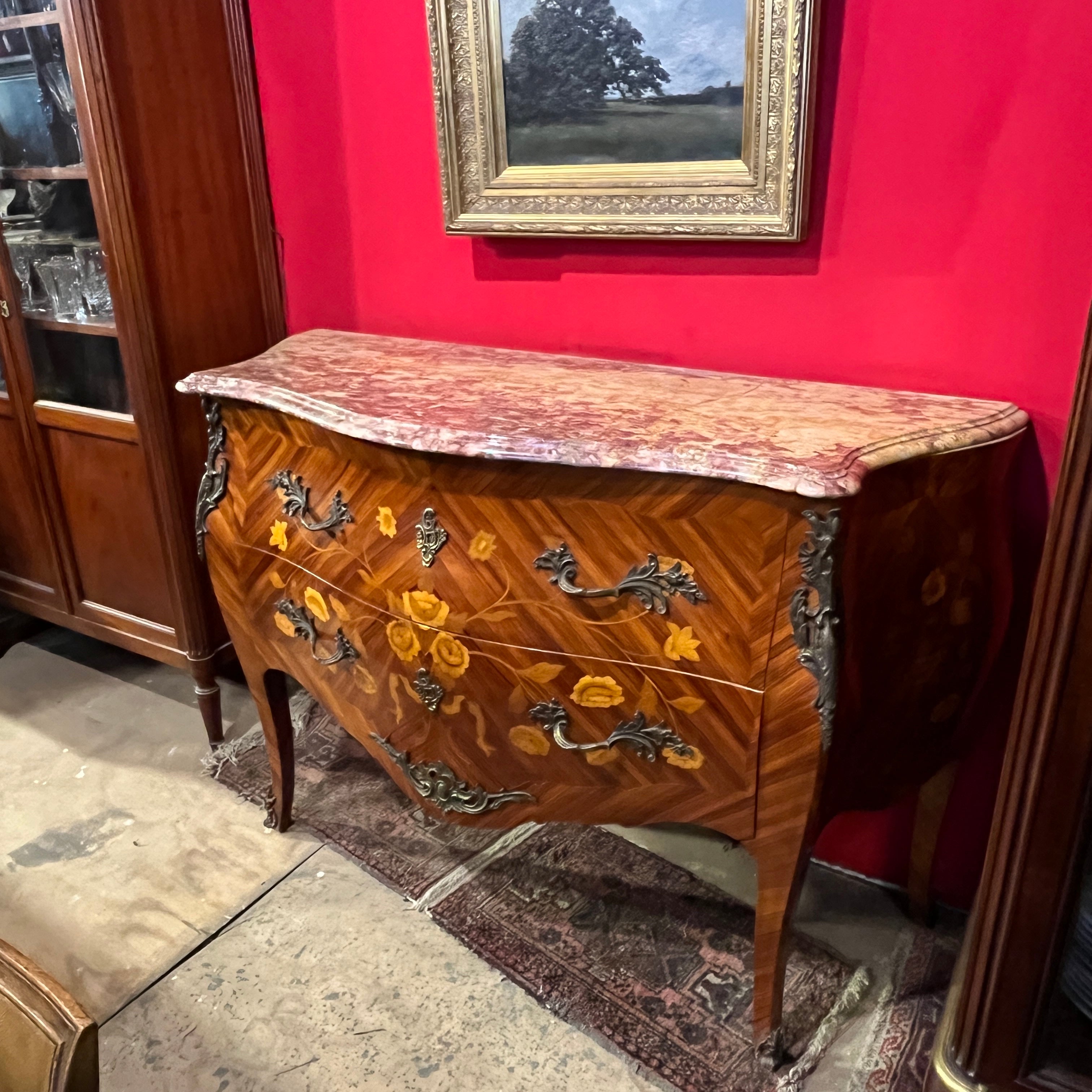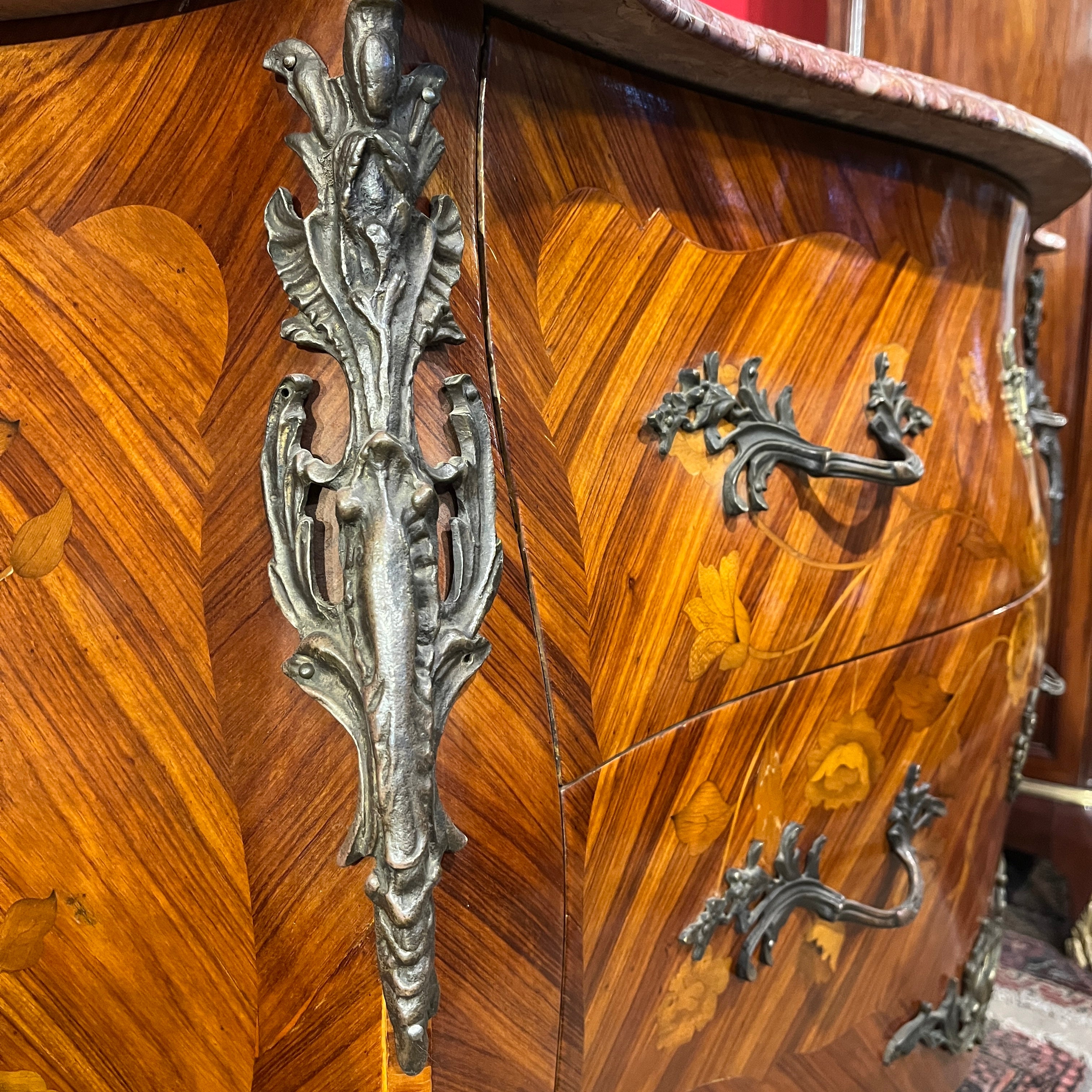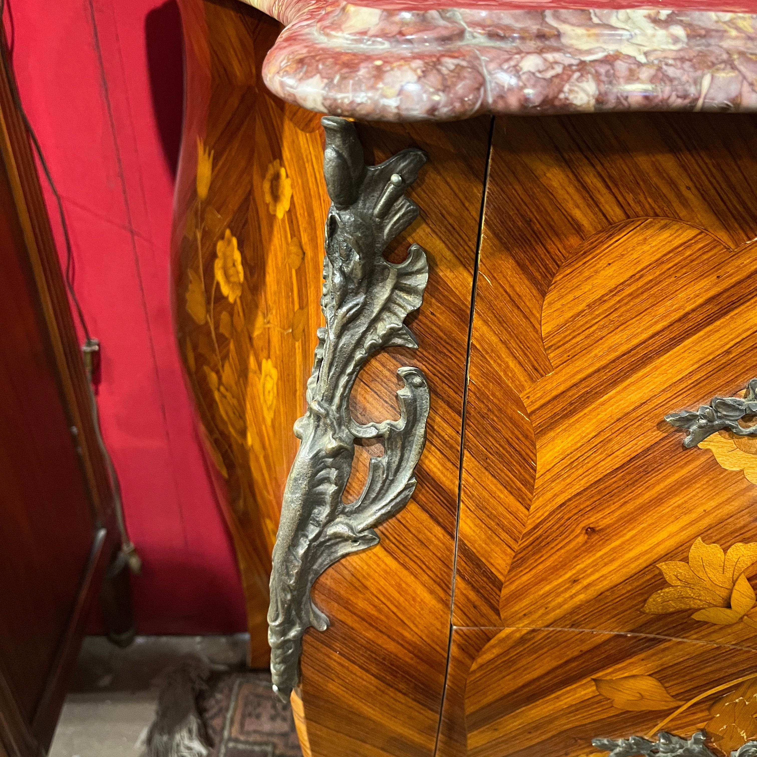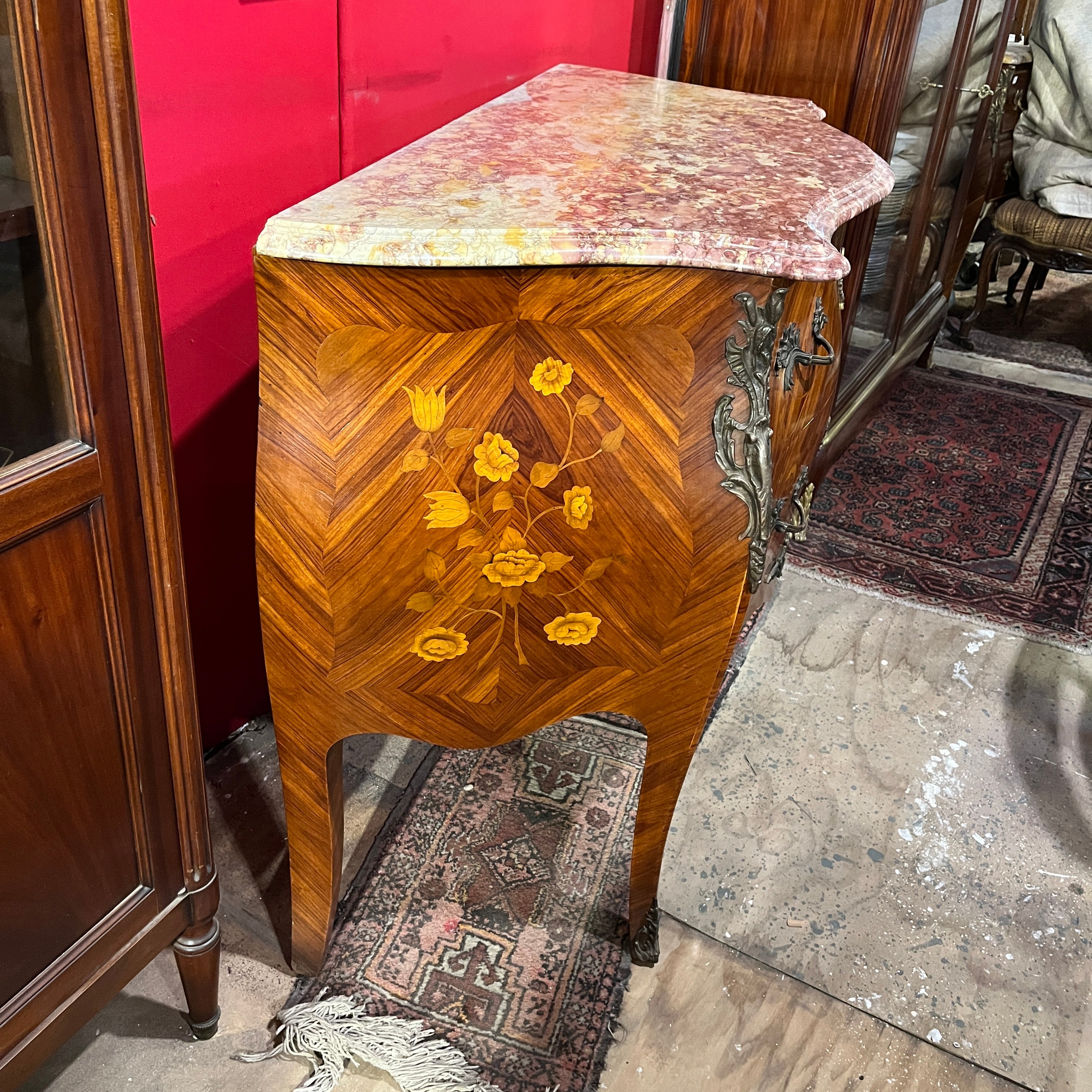 Cómoda Luis XV bombé marquetería floral y mármol rosa