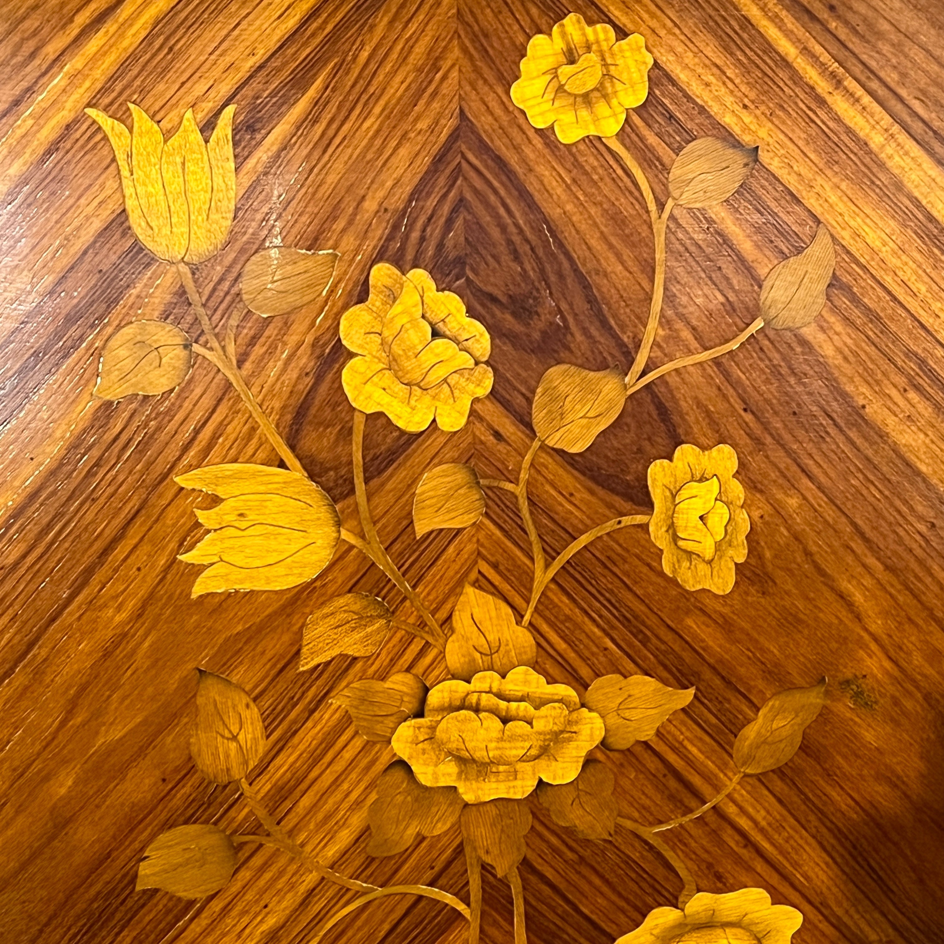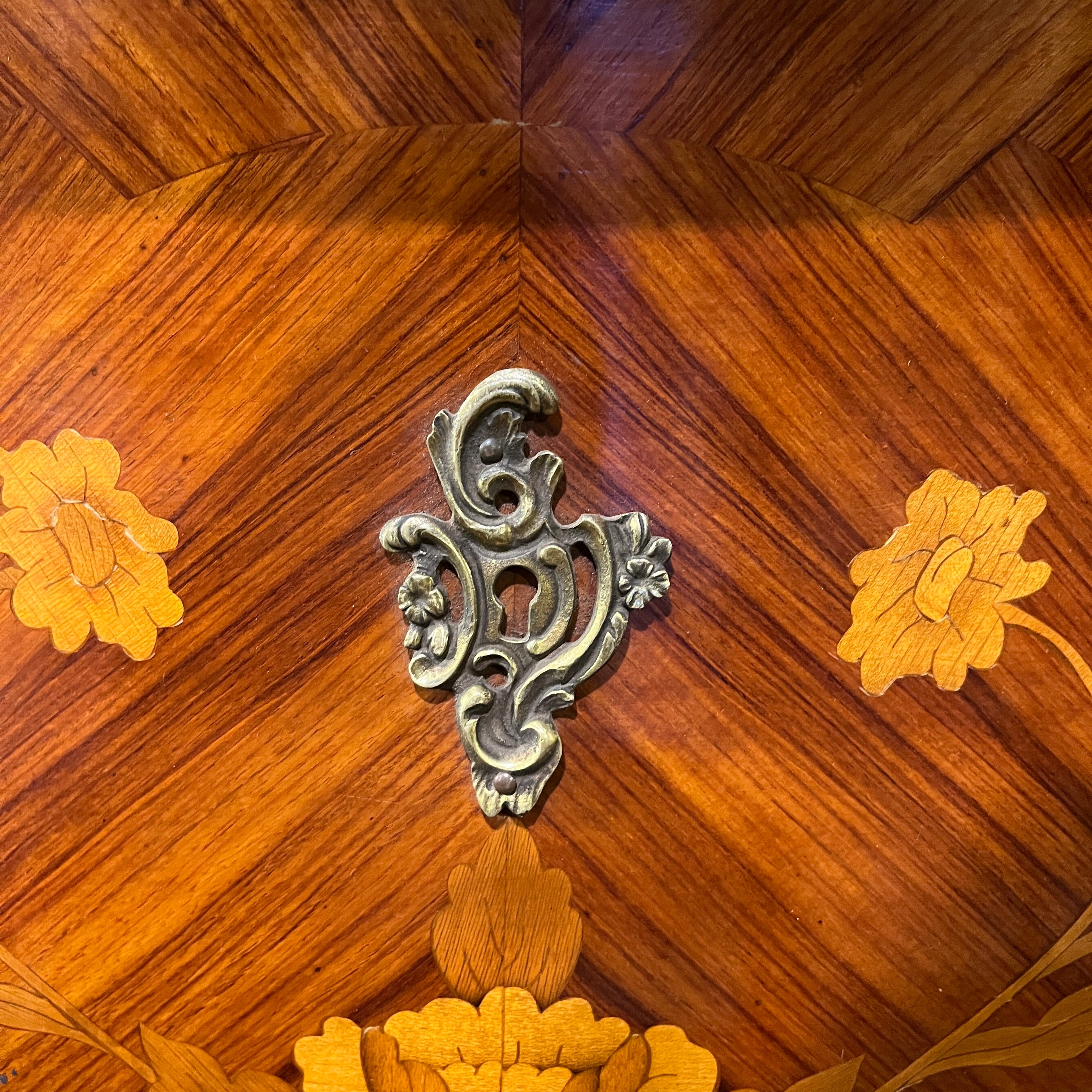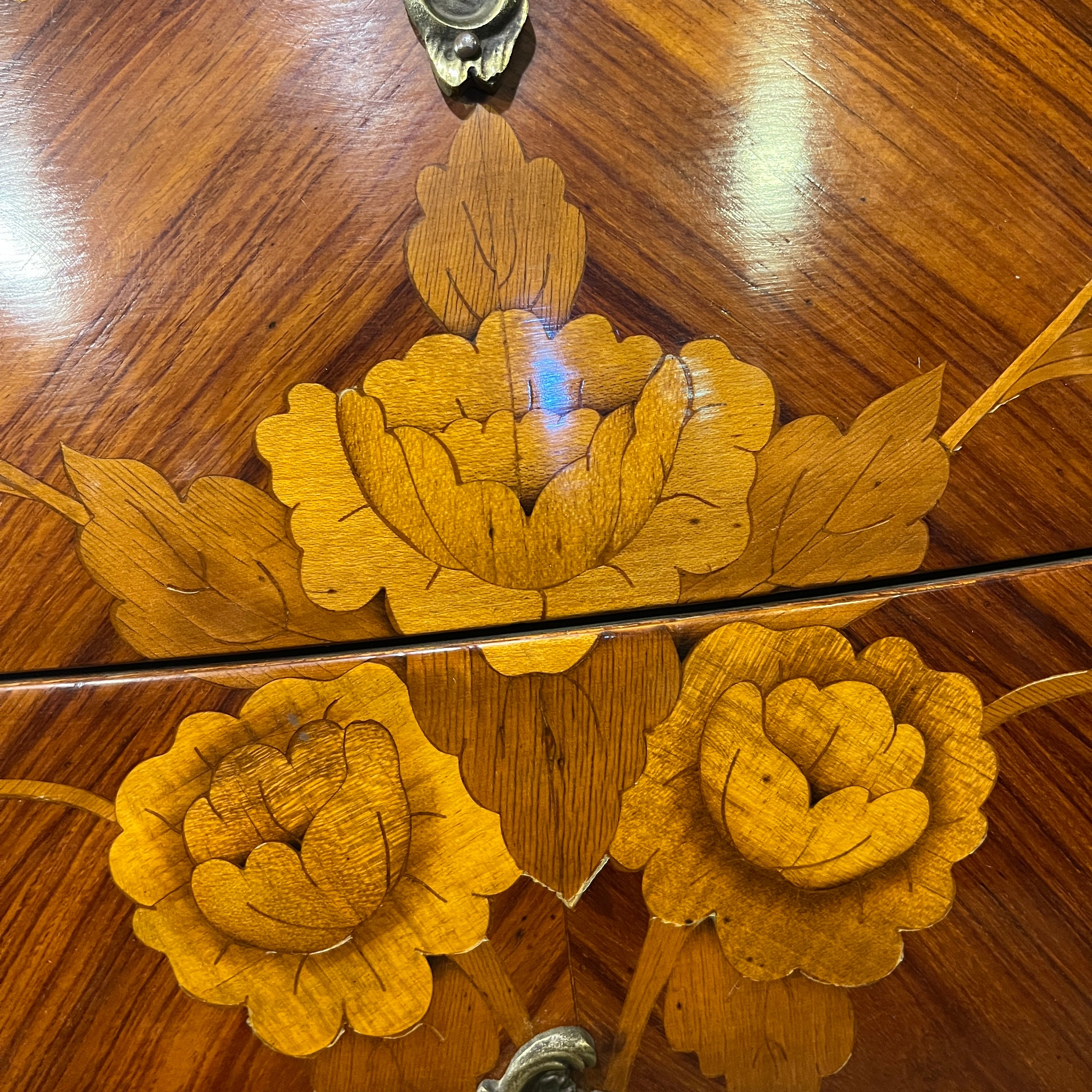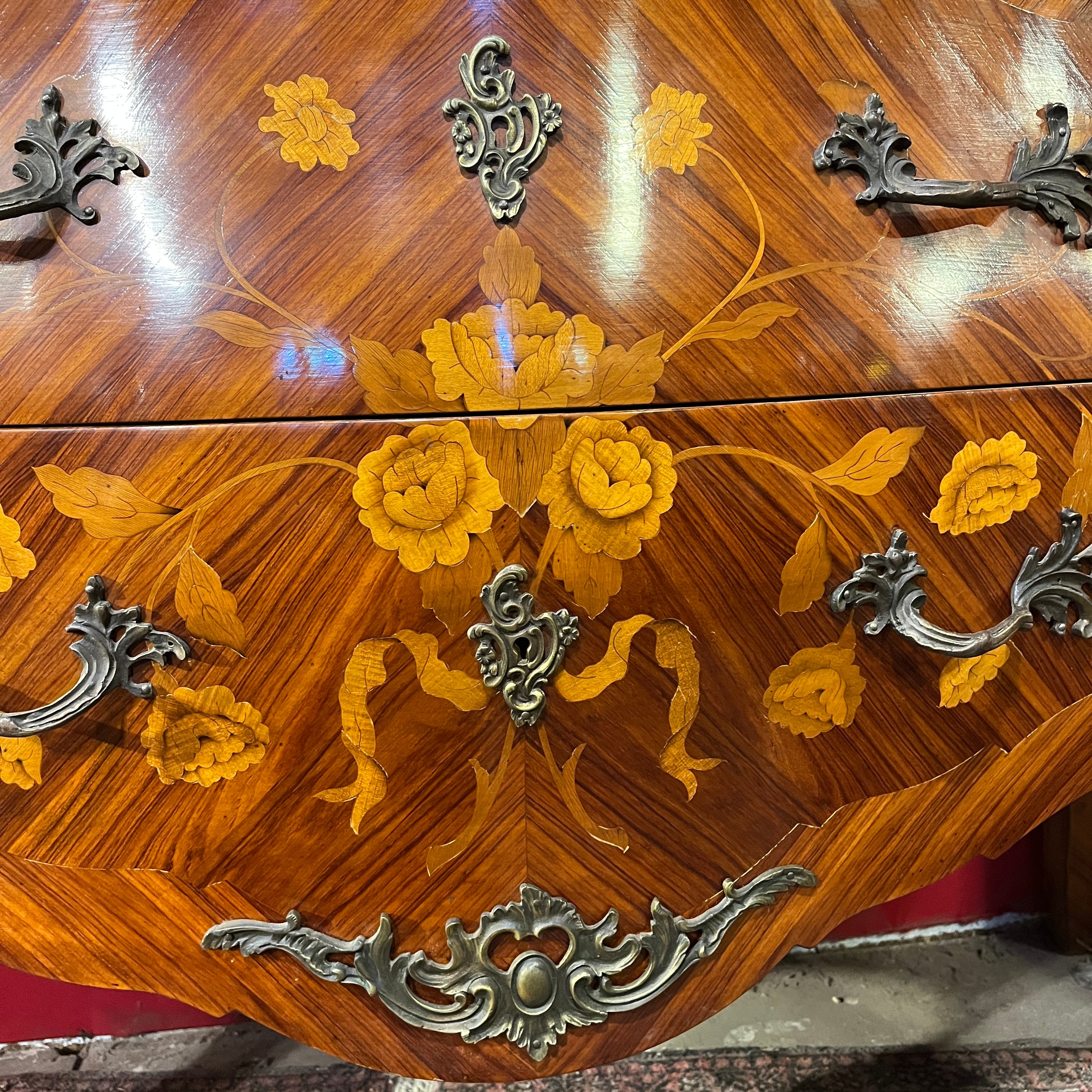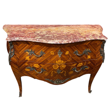 Cómoda Luis XV bombé marquetería floral y mármol rosa