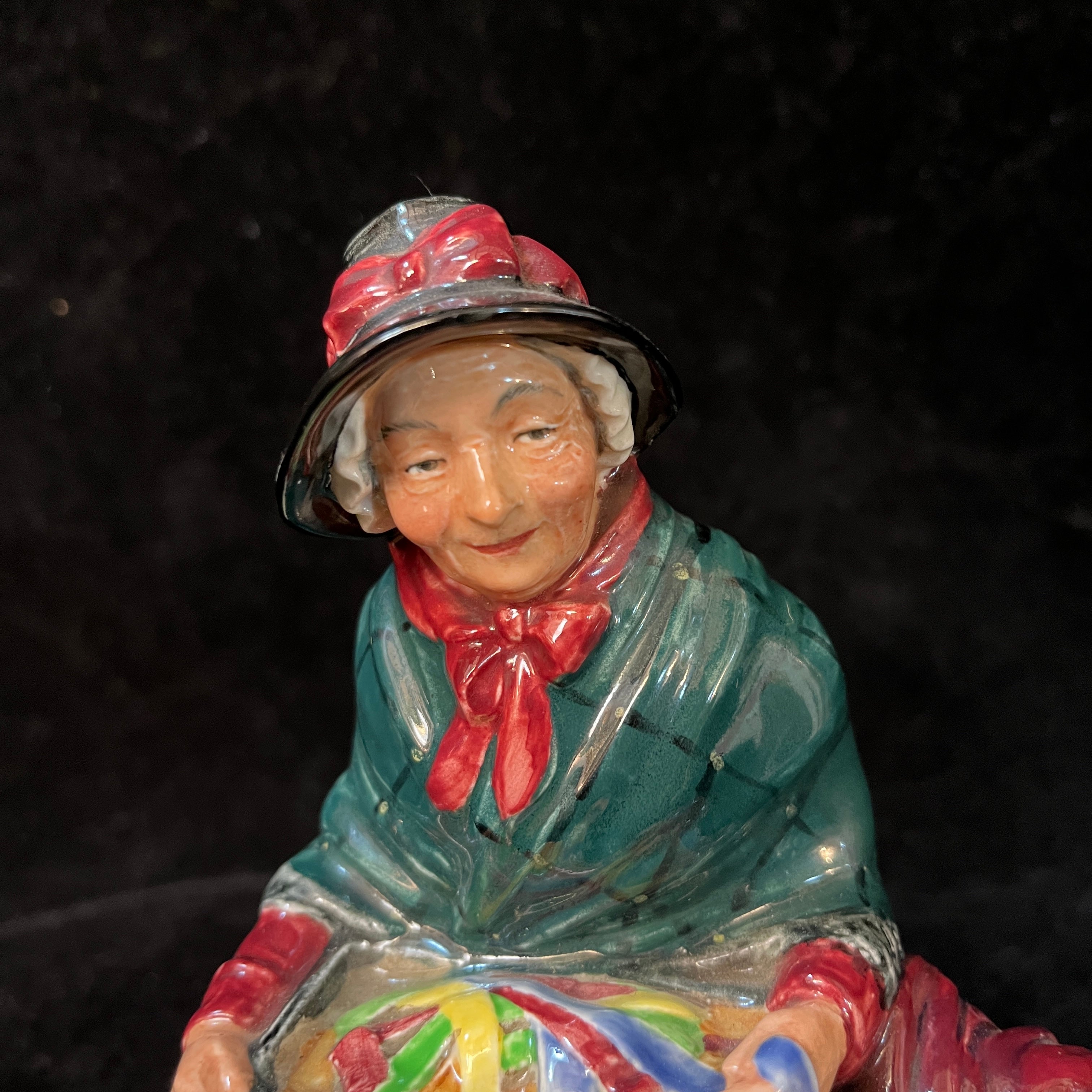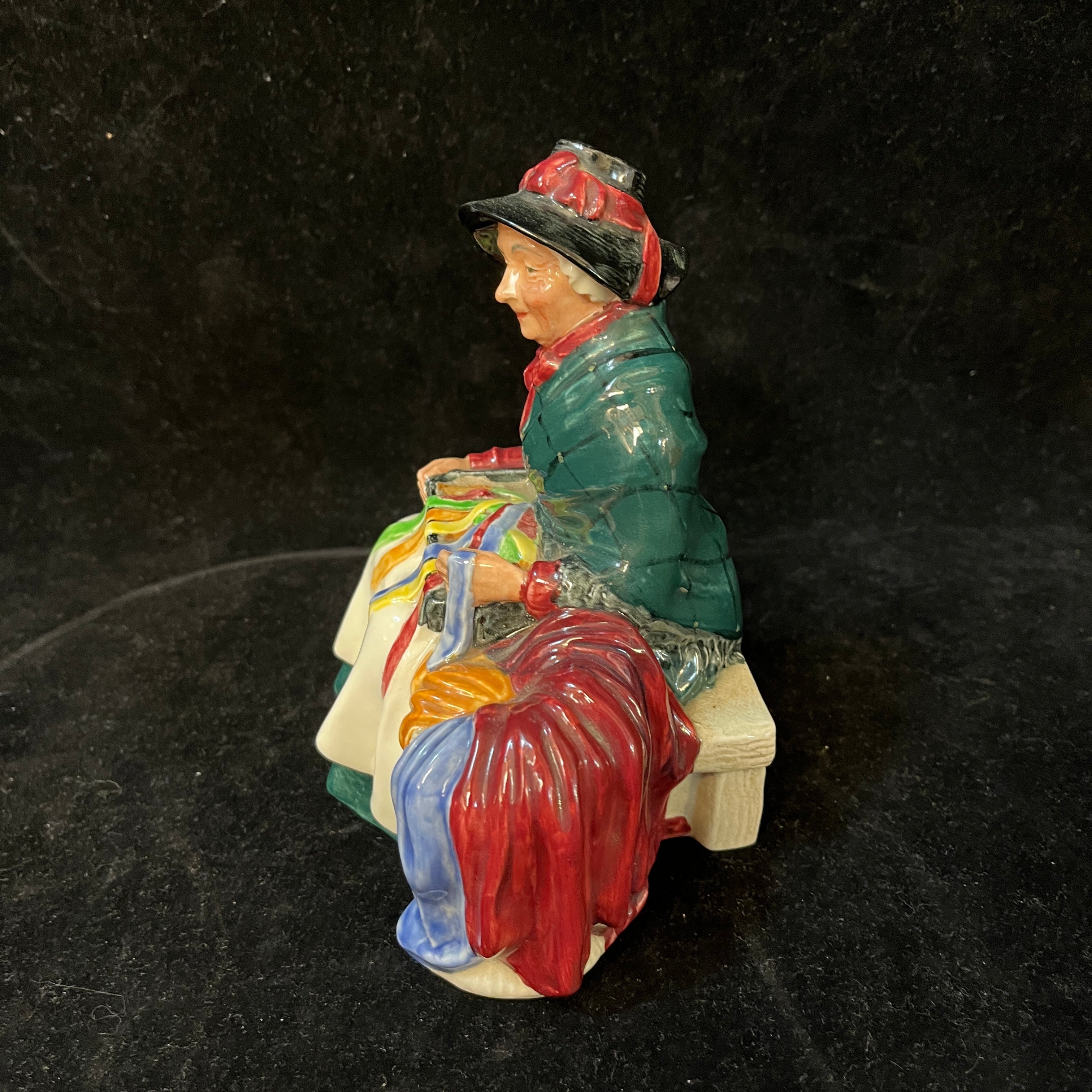 Bella figura de porcelana de la reconocida marca inglesa Royal Doulton, fabricado y pintado a mano. La pieza representa a una vendedora de cintas y cordeles.