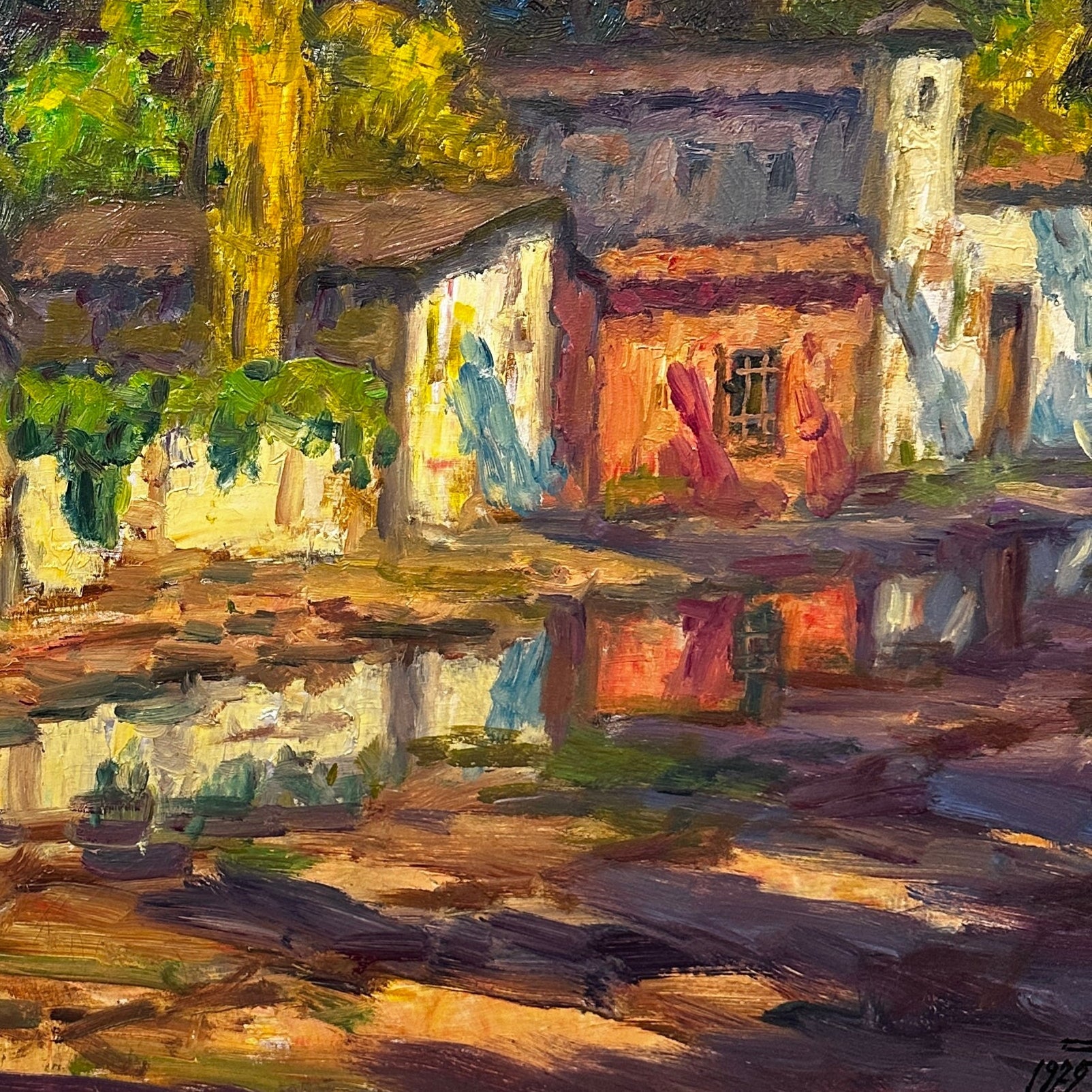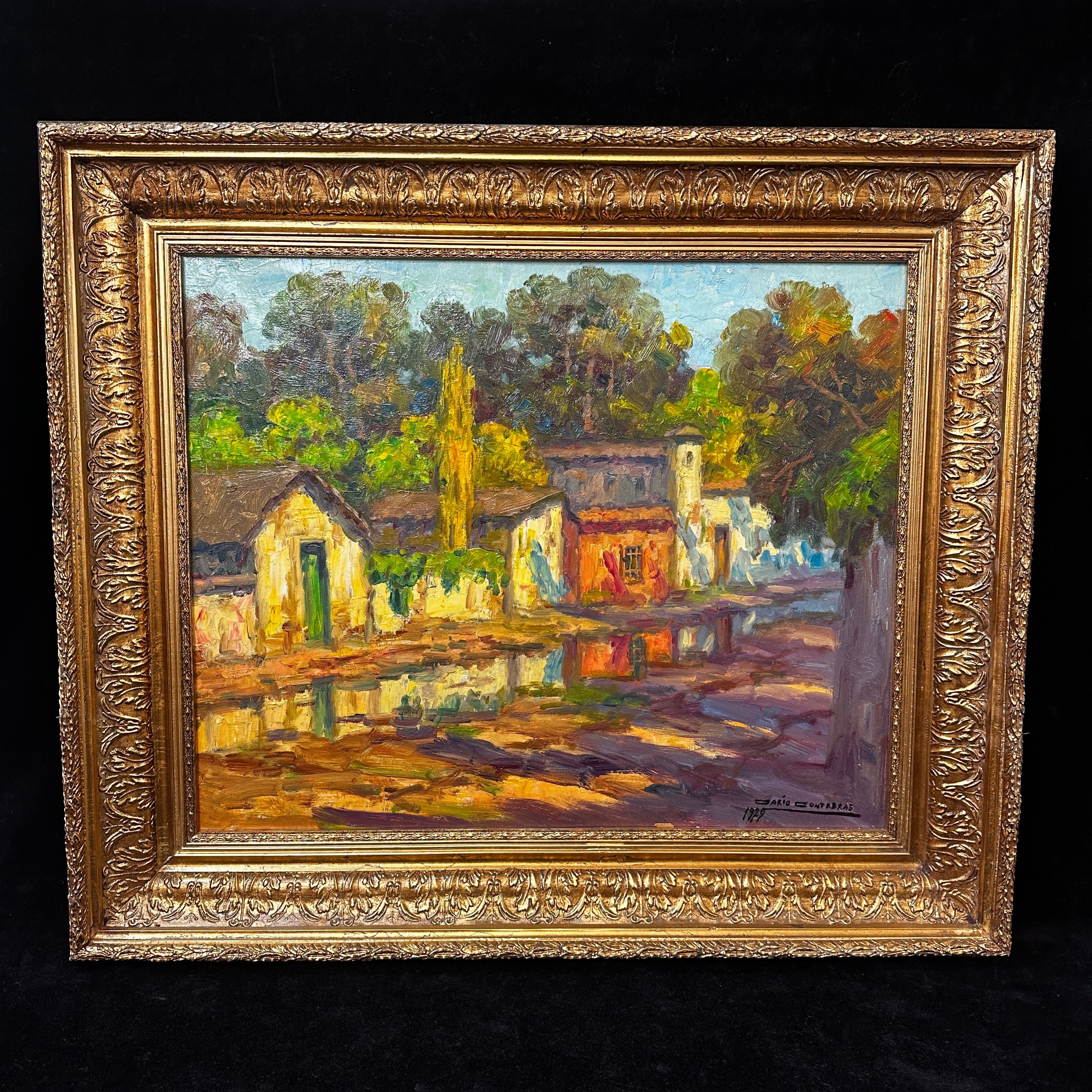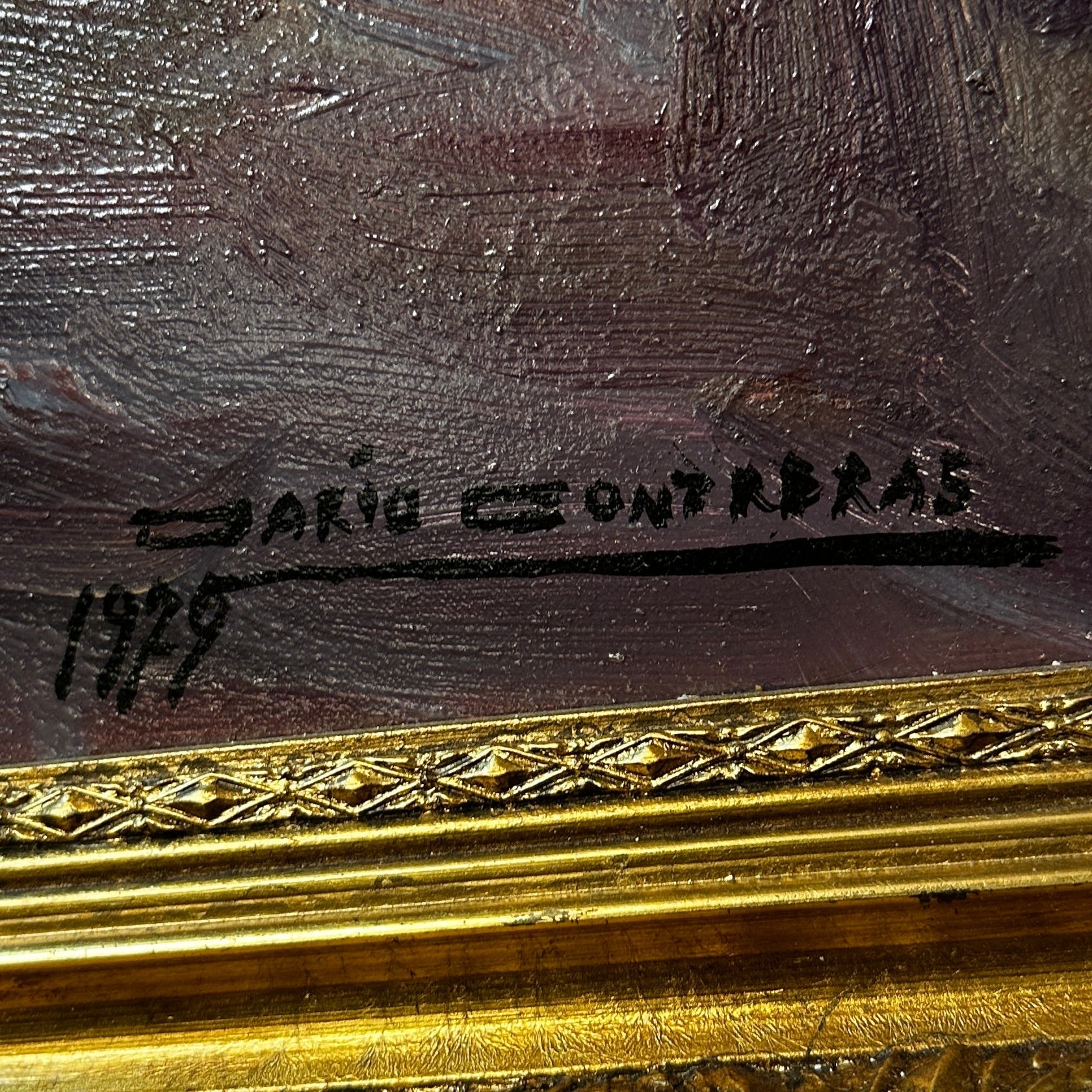 Belle huile sur toile L'œuvre de l'artiste chilien Darío Contreras, lauréat du Prix national d'art, représente une rue en terre battue aux façades continues après une pluie récente. Des flaques d'eau se forment au sol, reflétant les maisons, créant un effet visuel empreint d'atmosphère et de poésie. La composition se distingue par son utilisation de la lumière et une palette de couleurs chaudes et enveloppantes.