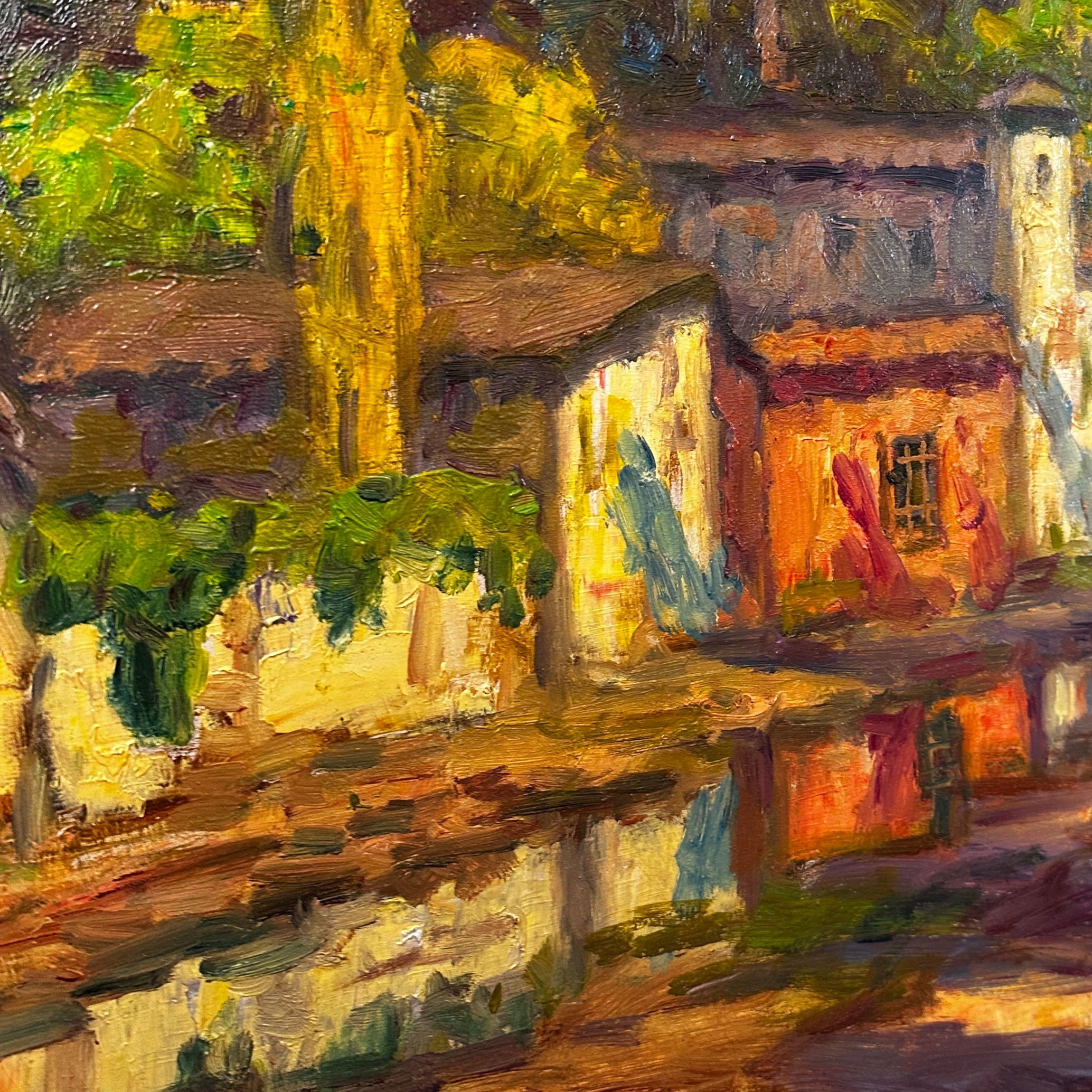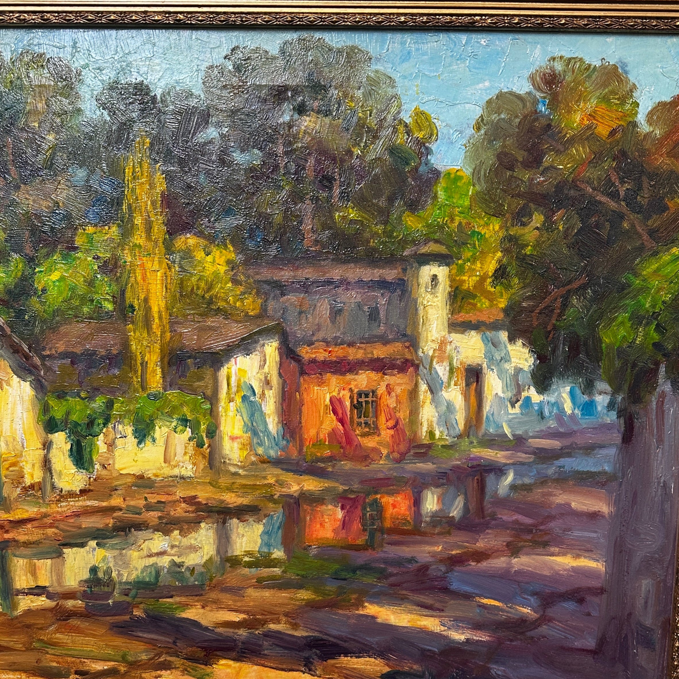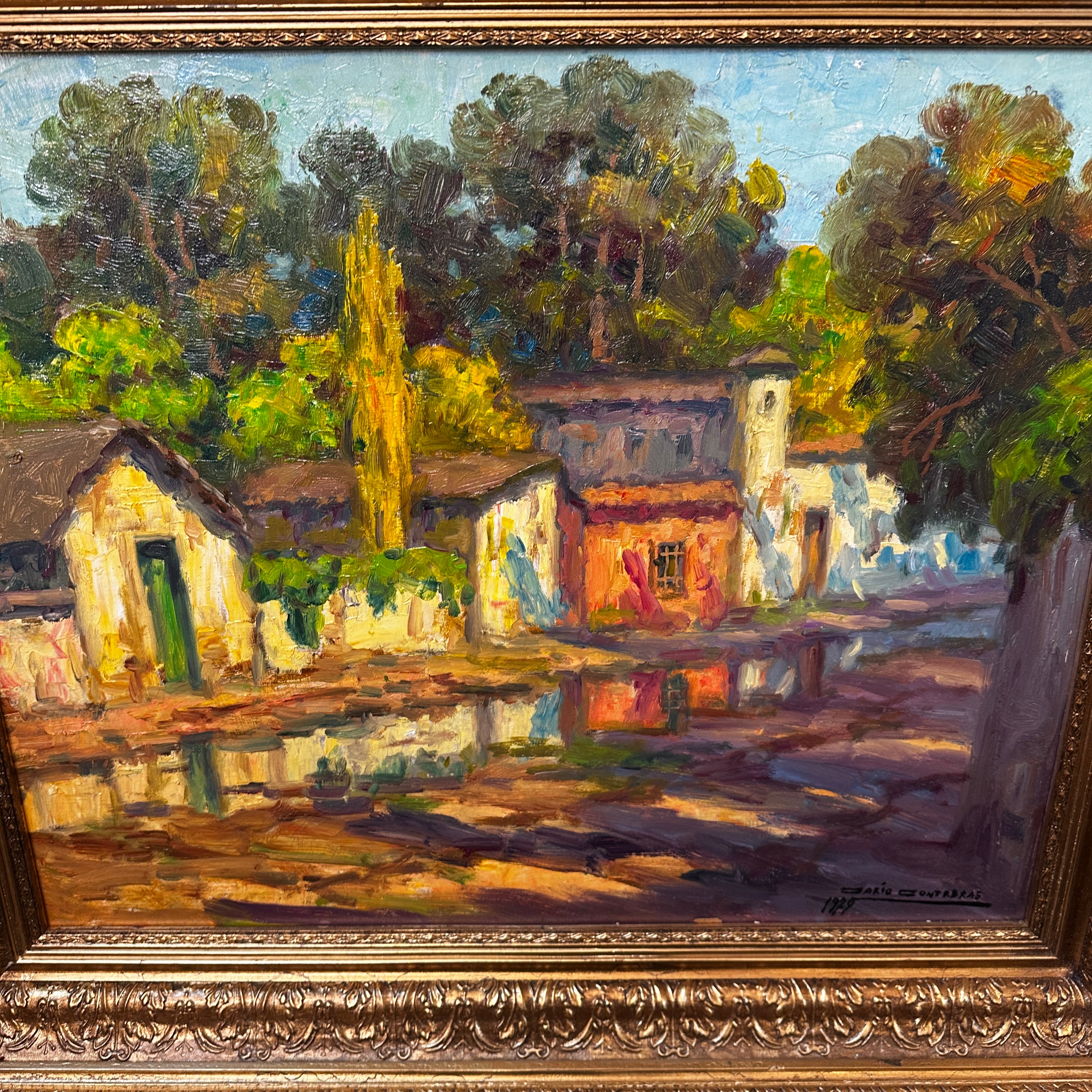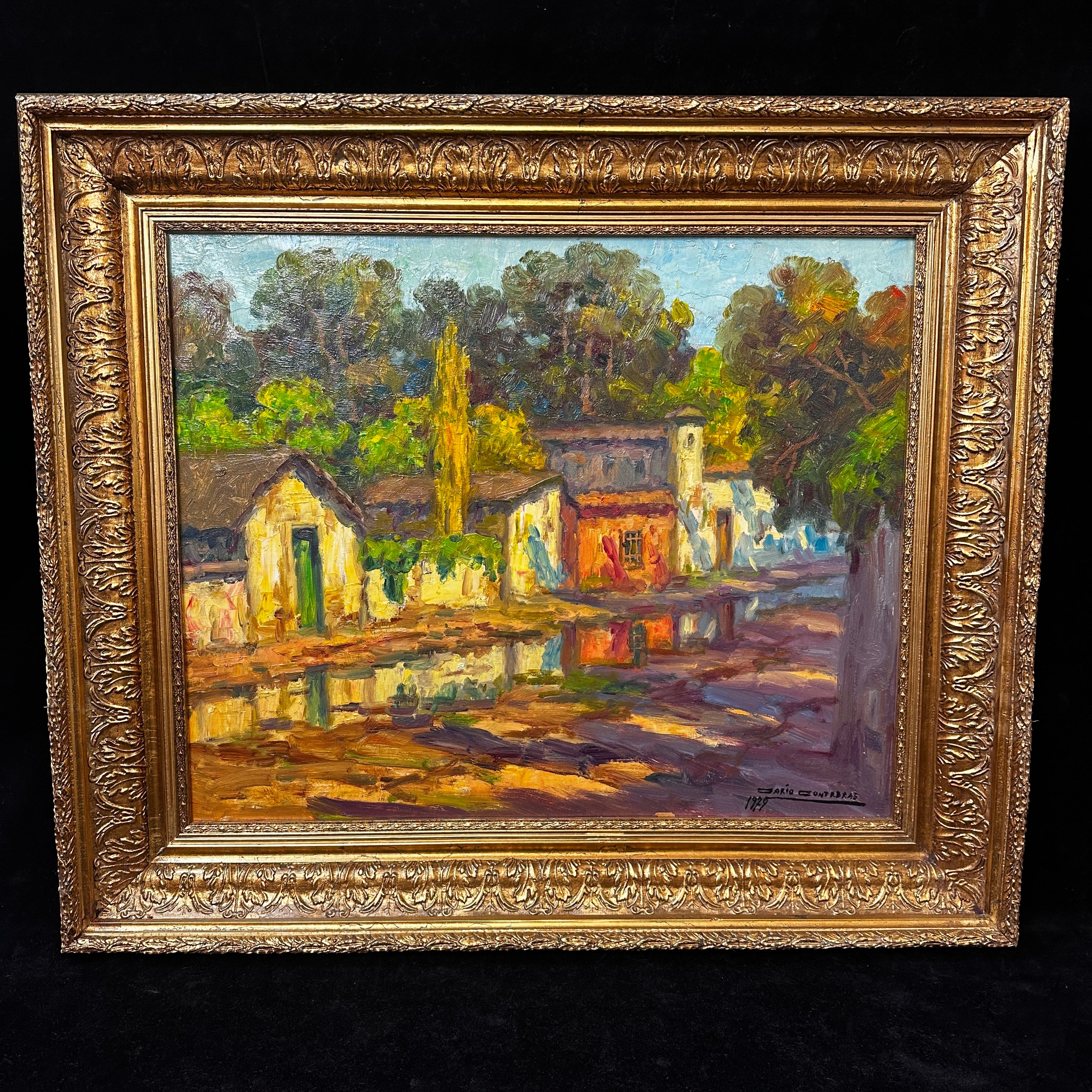 Belle huile sur toile L'œuvre de l'artiste chilien Darío Contreras, lauréat du Prix national d'art, représente une rue en terre battue aux façades continues après une pluie récente. Des flaques d'eau se forment au sol, reflétant les maisons, créant un effet visuel empreint d'atmosphère et de poésie. La composition se distingue par son utilisation de la lumière et une palette de couleurs chaudes et enveloppantes.