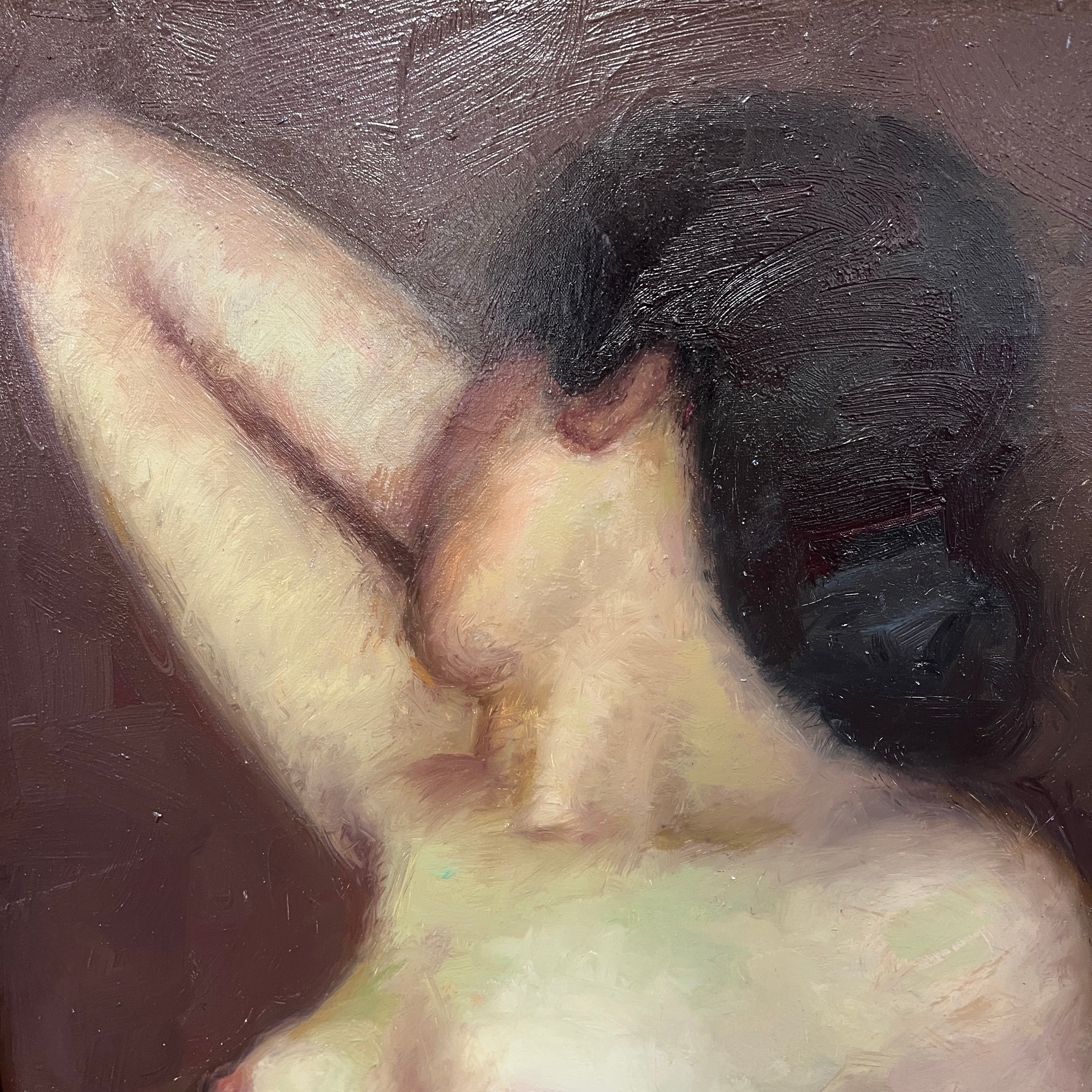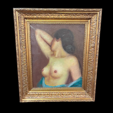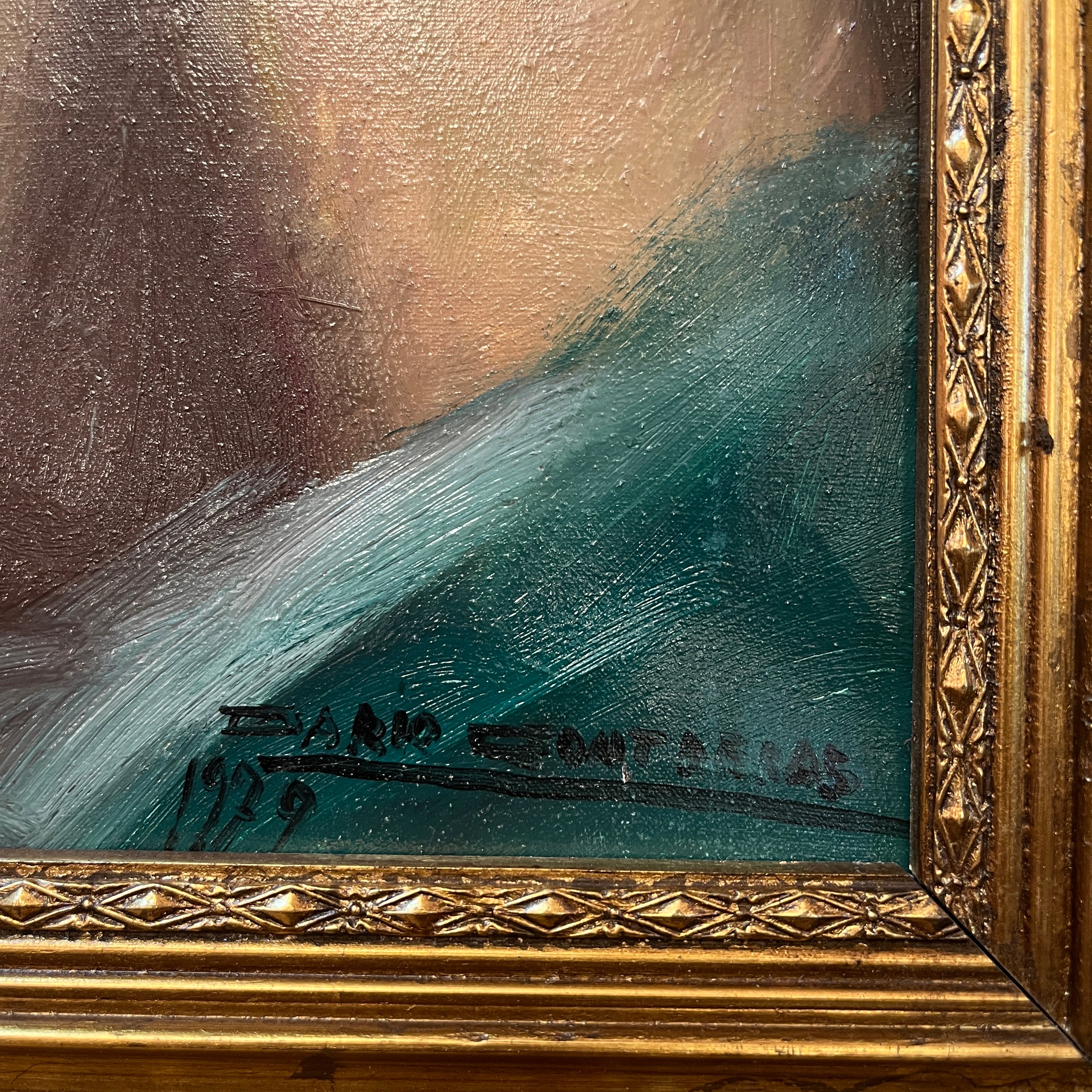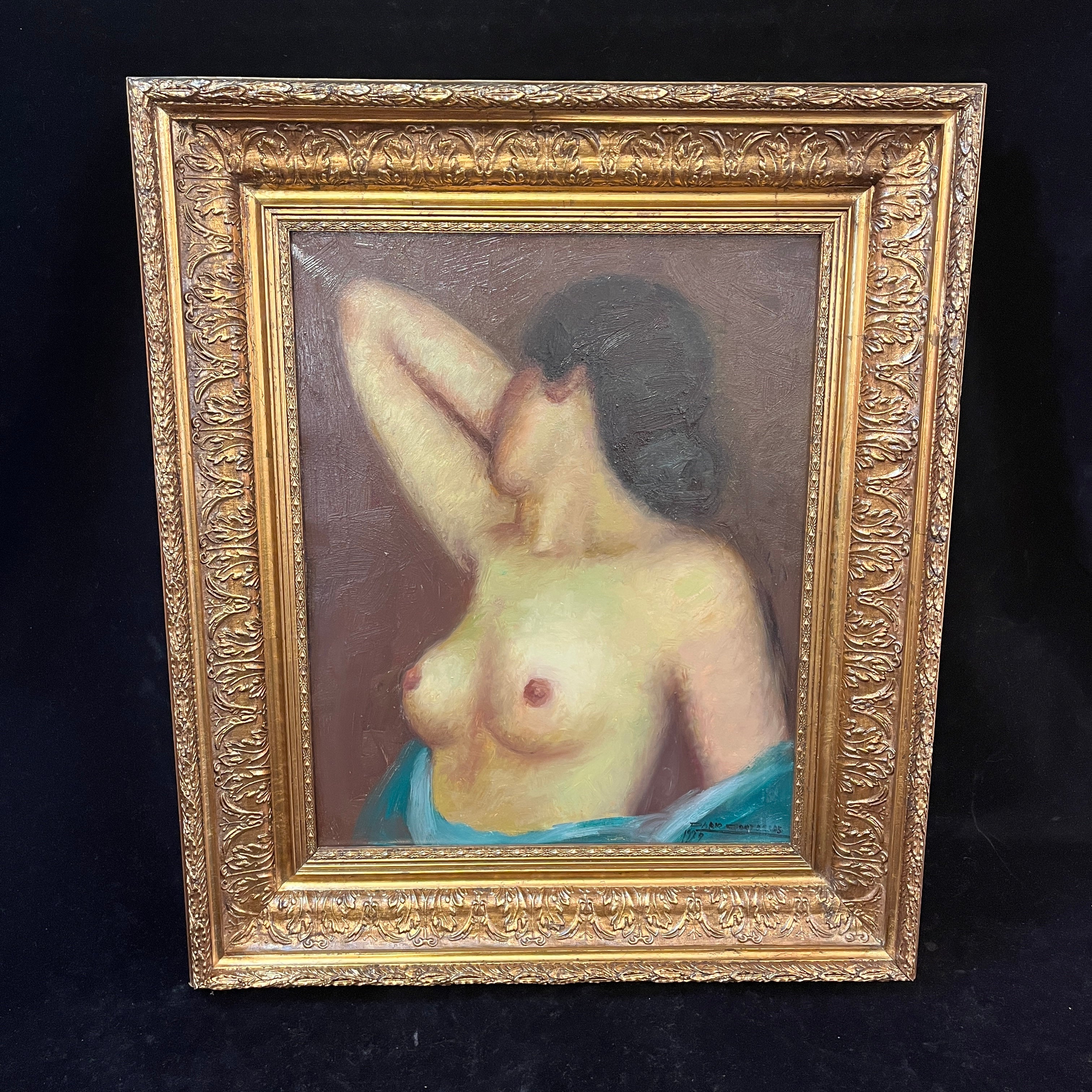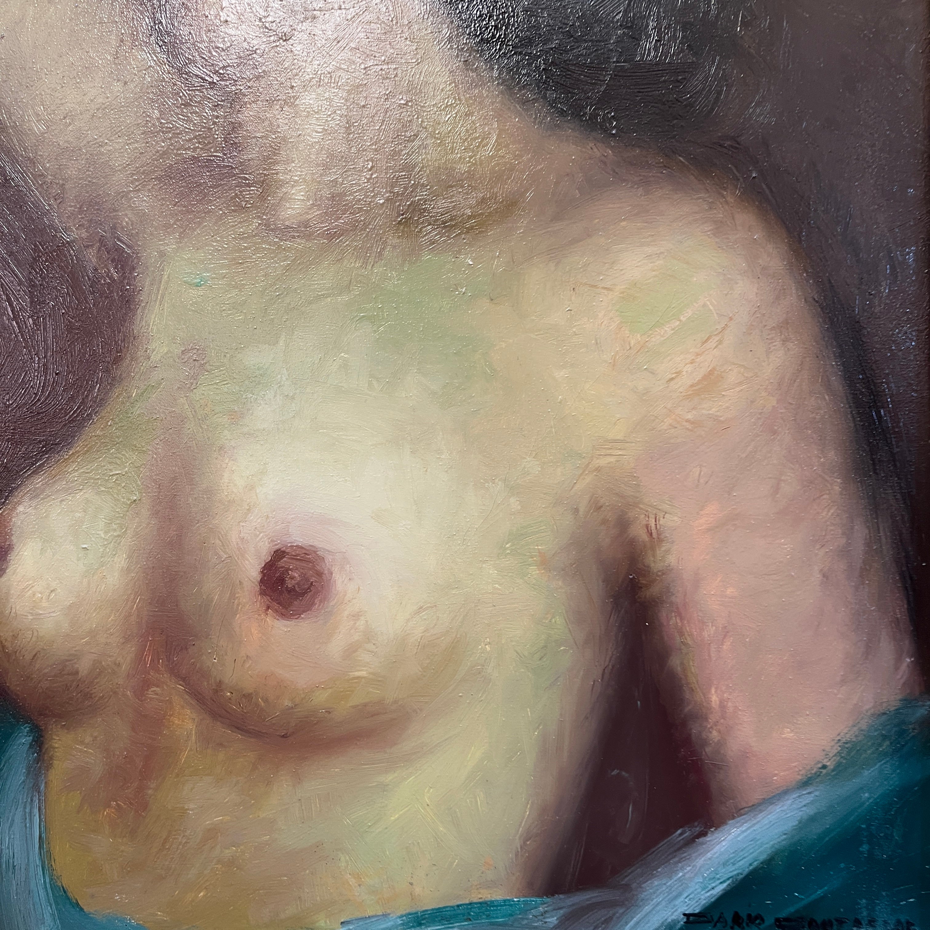 Une œuvre magnifique et énigmatique de l'artiste chilien Darío Contreras, représentant une femme aux seins nus. L'œuvre est encadrée d'une peinture dorée et est signée et datée par l'artiste.