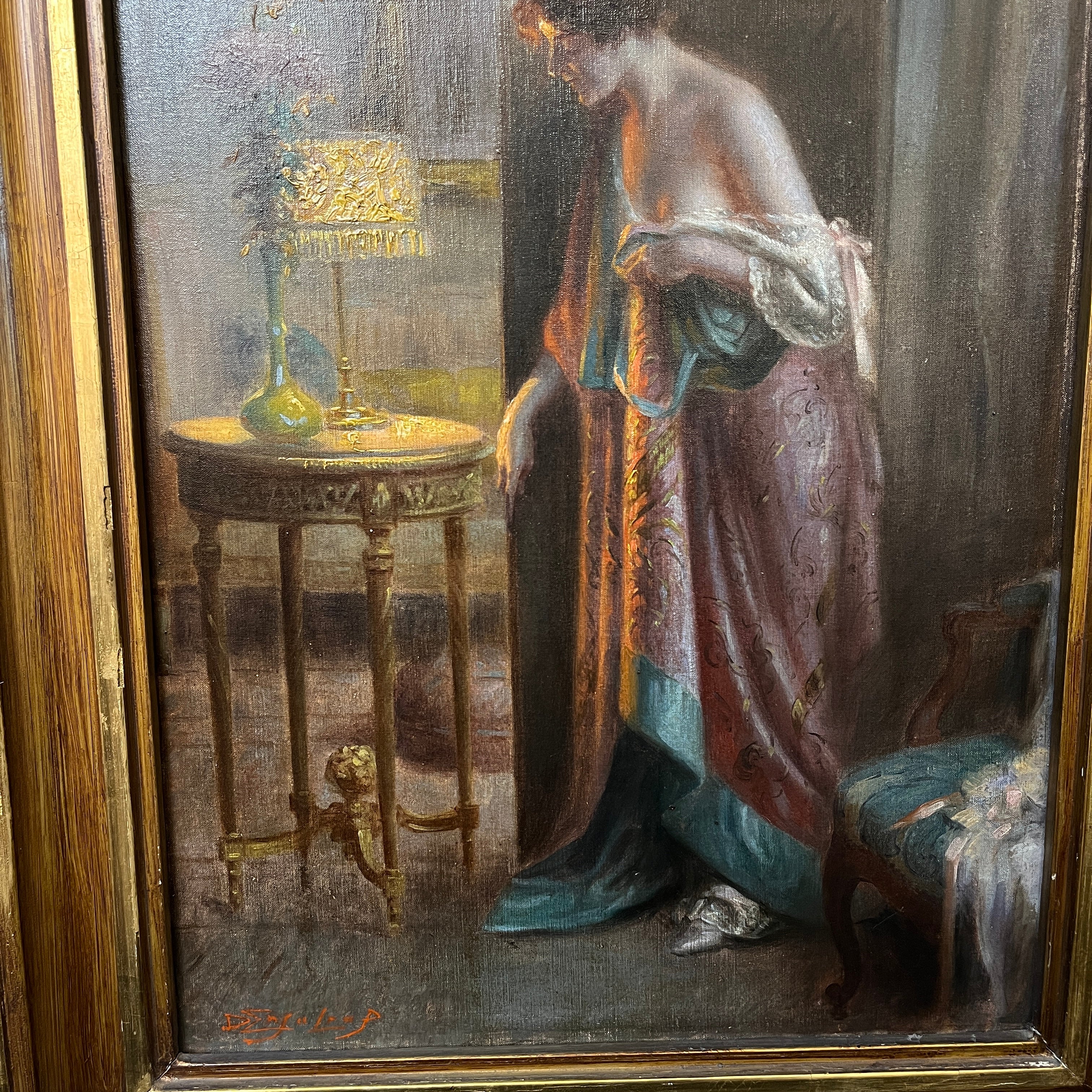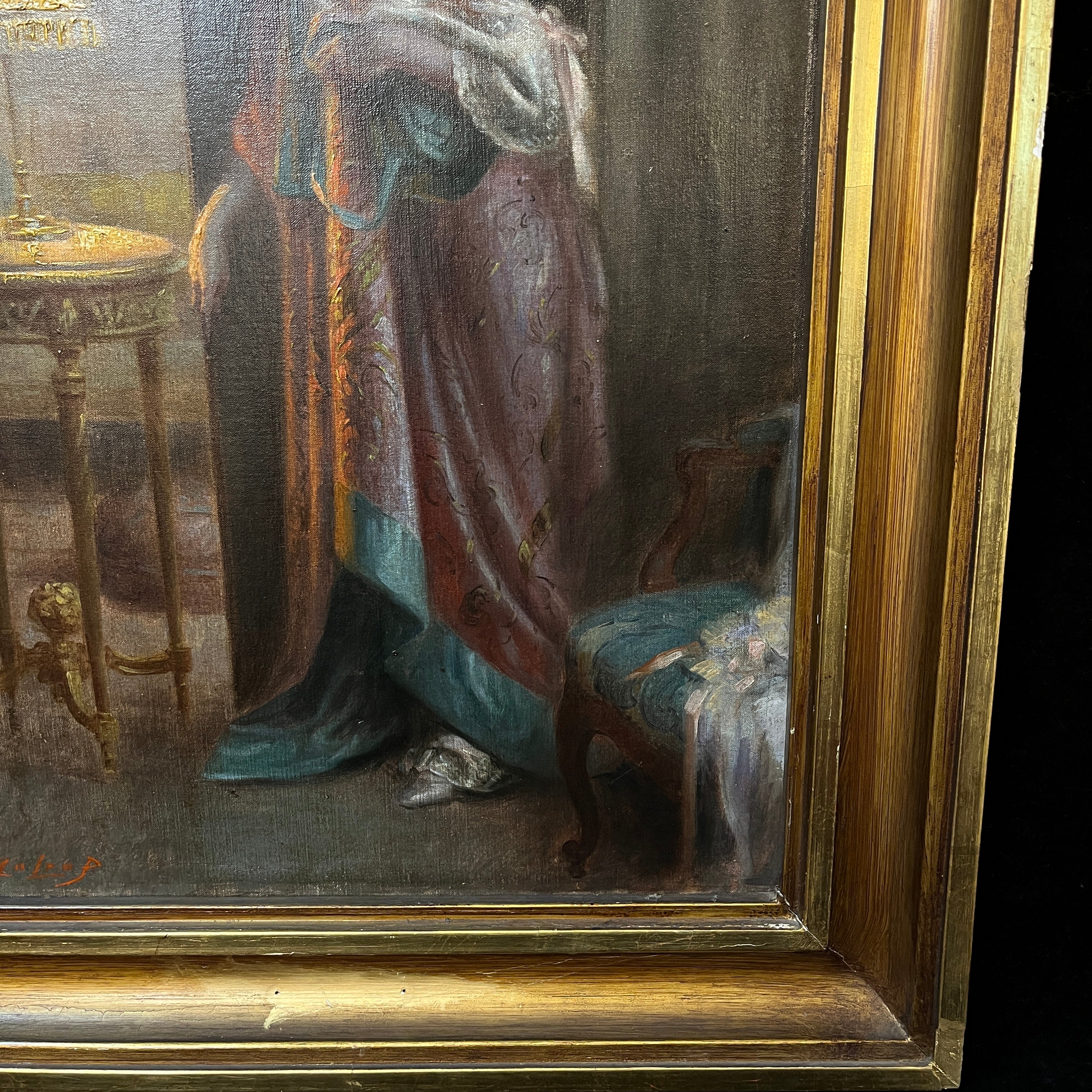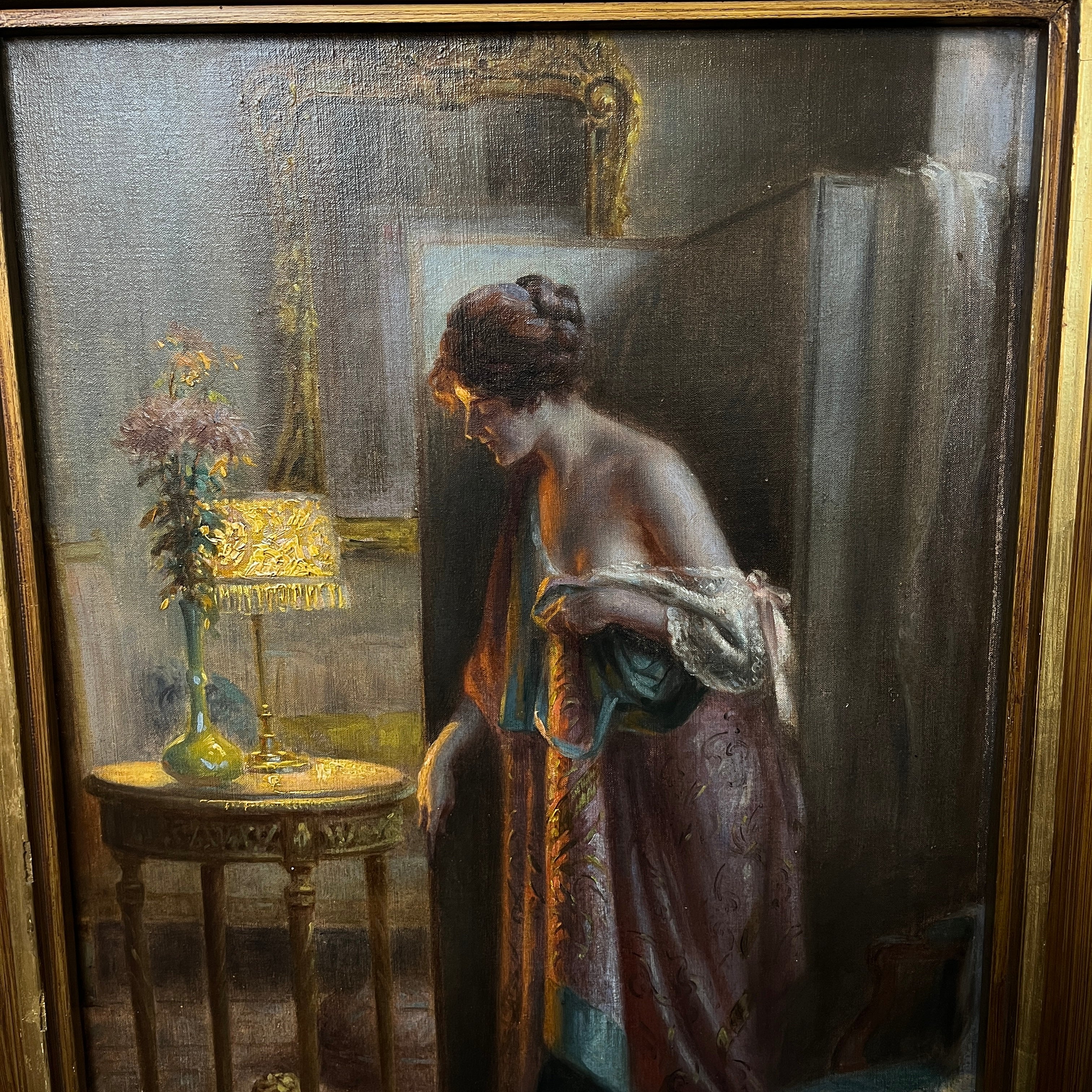 Magnifique huile sur toile du célèbre peintre français Delphin Enjolras, maître dans l'art de capturer la lumière et l'atmosphère des scènes d'intérieur. L'œuvre représente une femme se penchant délicatement au-dessus d'une table de chevet pour allumer ou éteindre une lampe, dans ce qui semble être un moment intime au sortir du lit. La lumière chaleureuse de la lampe baigne délicatement la scène, créant un subtil jeu d'ombres et de lumières qui transmet sérénité, chaleur et un profond sentiment d'intimité.