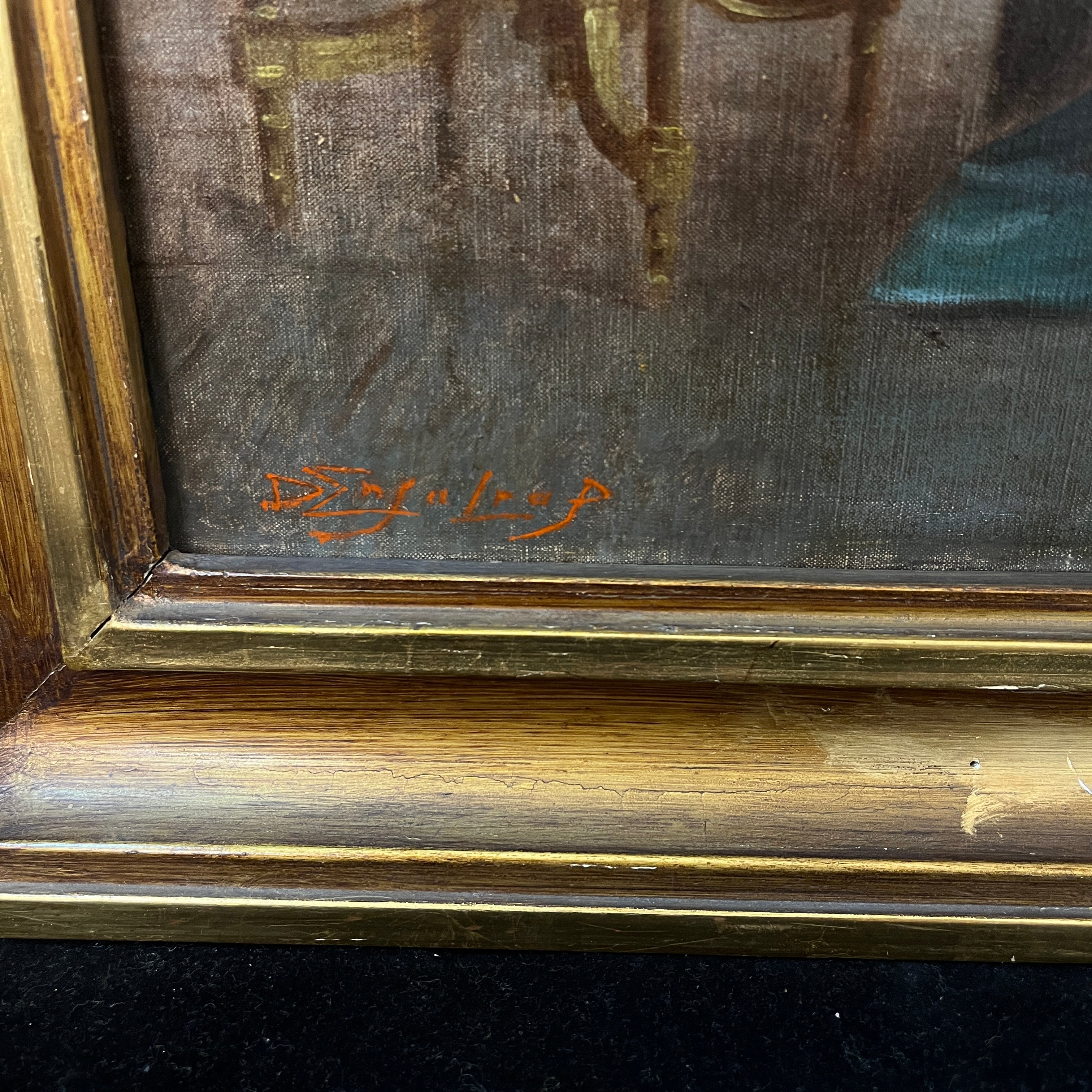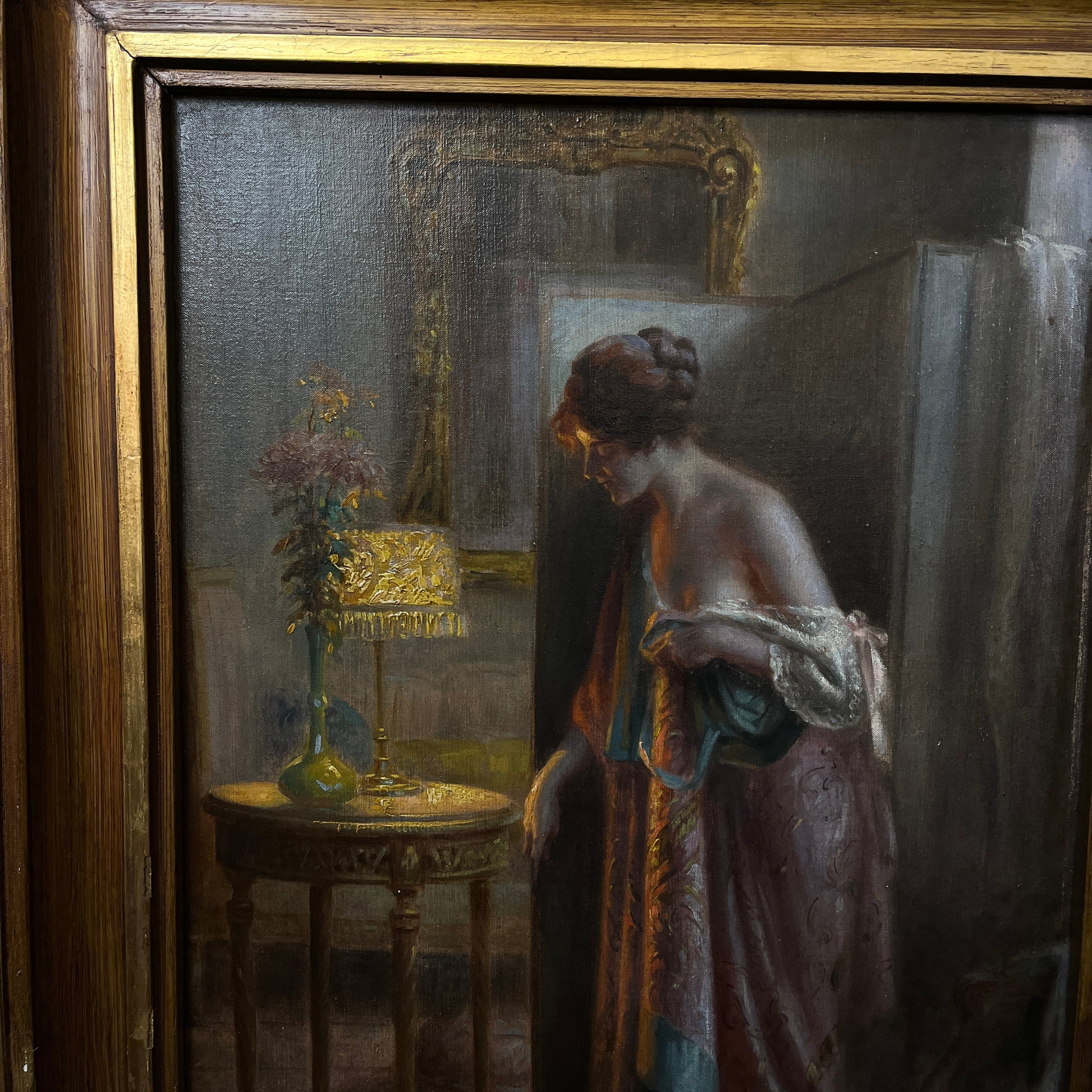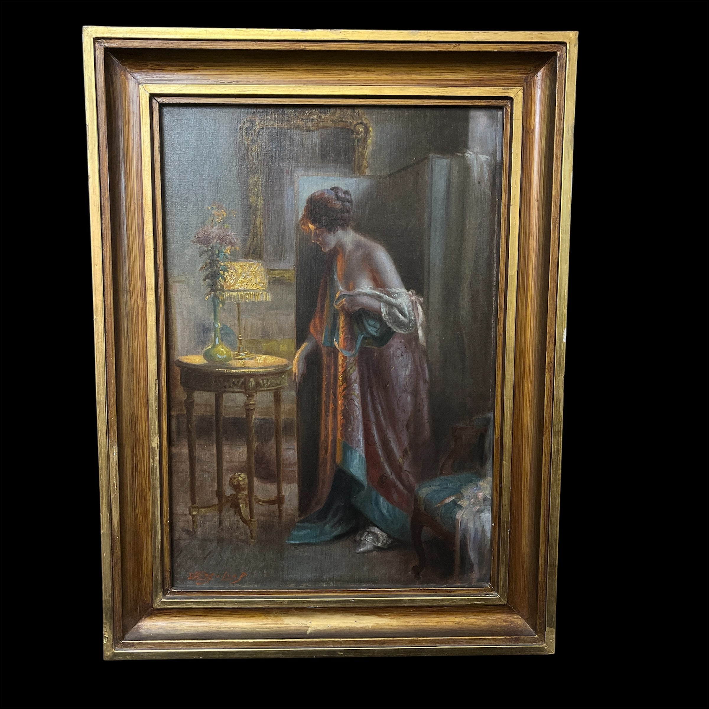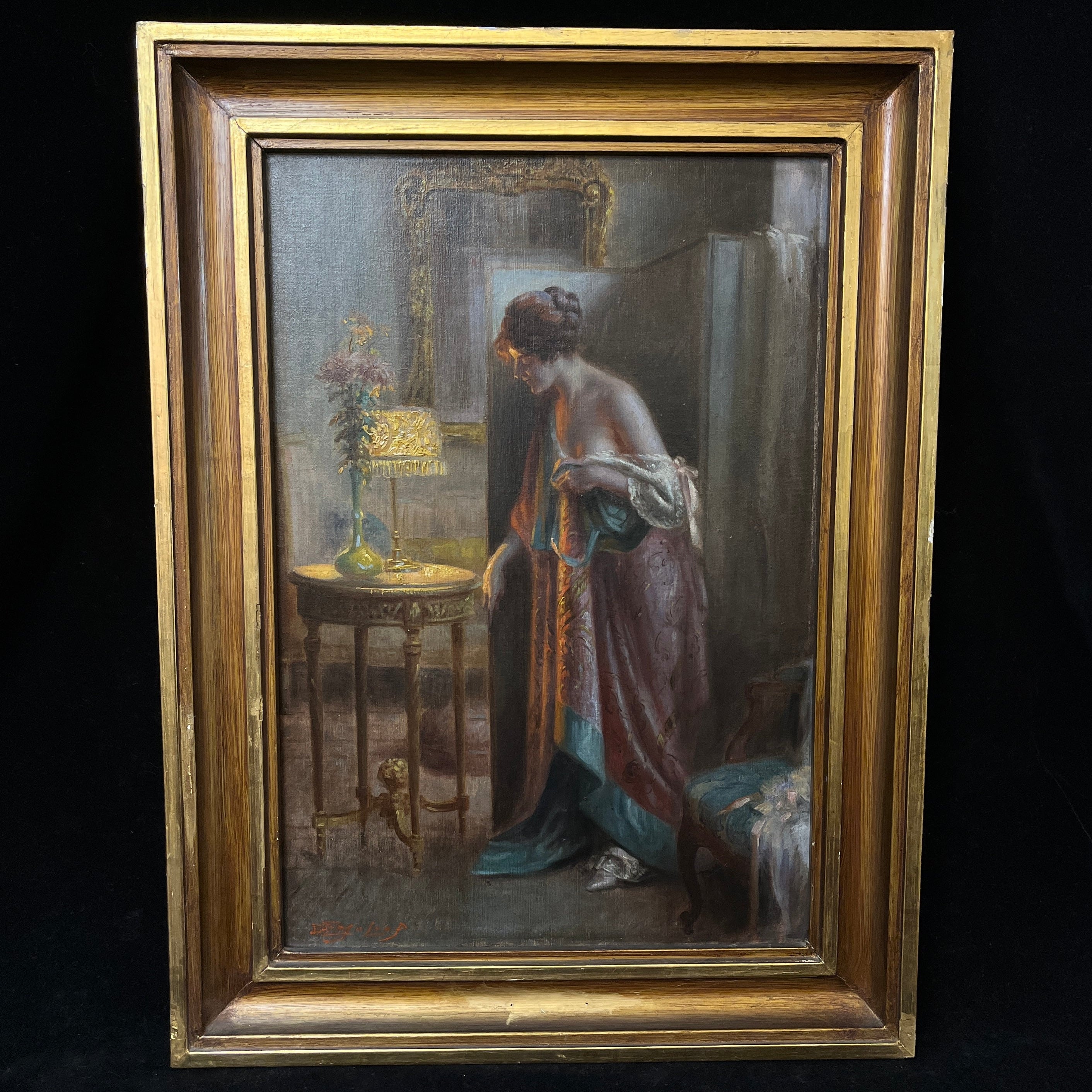 Magnifique huile sur toile du célèbre peintre français Delphin Enjolras, maître dans l'art de capturer la lumière et l'atmosphère des scènes d'intérieur. L'œuvre représente une femme se penchant délicatement au-dessus d'une table de chevet pour allumer ou éteindre une lampe, dans ce qui semble être un moment intime au sortir du lit. La lumière chaleureuse de la lampe baigne délicatement la scène, créant un subtil jeu d'ombres et de lumières qui transmet sérénité, chaleur et un profond sentiment d'intimité.