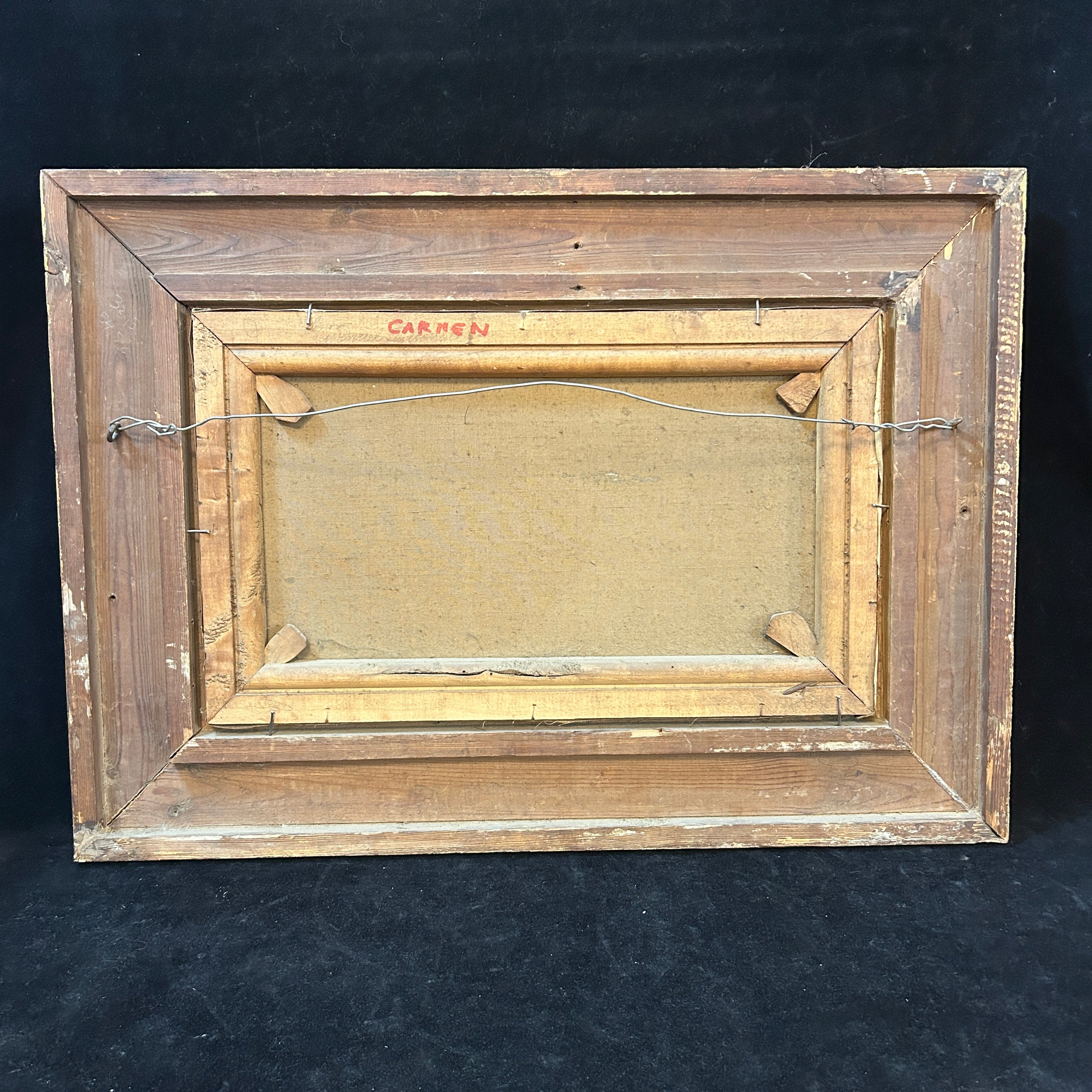 Dimensiones: Marco 55 cm altura x 77 ancho x 8 cm y Obra 31 altura x 52 ancho cm.
