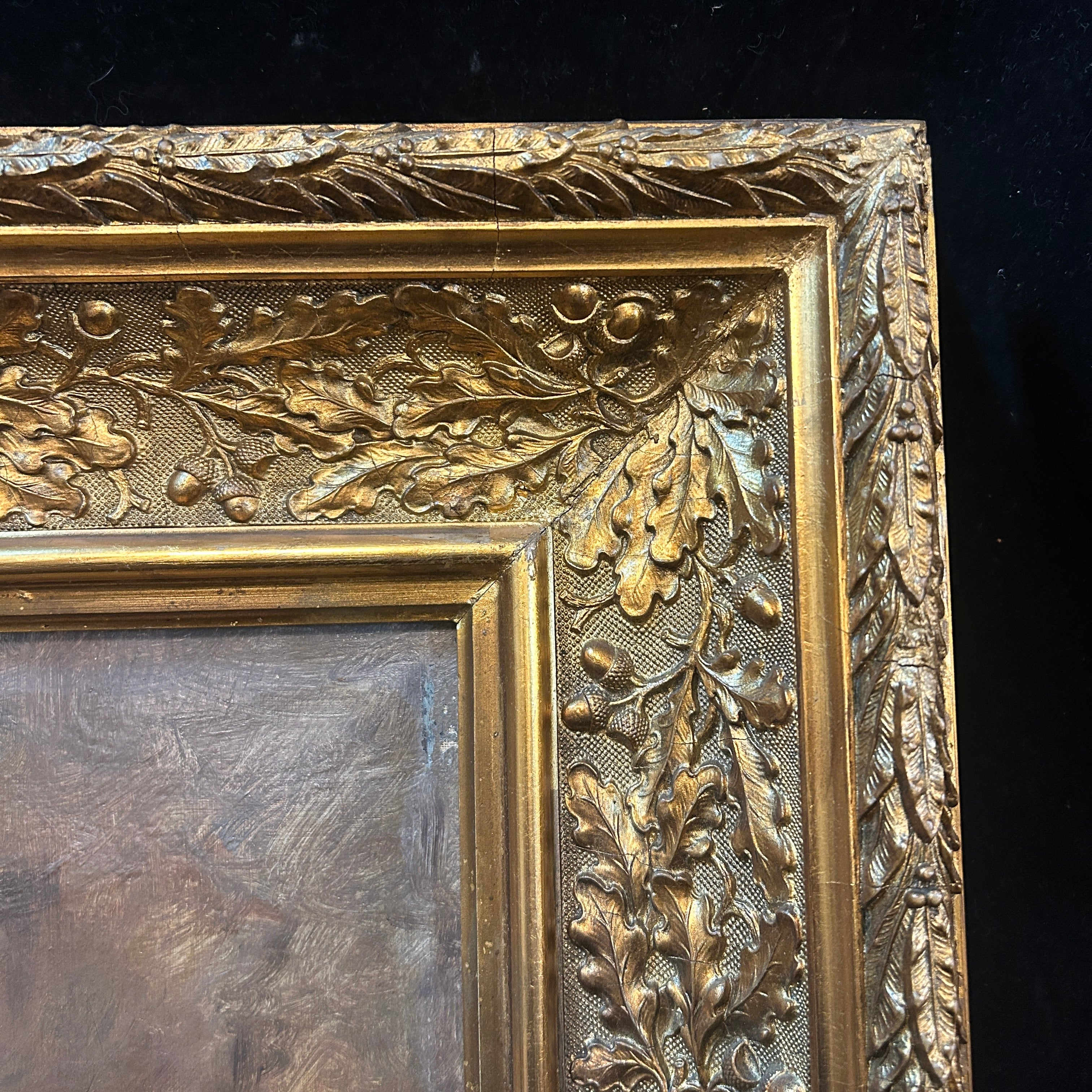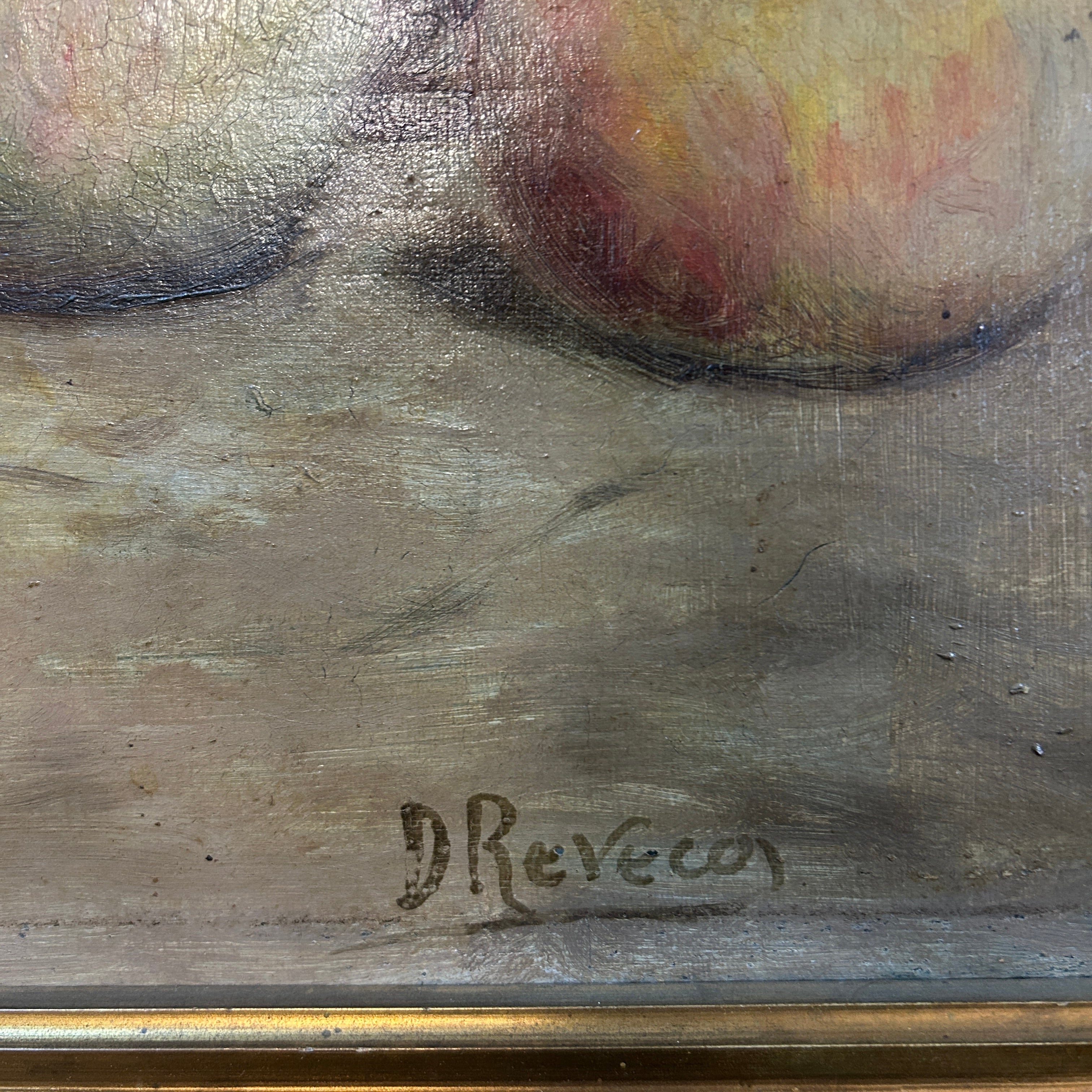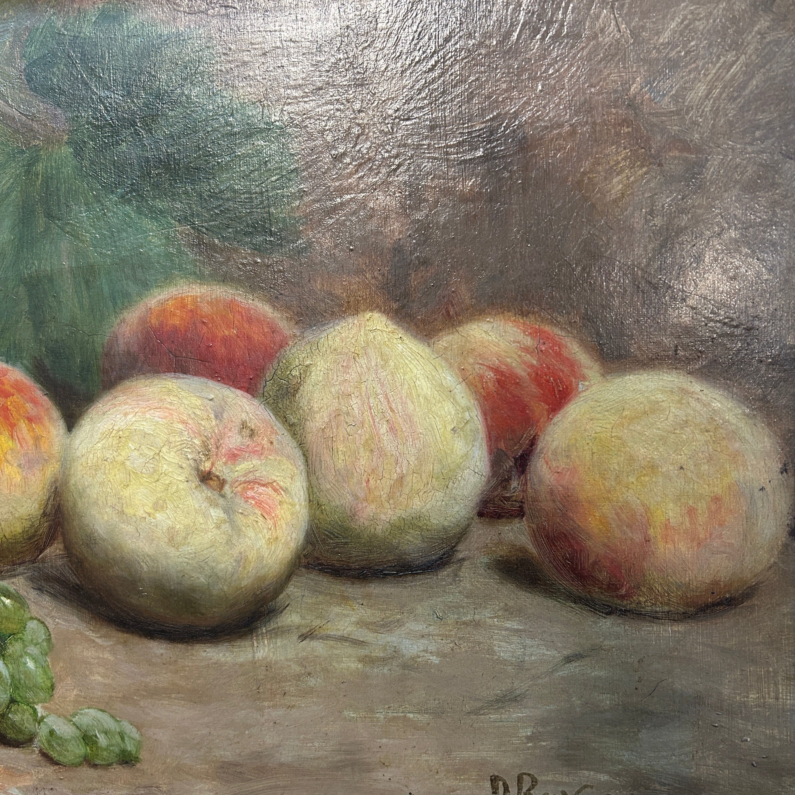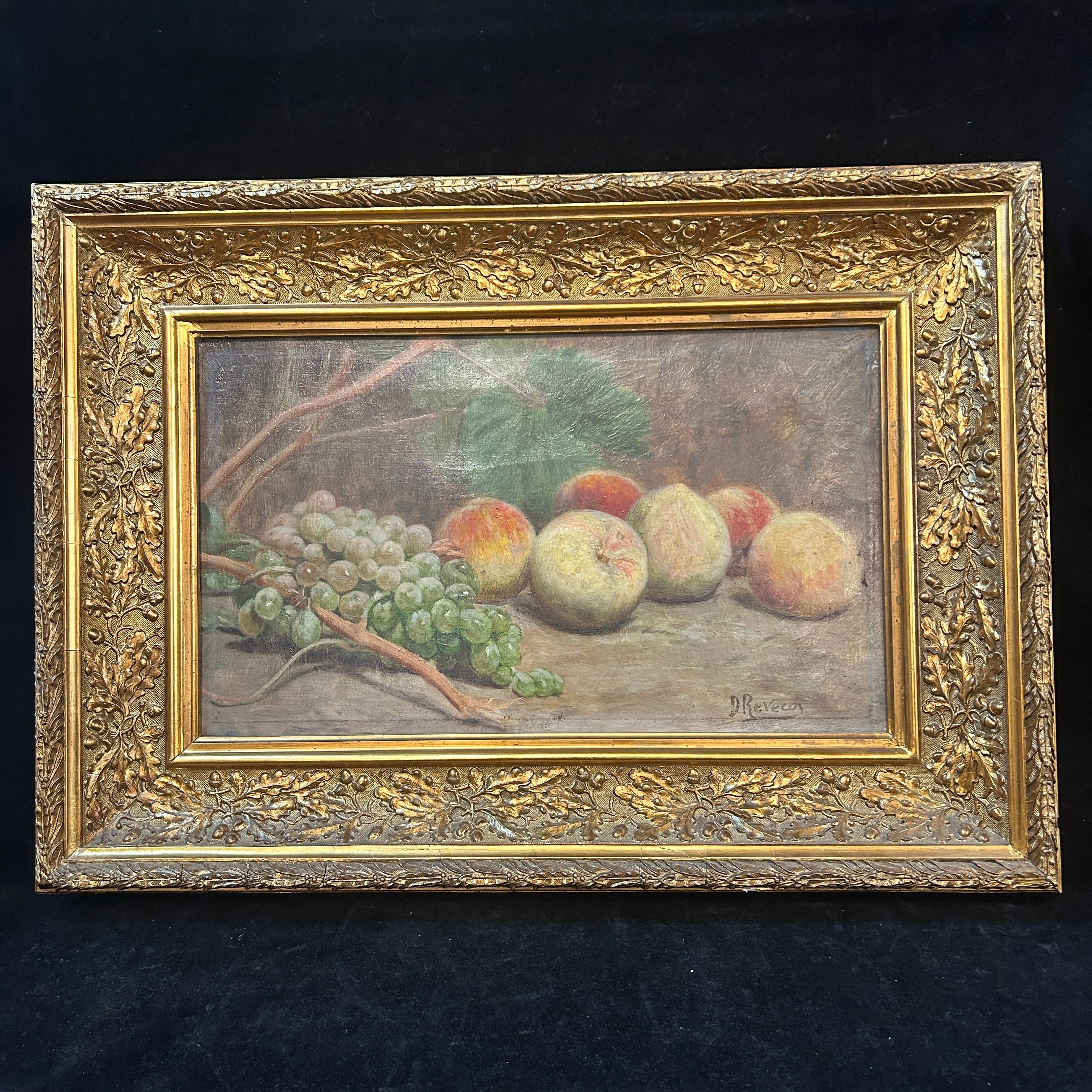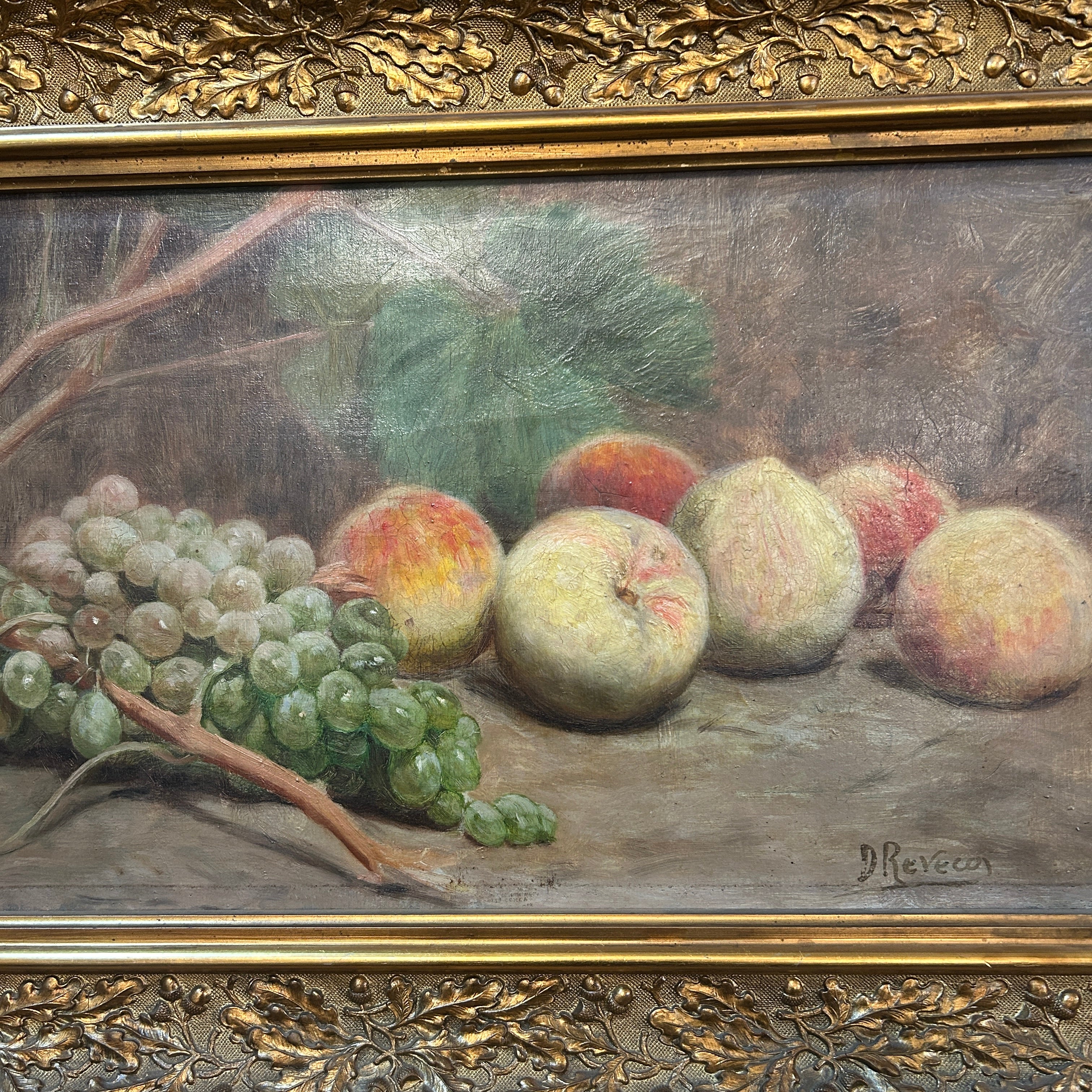 Óleo sobre tela del artista chileno Demetrio Reveco (1862-1920), representando un bodegón de duraznos y uvas verdes sobre una mesa. La obra está enmarcada en madera tallada en decorados relieves y pintada de elegante dorado.