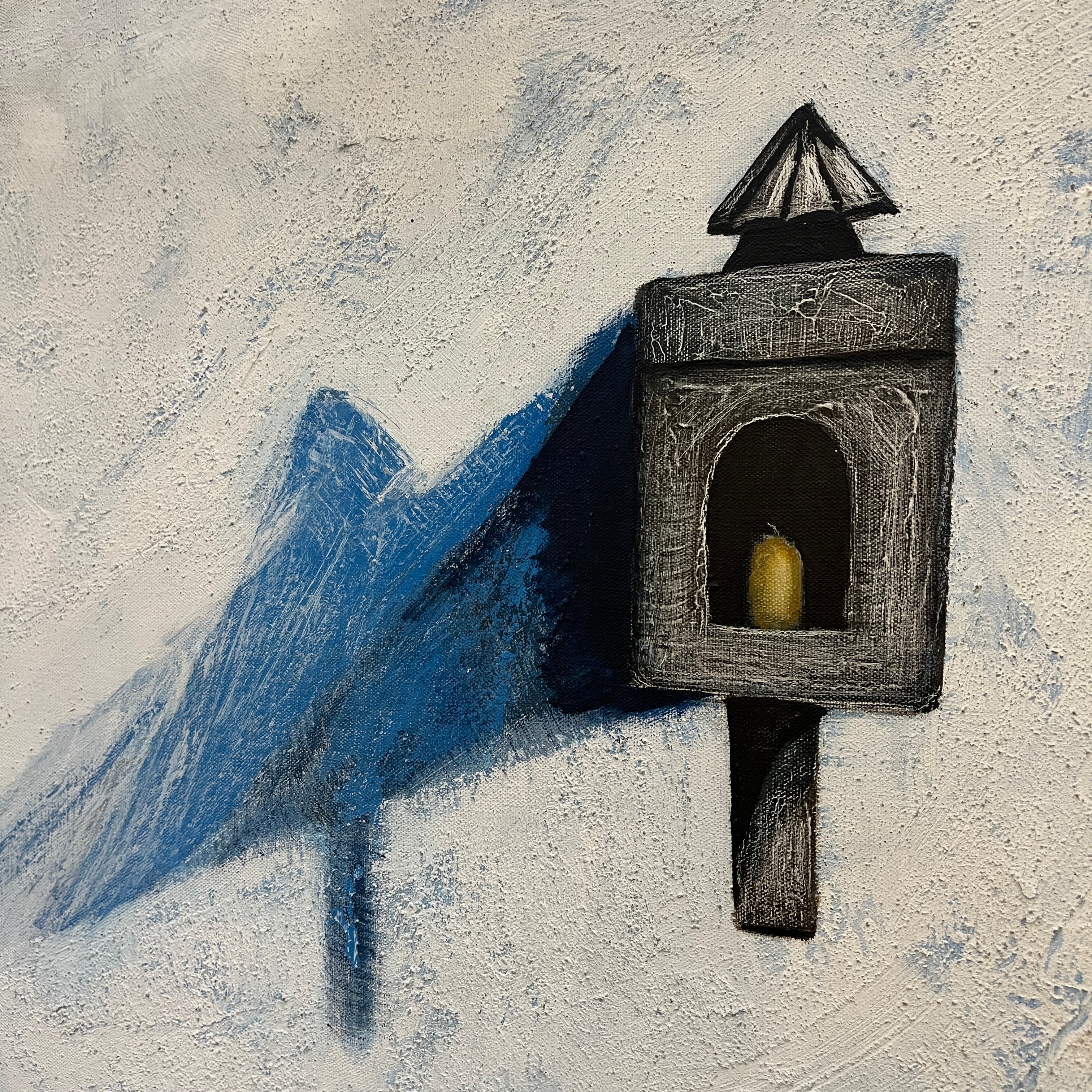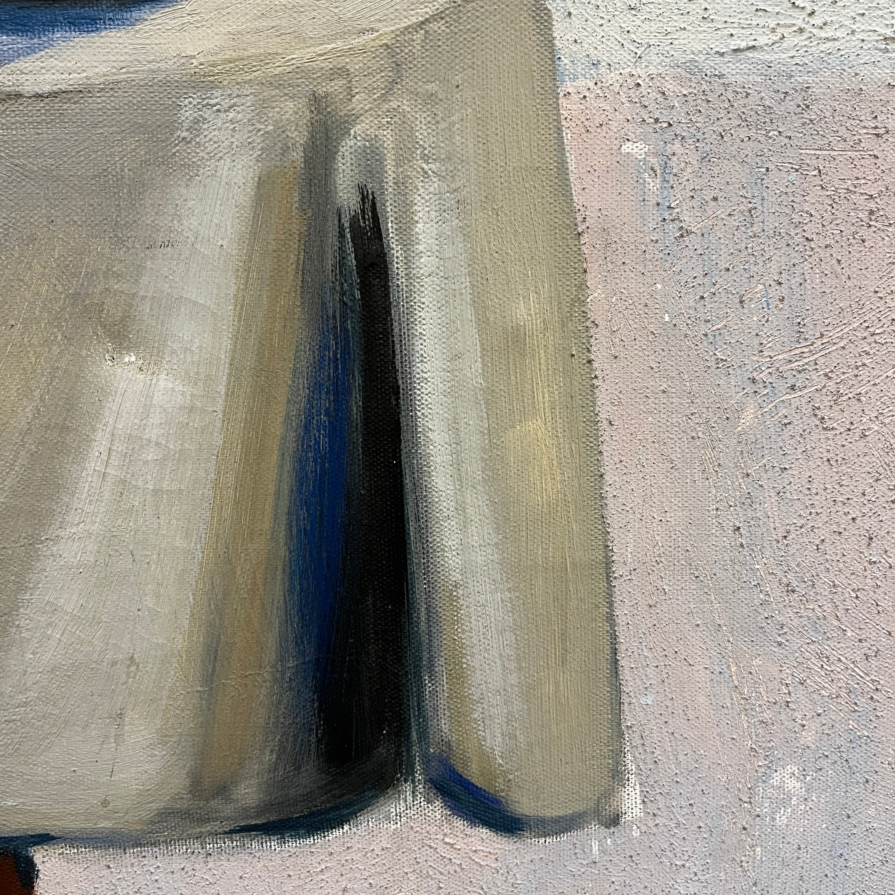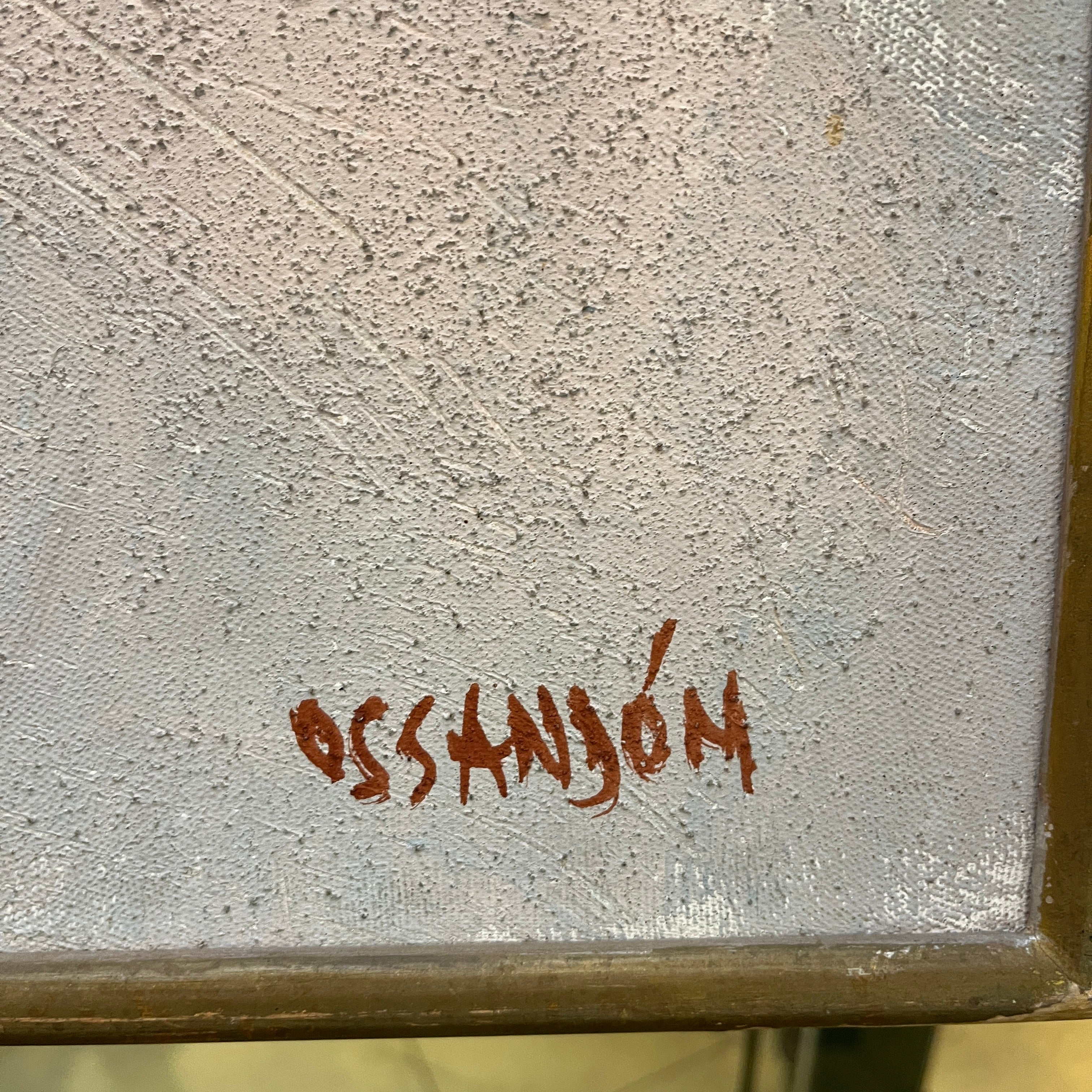 Óleo sobre tela del artista chileno Eduardo Ossandón (1929-2013), representando un bodegón. La obra está compuesta de una copa y dos limones, sobre una mesa redonda con un mantel blanco, con un fondo blanco y rosa pálido, en el que está colgado un portavelas negro, que proyecta su sombra sobre esta pared. Se trata de una obra con pocos elementos y de colores sobrios, elementos reconocibles en la obra de Ossandón. Esta pintura tiene un marco de madera delgada, que hace resaltar el contenido.