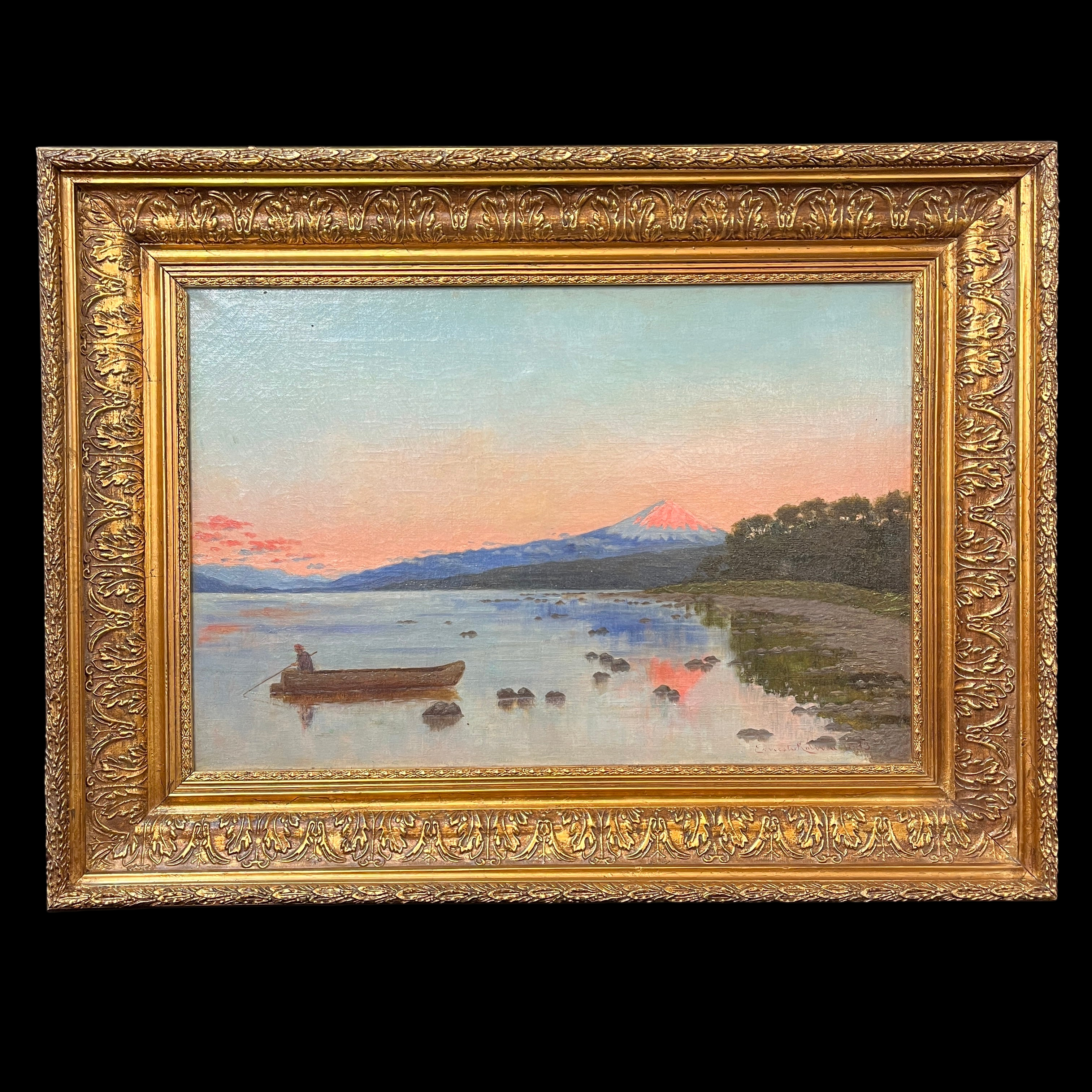 Bello óleo sobre tela del artista chileno Ernesto Molina que representa a un balsero cerca de la orilla de un lago observando a un volcán a lo lejos, presumiblemente el volcán Osorno. La obra cuenta con un marco de madera y yeso pintado de dorado.