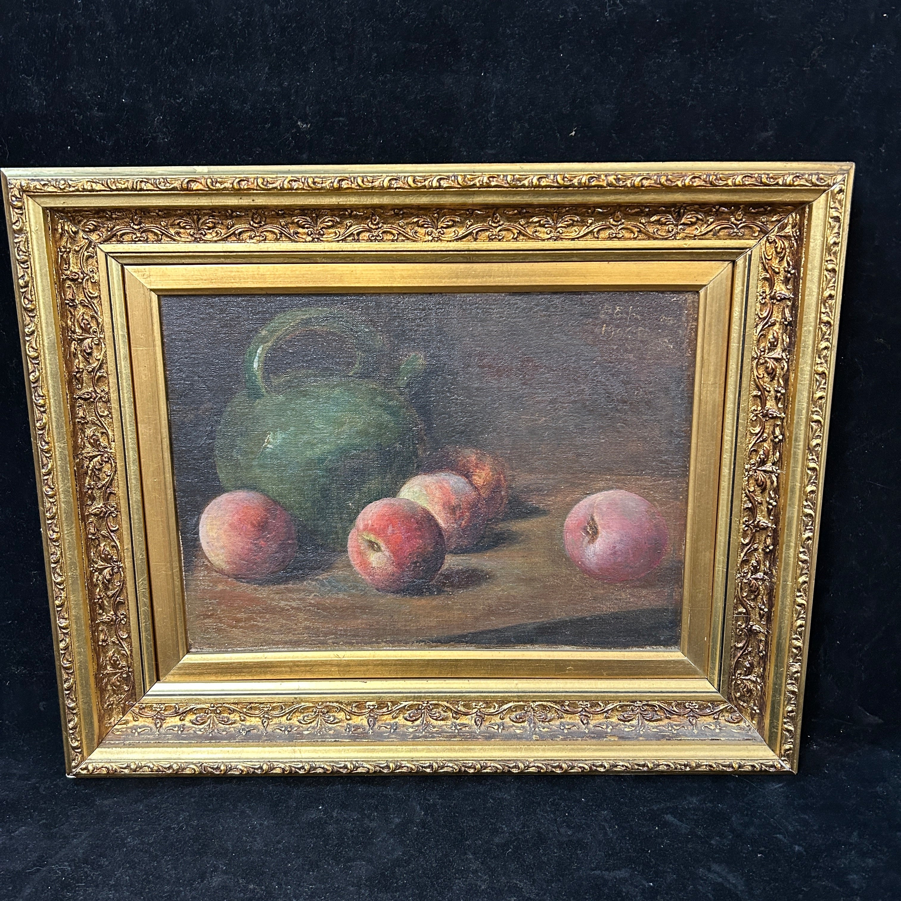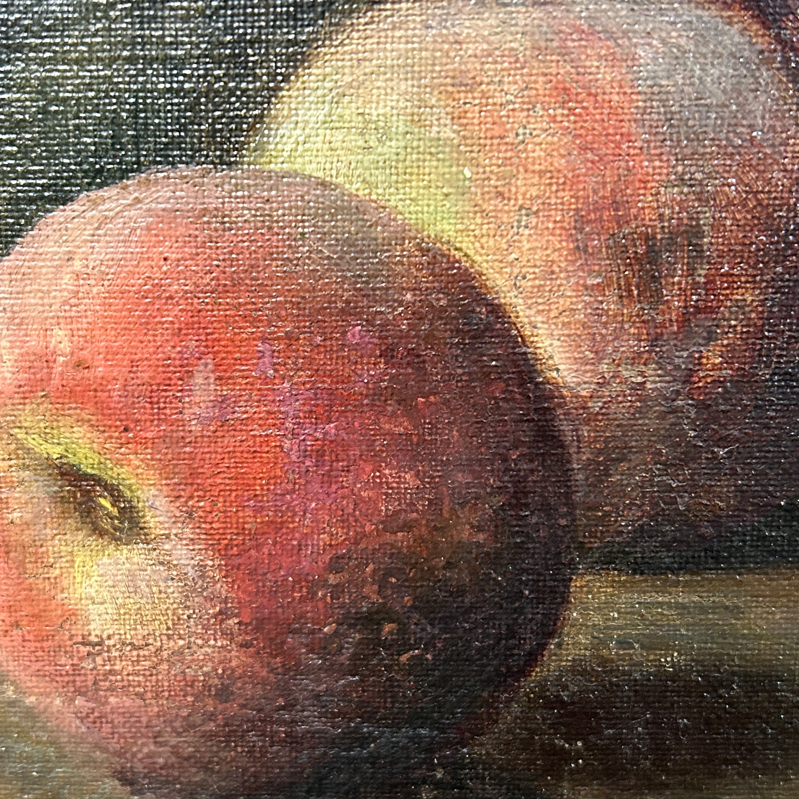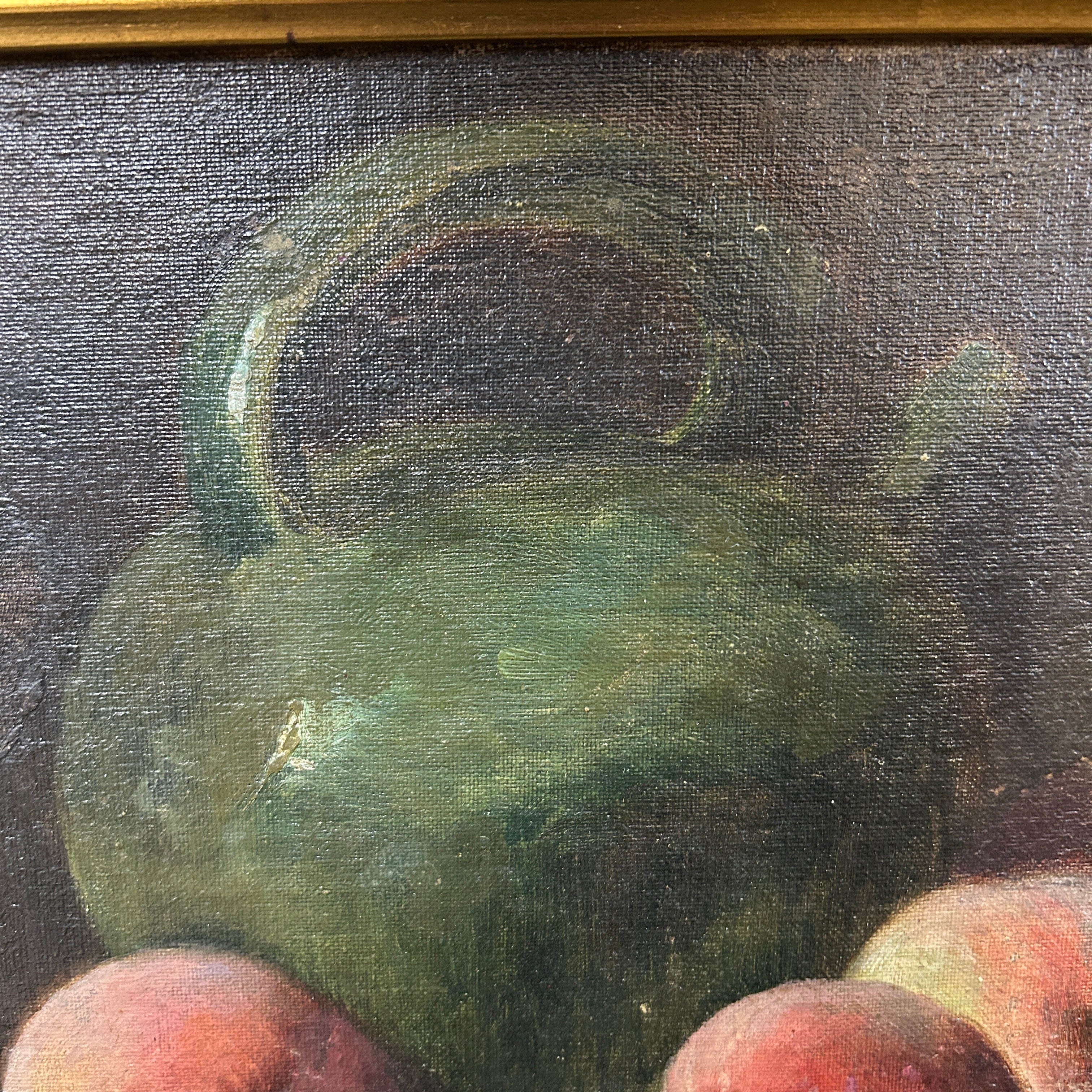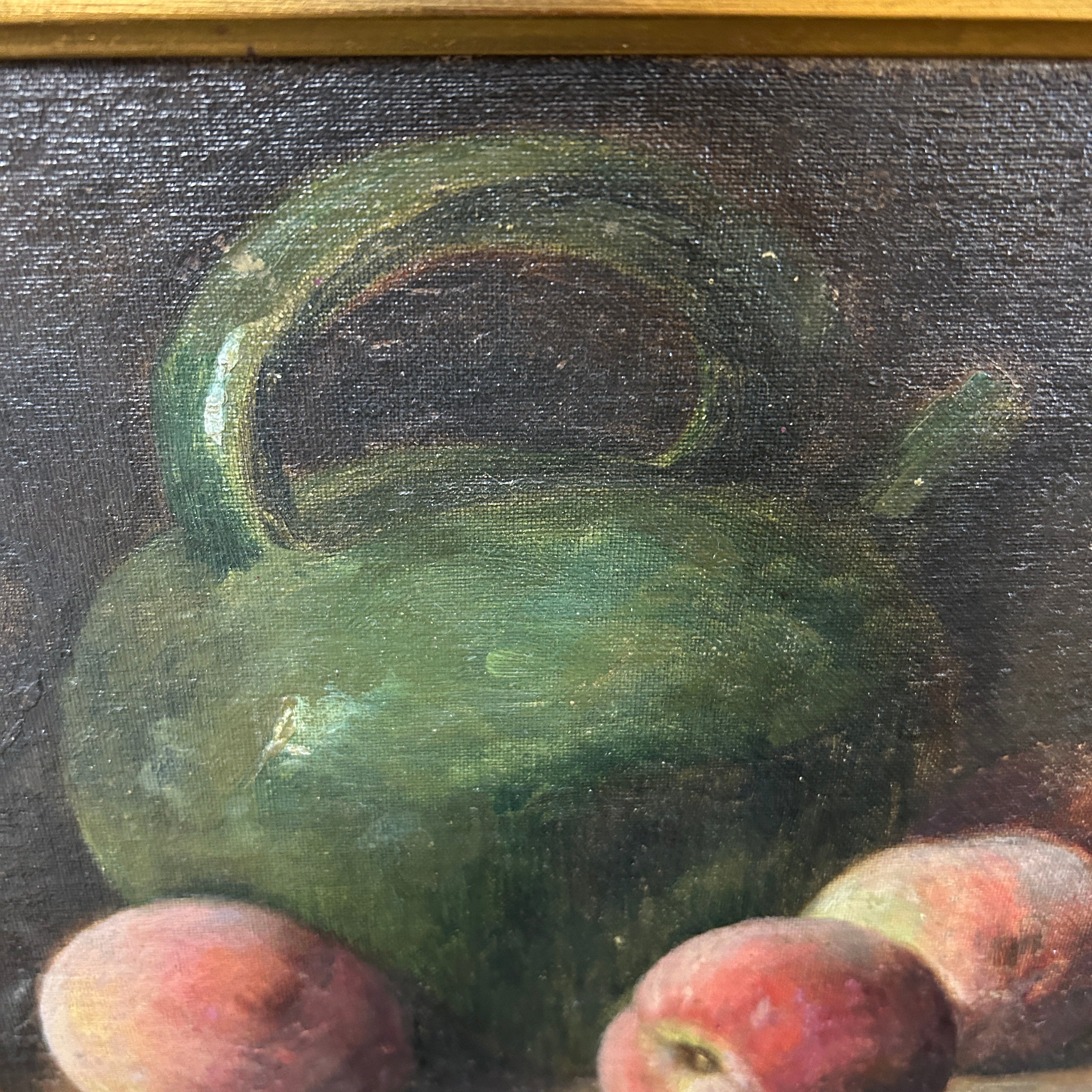 Óleo sobre tela del pintor chileno Eucarpio Espinosa (1863), representando un bodegón de duraznos y una tetera verde sobre una mesa. La obra tiene un interesante trabajo de luz, con un efecto tenue de penumbra que atrae la vista en los detalles y sutilezas de los objetos elegidos por el artista. La obra tiene un marco de madera tallada en relieves y terminada en un dorado, complementando a la obra y dándole luz.