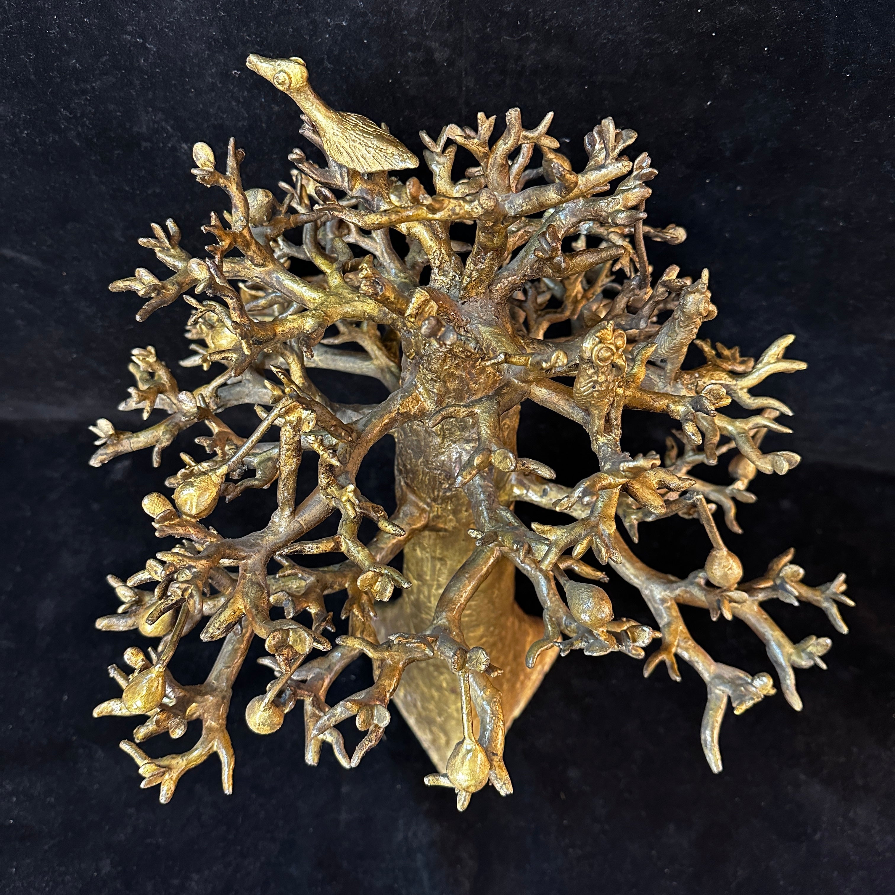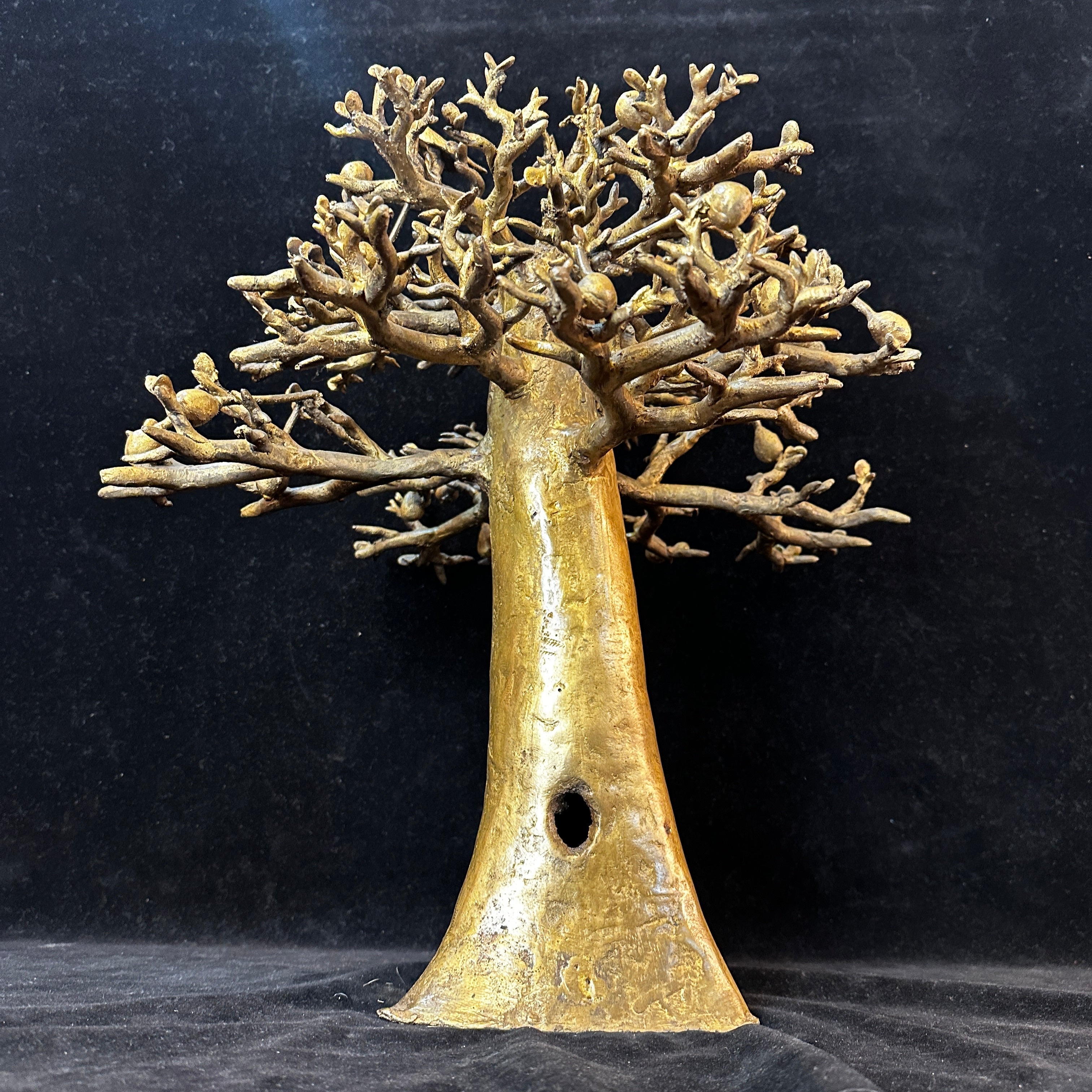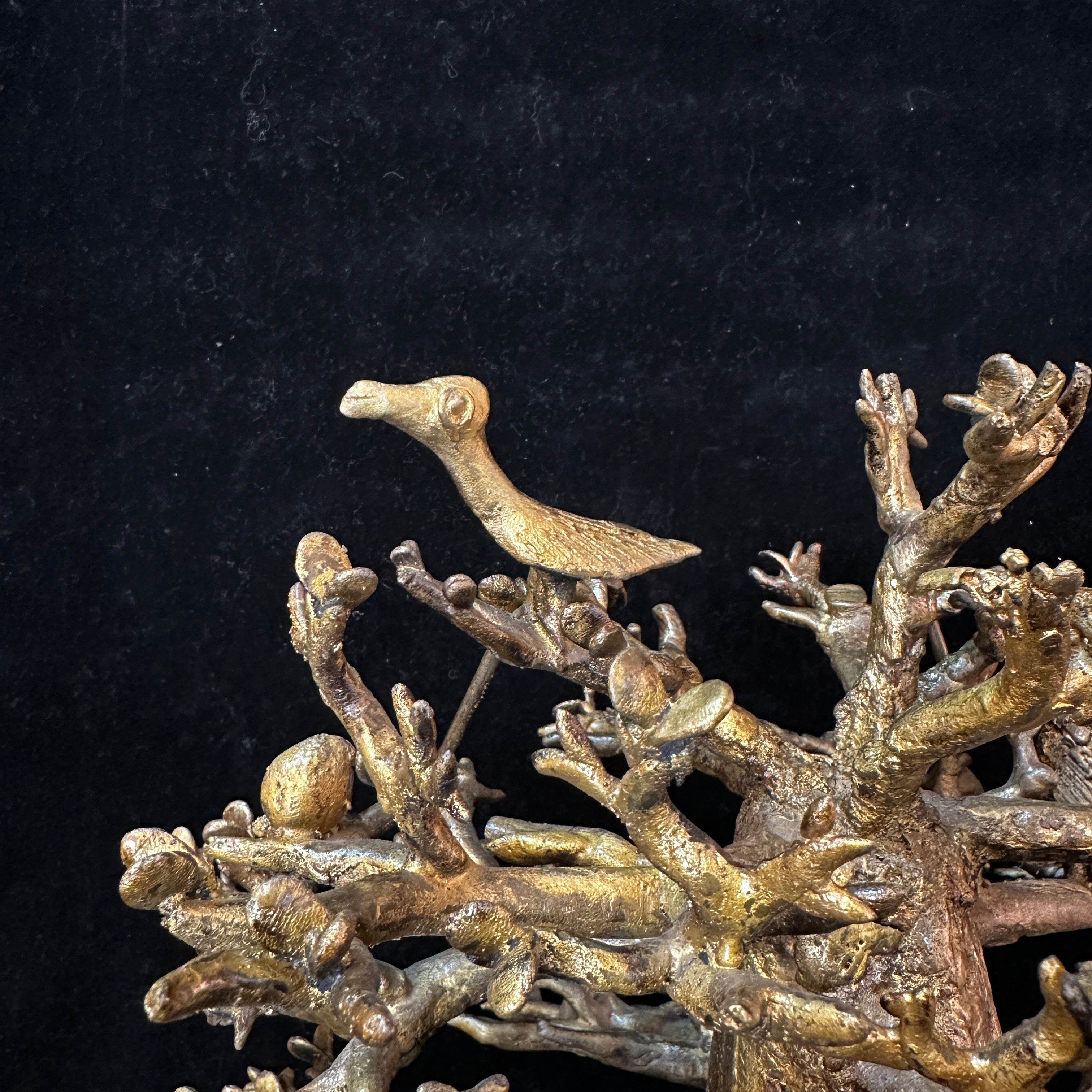 Belle sculpture en bronze massif représentant un baobab et des oiseaux perchés sur ses branches.