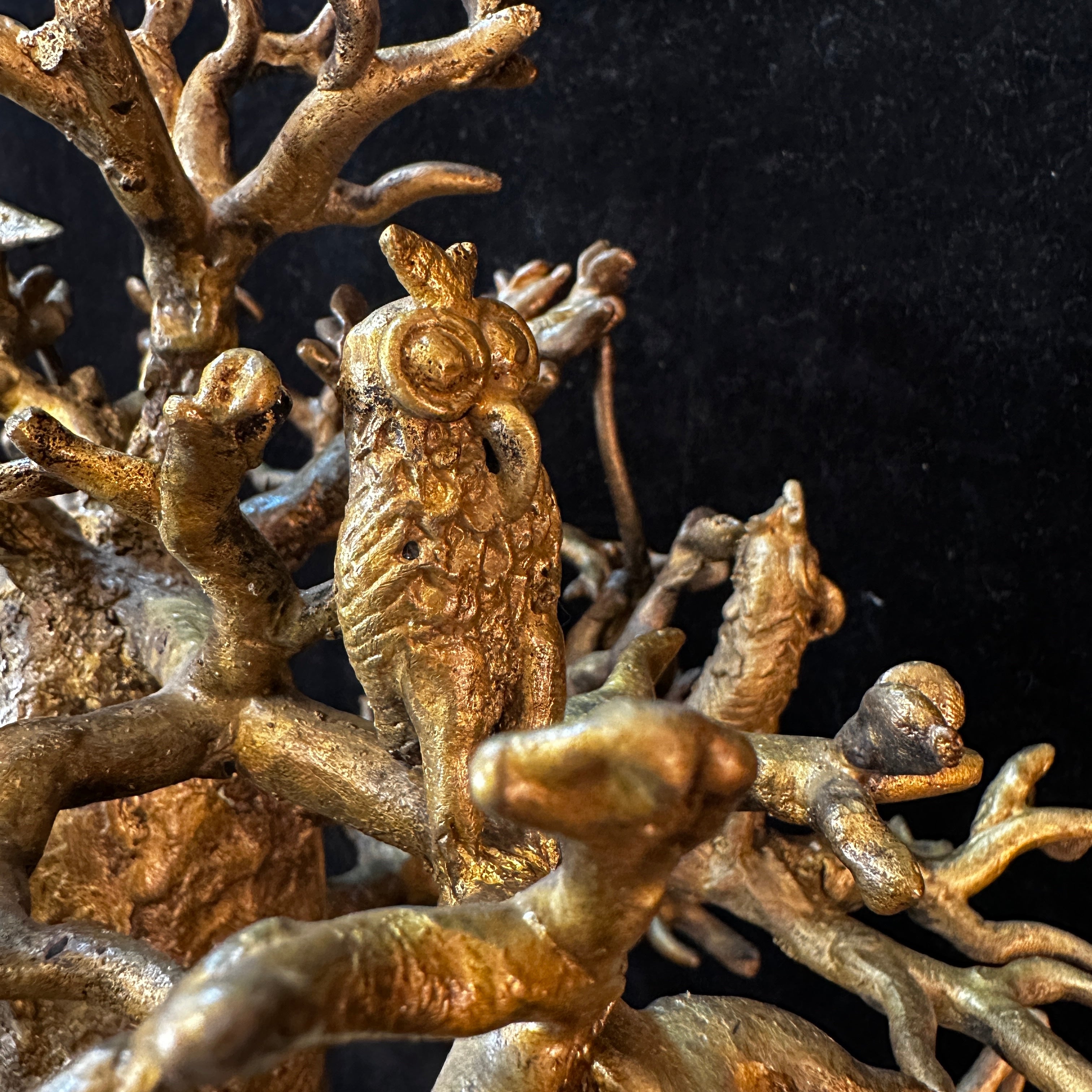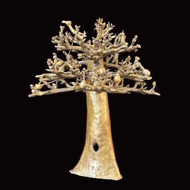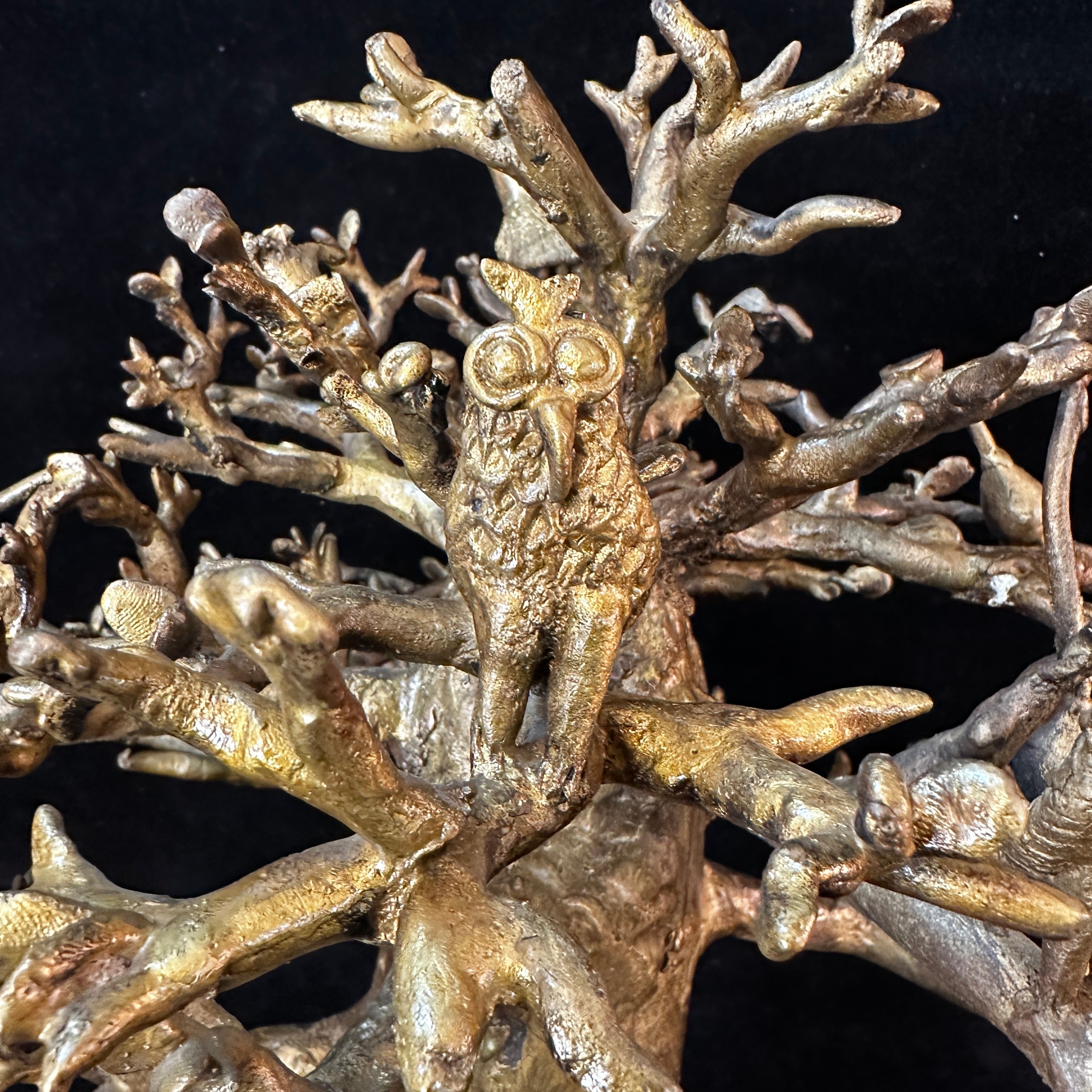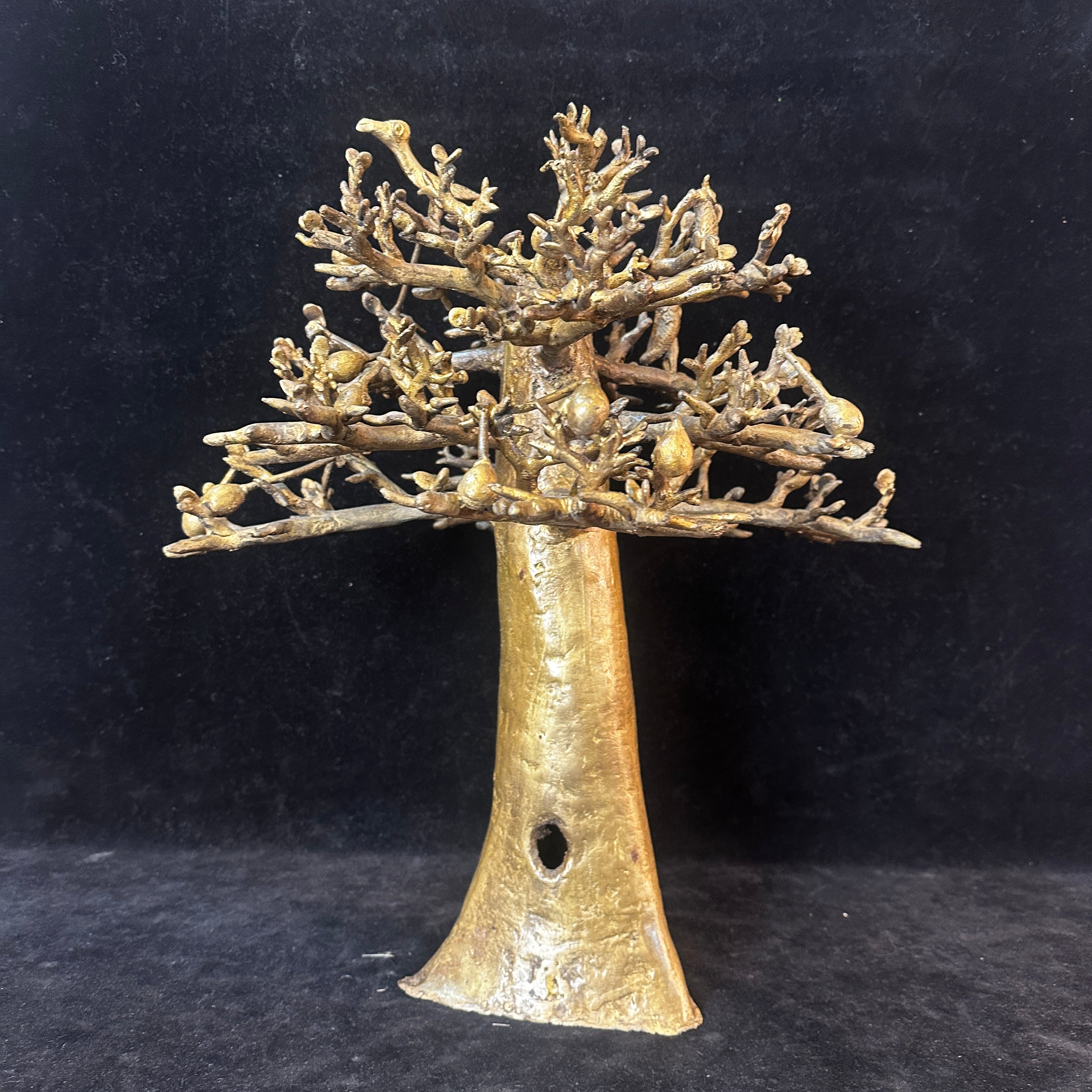 Belle sculpture en bronze massif représentant un baobab et des oiseaux perchés sur ses branches.