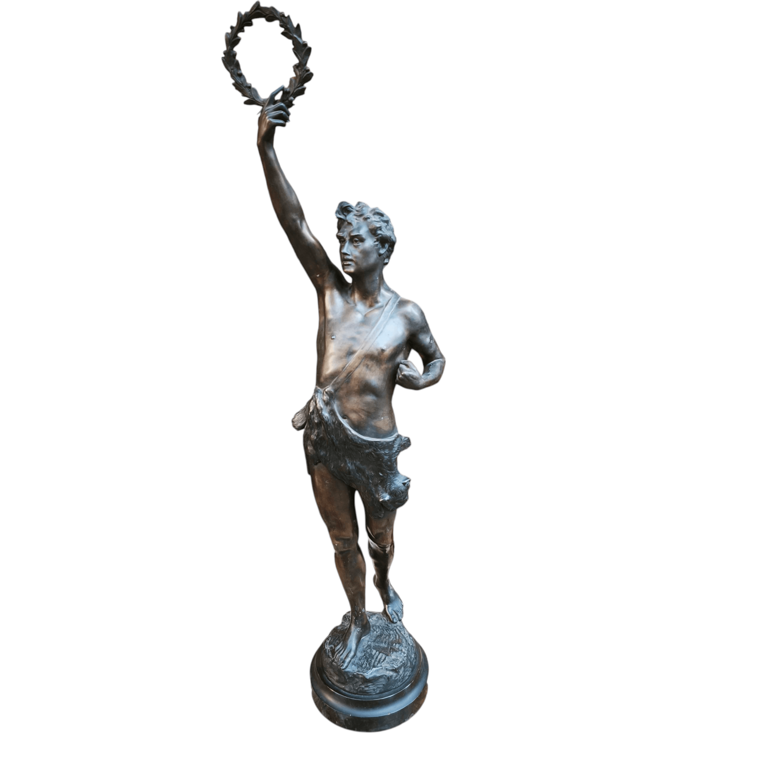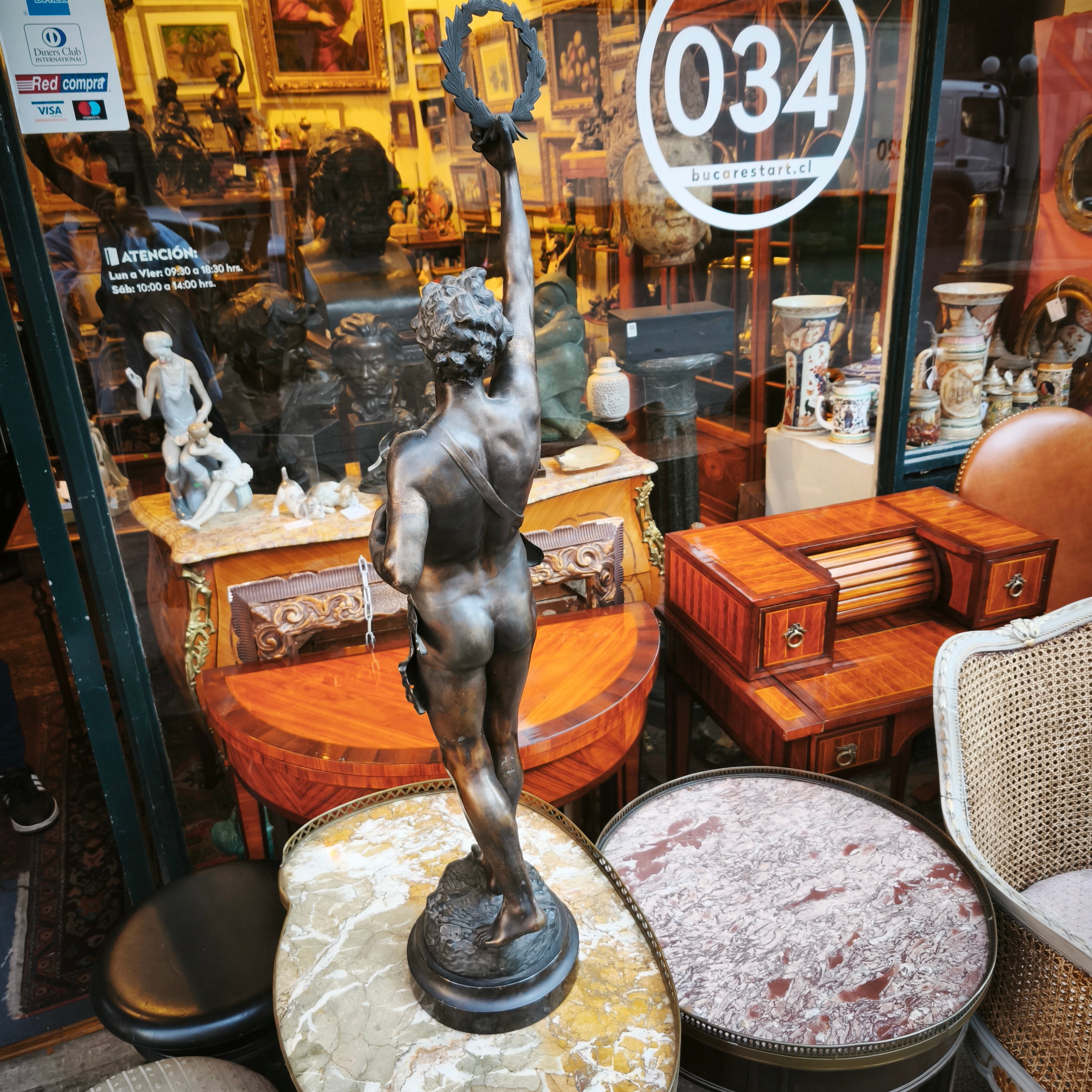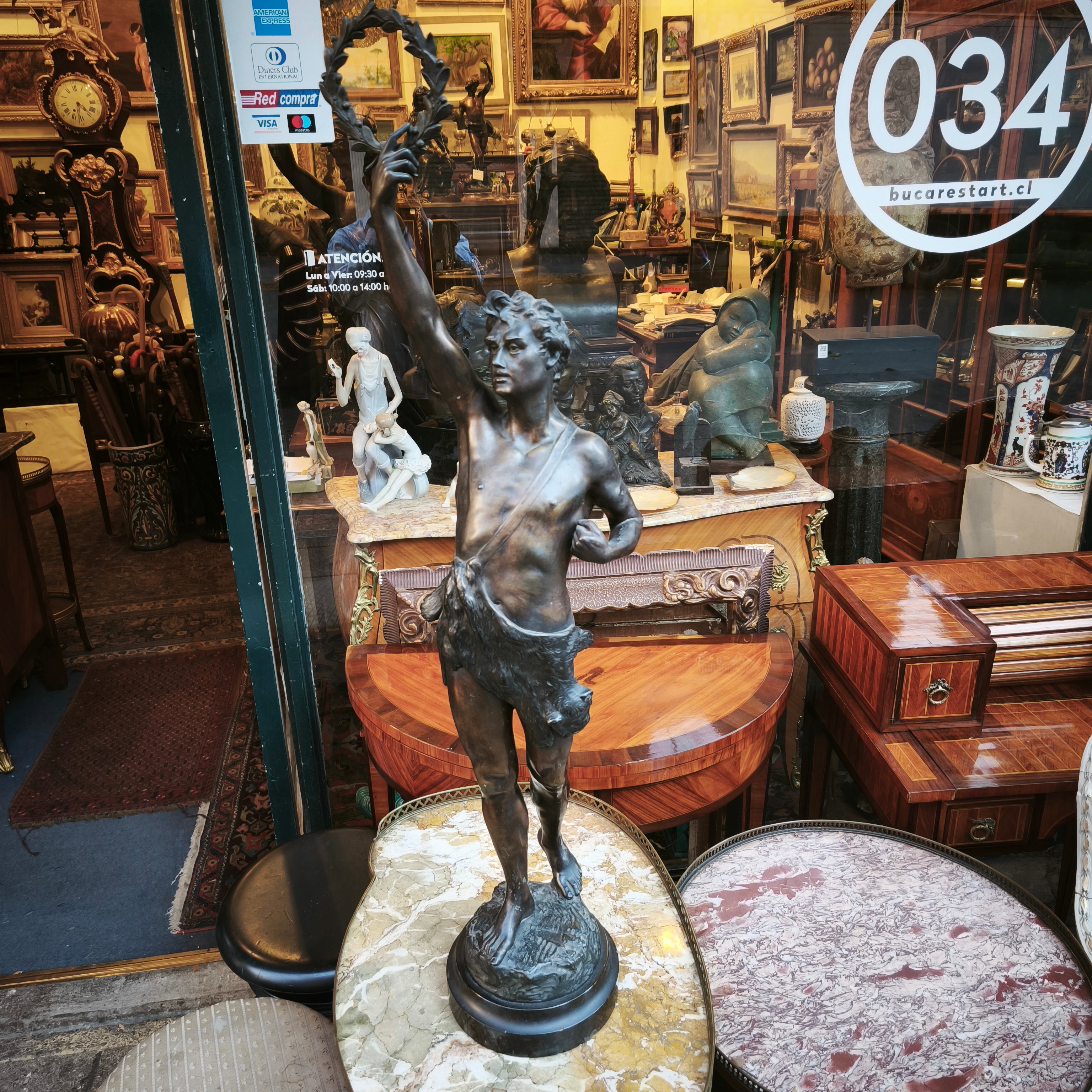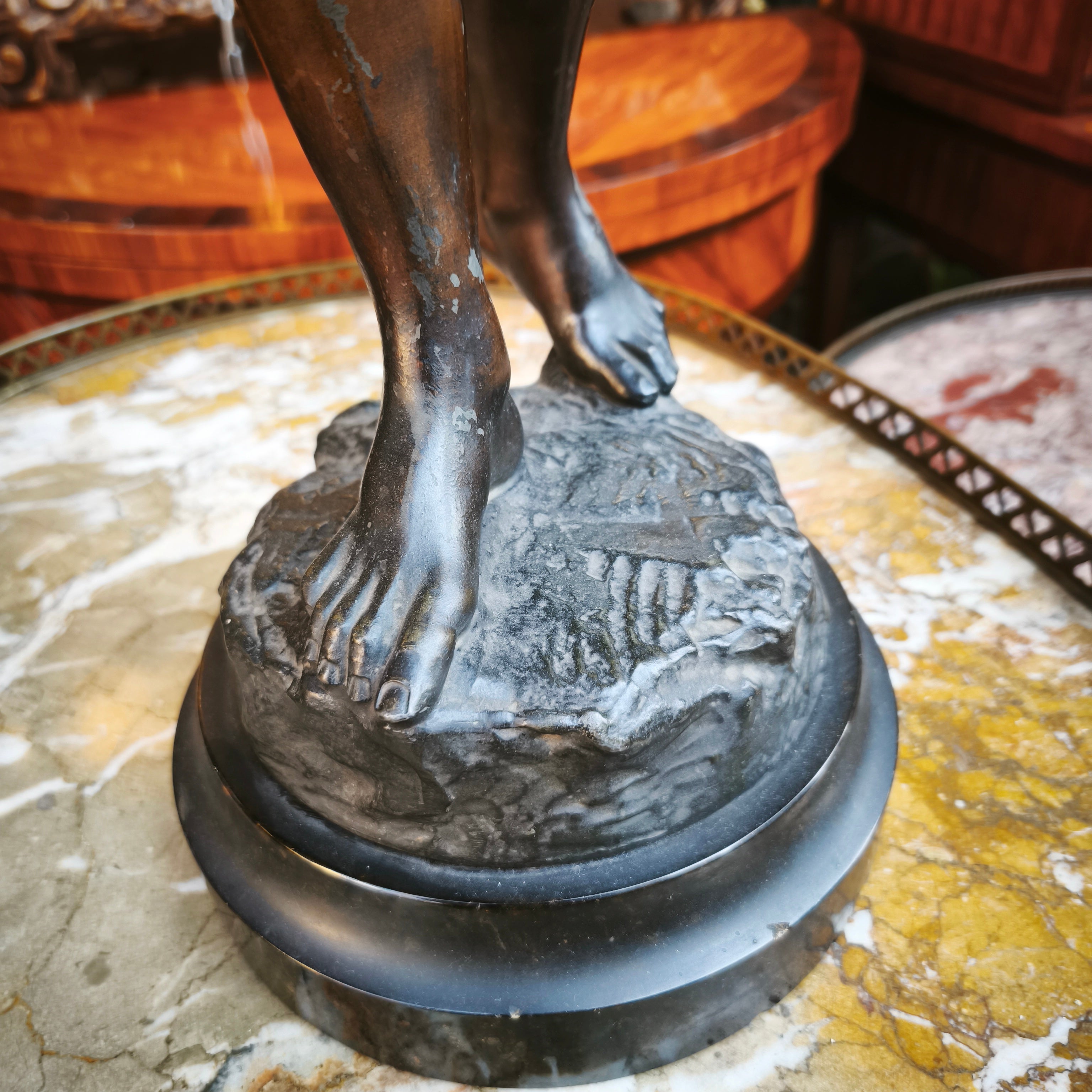 Spectaculaire sculpture d'origine française, réalisée en étain avec une base en marbre noir, représentant Prométhée, figure marquante de la mythologie grecque.