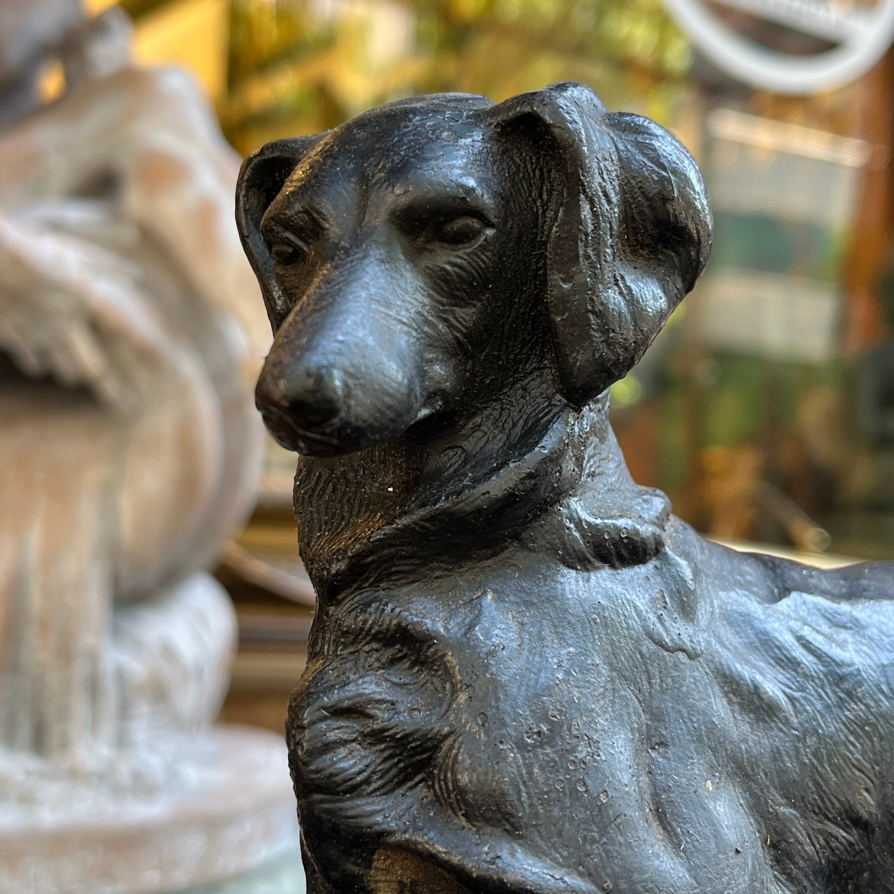 Escultura de origen europeo hecha de fierro fundido, representando una escena de cacería en la que dos perros localizan a una codorniz, capturando el gesto de la cola recta de uno de ellos y la actitud sorprendida del otro.