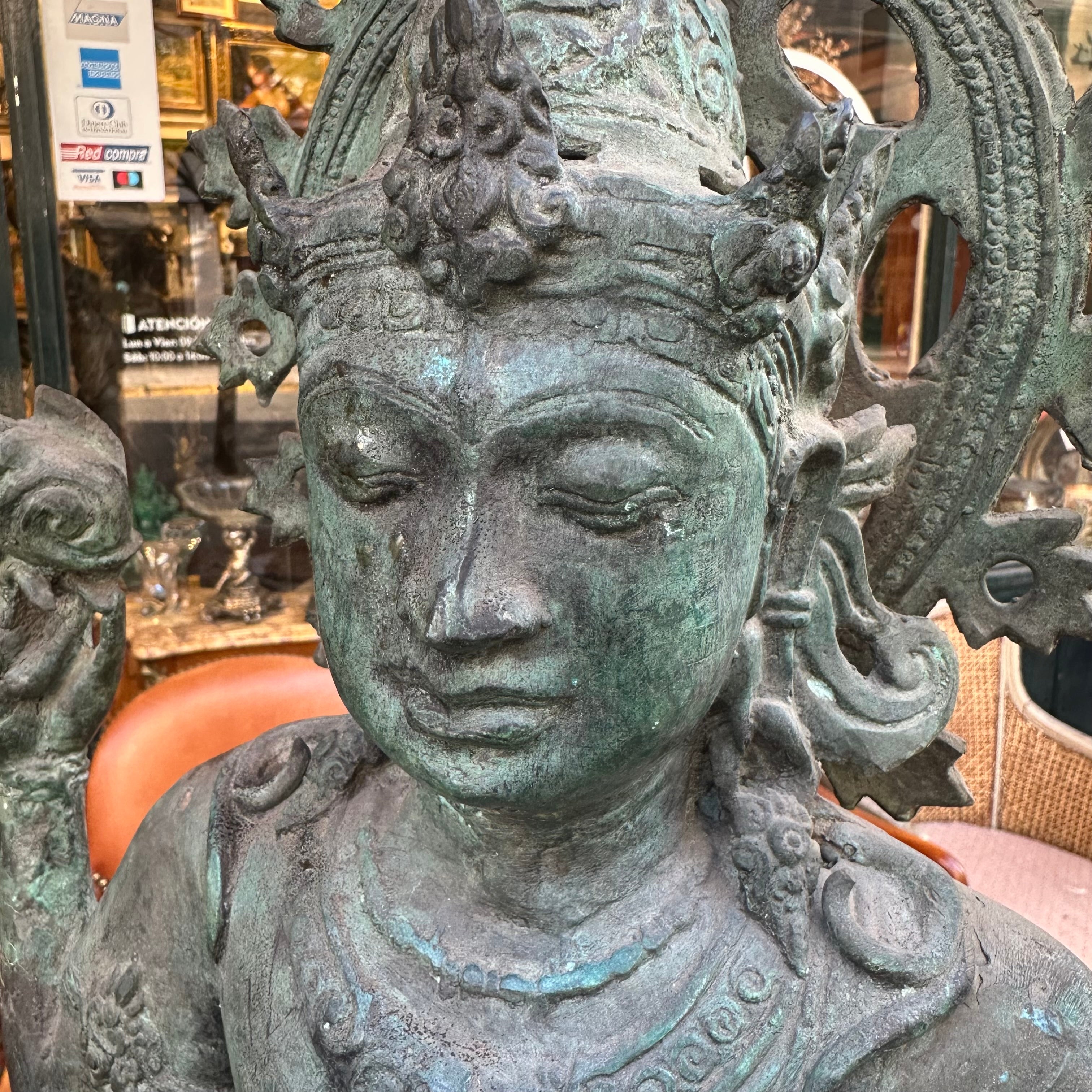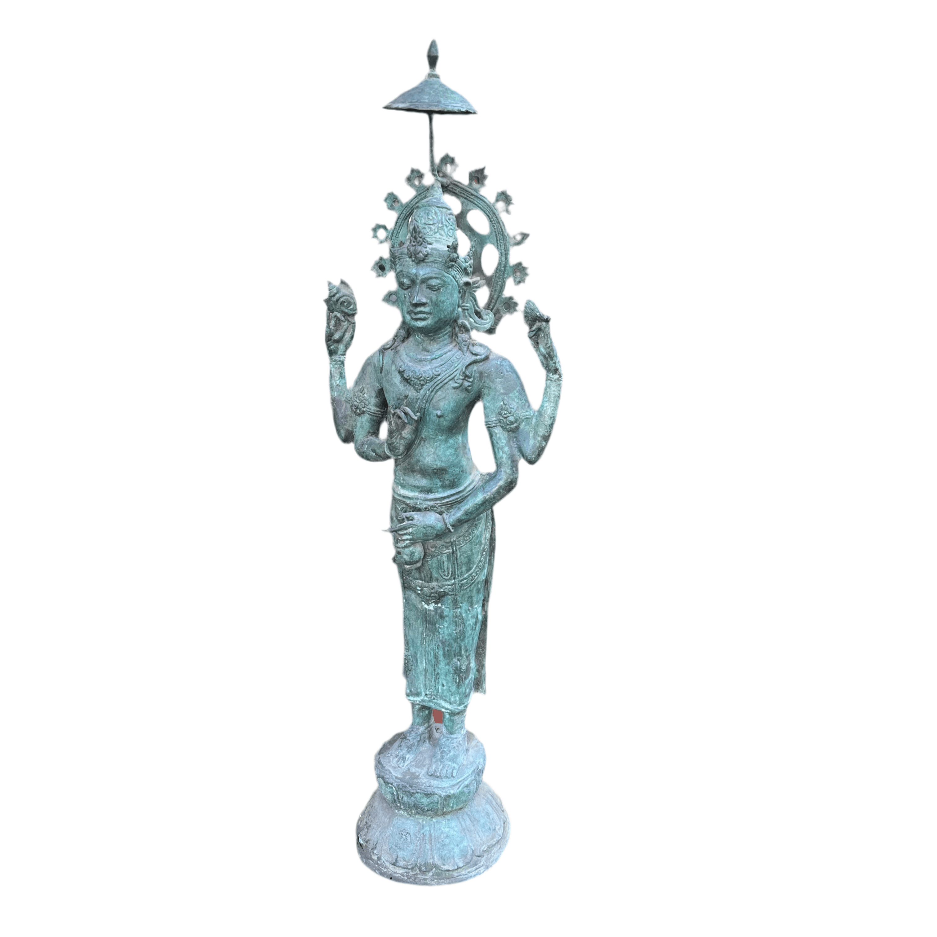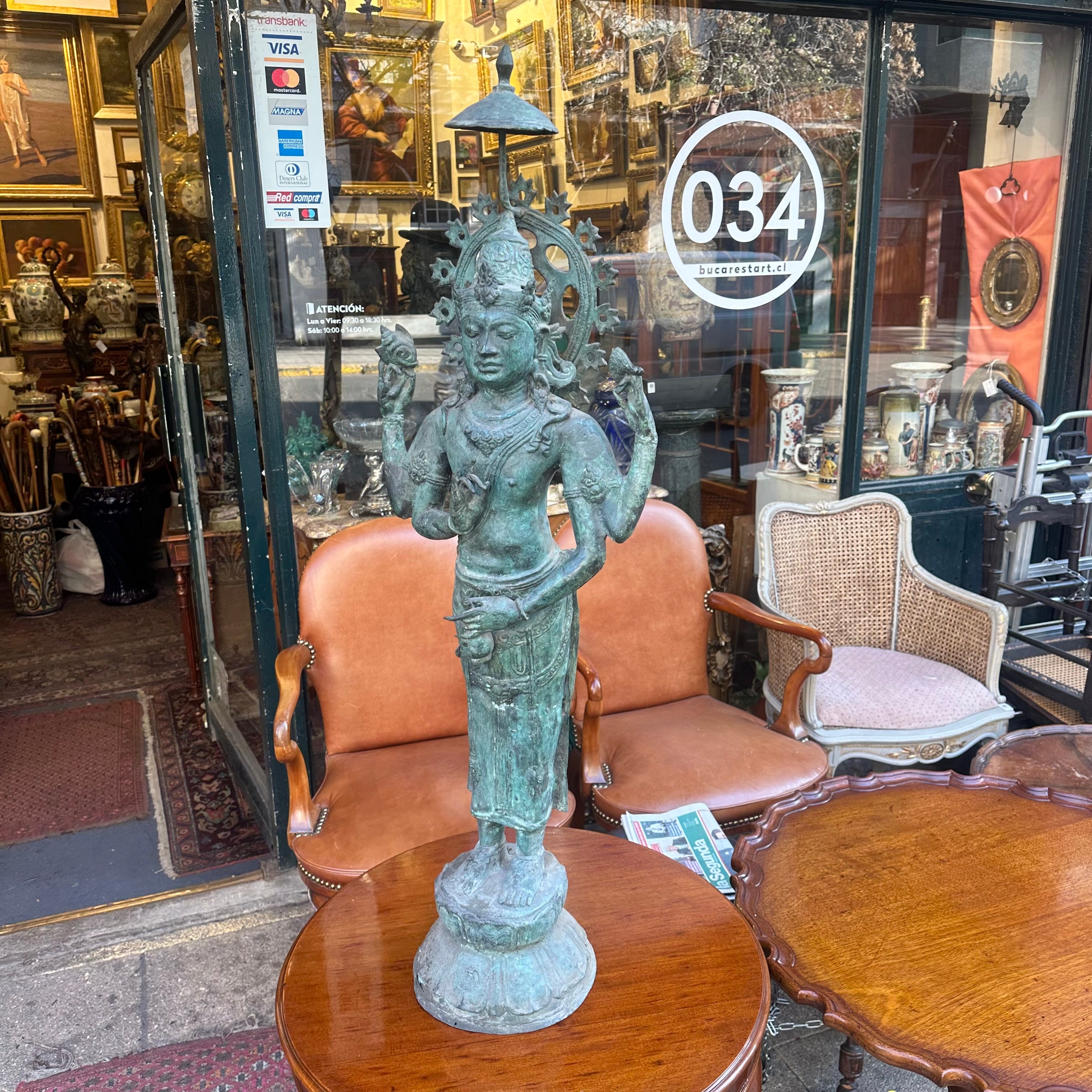Sculpture en bronze vert d'origine indienne, représentant la divinité Brahma, une figure qui représente la création, la connaissance et la sagesse dans la cosmologie hindoue.