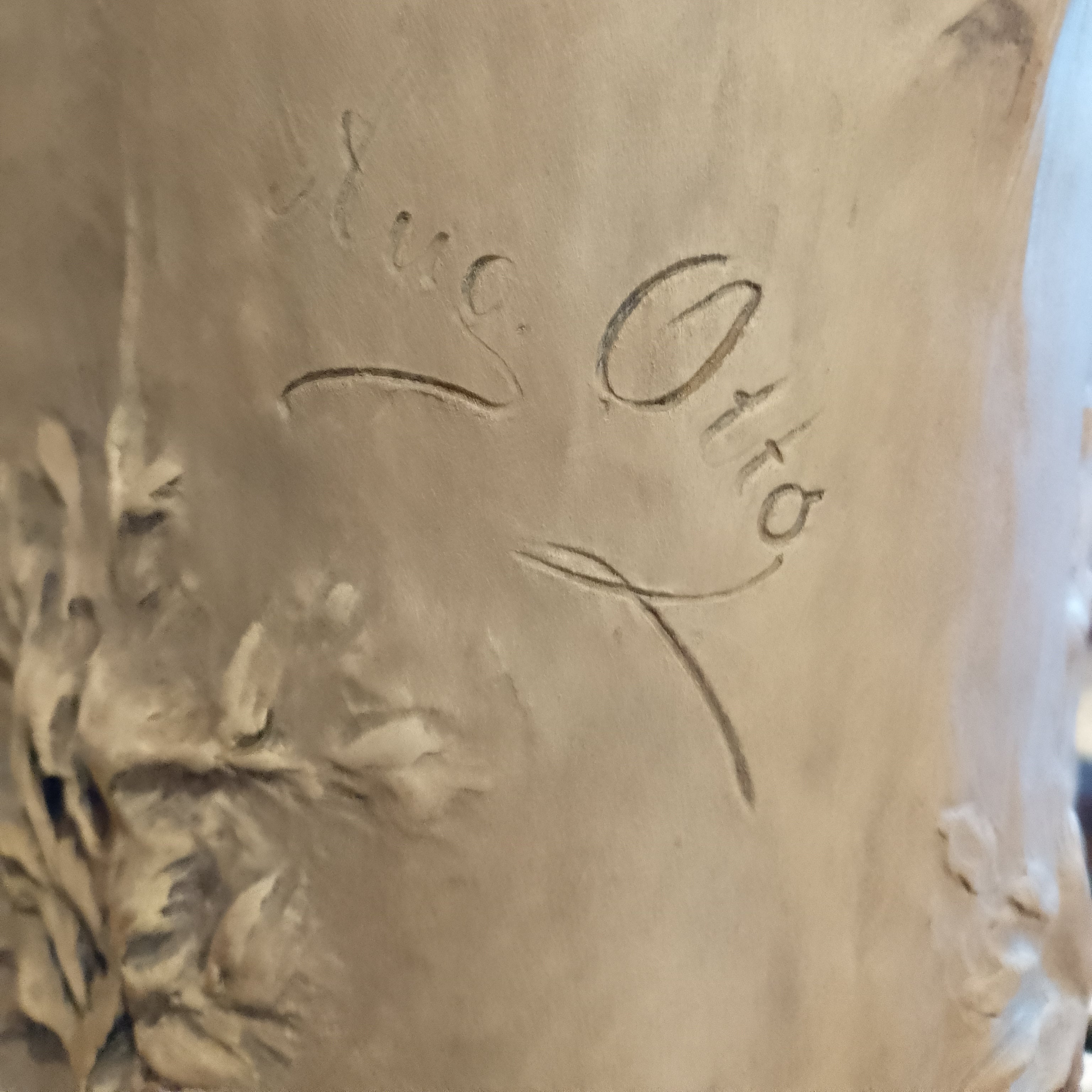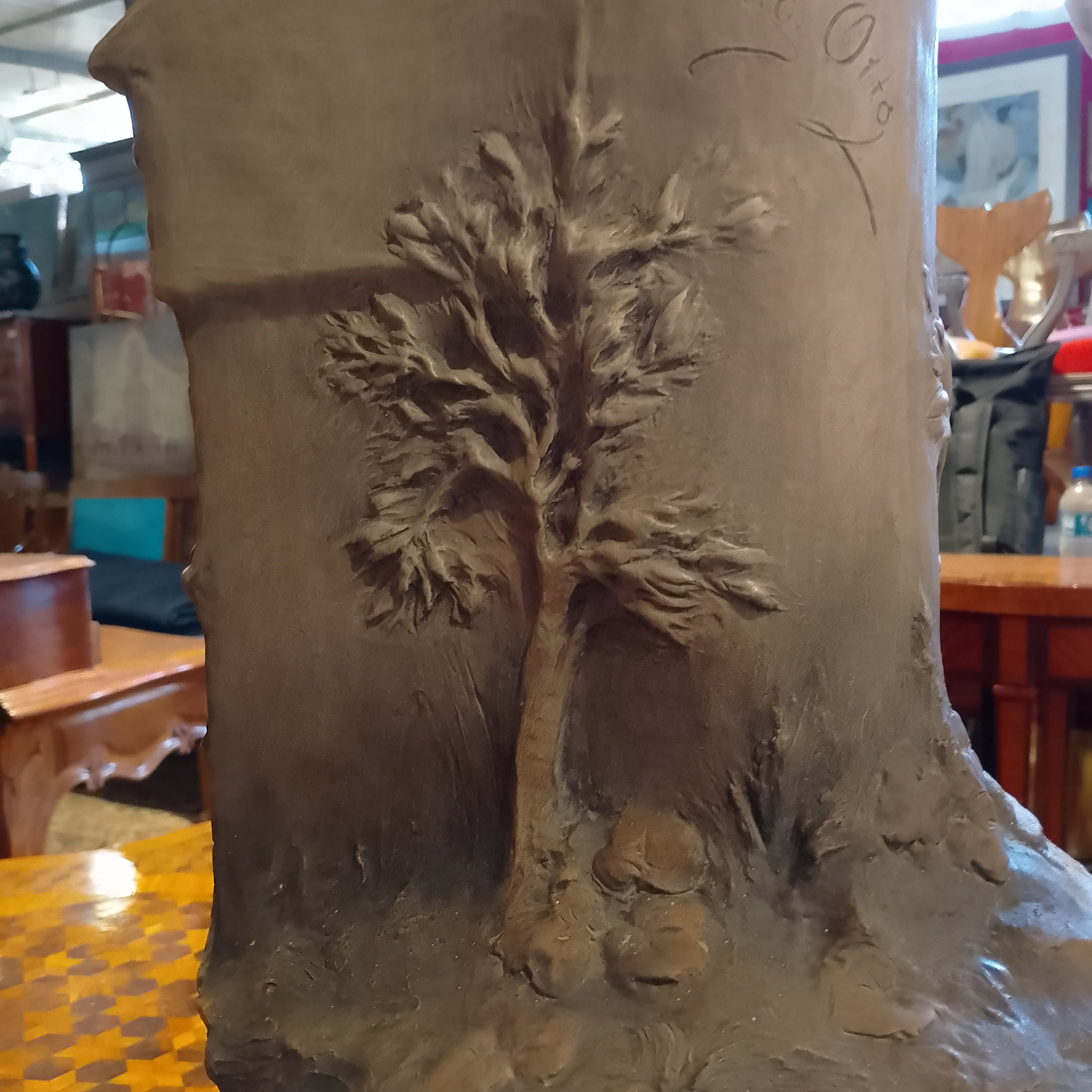 Sculpture en terre cuite d'August Otto, scène « Femme et arbre »