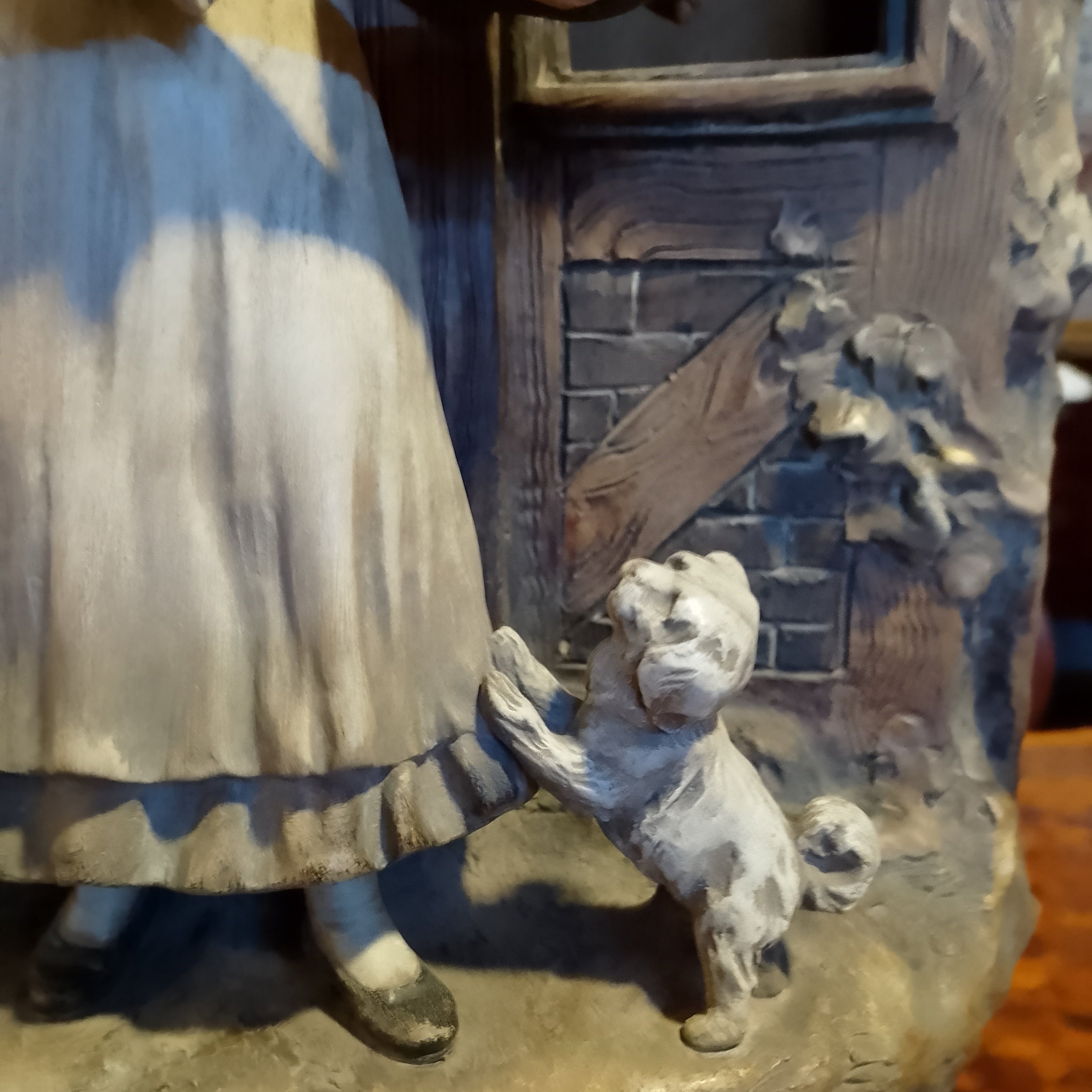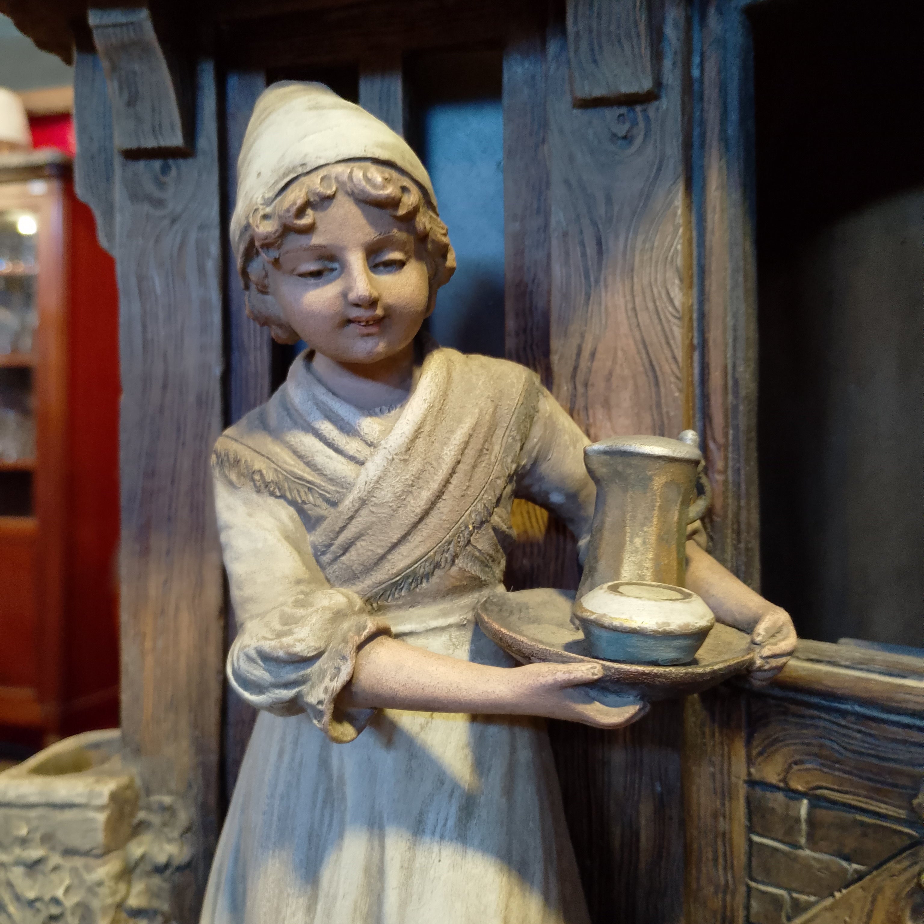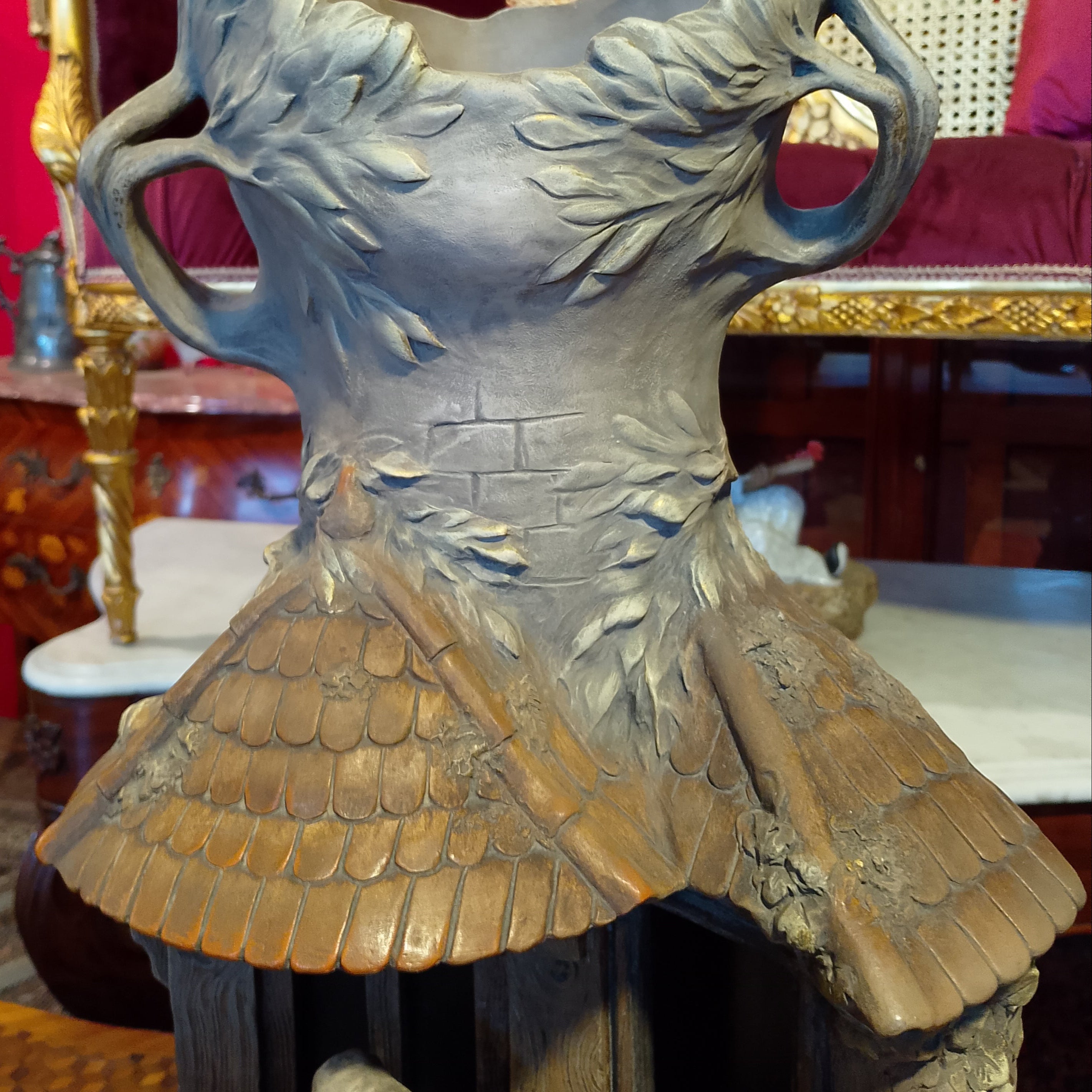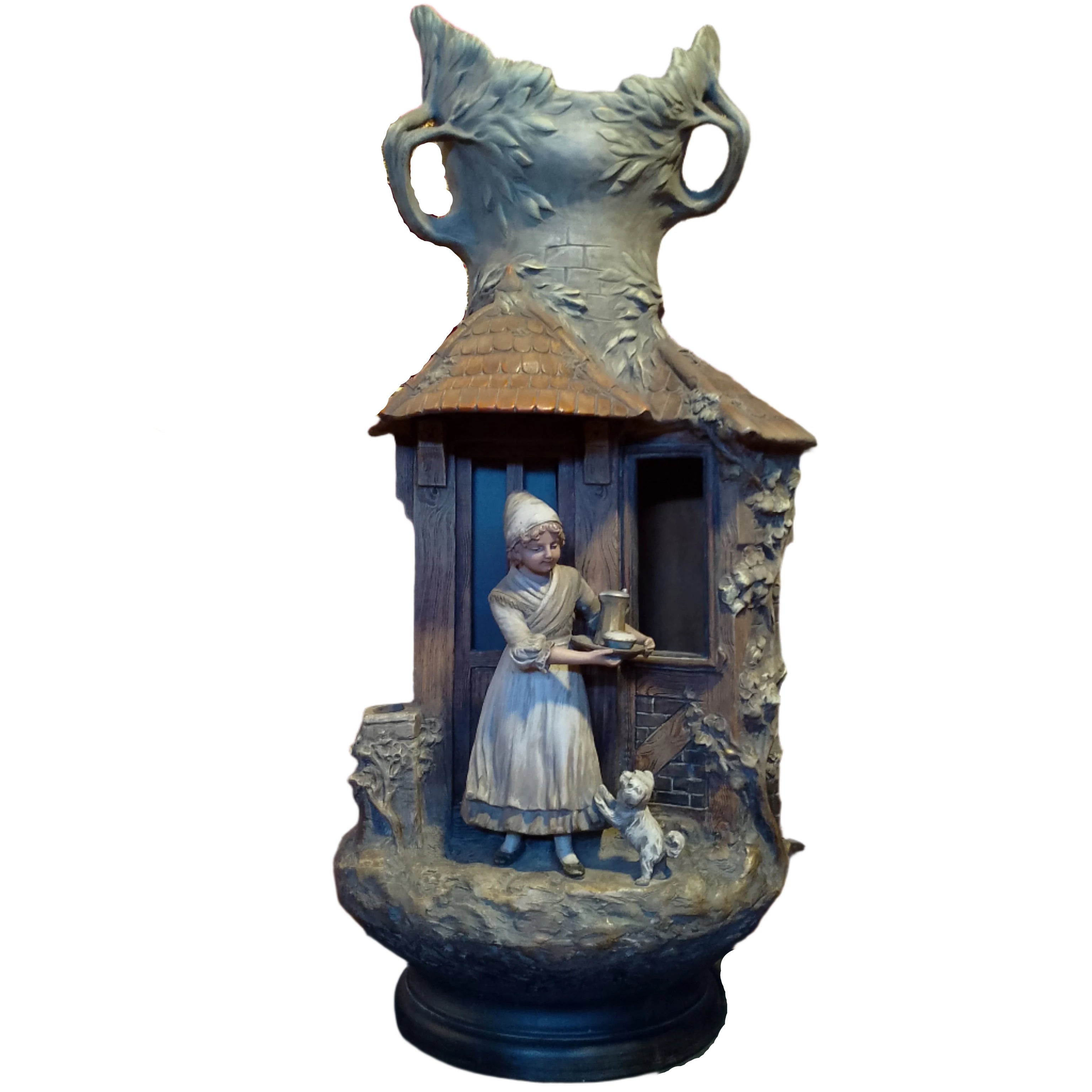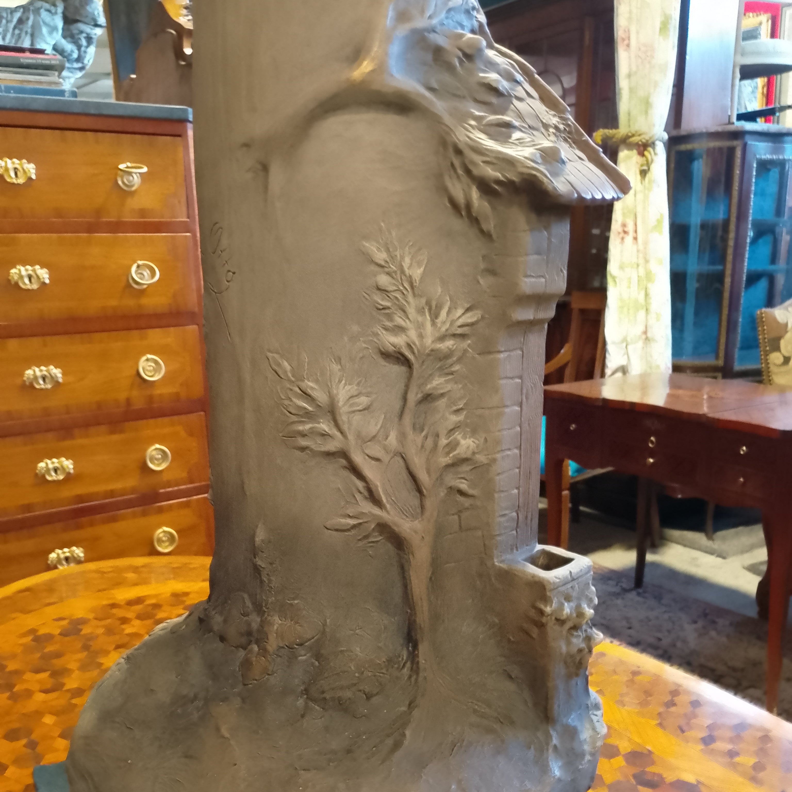 Une sculpture unique en terre cuite du sculpteur August Otto représentant une scène domestique d'Europe centrale dans laquelle le foyer est combiné avec un tronc d'arbre, donnant à l'ensemble un caractère fantastique, rappelant les contes et légendes traditionnels de la région.