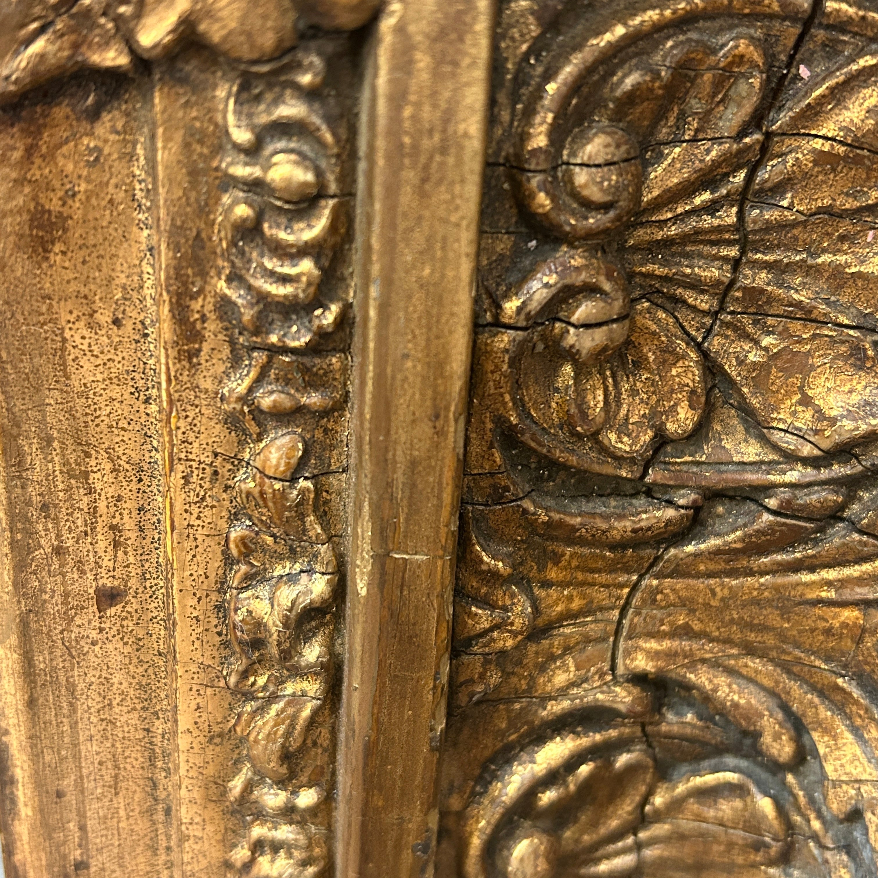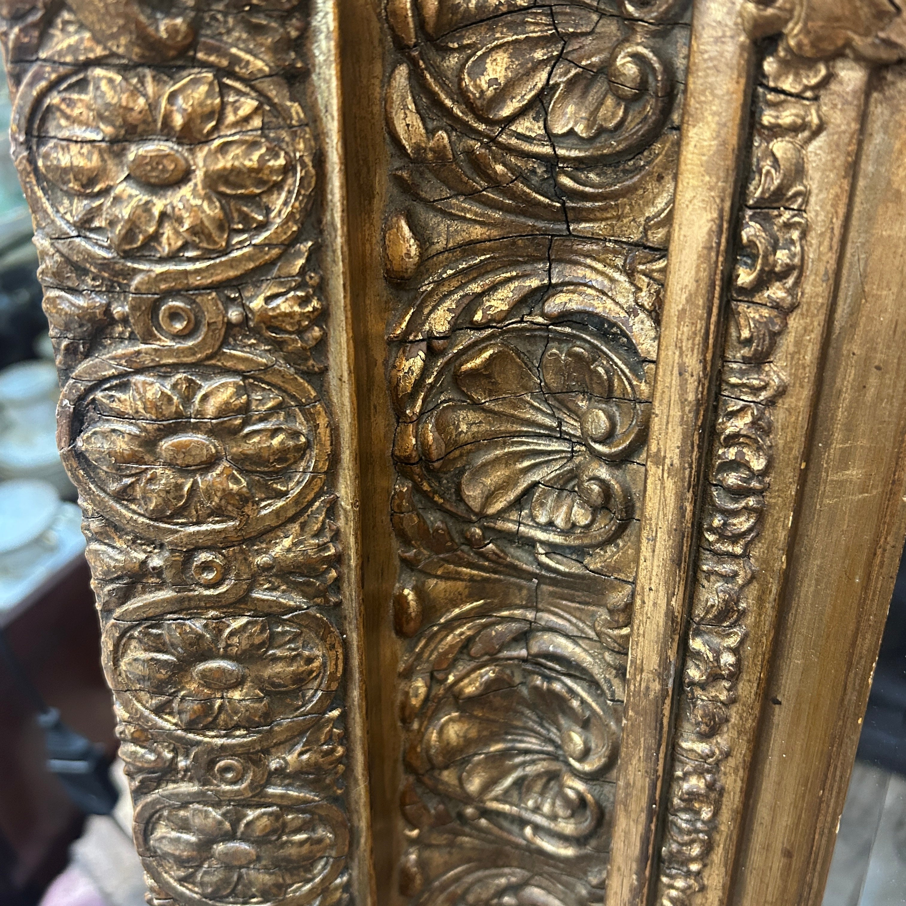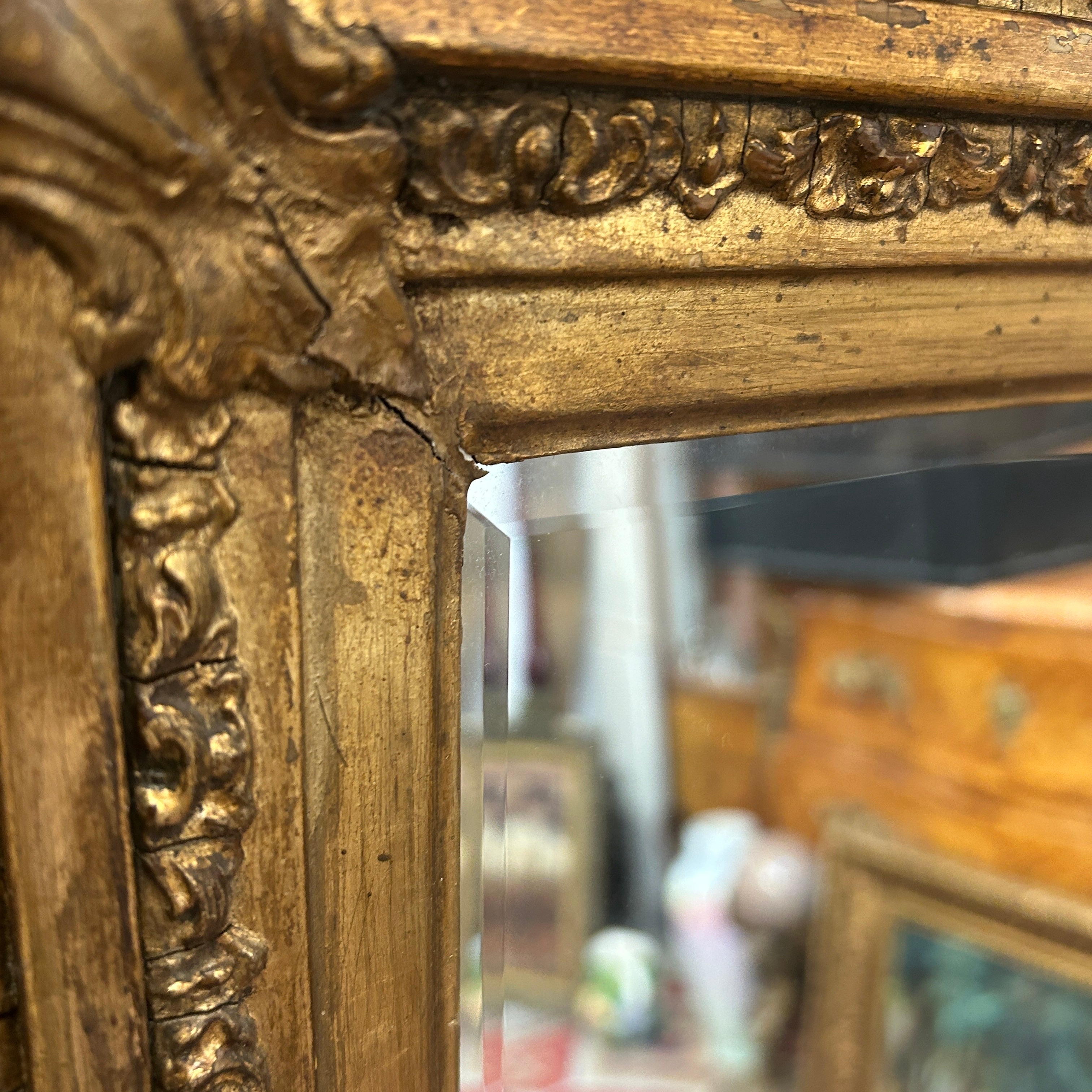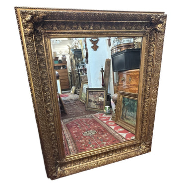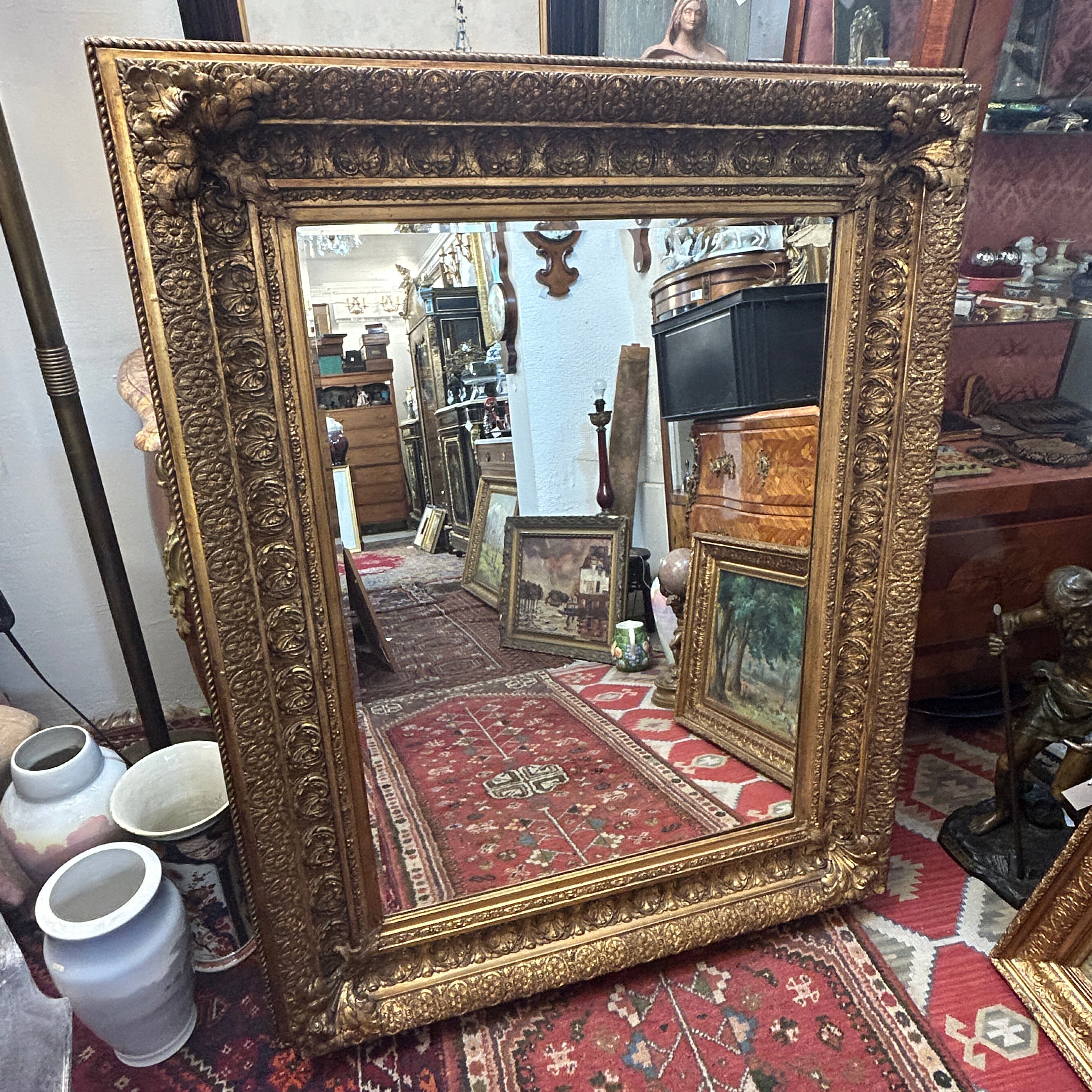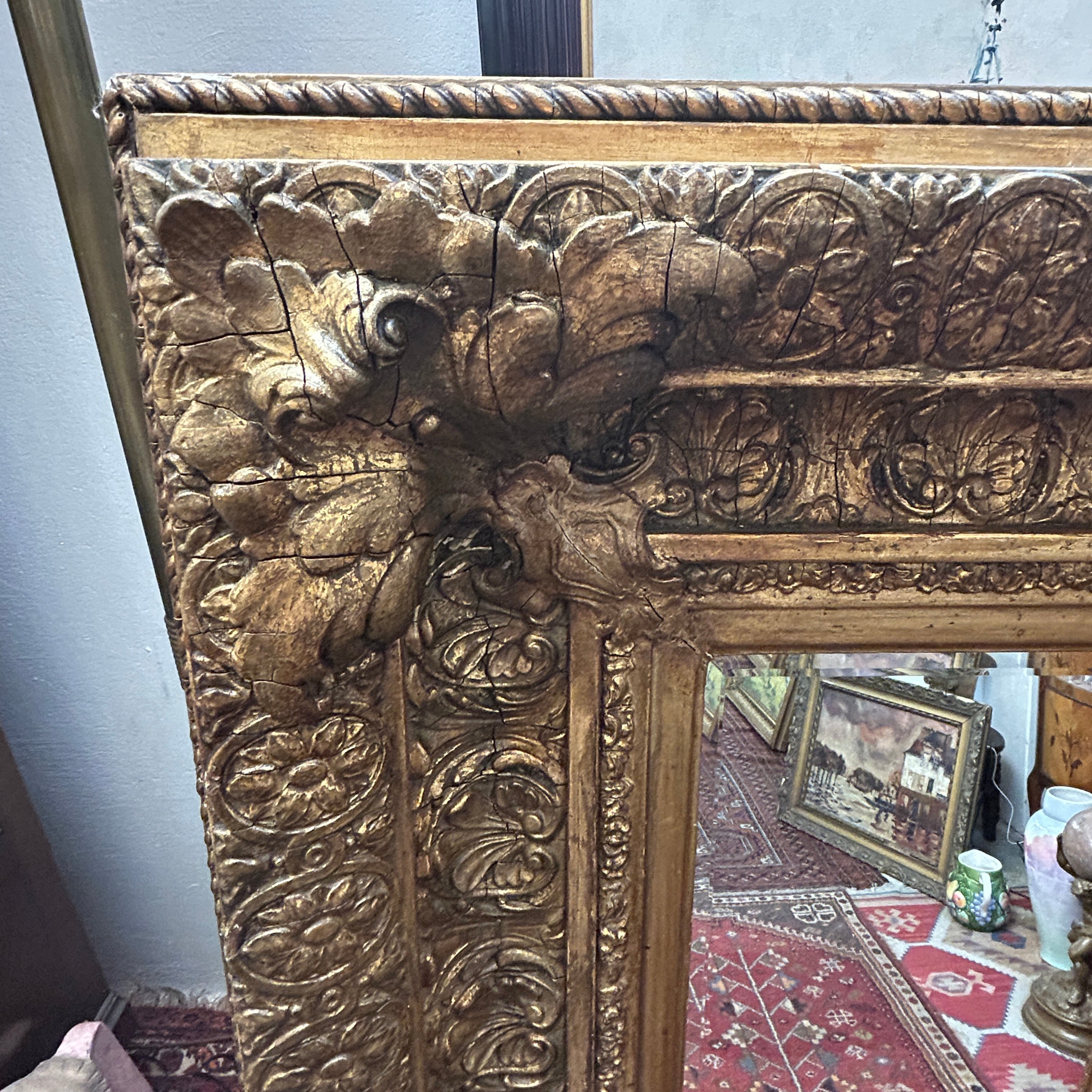 Gran espejo biselado de origen francés, con marco de madera tallada en relieves con motivos florales y terminado en elegante dorado.