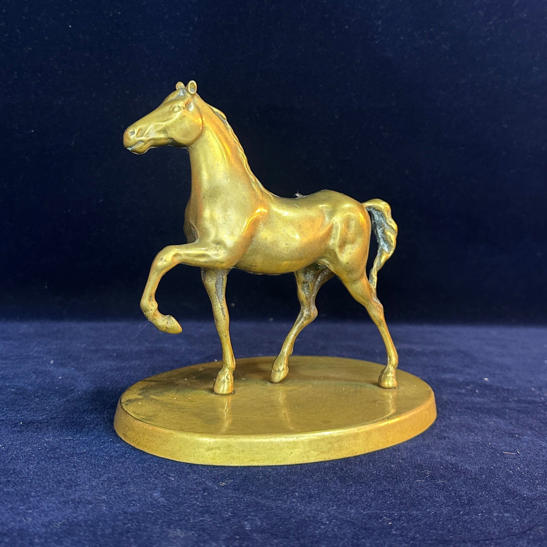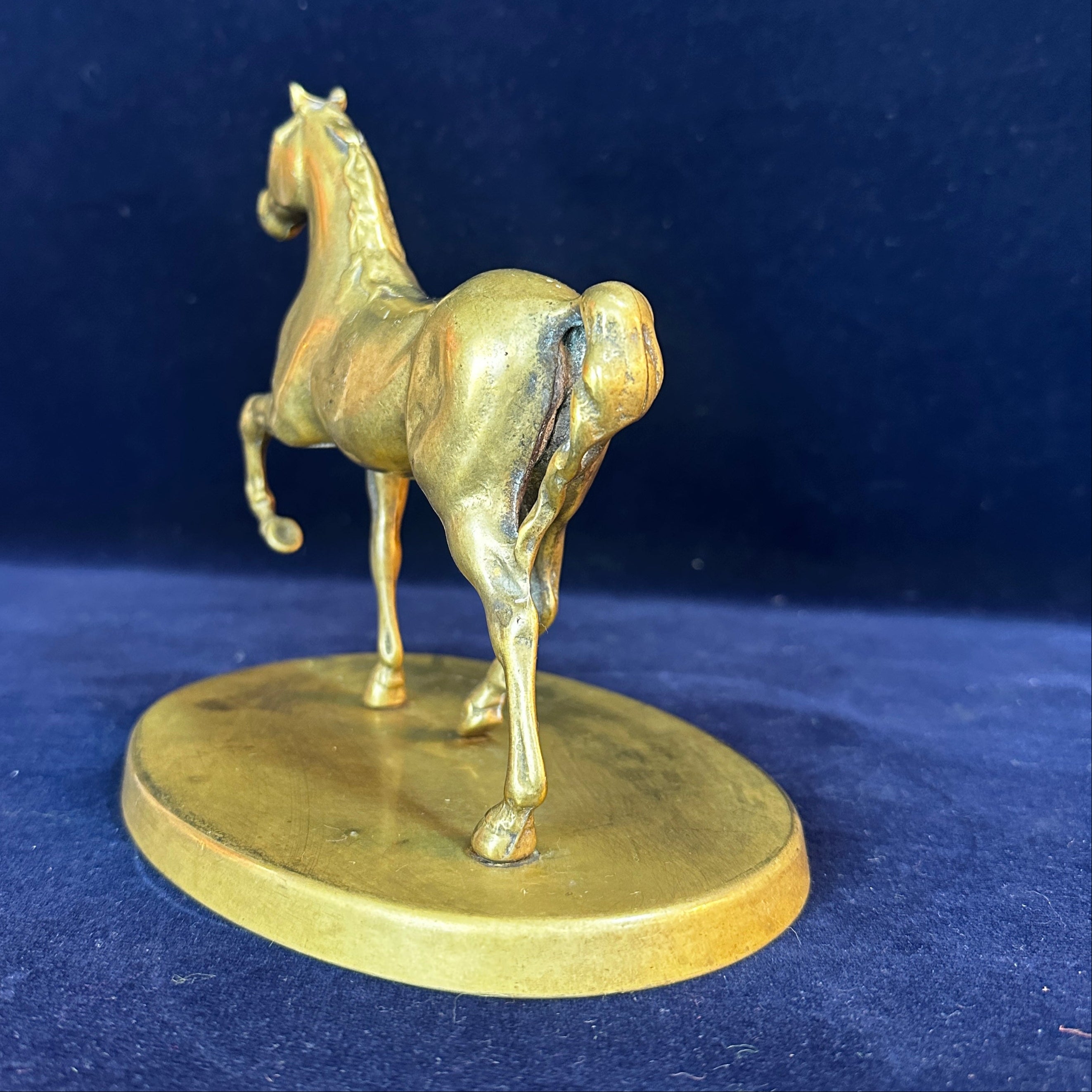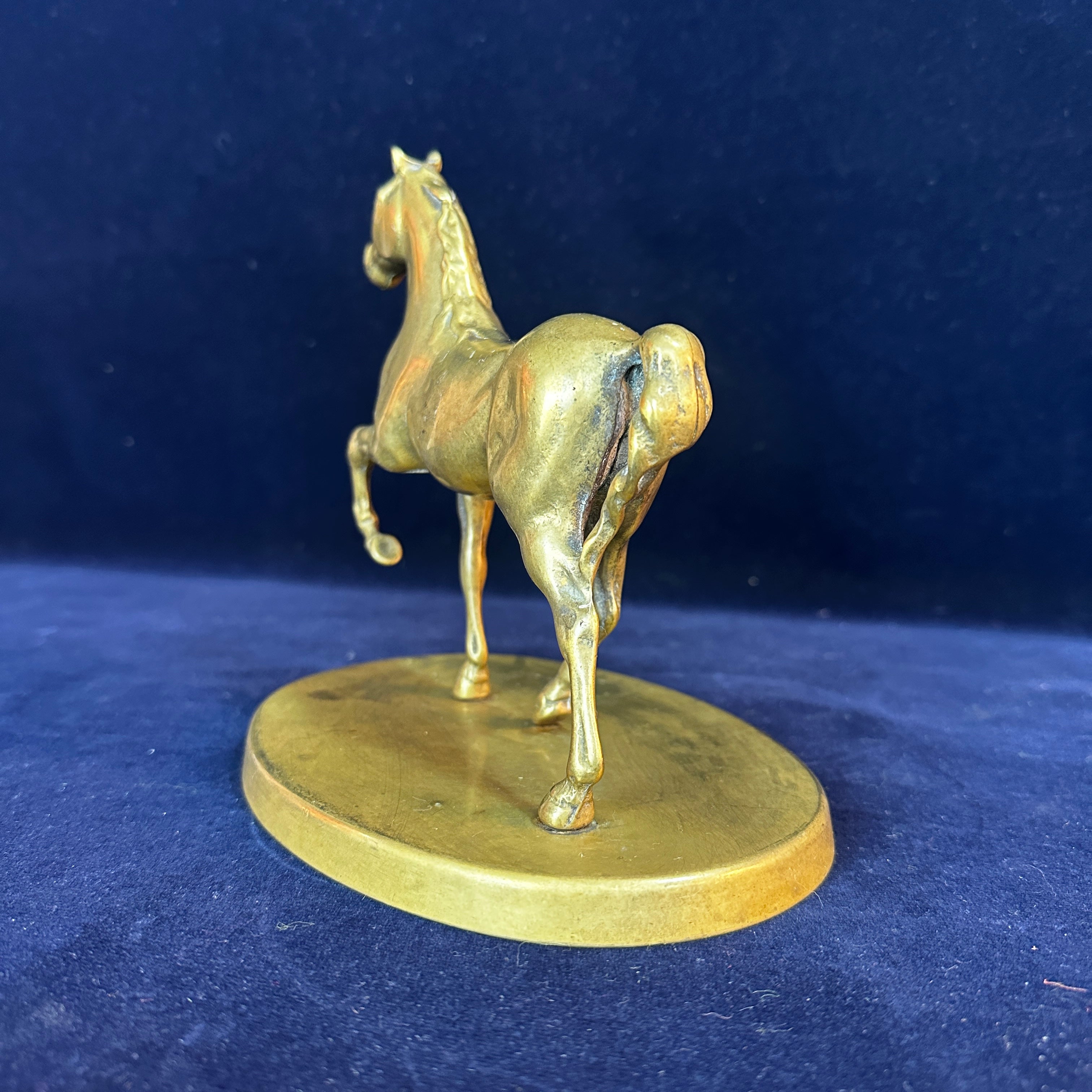 Magnifique statuette de cheval en bronze français, finement modelée, représentant un équidé marchant sereinement. La pièce présente des détails délicats qui soulignent la force et l'élégance de l'animal, perché sur un socle ovale en bronze.