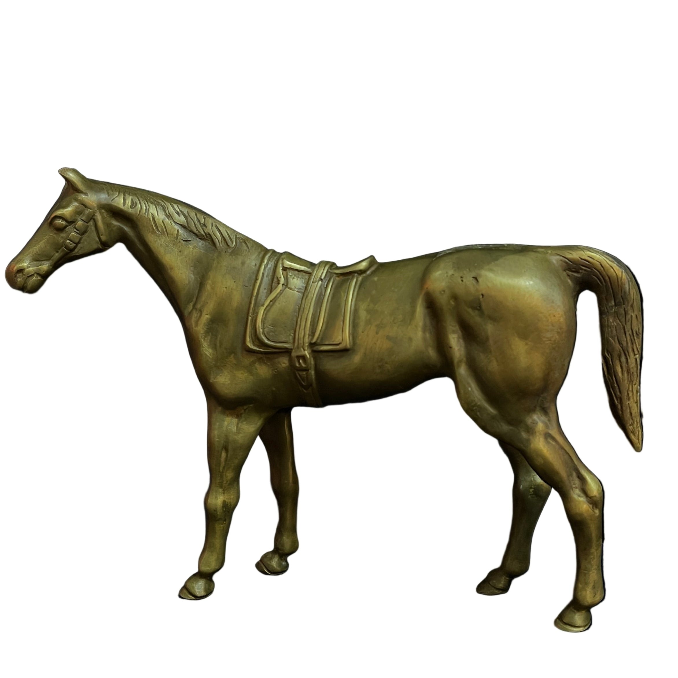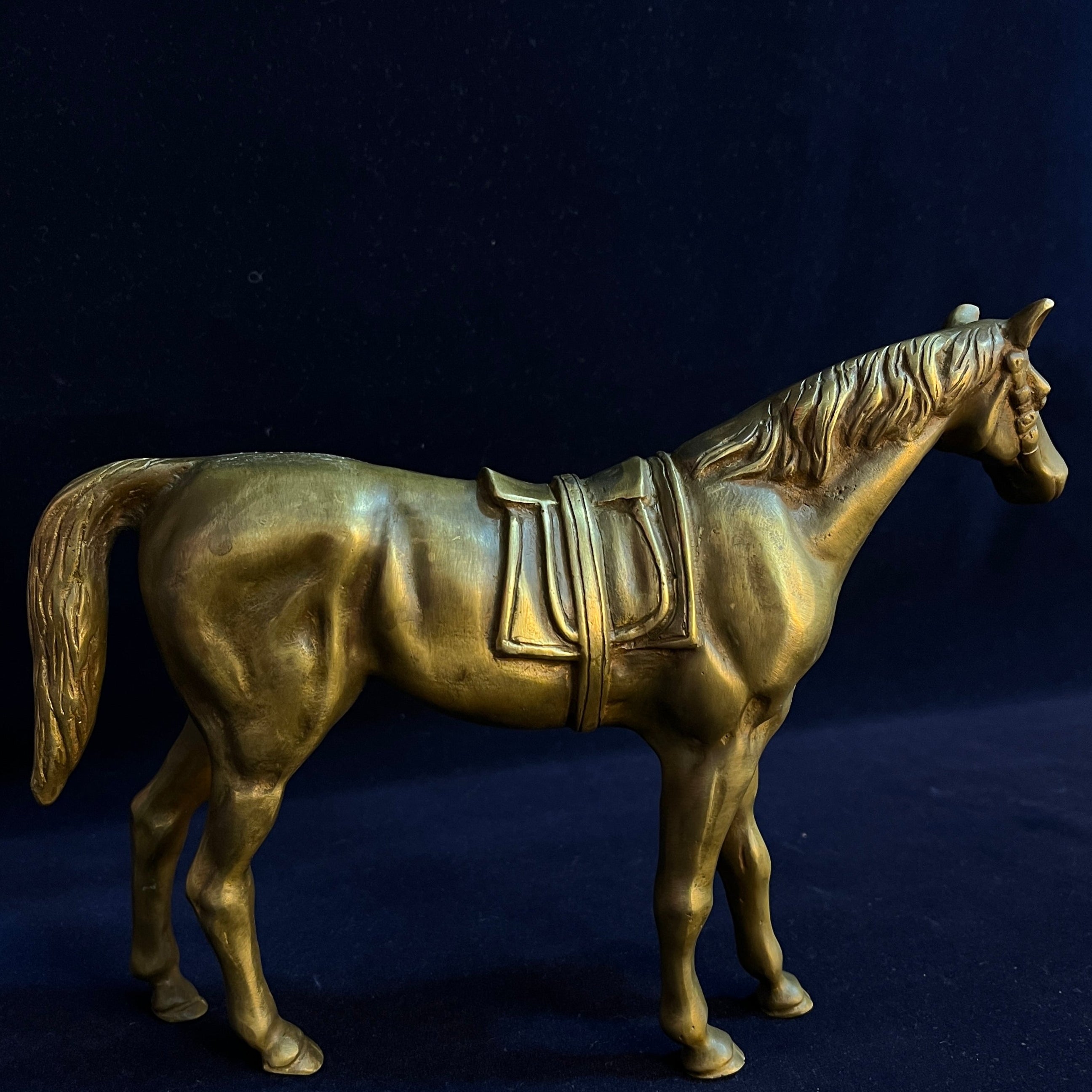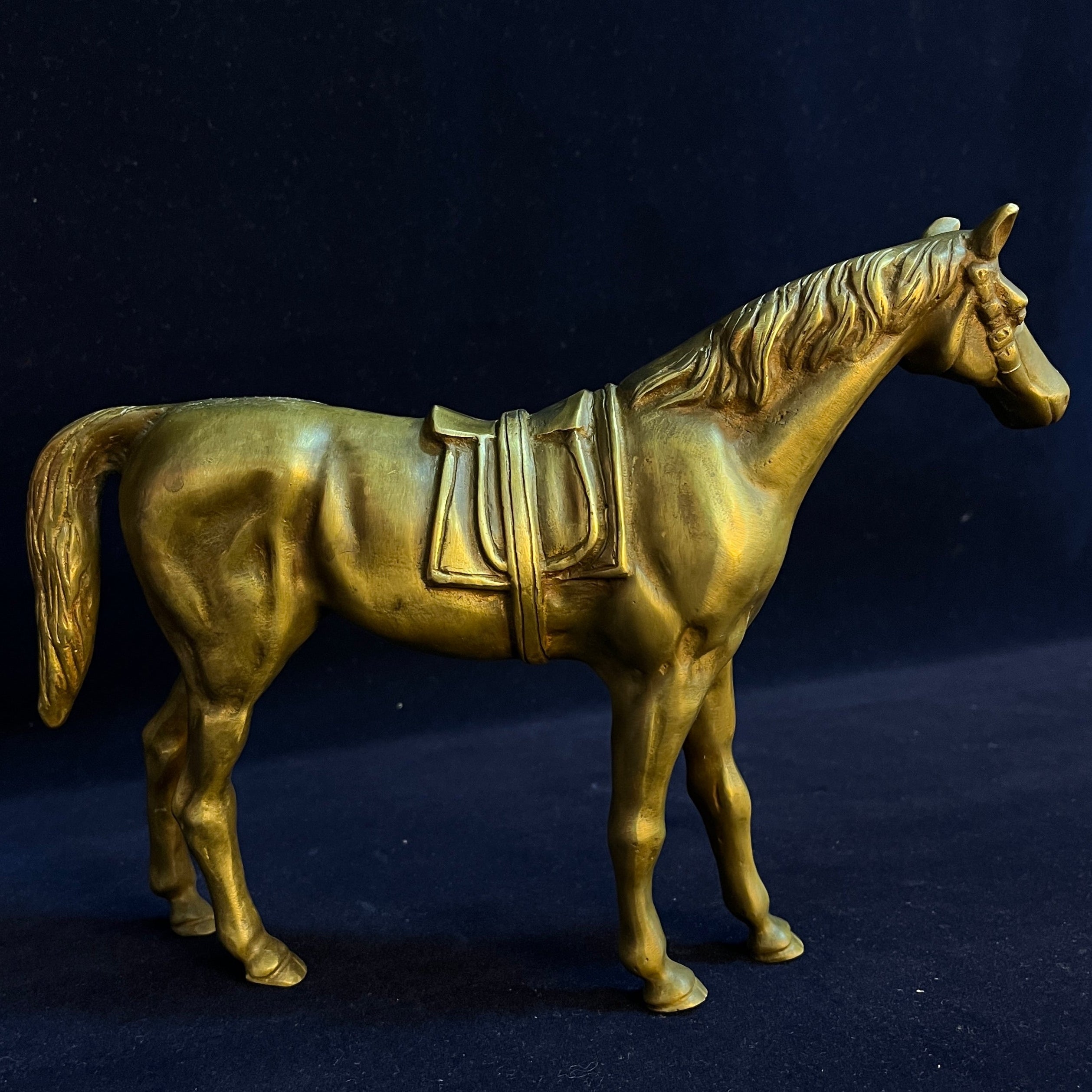 Magnifique pièce décorative d'origine française, en bronze, représentant un cheval majestueux. Les détails délicats et précis de son anatomie, ainsi que ceux de la selle et des autres éléments ornementaux, sont remarquables.