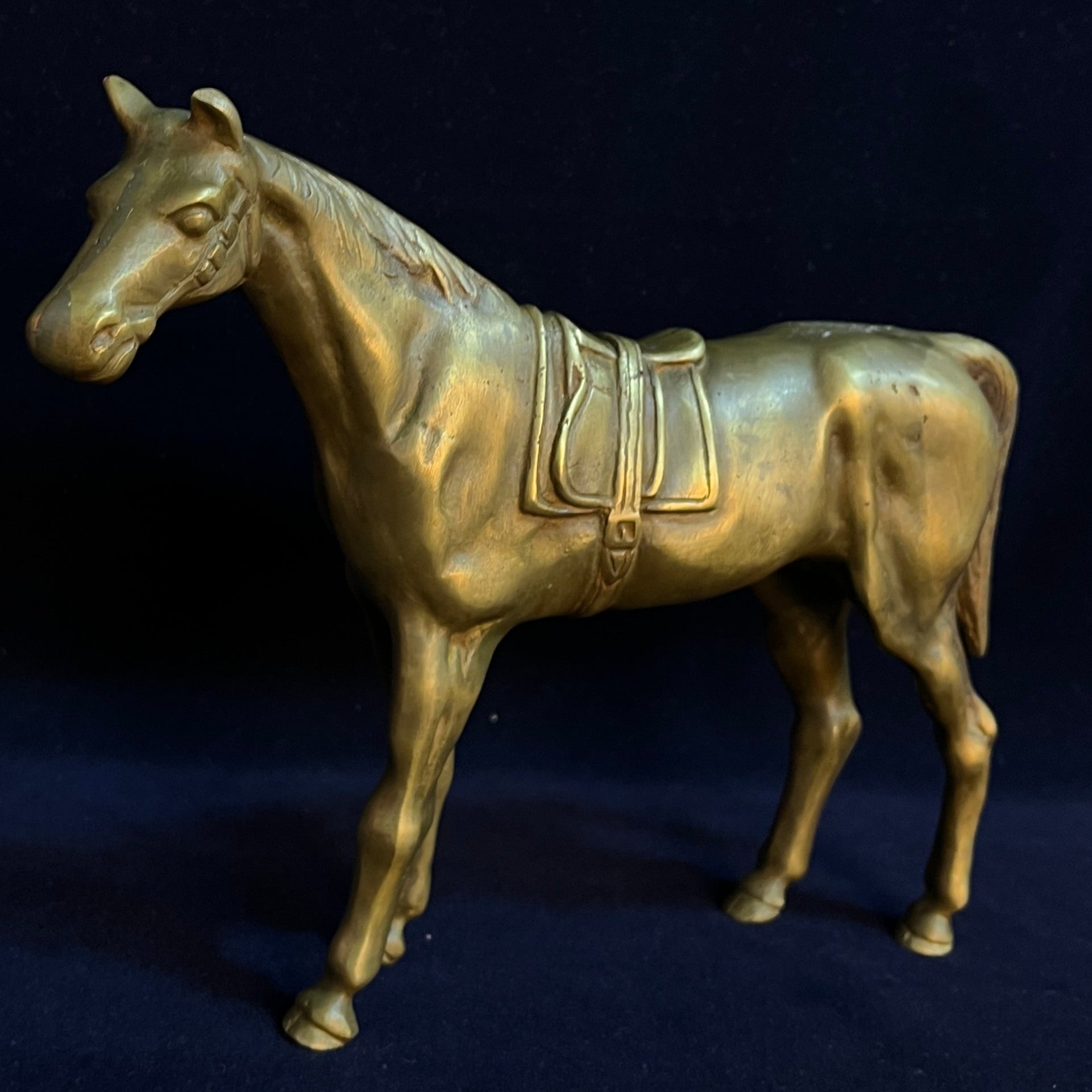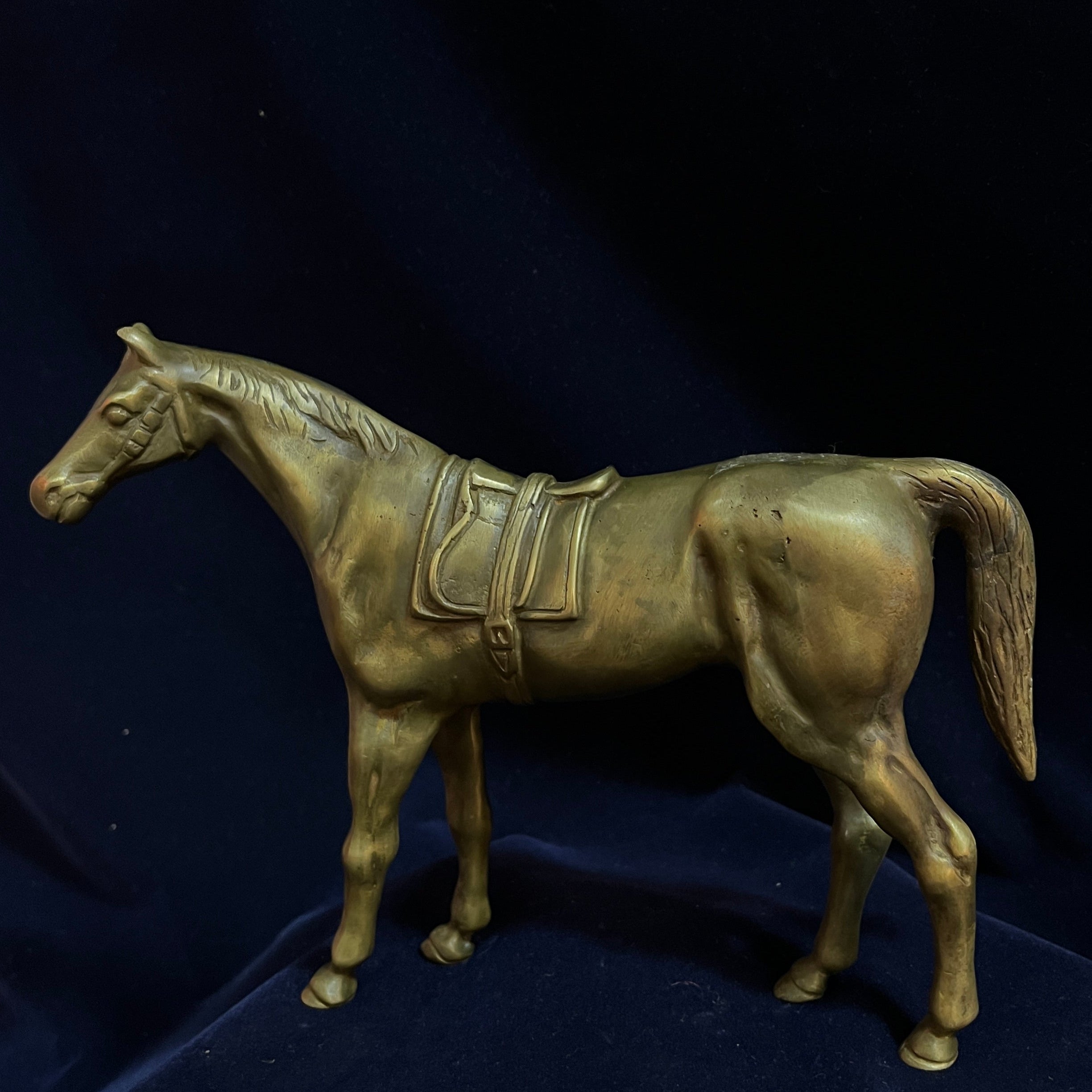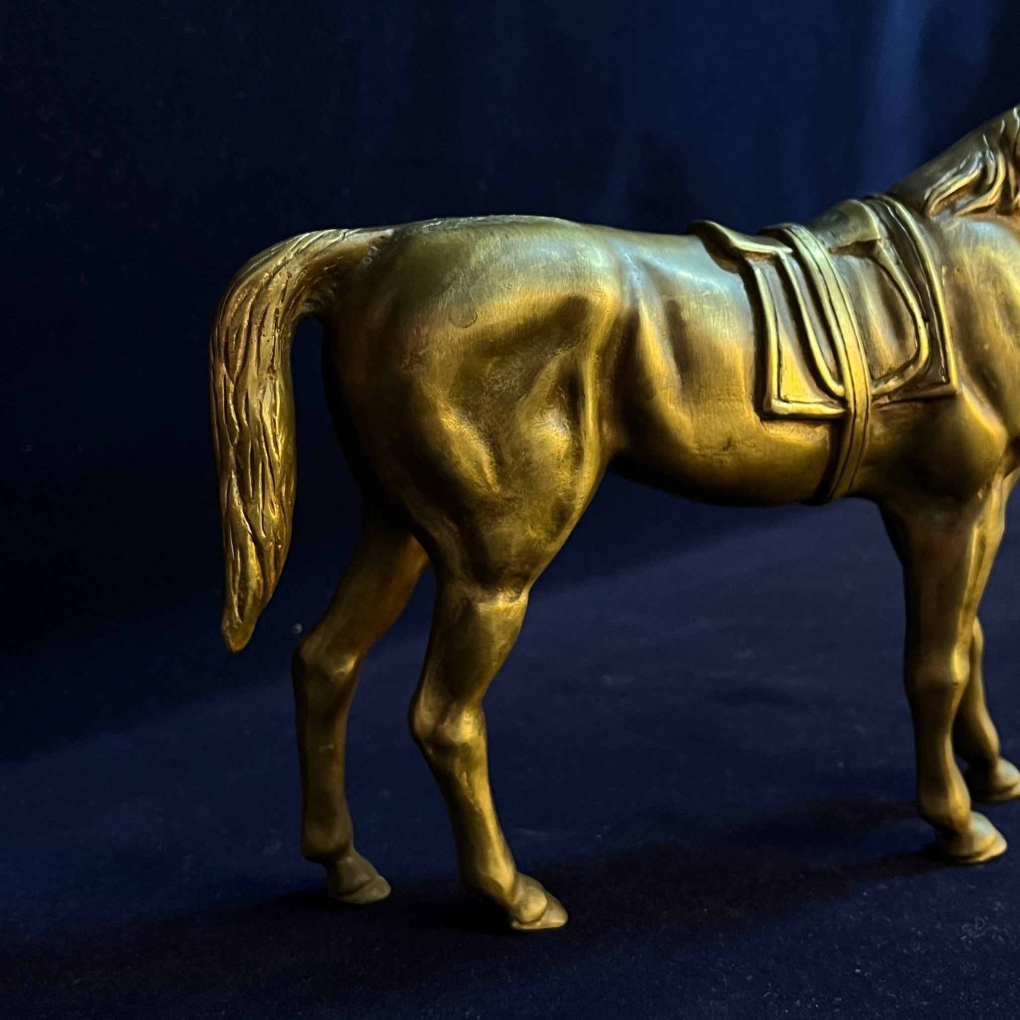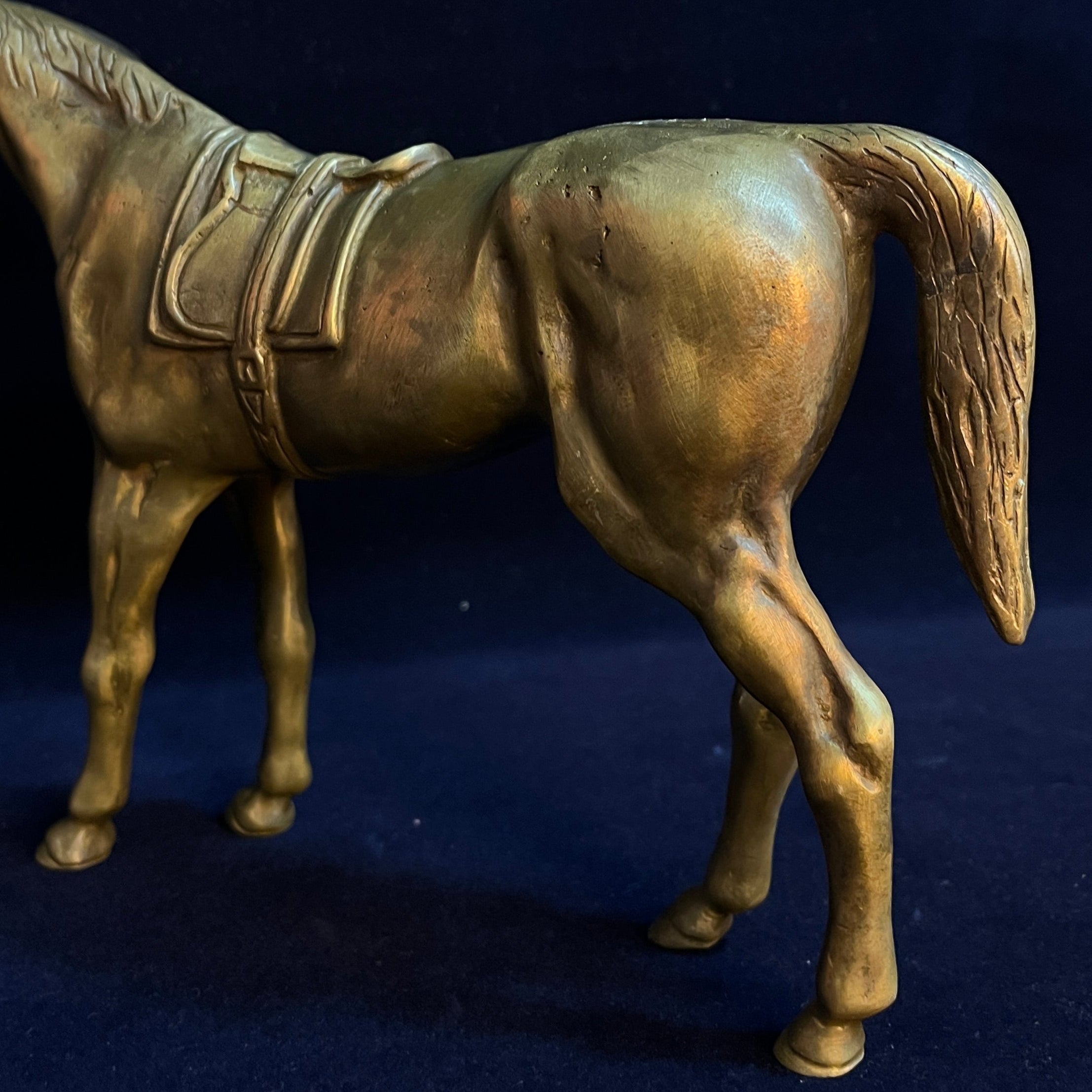 Magnifique pièce décorative d'origine française, en bronze, représentant un cheval majestueux. Les détails délicats et précis de son anatomie, ainsi que ceux de la selle et des autres éléments ornementaux, sont remarquables.