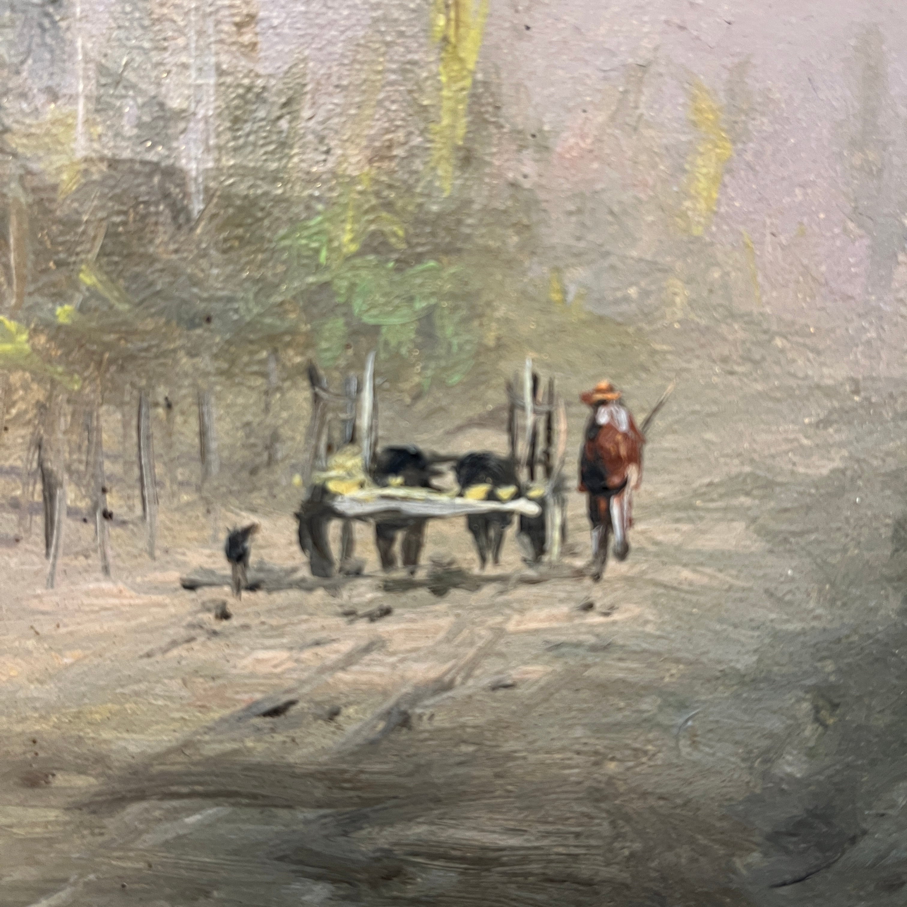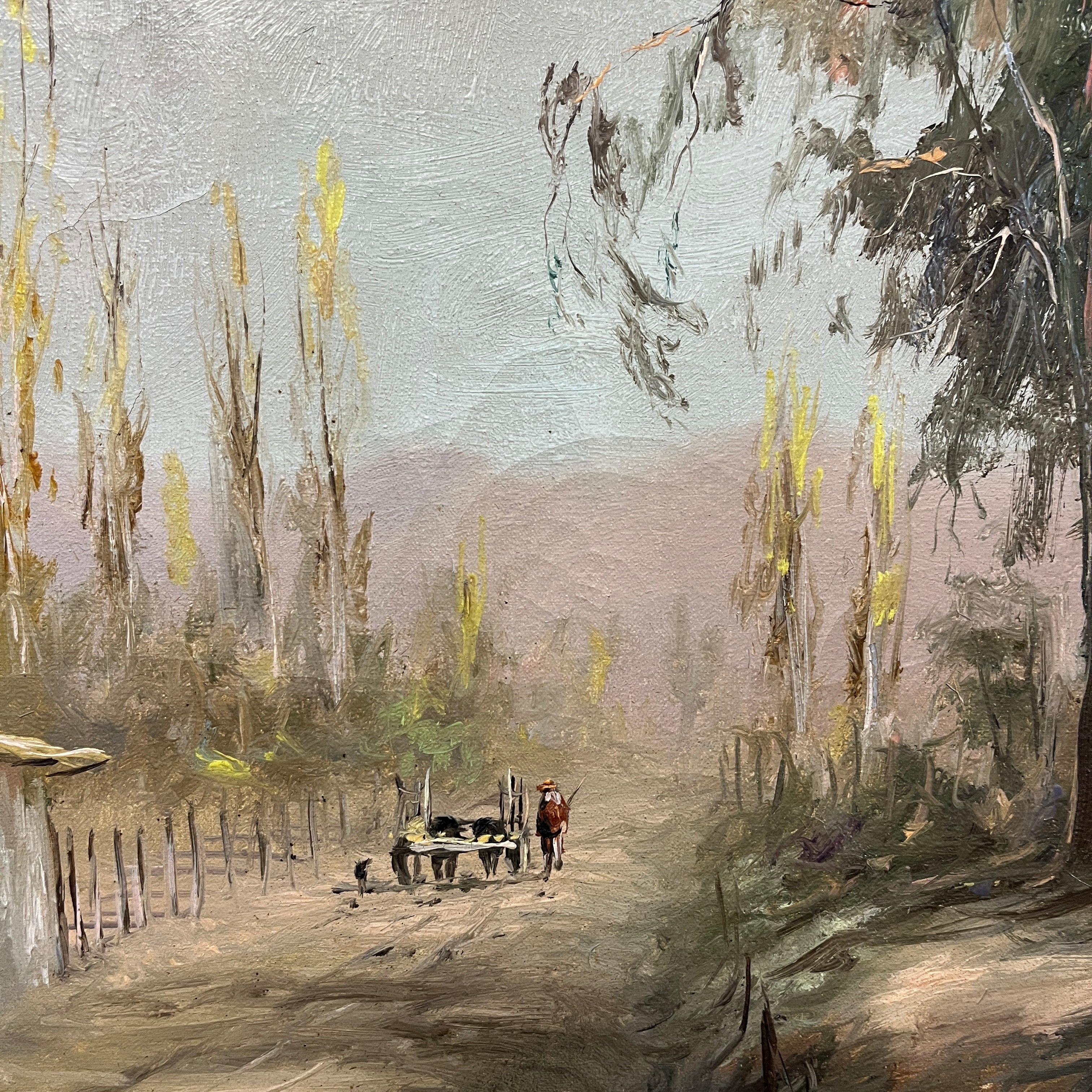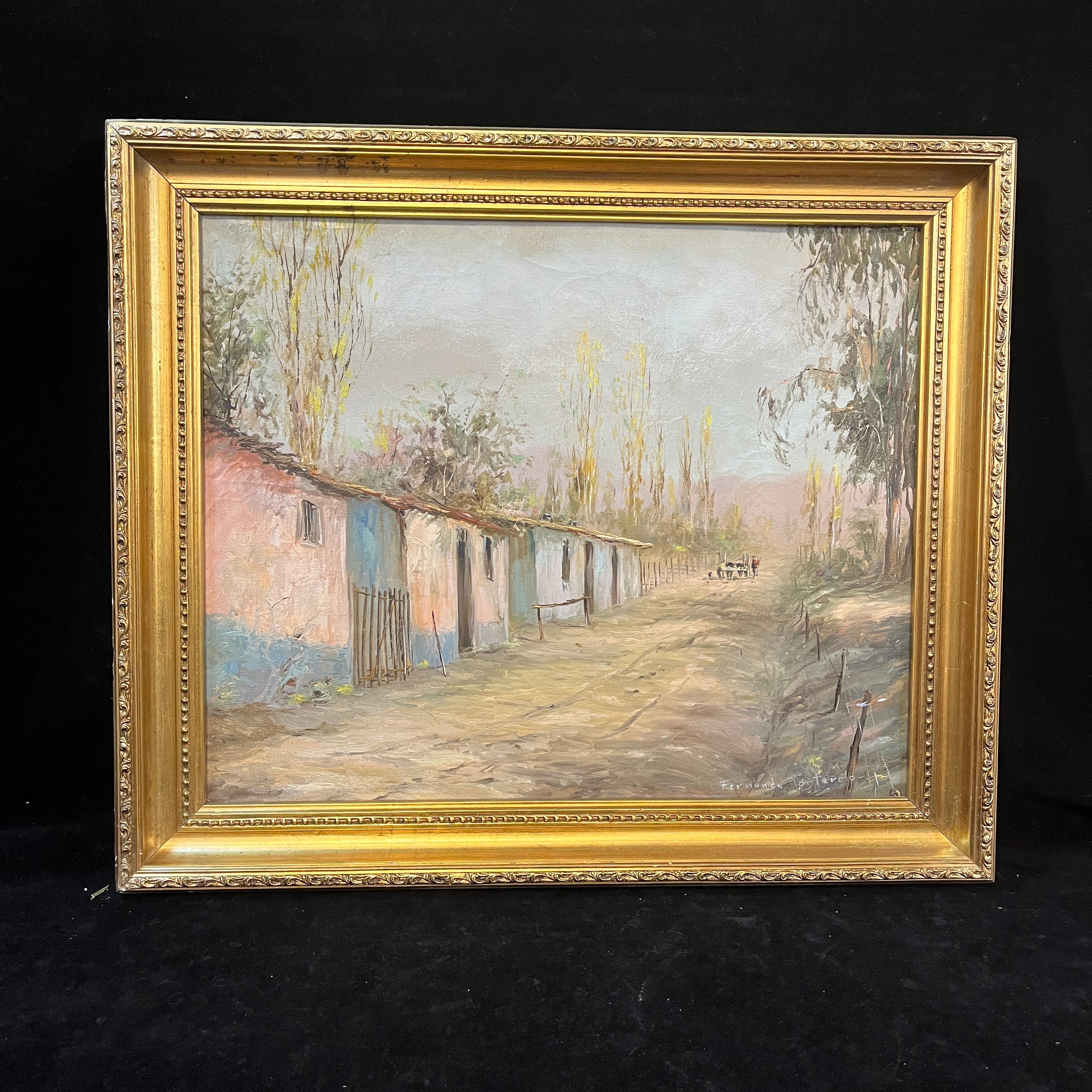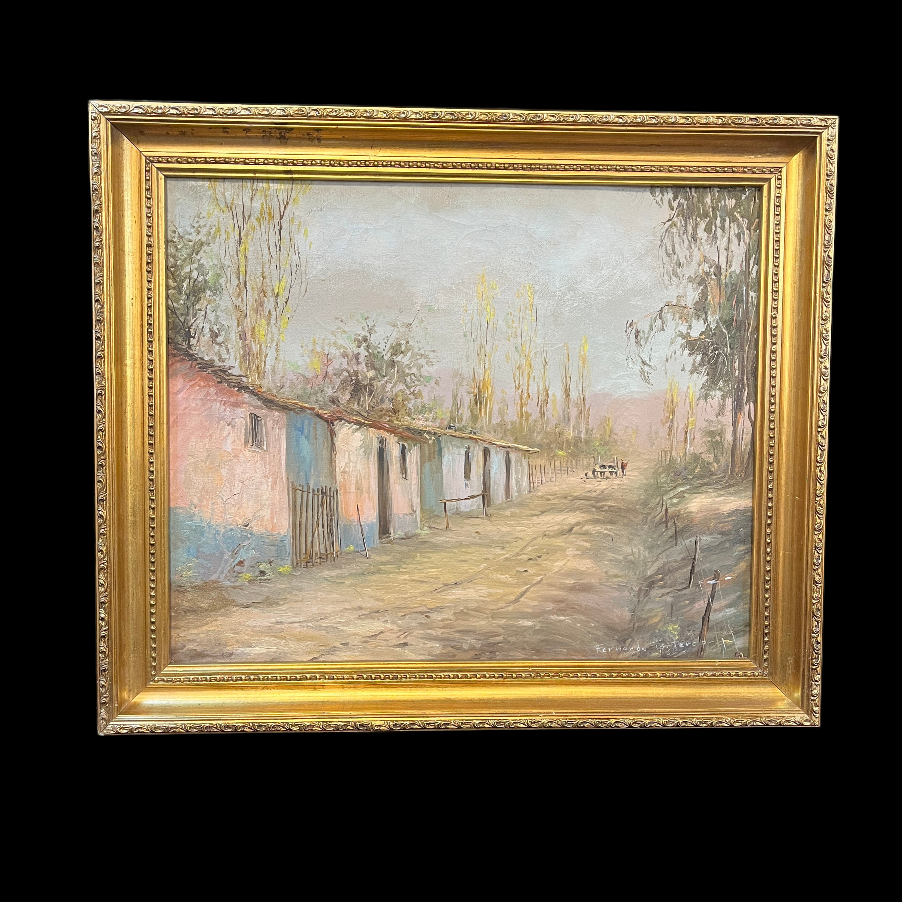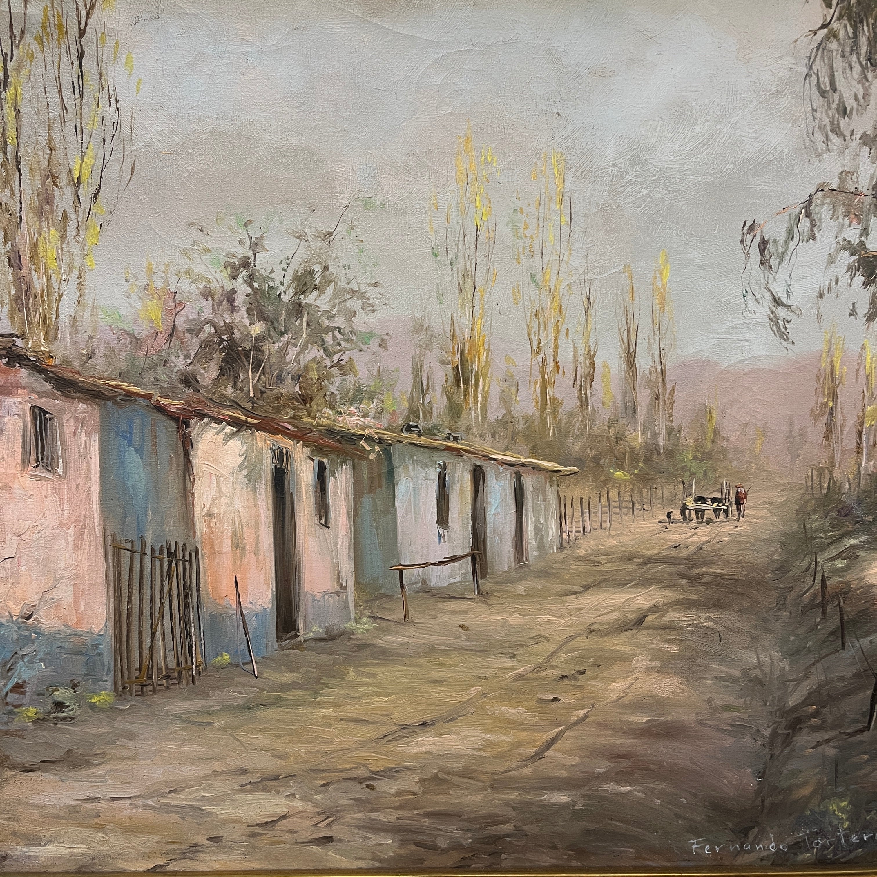 Bella pintura del talentoso pintor chileno Fernando Tortorelo, que refleja la serenidad de la vida rural. Podemos ver a un campesino a lo lejos llevando una carreta arriada por lo que parecen ser vacas. Es una escena que entrega personajes tradicionales acompañado de un entorno campestre con coloridas casas de adobe en la orilla y altos árboles. Es un cuadro que entrega silencio y pausa