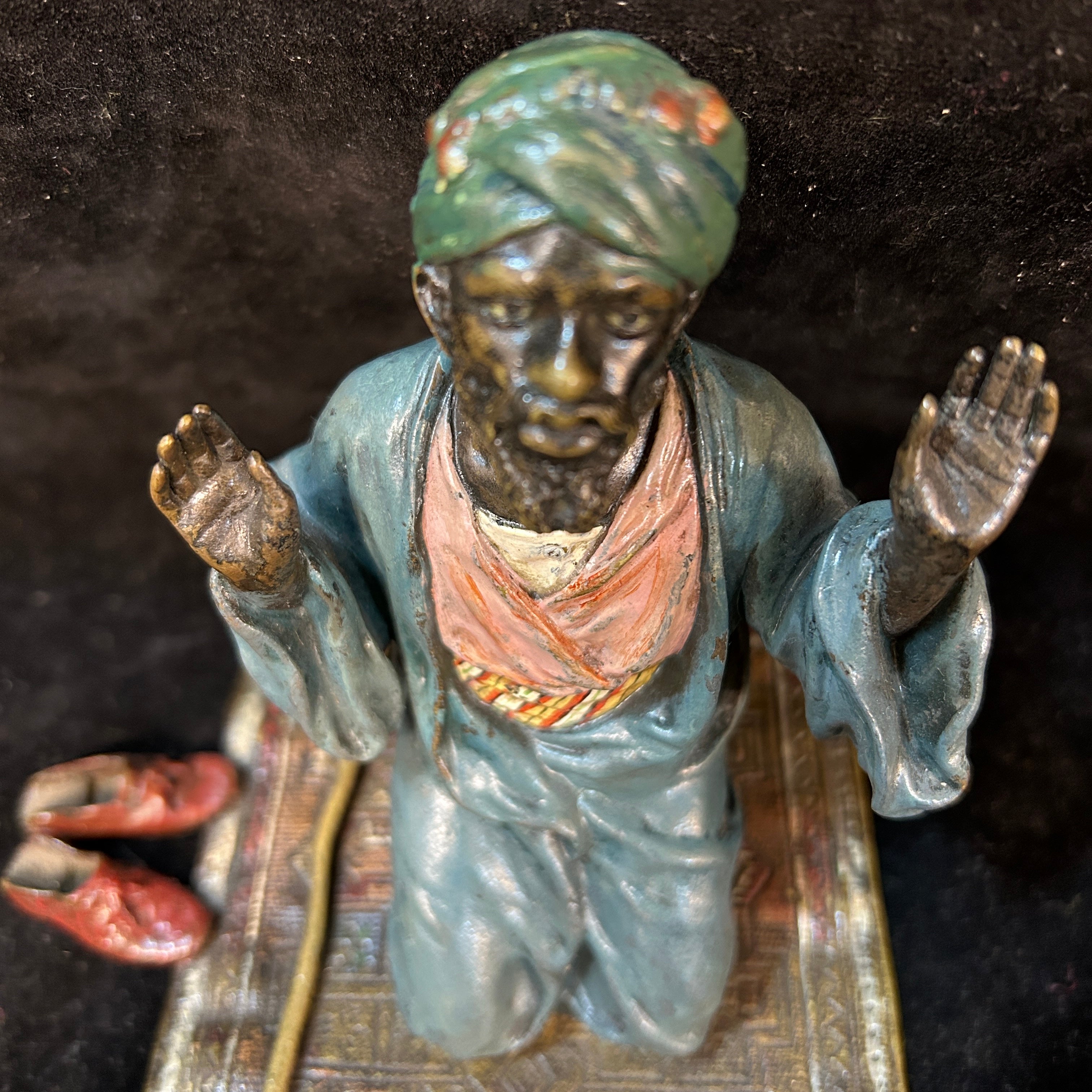 Figura de bronce del reconocido escultor austriaco Franz Bergamnn, representando a un hombre sobre su alfombra, conocida como sajjada en el mundo musulmán, orando. El hombre, que se ha sacado los zapatos y dejado su bastón de lado, está inmortalizado en un gesto de adoración, con su mirada hacia el cielo. Es una figura que va en línea con las temáticas reconocibles del artista, que puso su foco en escenas y gestos de oriente medio y África. En su parte inferior se puede ver un sello o marca de fundición con la letra B, sello distintivo de las creaciones en bronce de Bergmann.