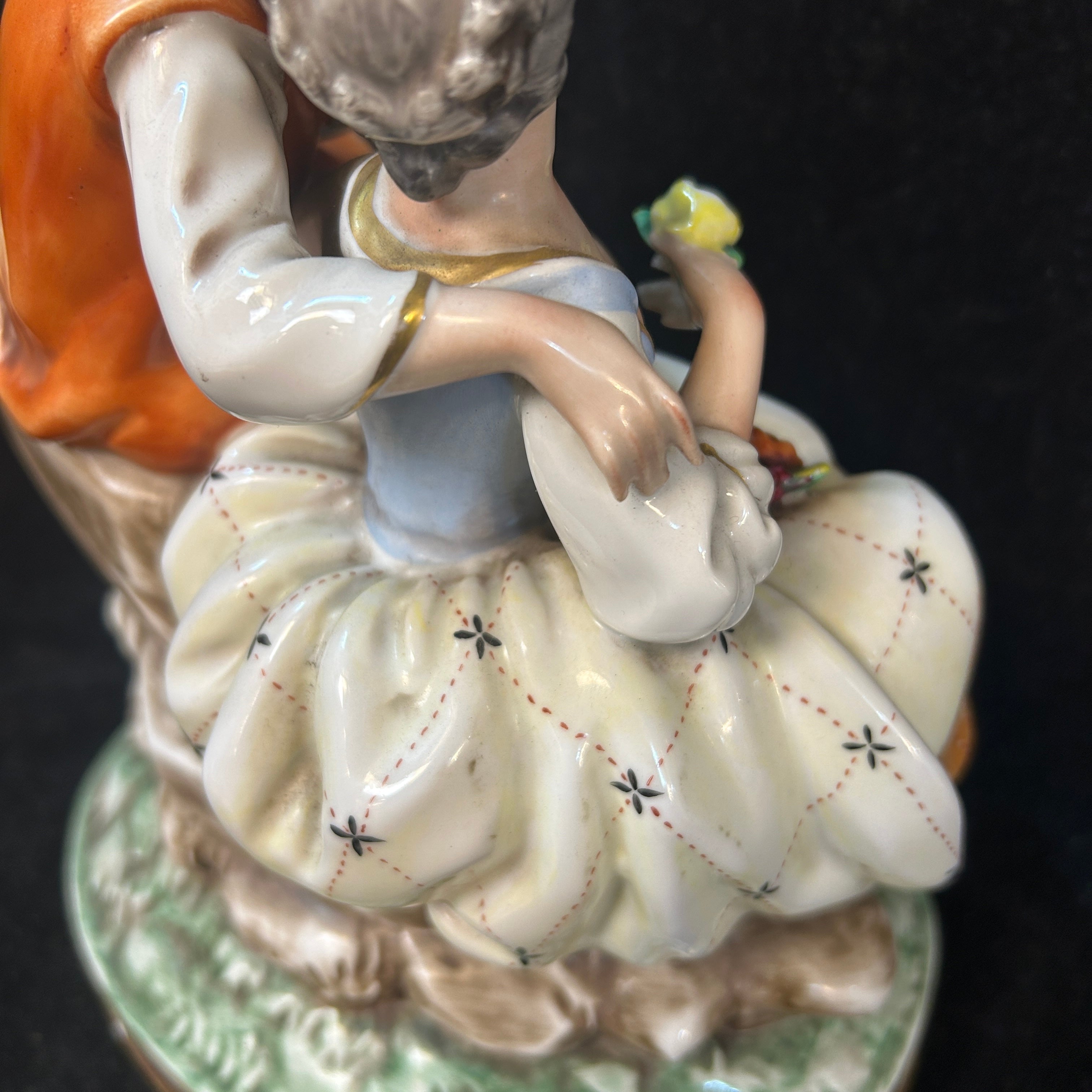 Bella figura de porcelana alemana Bavaria, pintada a mano, representando a una pareja sobre un músico cortejando a una mujer, mientras ella ordena su canasta de flores. Preponderan los tonos anaranjados de sus vestimentas, llena de textura y patrones pintados con fina dedicación.