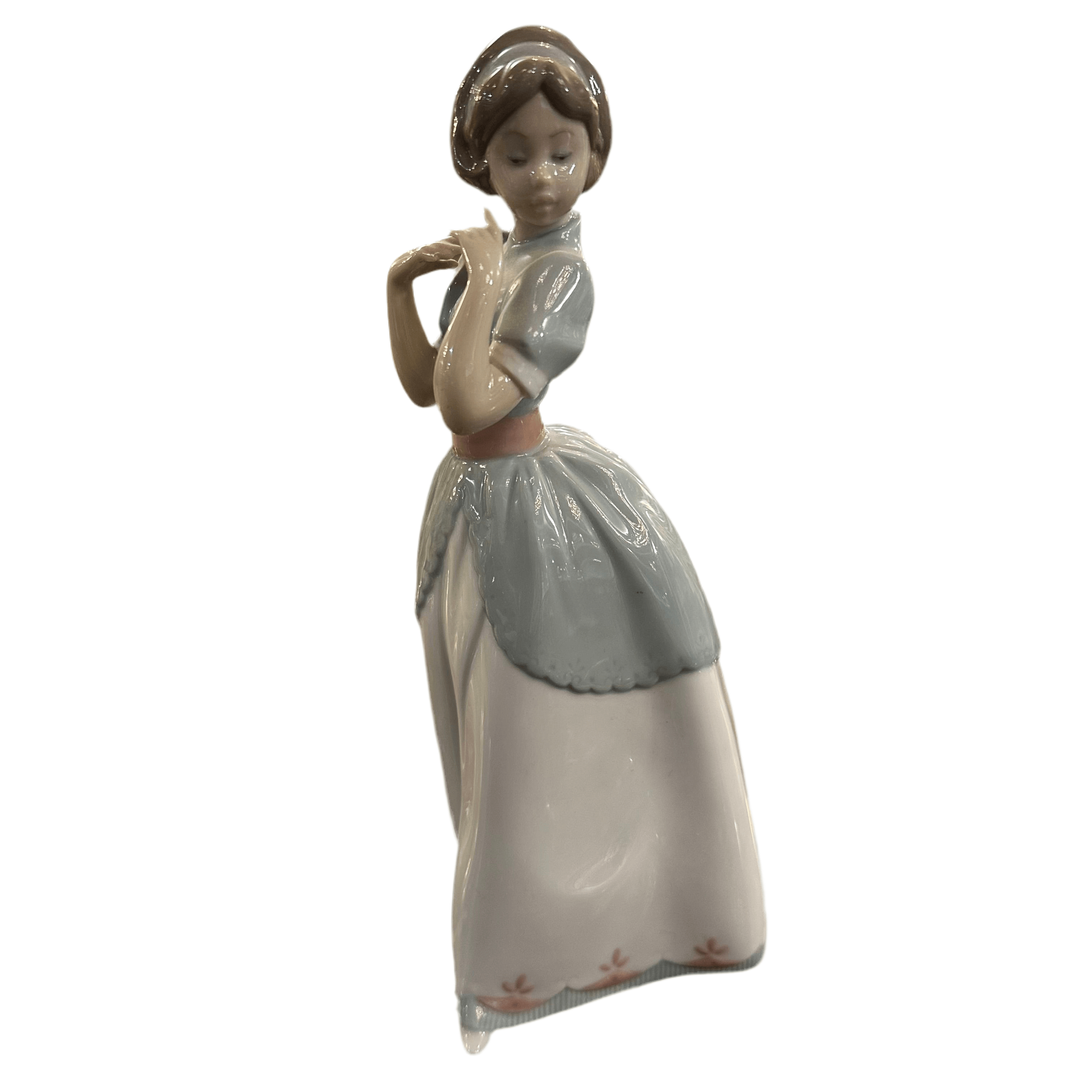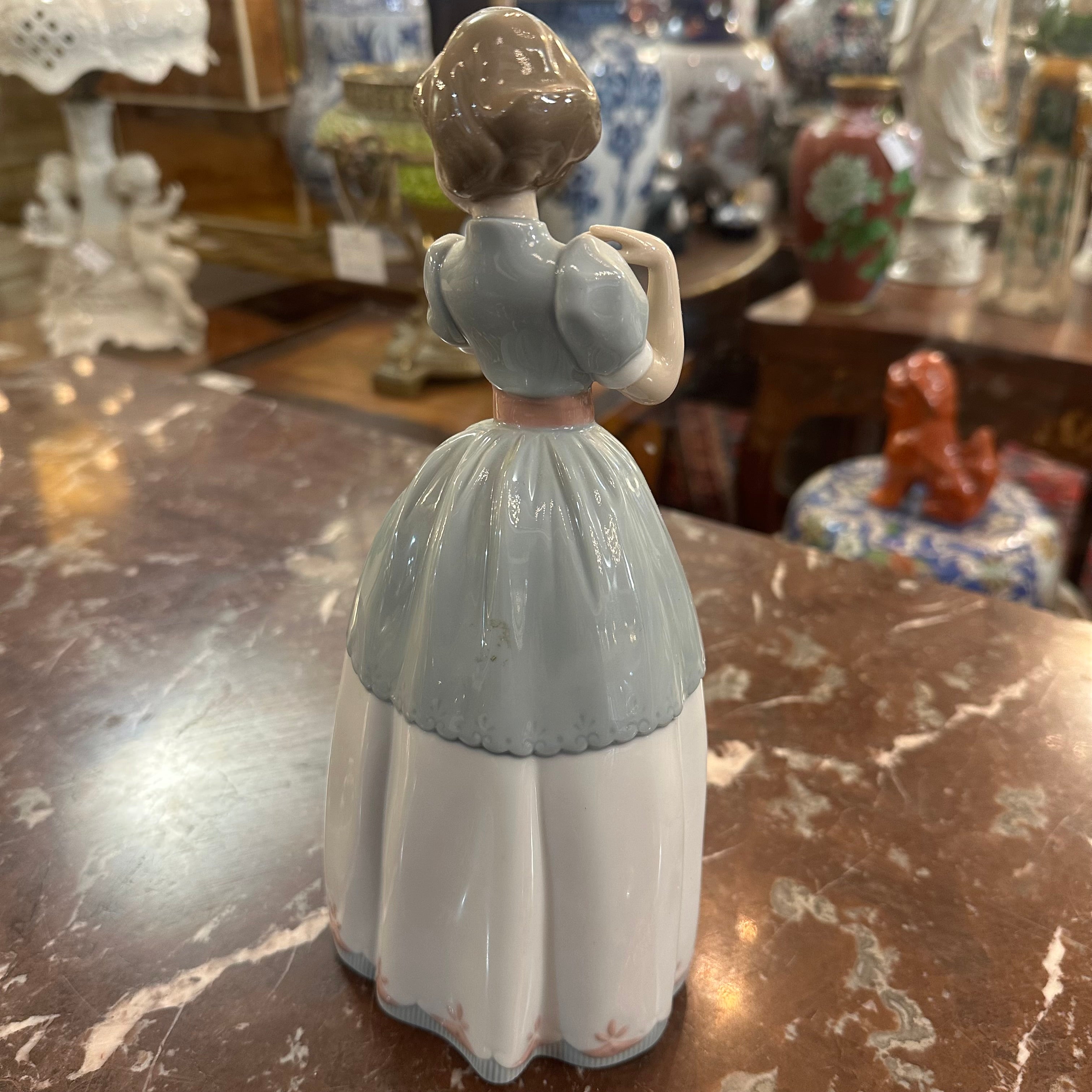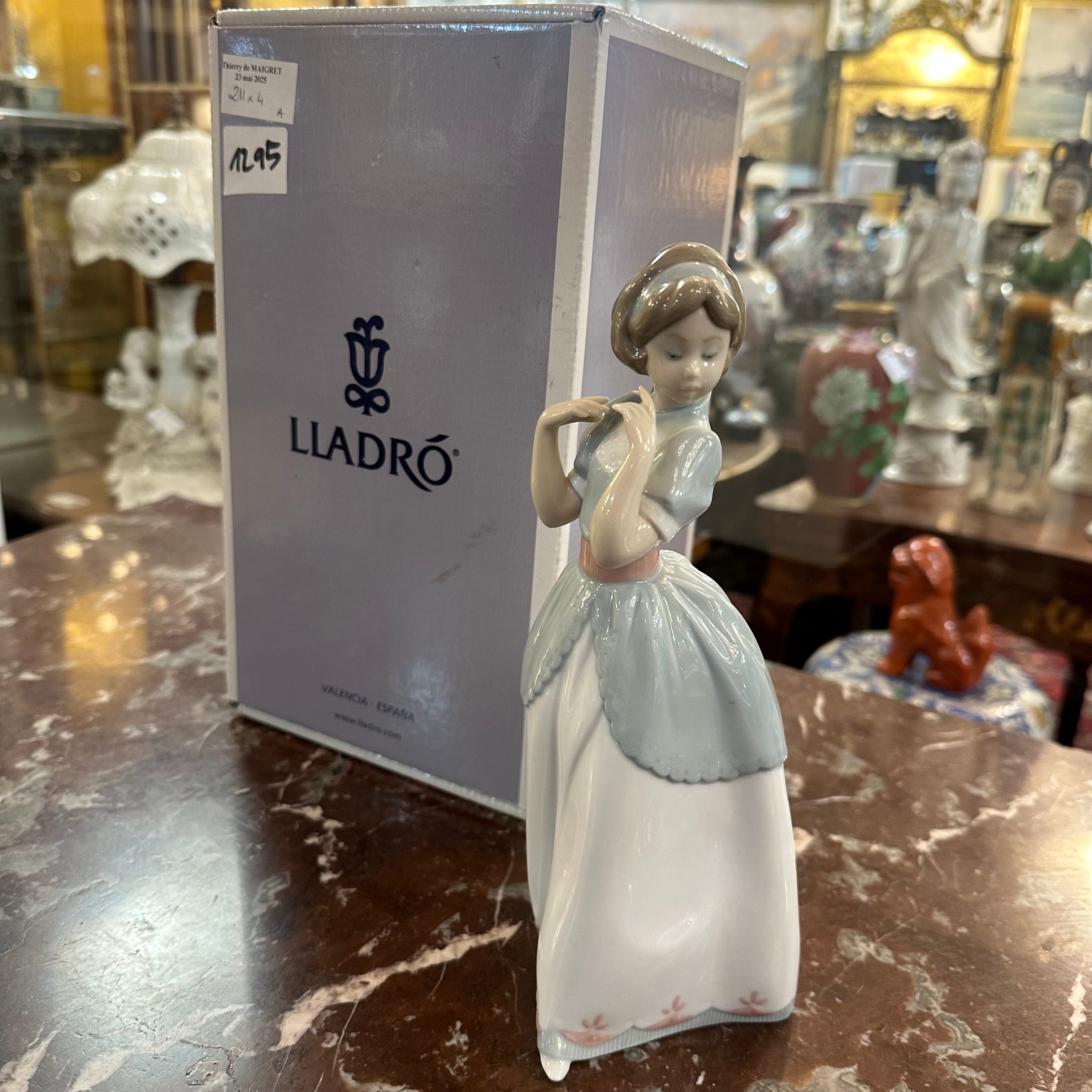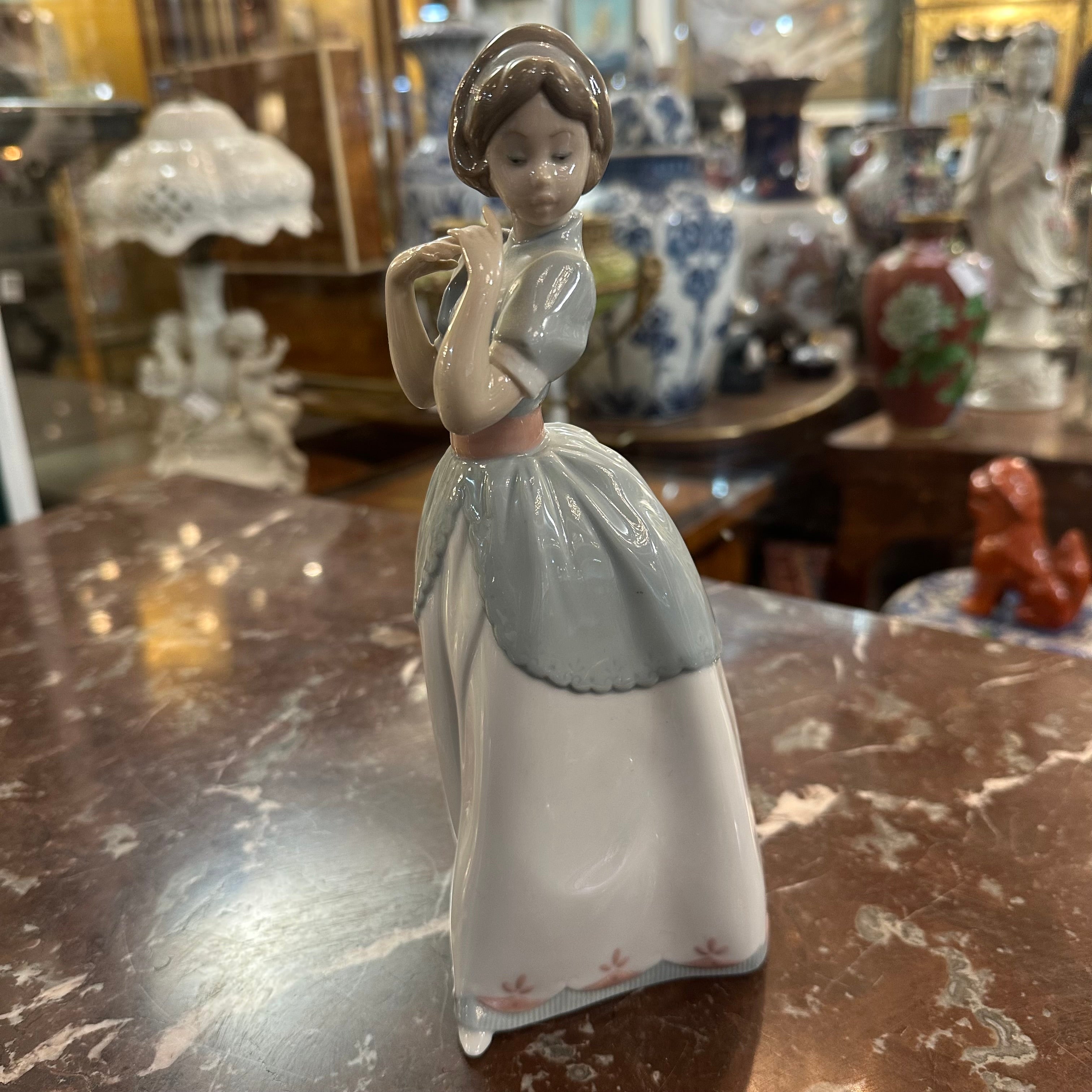 Magnifique figurine en porcelaine de la célèbre marque espagnole Lladró. Elle représente une jeune femme à l'expression délicate de surprise ou de doute, vêtue d'une élégante robe aux tons blanc et bleu clair rehaussée de touches de rose. La figurine est livrée dans sa boîte d'origine.