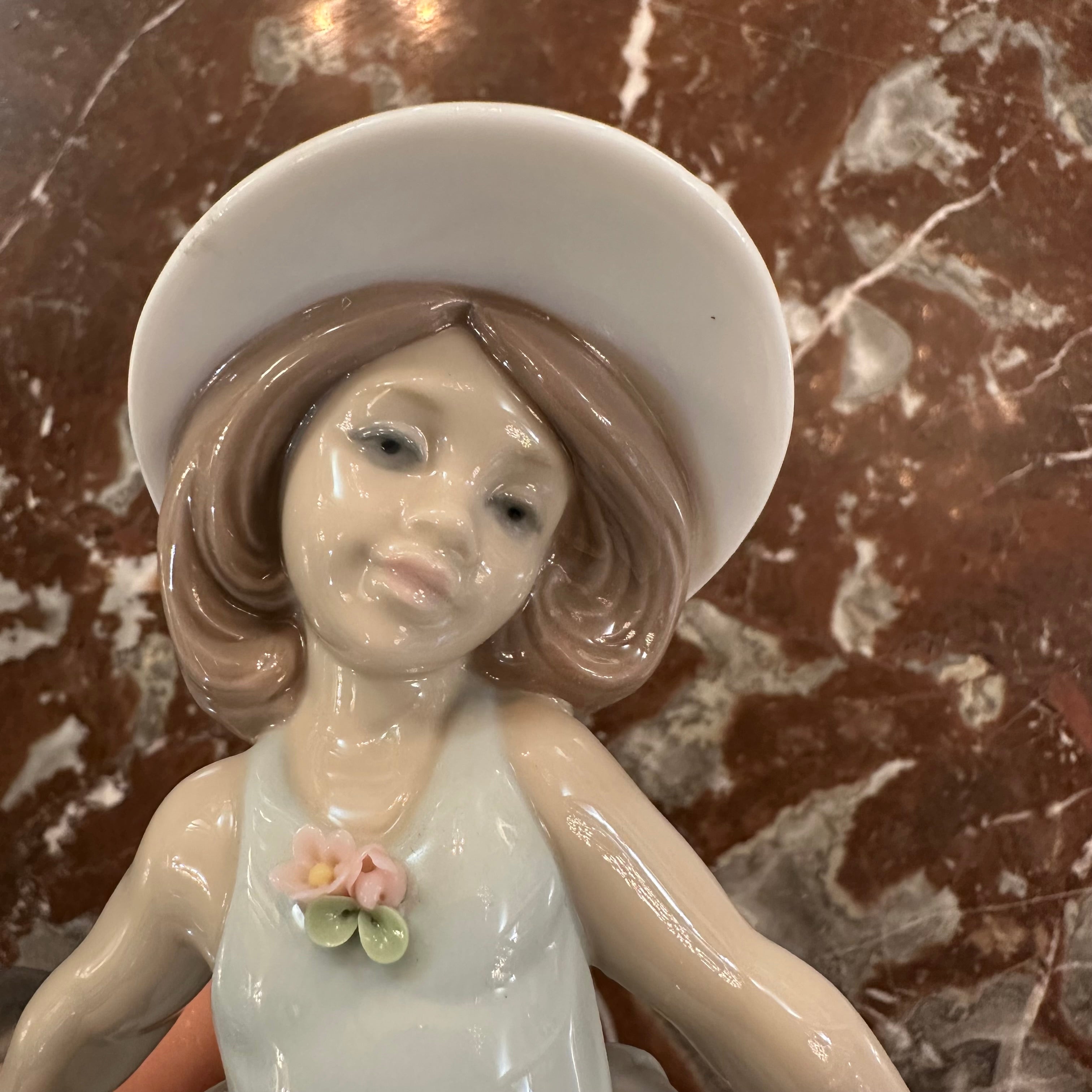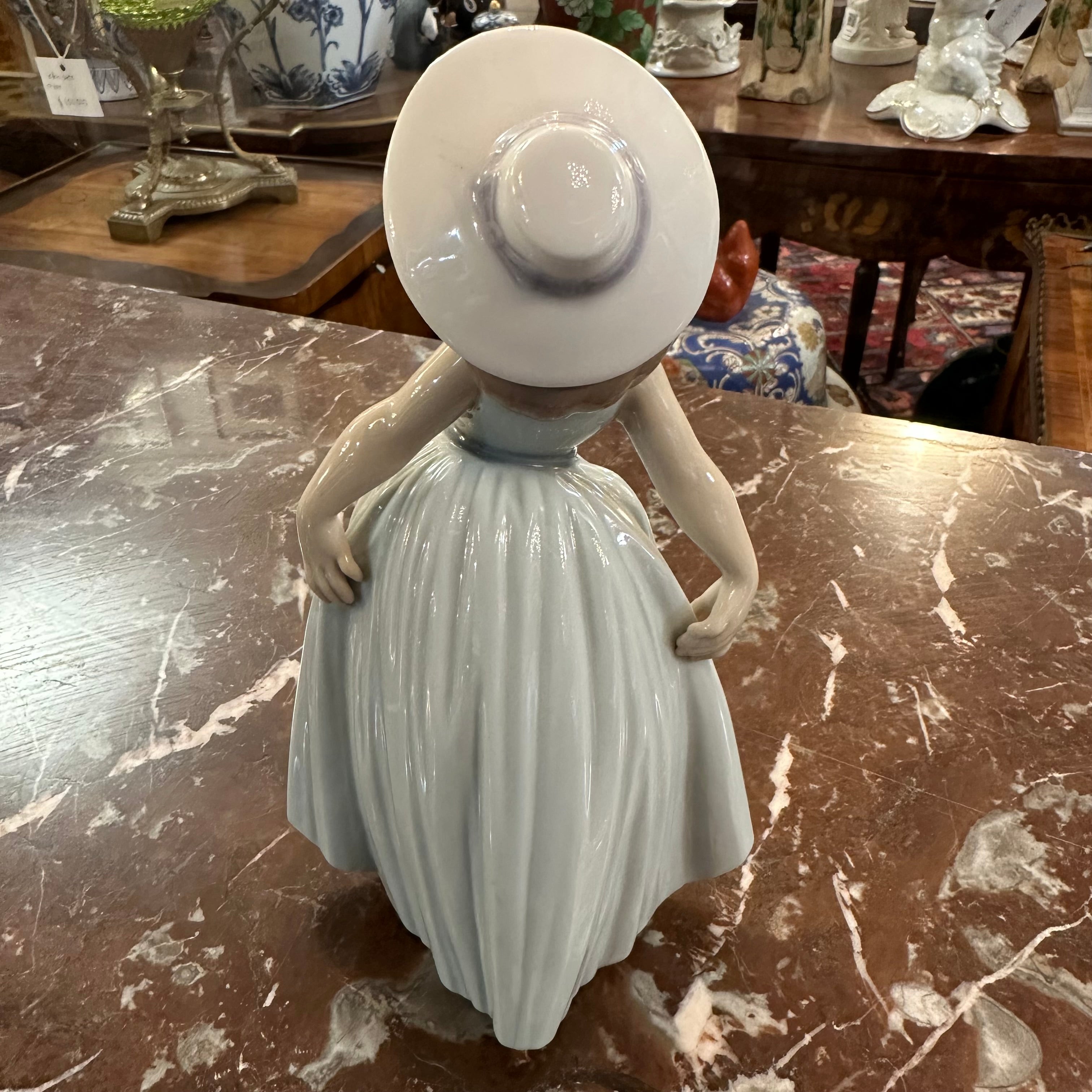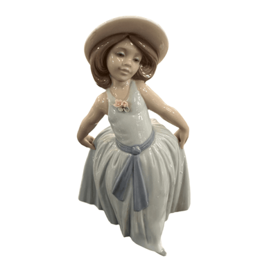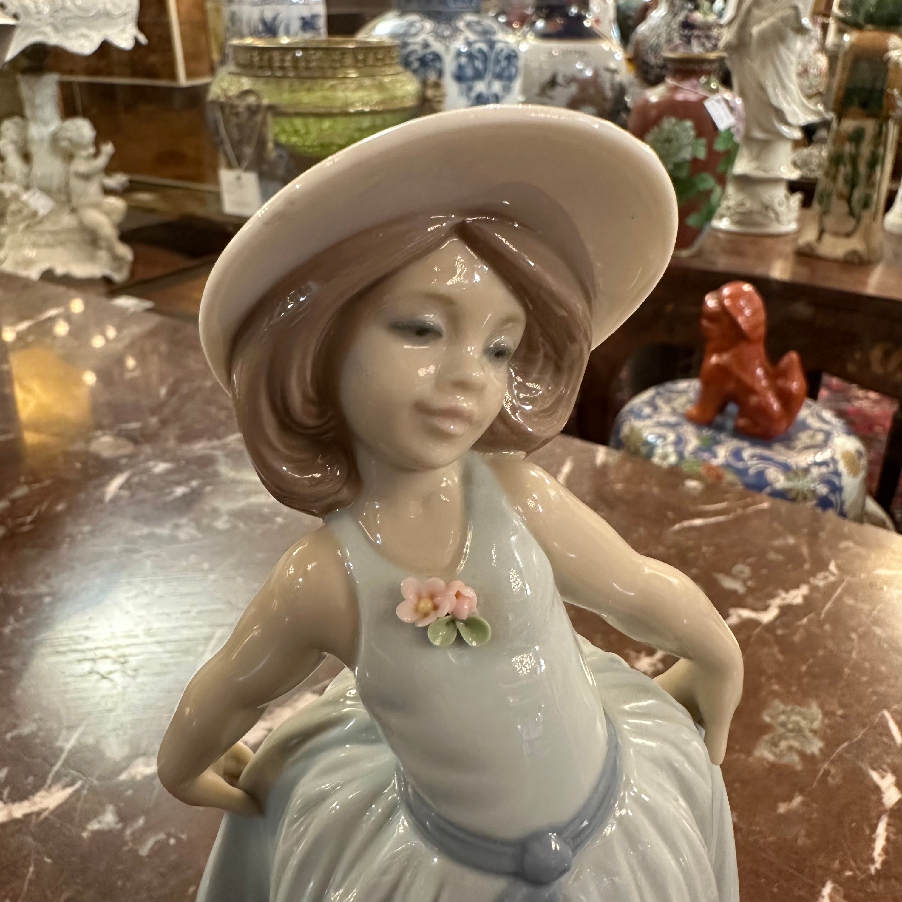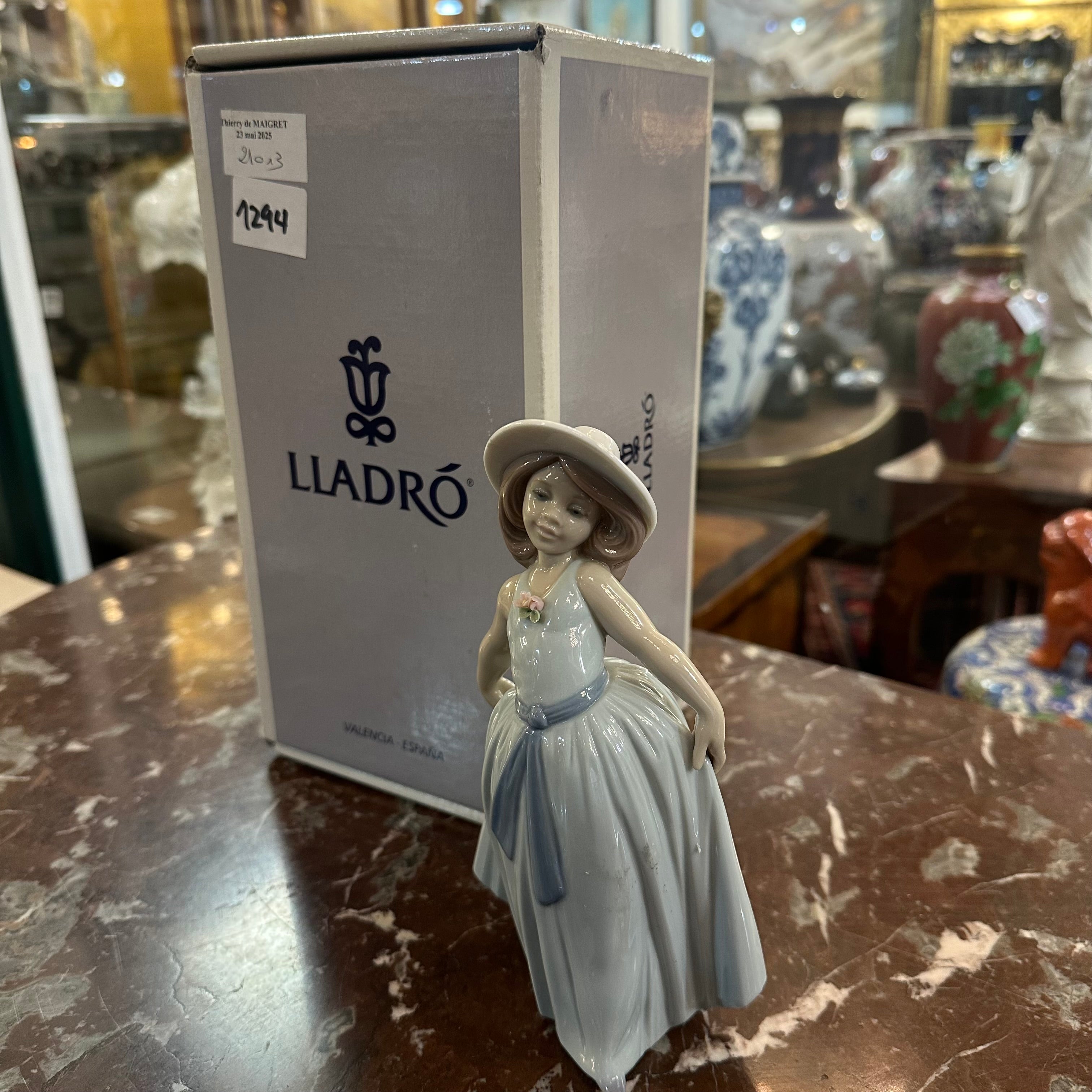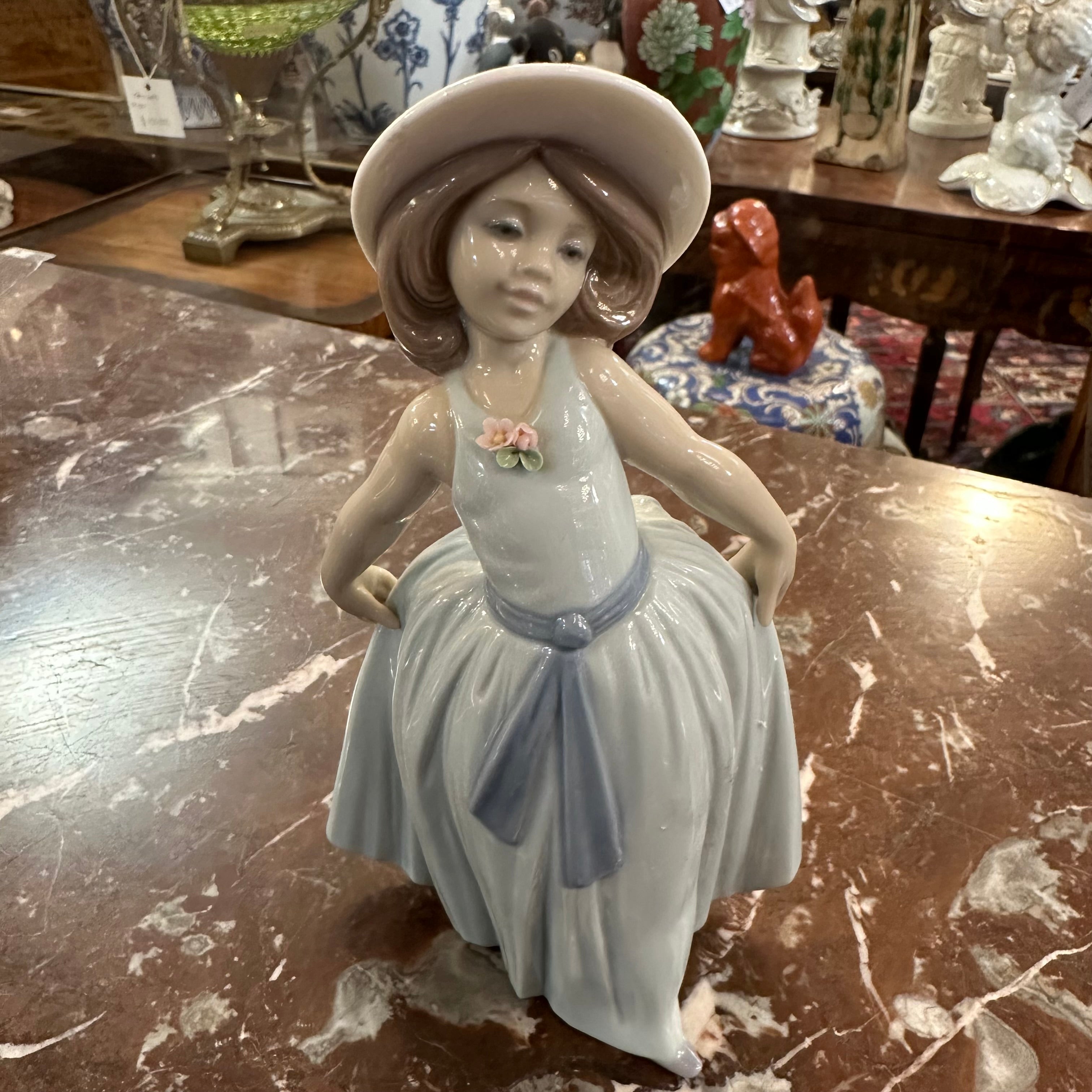 Figurine en porcelaine de la célèbre marque espagnole Lladró. Elle représente une tendre petite fille vêtue d'une robe et d'un chapeau, faisant un geste de présentation, comme pour exhiber sa nouvelle tenue. La pièce est délicatement représentée et regorge de détails, comme la fleur rose autour de son cou. La figurine est livrée dans sa boîte d'origine.