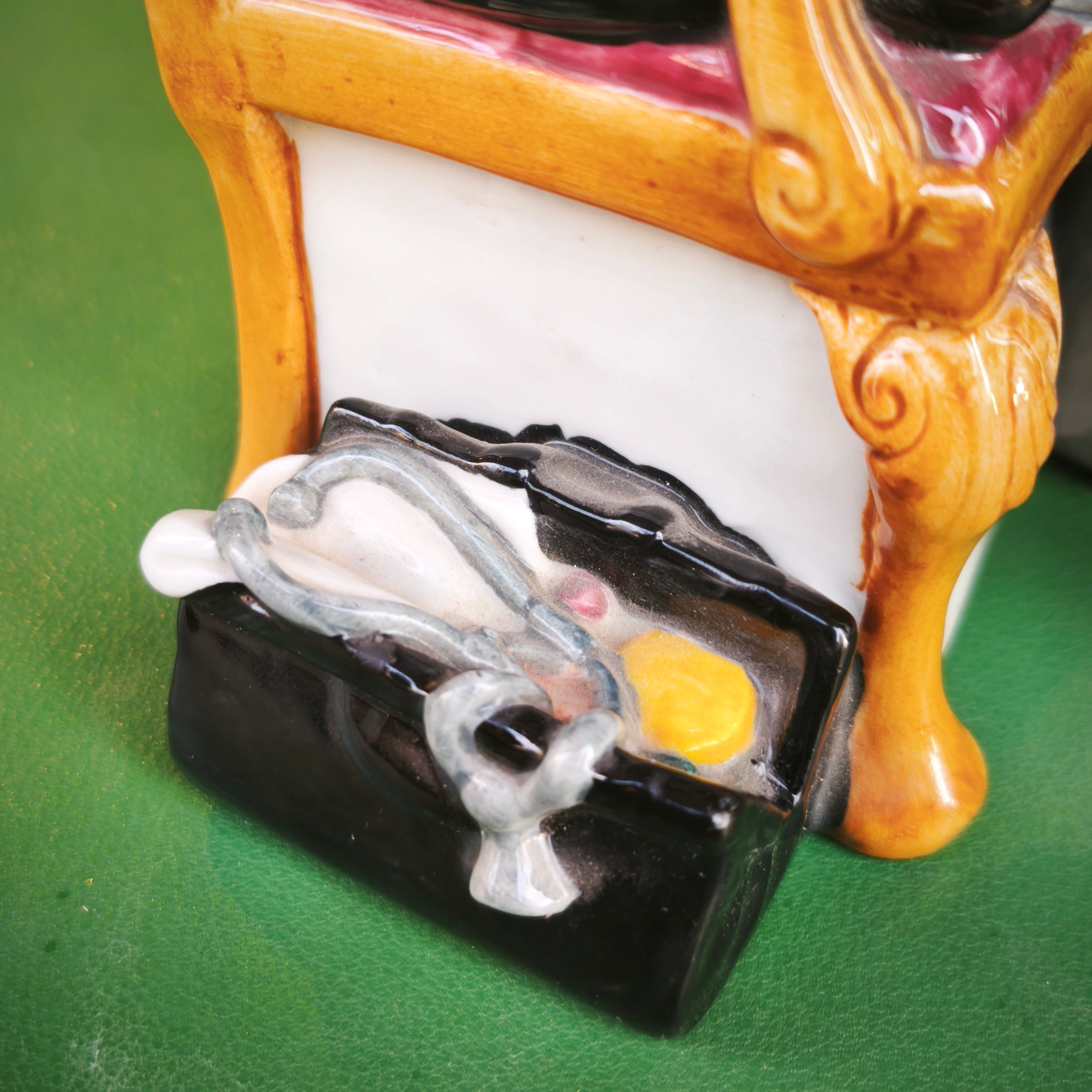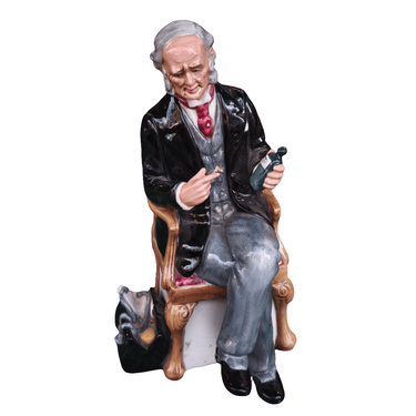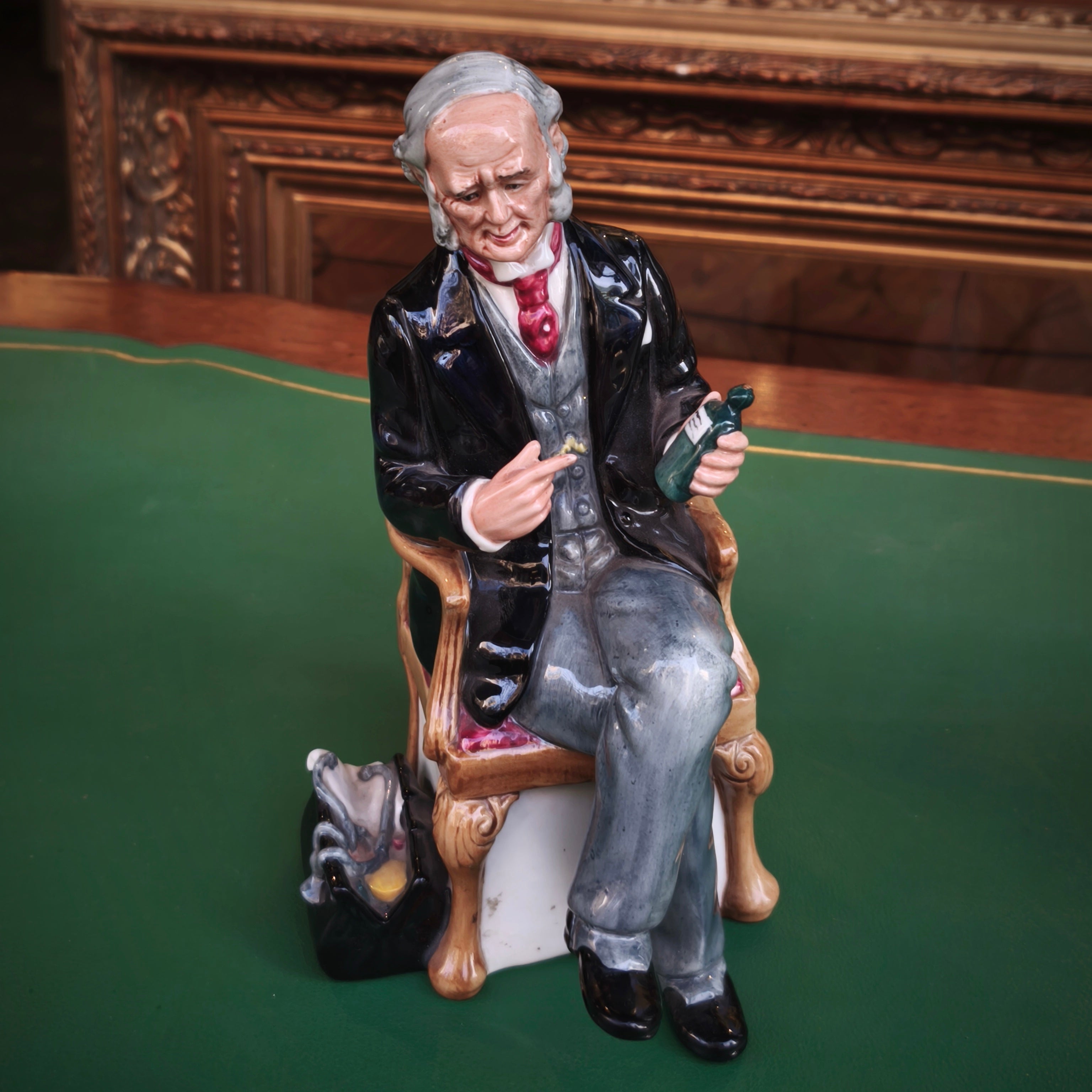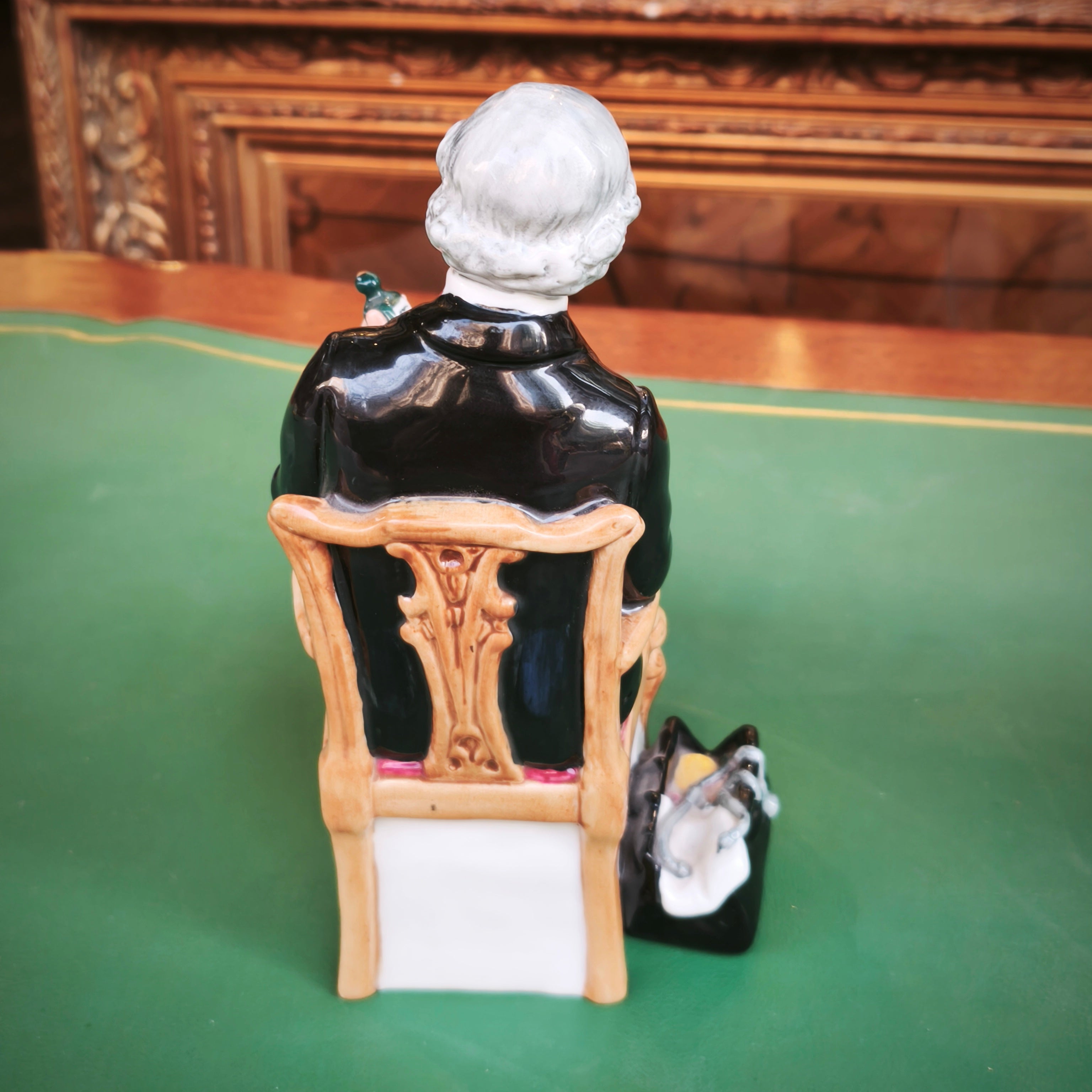 Charmante figurine en porcelaine anglaise de la célèbre marque Royal Doulton, représentant le personnage du Docteur. Elle représente un homme âgé assis, vêtu d'un costume sobre, tenant une bouteille de sirop et portant une mallette sur laquelle se trouvent ses instruments médicaux. Magnifiquement peinte à la main, cette figurine capture tous les traits distinctifs de cette profession avec personnalité et une touche d'humour, conférant au personnage caractère et charme.