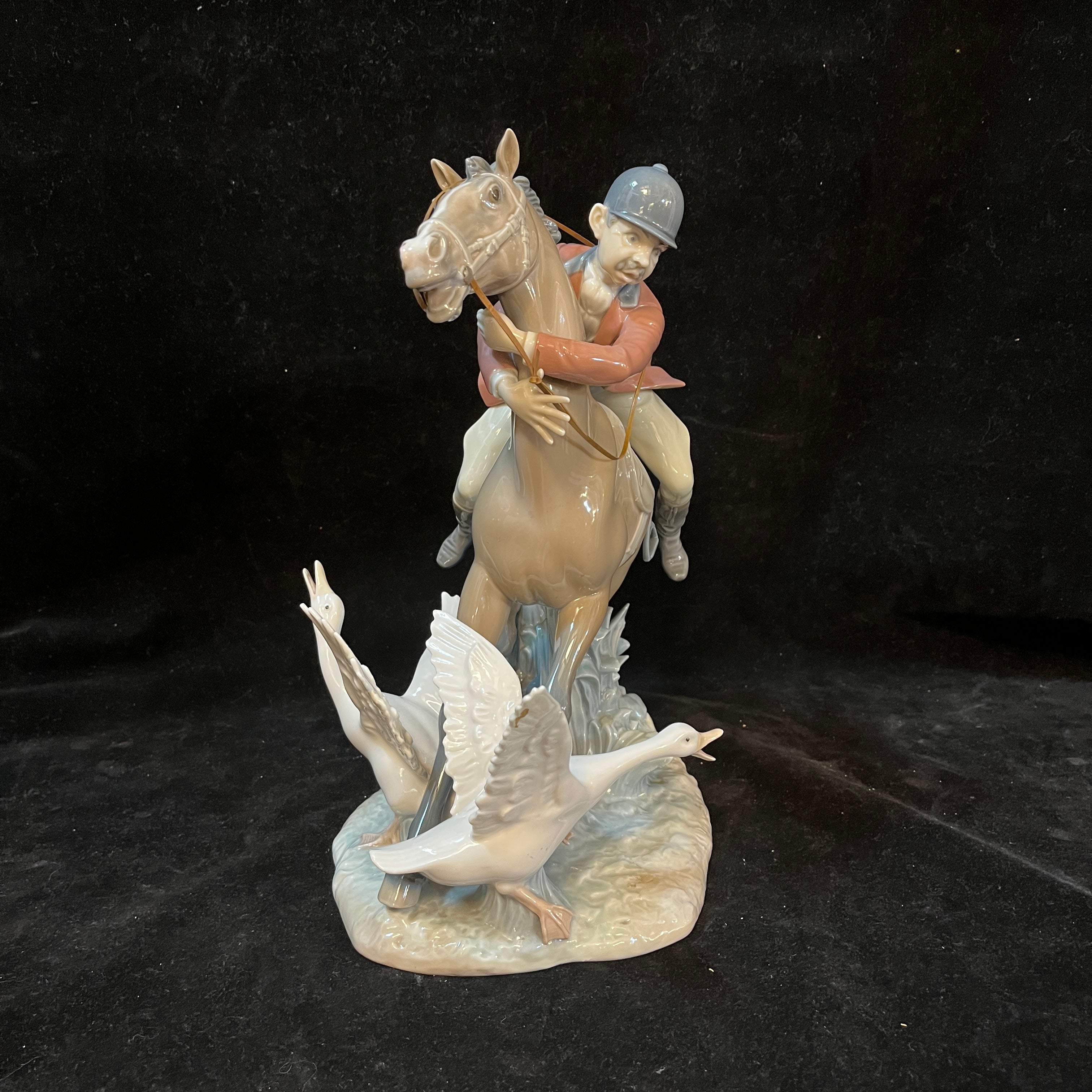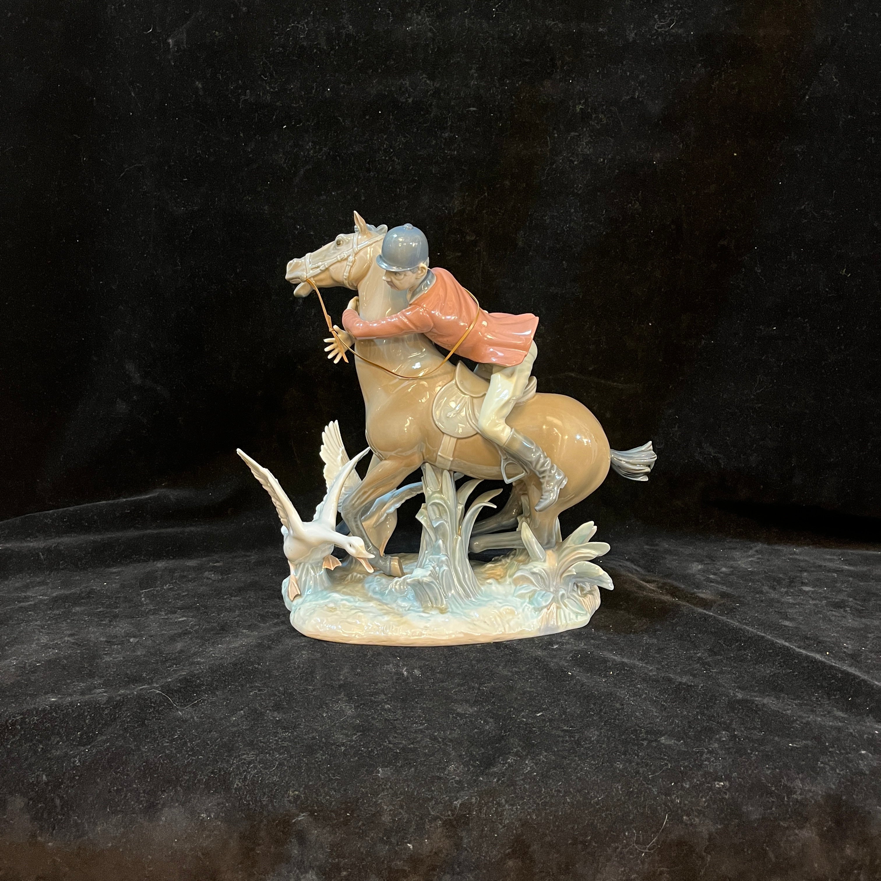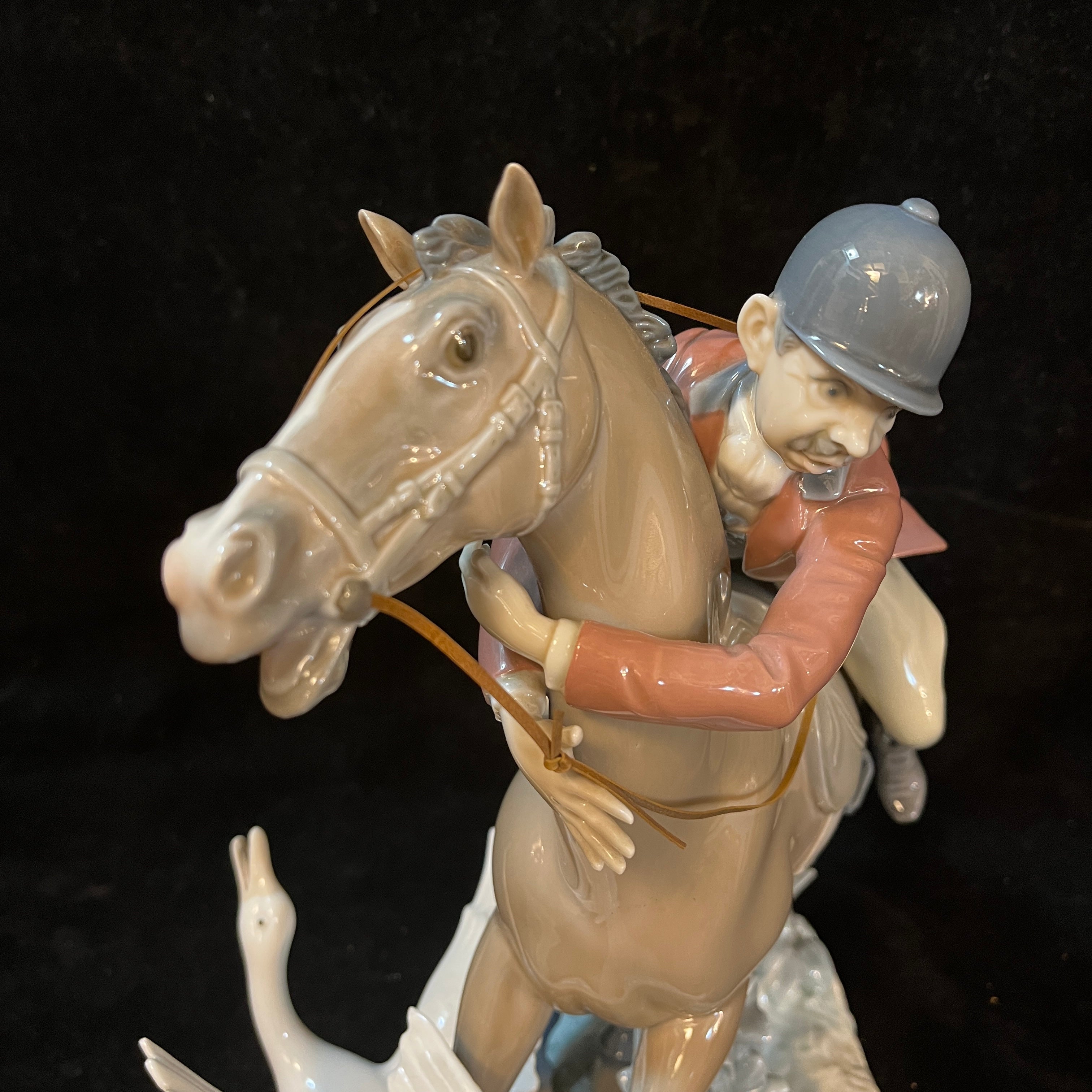 Peculiar figura de porcelana del la tradicional marca española Lladró, que nos presenta una divertida escena de un jinete abrazando del cuello su caballo que esta pisando una pareja de gansos. Se puede apreciar la expresión de miedo en los rostros del jinete y caballo, además de las aves escapando del caballo.