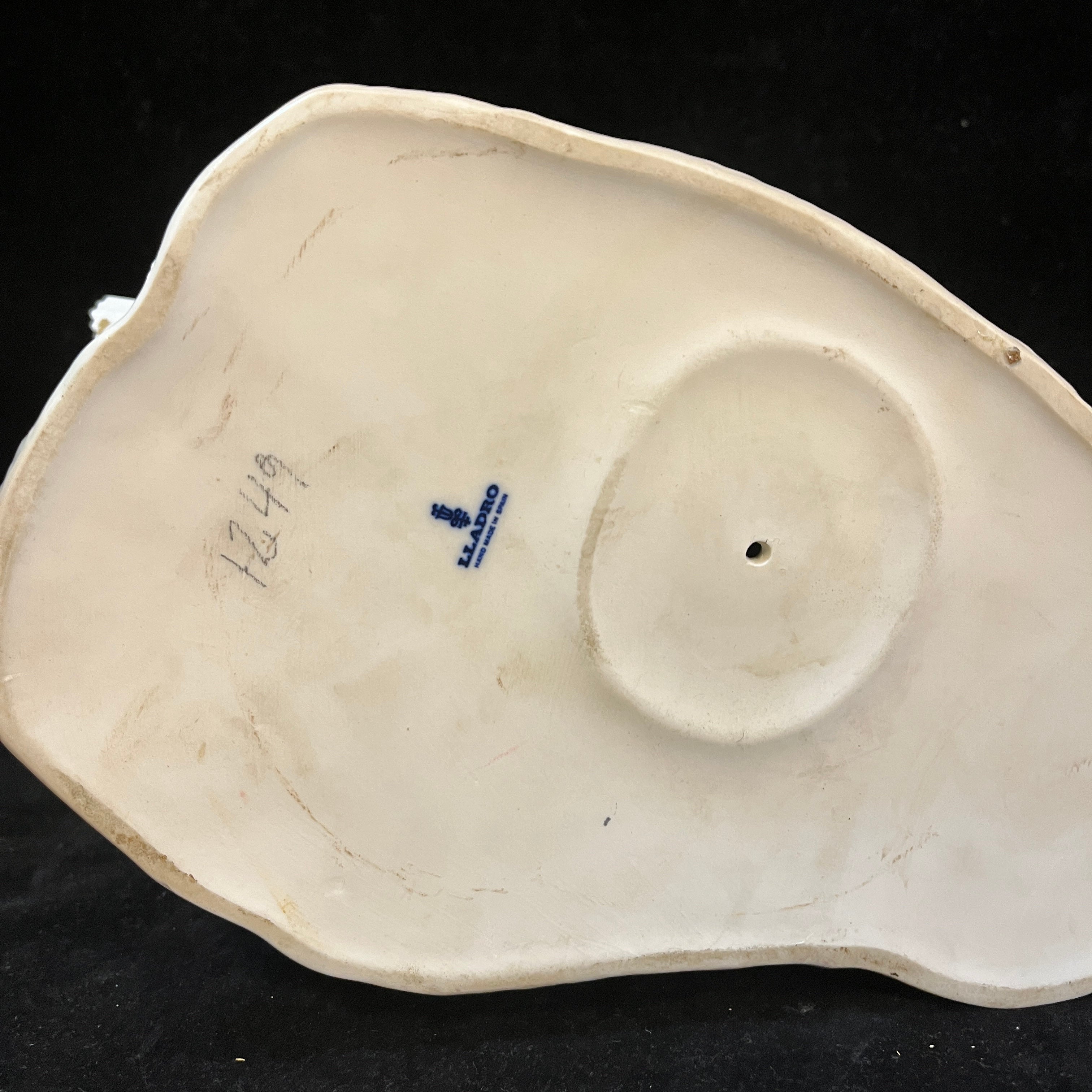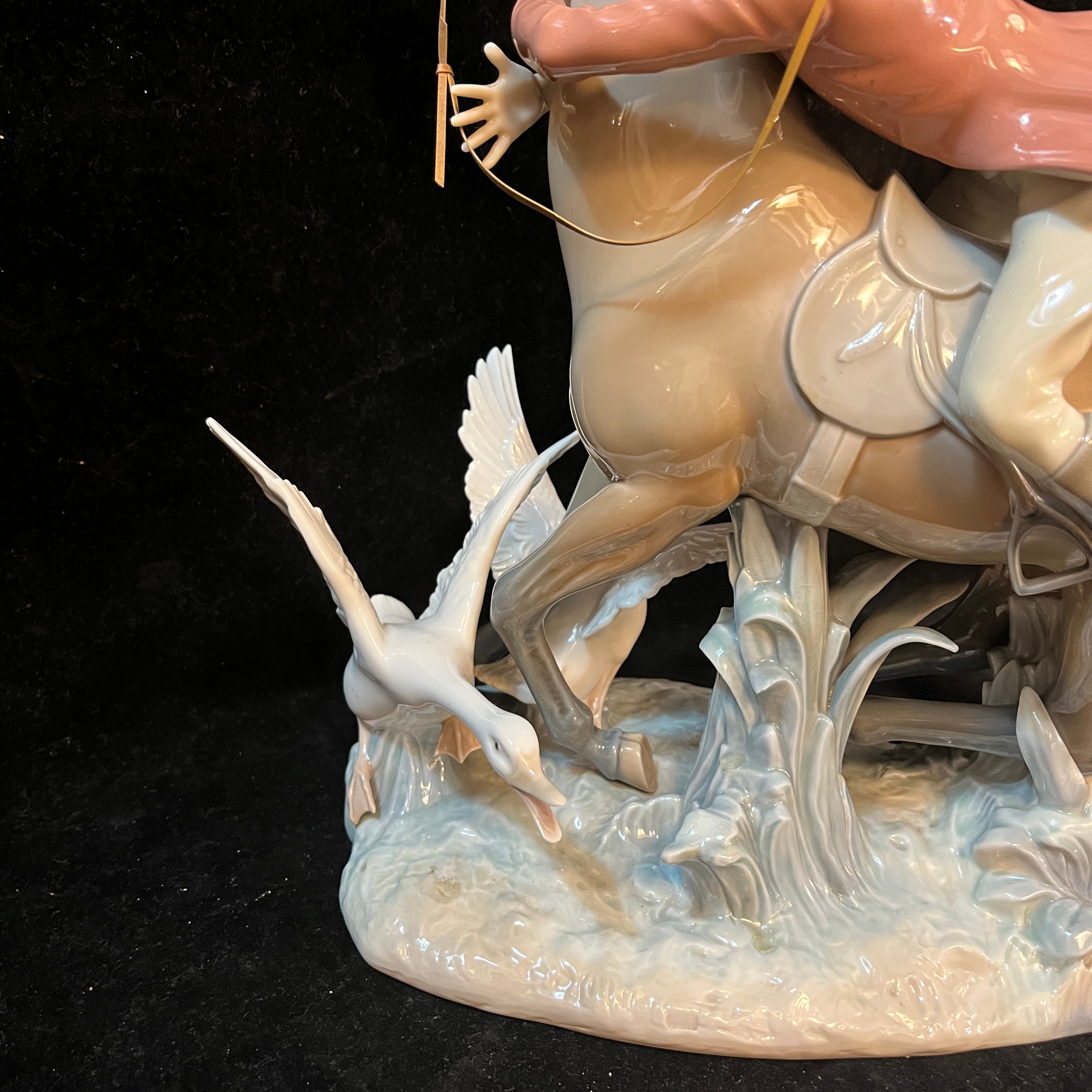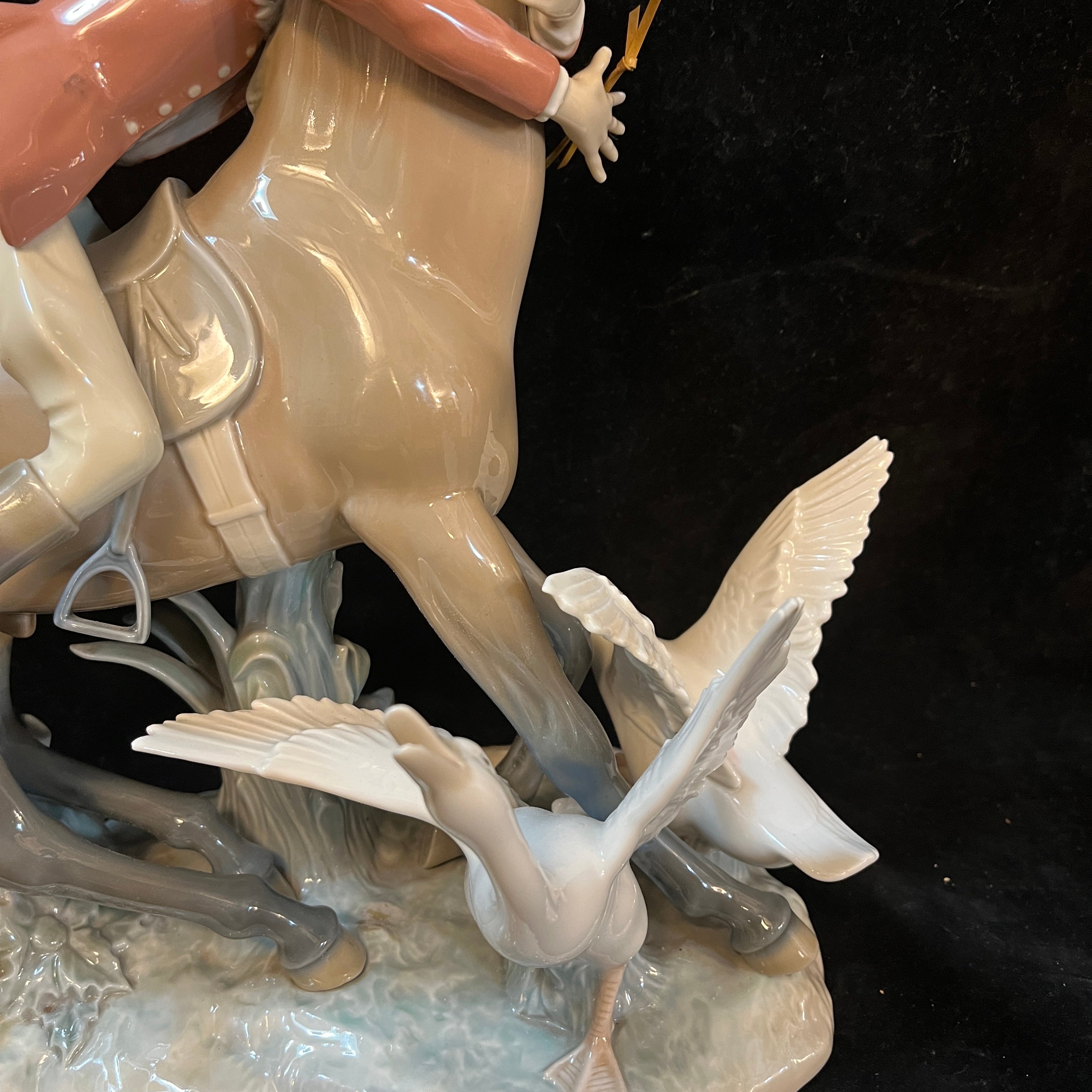 Peculiar figura de porcelana del la tradicional marca española Lladró, que nos presenta una divertida escena de un jinete abrazando del cuello su caballo que esta pisando una pareja de gansos. Se puede apreciar la expresión de miedo en los rostros del jinete y caballo, además de las aves escapando del caballo.