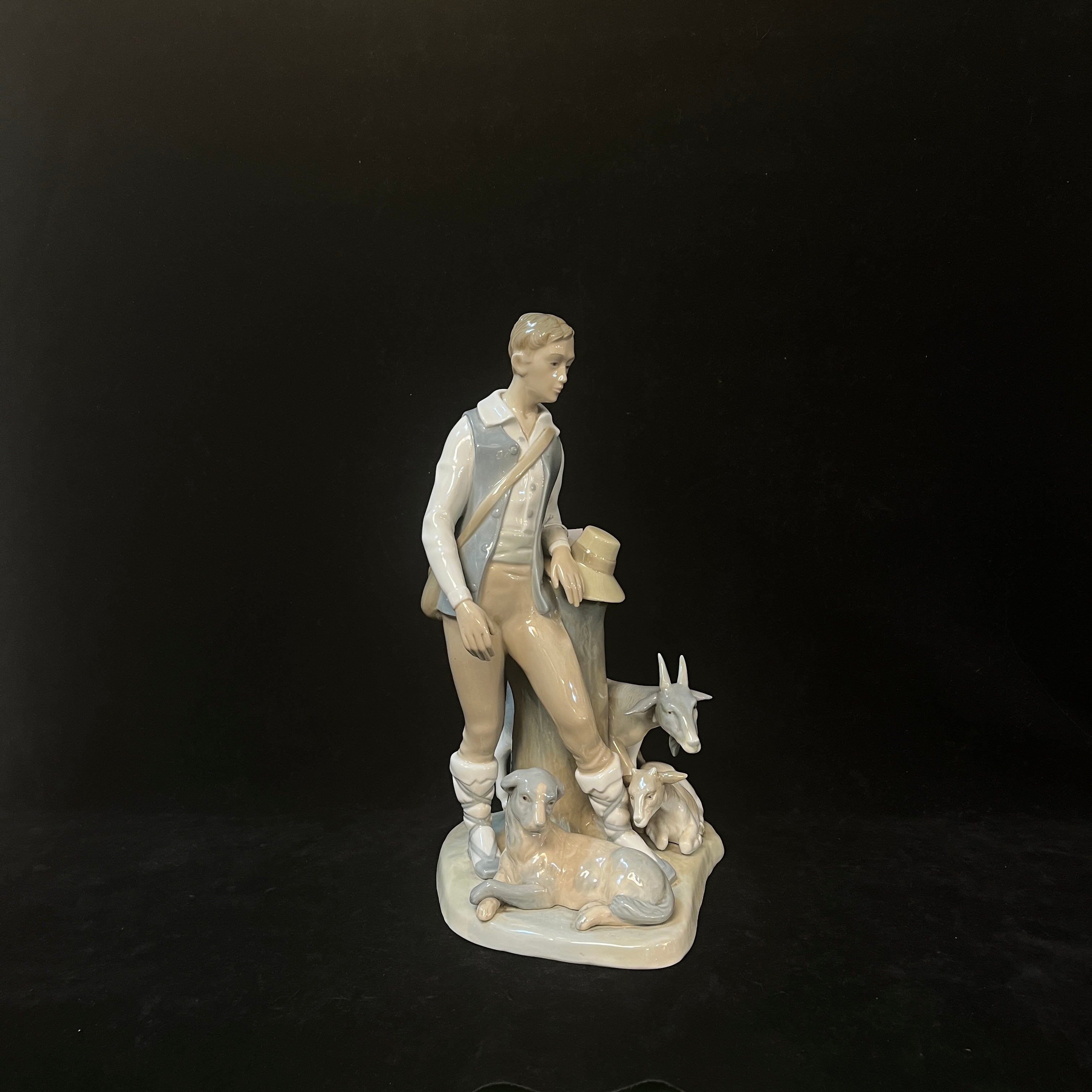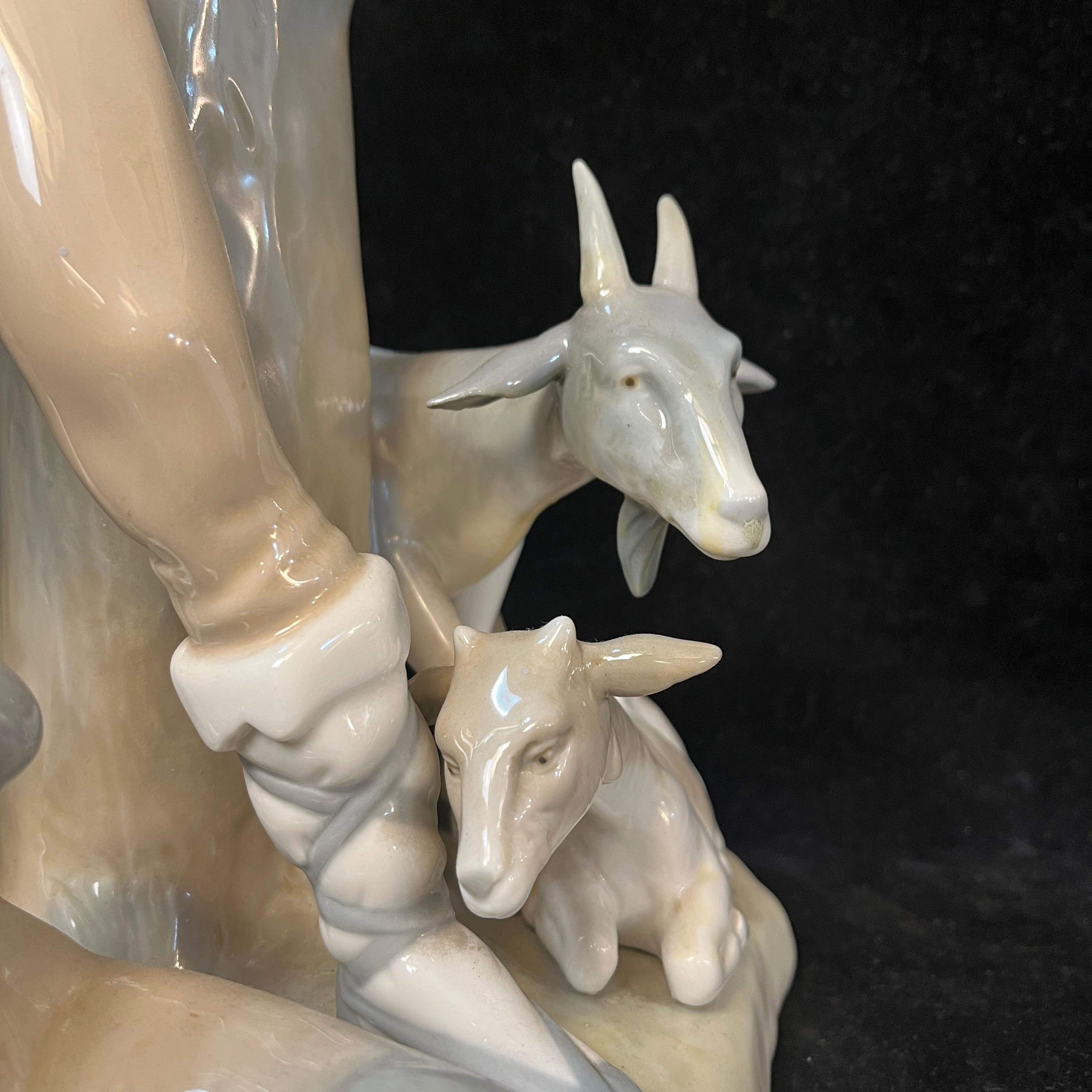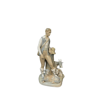 Figura de porcelana, de origen español, de la reconocida marca Zaphir, en la que se puede apreciar un joven cabrero descansando acompañado de cabras a sus pies