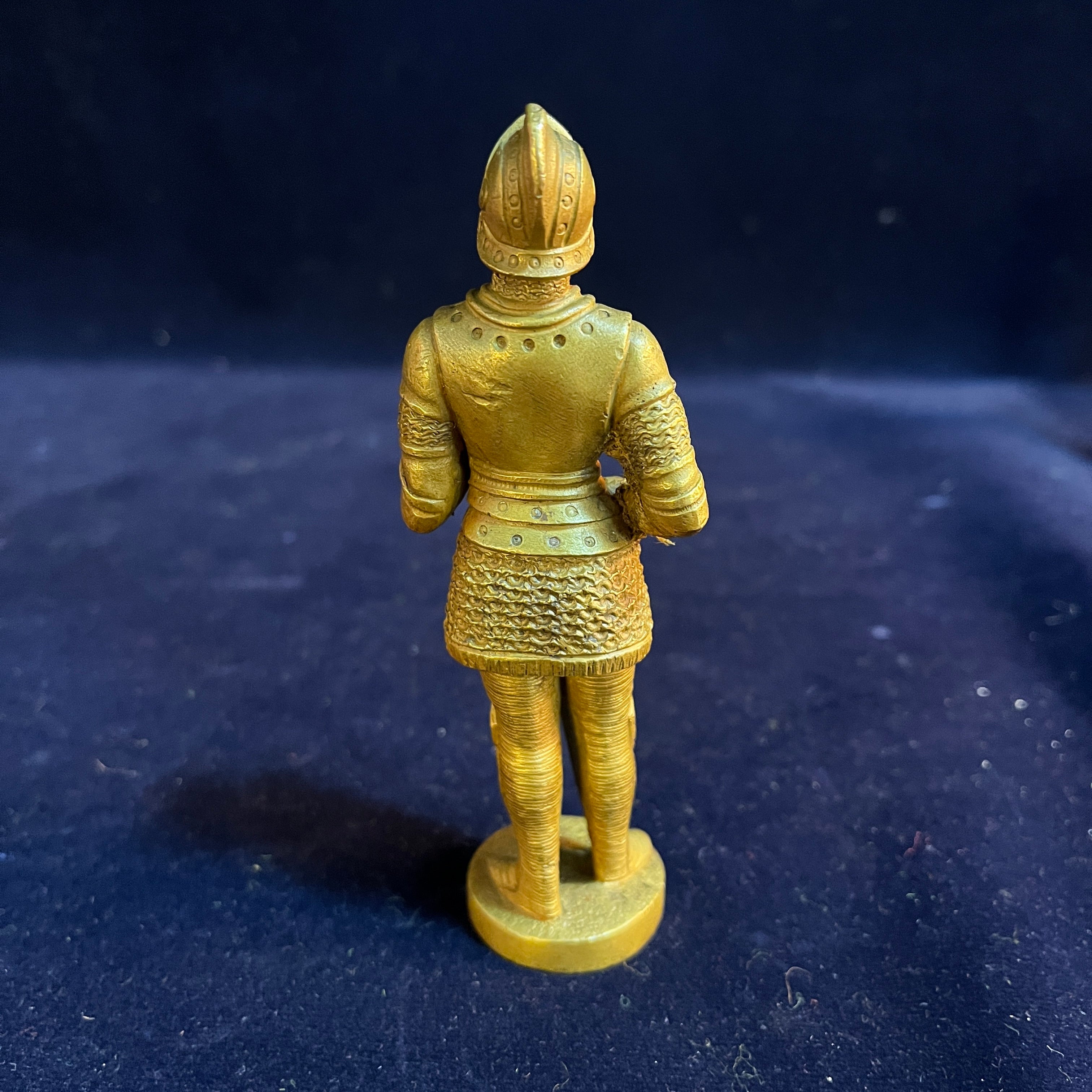 Statue en bronze d'origine française représentant un chevalier médiéval avec son armure et son épée, sur un socle du même matériau. Le rendu est détaillé, restituant les gestes et les textures de son armure.