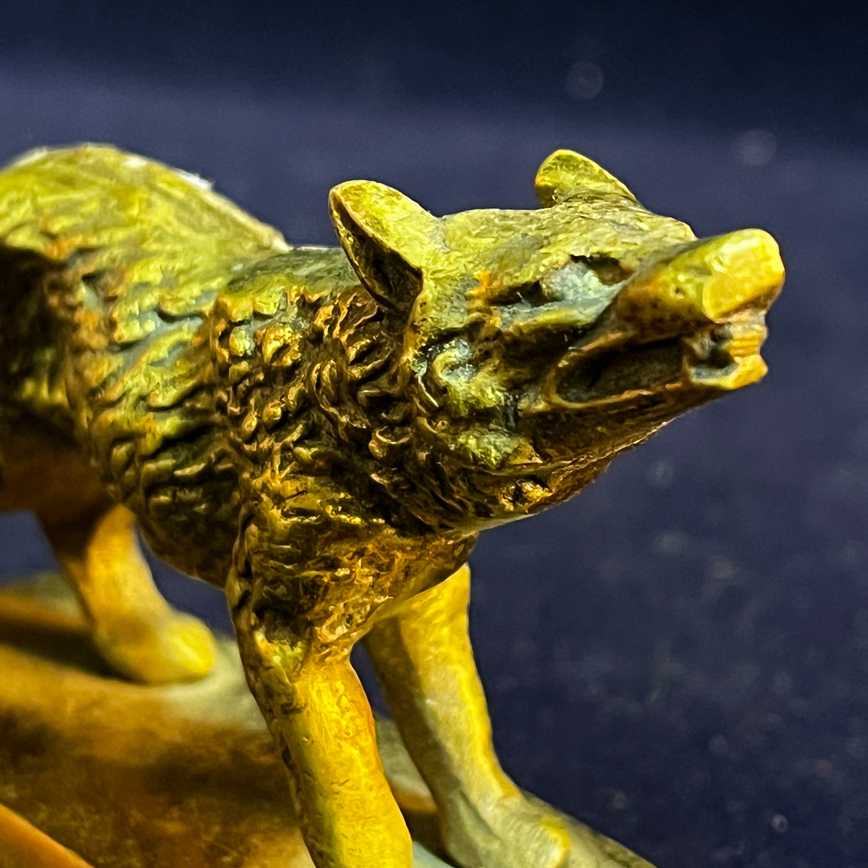 Statue en bronze d'origine française représentant un loup grognant. Reposant sur un piédestal en bronze réalisé dans la même pièce, la statue reproduit parfaitement l'attitude agressive de l'animal et la texture de sa fourrure.