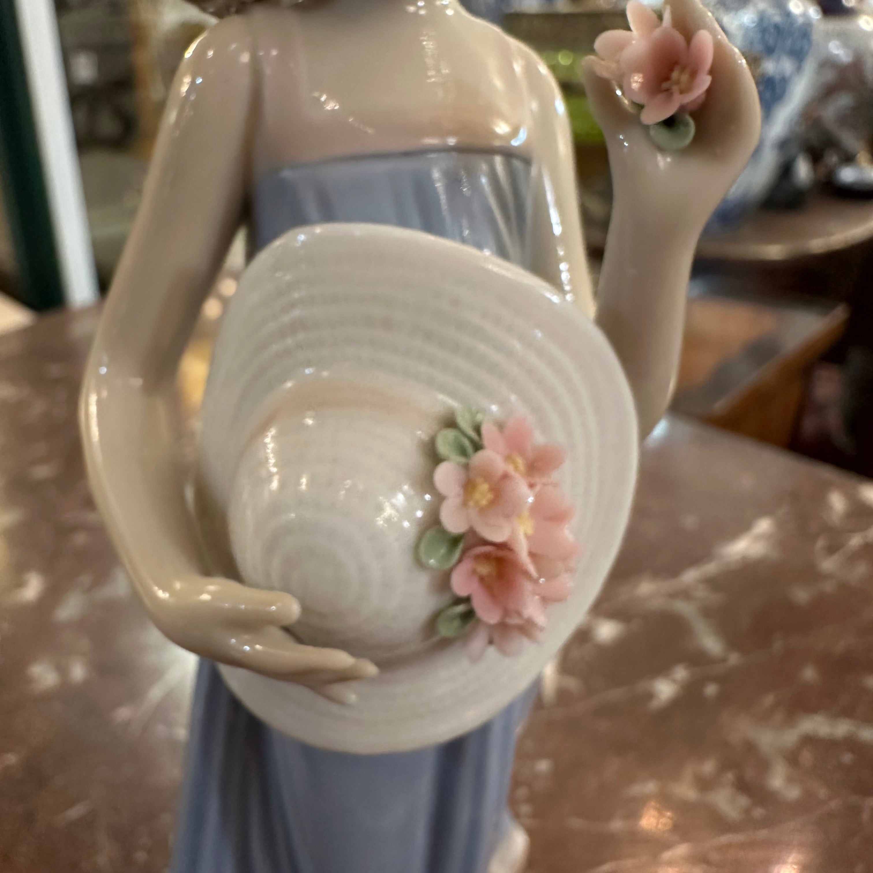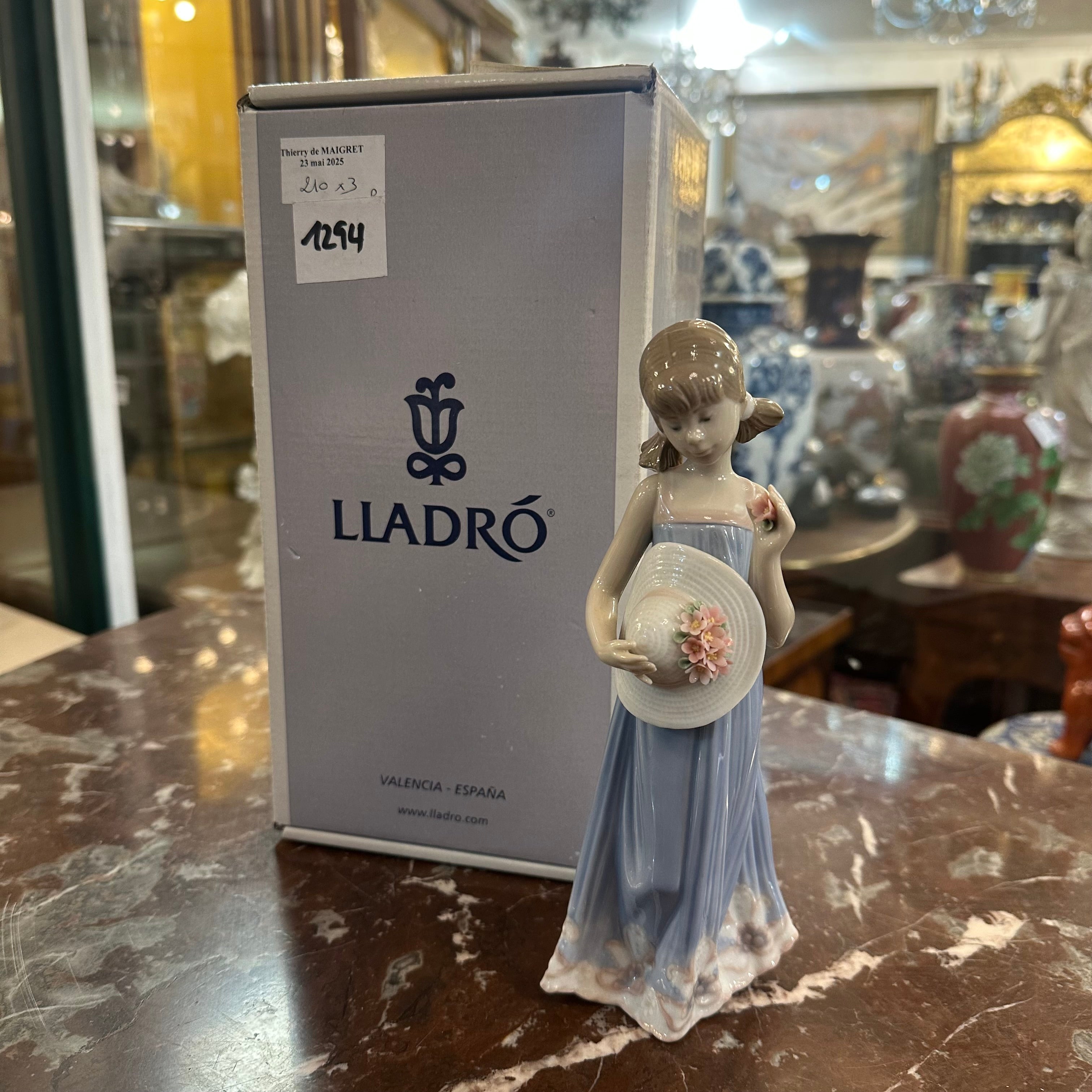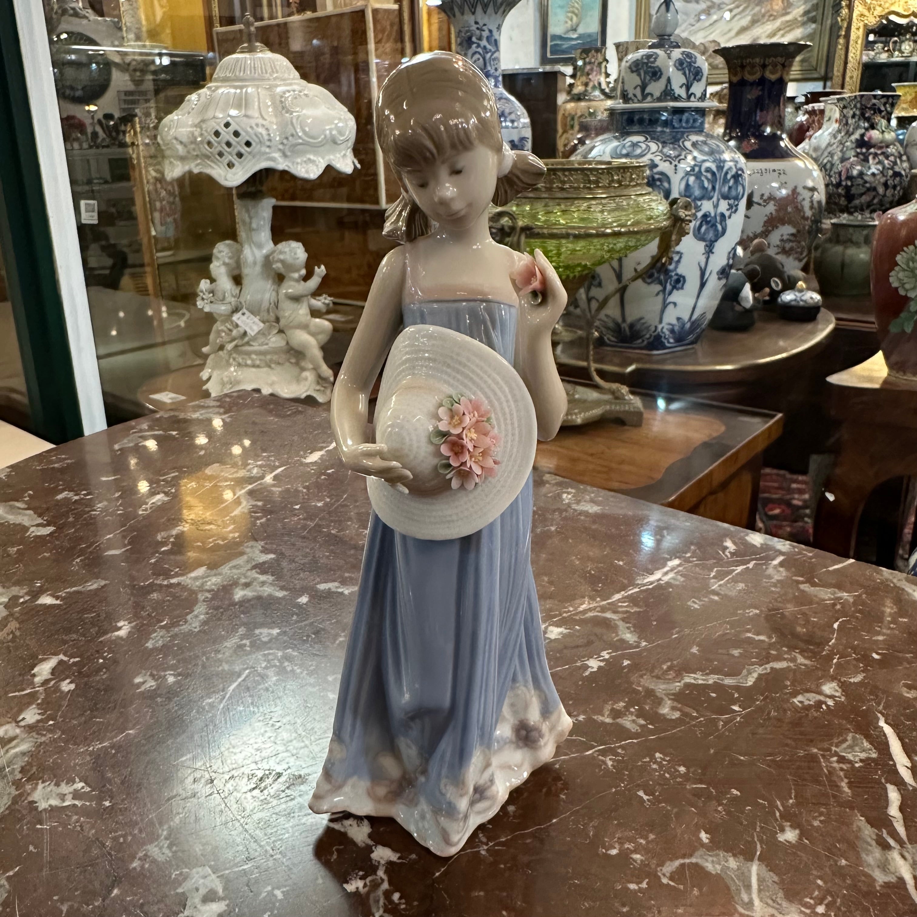 Magnifique figurine en porcelaine d'origine espagnole, de la célèbre marque Lladró. Elle représente une jeune fille tenant, d'un geste timide et délicat, un chapeau orné d'une coiffe de fleurs roses. La jeune fille est vêtue d'une longue robe fluide, plissée, violette et rehaussée de détails roses. La figurine est livrée dans sa boîte d'origine.