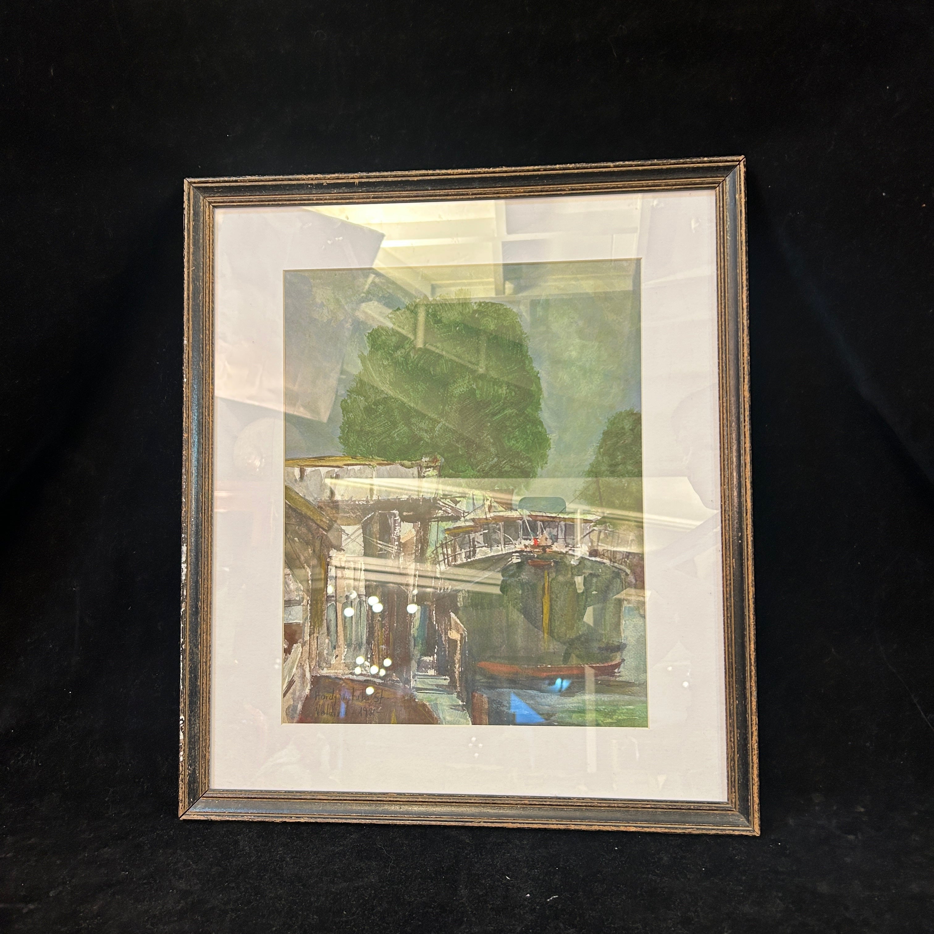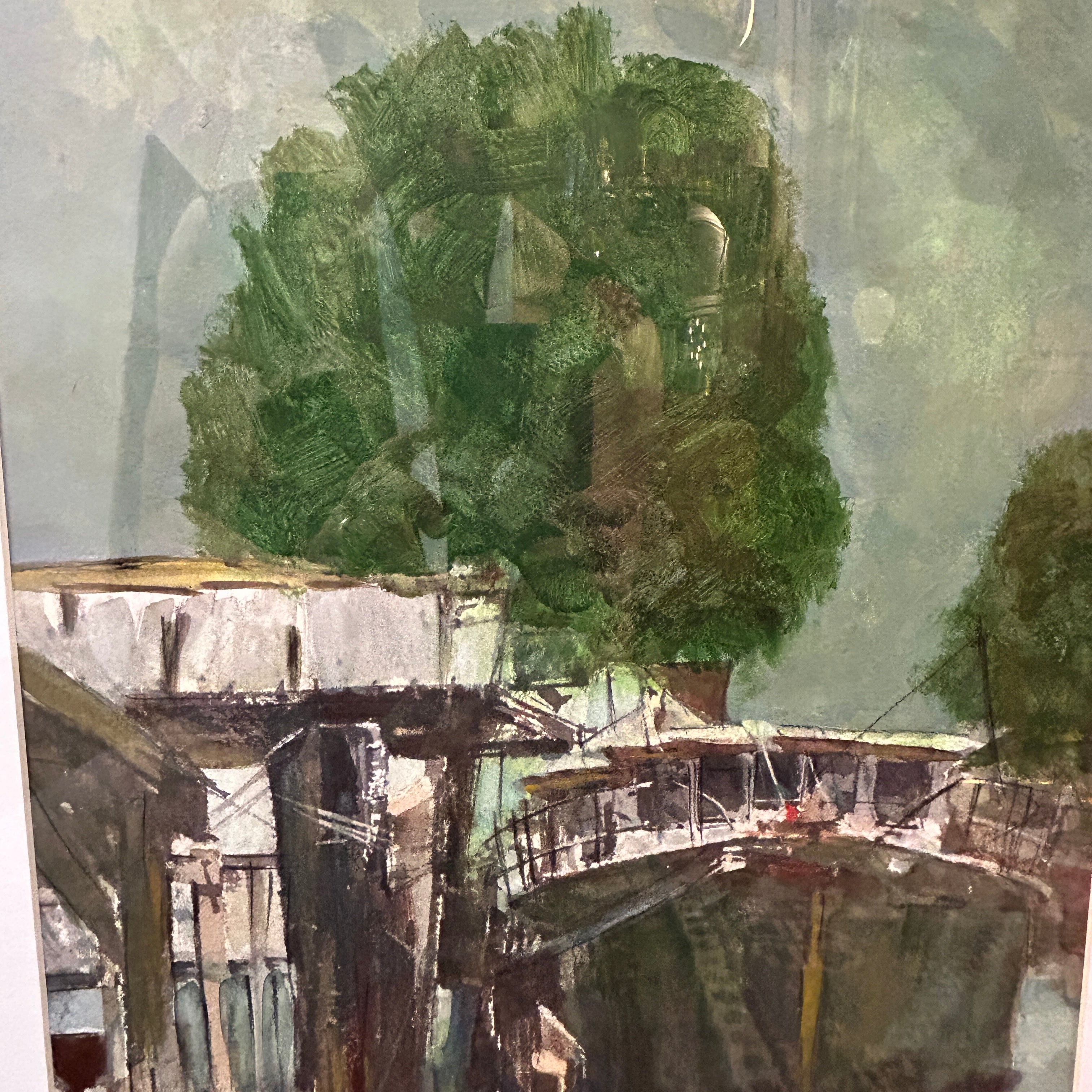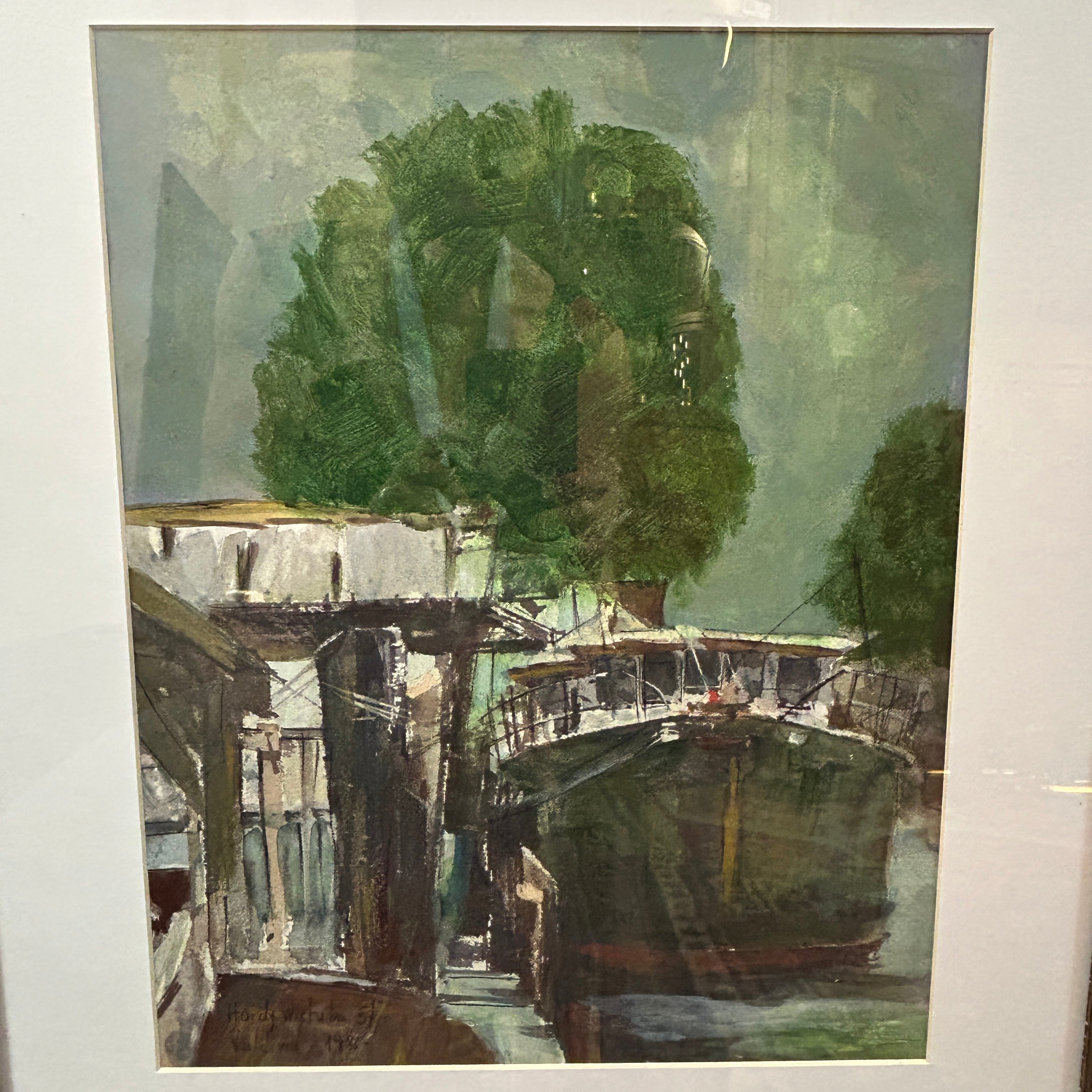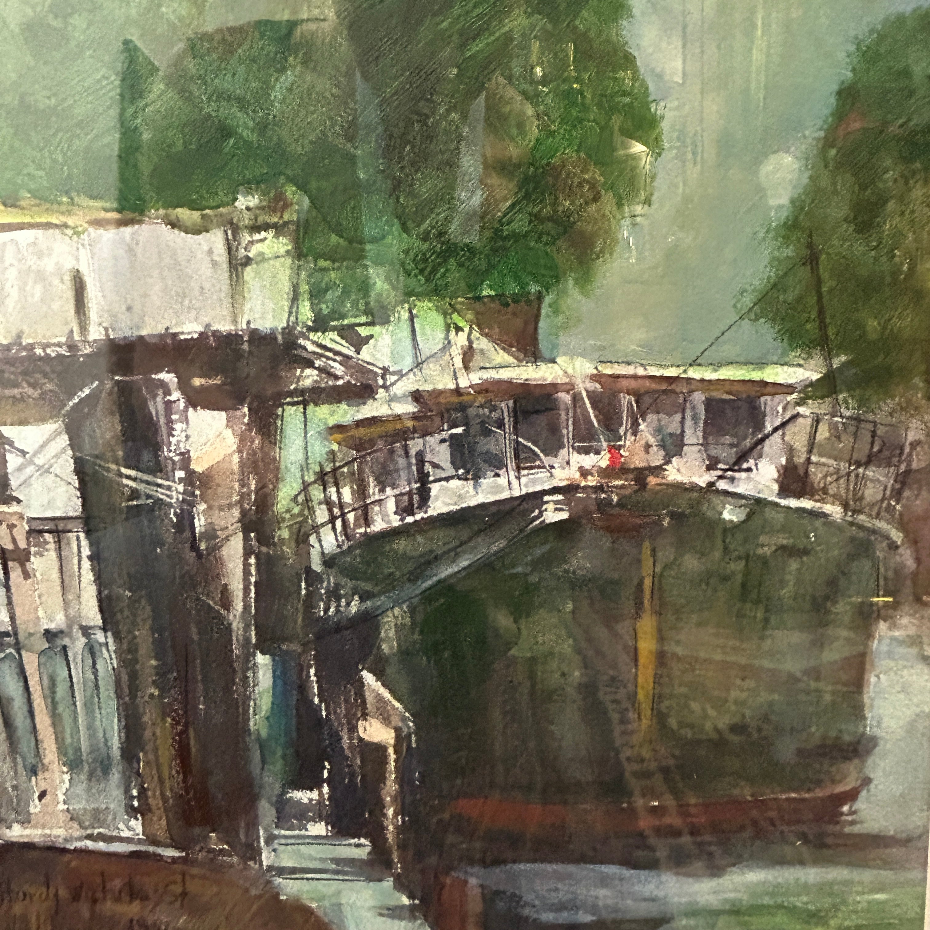 Especial acuarela del reconocido pintor chileno Hardy Wistuba, que nos presenta la escena de un gran barco en un muelle, con un intenso verde de la clásica vegetación valdiviana.