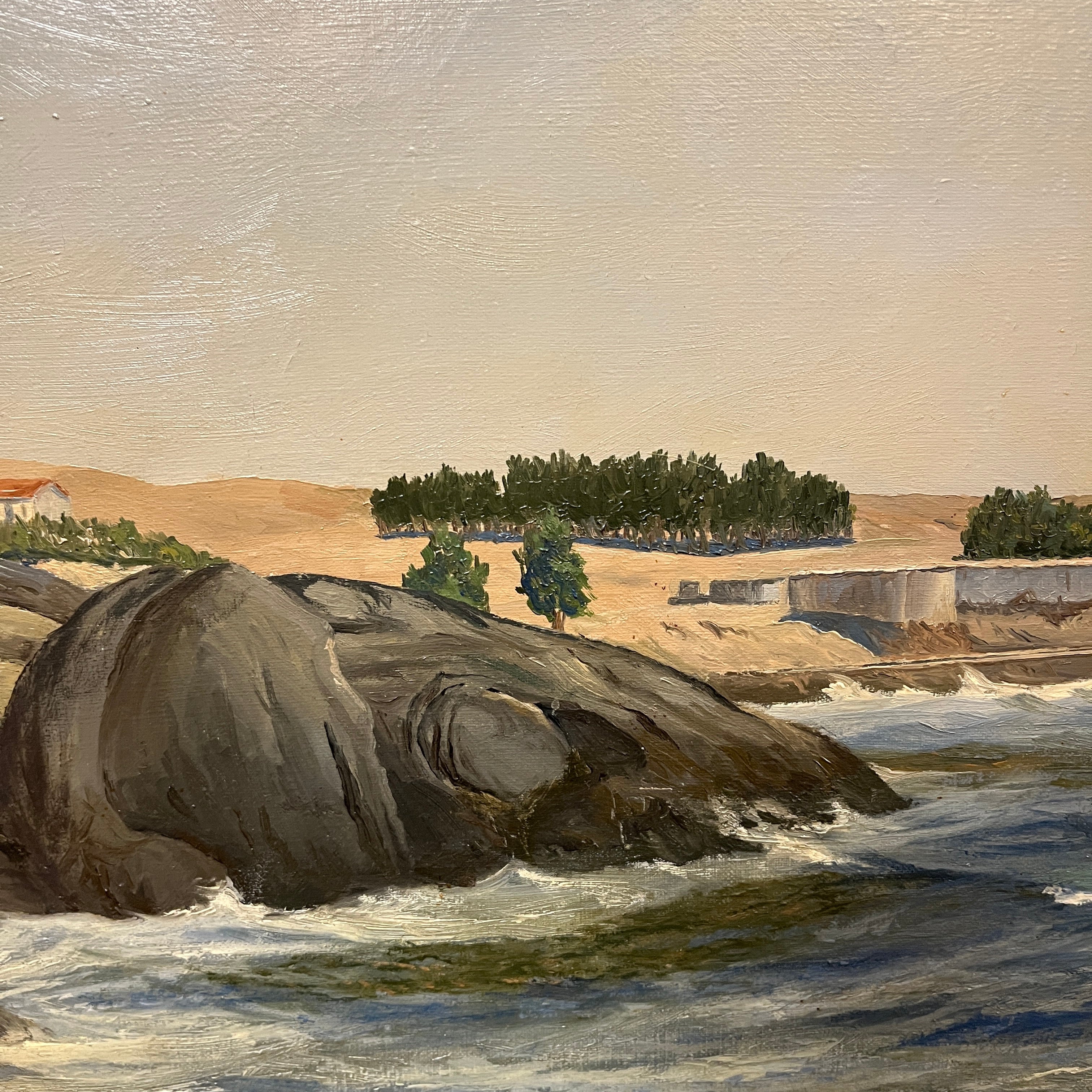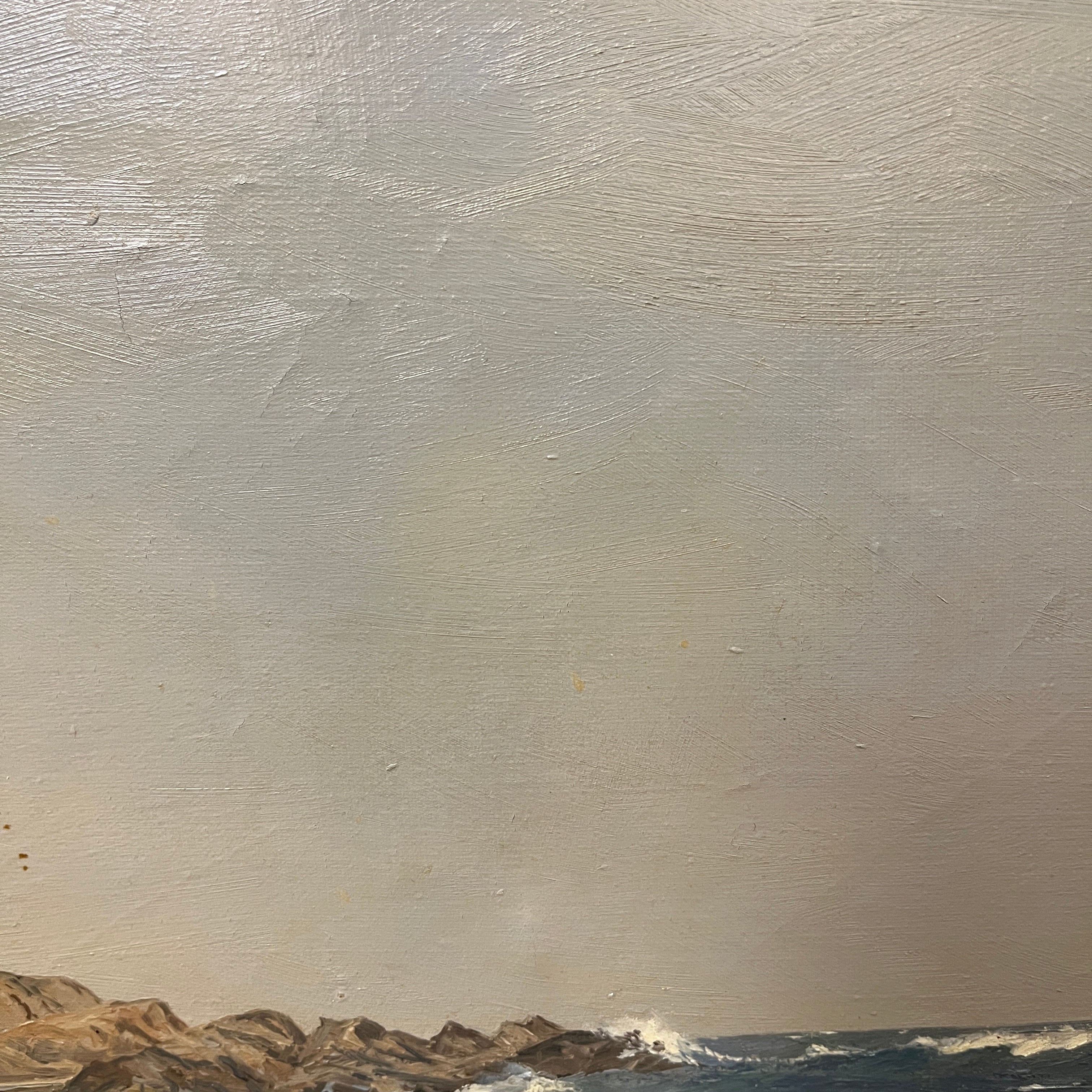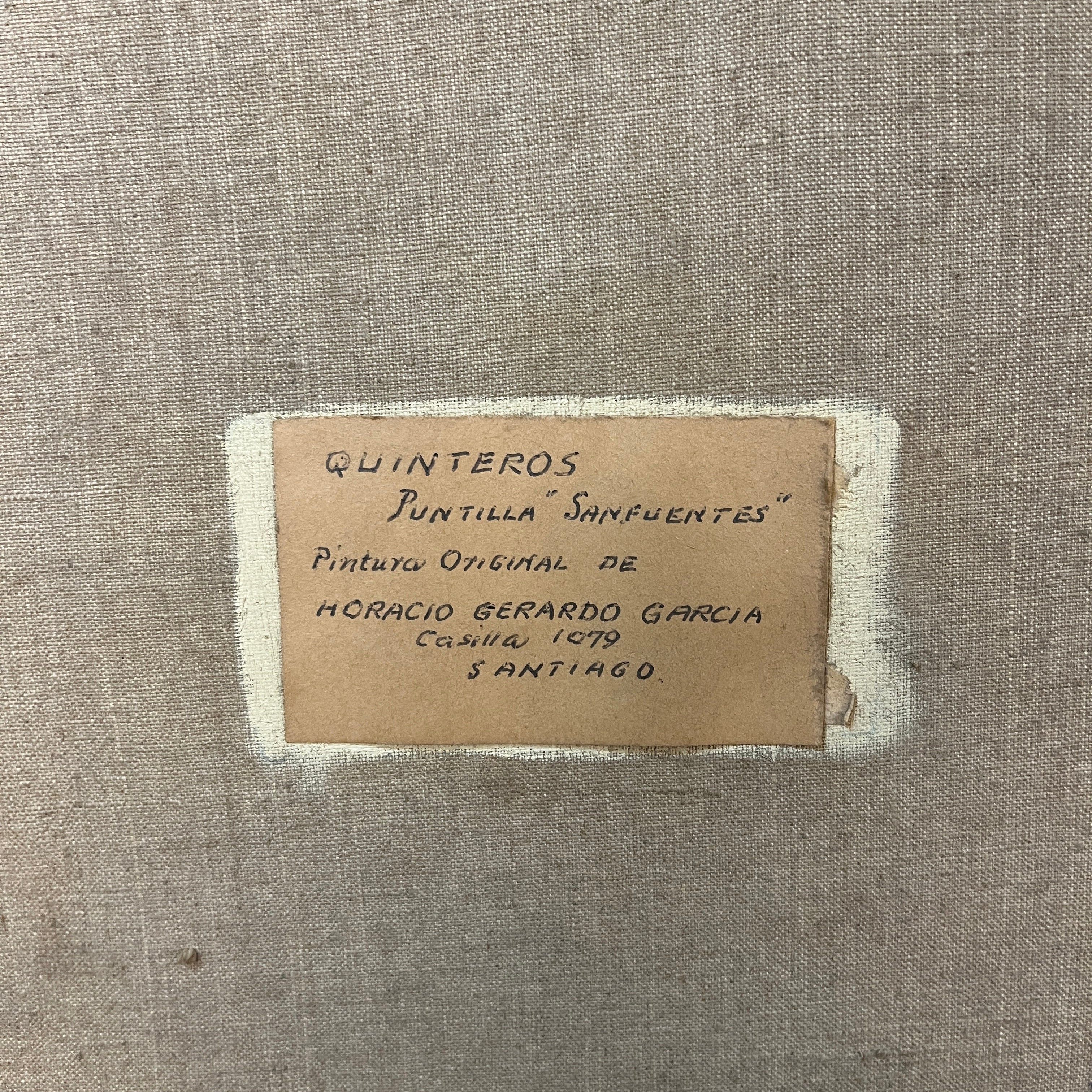 Óleo sobre tela del pintor chileno Horacio García, representando un paisaje costero de Quinteros, específicamente de la Puntilla Sanfuentes, en la que podemos ver las olas chocando contra las rocas. De fondo, vemos las famosas dunas de este pueblo, con algunas casas y árboles. El mar está compuesto de forma detallista y llena de texturas, como las zonas verdosas que sugieren la presencia de algas en el agua. La obra tiene un elegante marco de madera tallada en relieves y terminada con detalles dorados. En su parte posterior hay un etiqueta con información del paisaje y el lugar en el que fue pintado.