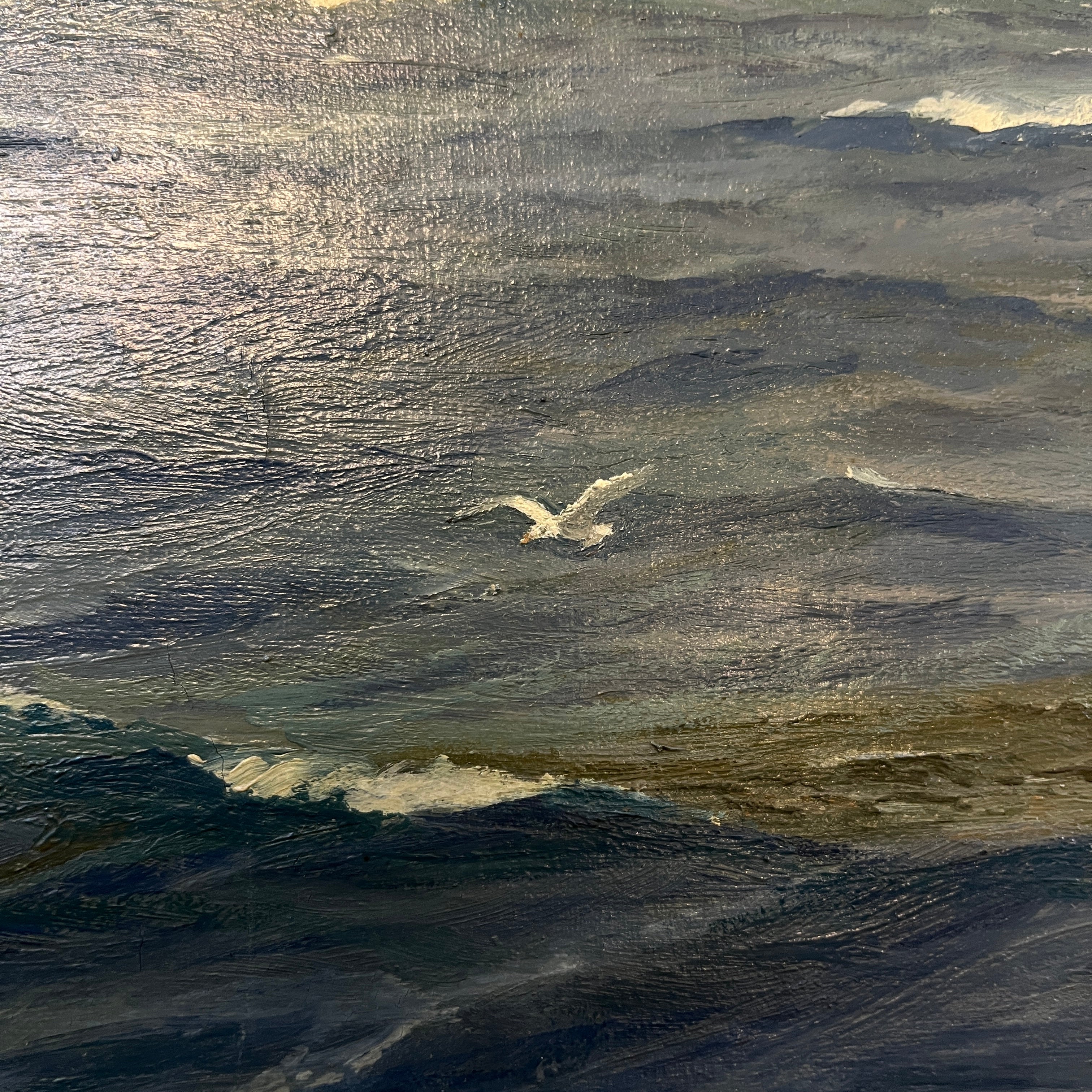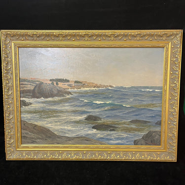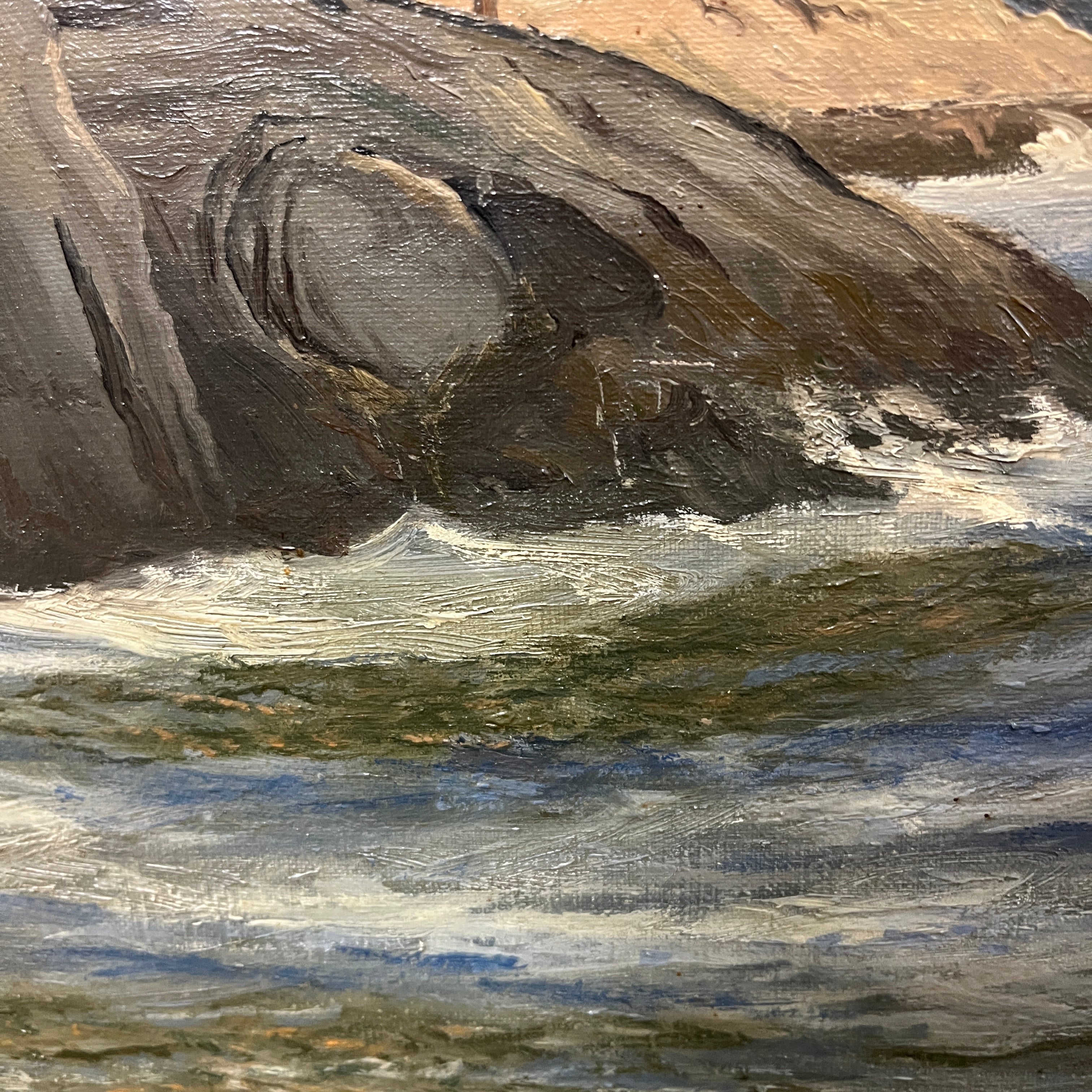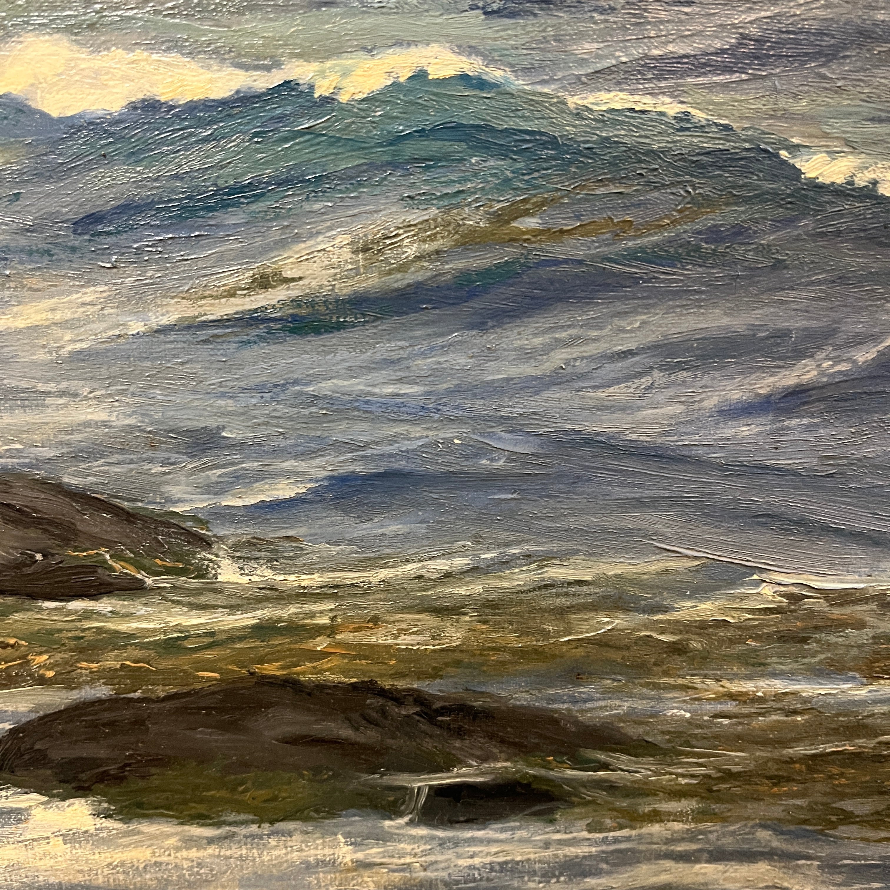 Óleo sobre tela del pintor chileno Horacio García, representando un paisaje costero de Quinteros, específicamente de la Puntilla Sanfuentes, en la que podemos ver las olas chocando contra las rocas. De fondo, vemos las famosas dunas de este pueblo, con algunas casas y árboles. El mar está compuesto de forma detallista y llena de texturas, como las zonas verdosas que sugieren la presencia de algas en el agua. La obra tiene un elegante marco de madera tallada en relieves y terminada con detalles dorados. En su parte posterior hay un etiqueta con información del paisaje y el lugar en el que fue pintado.